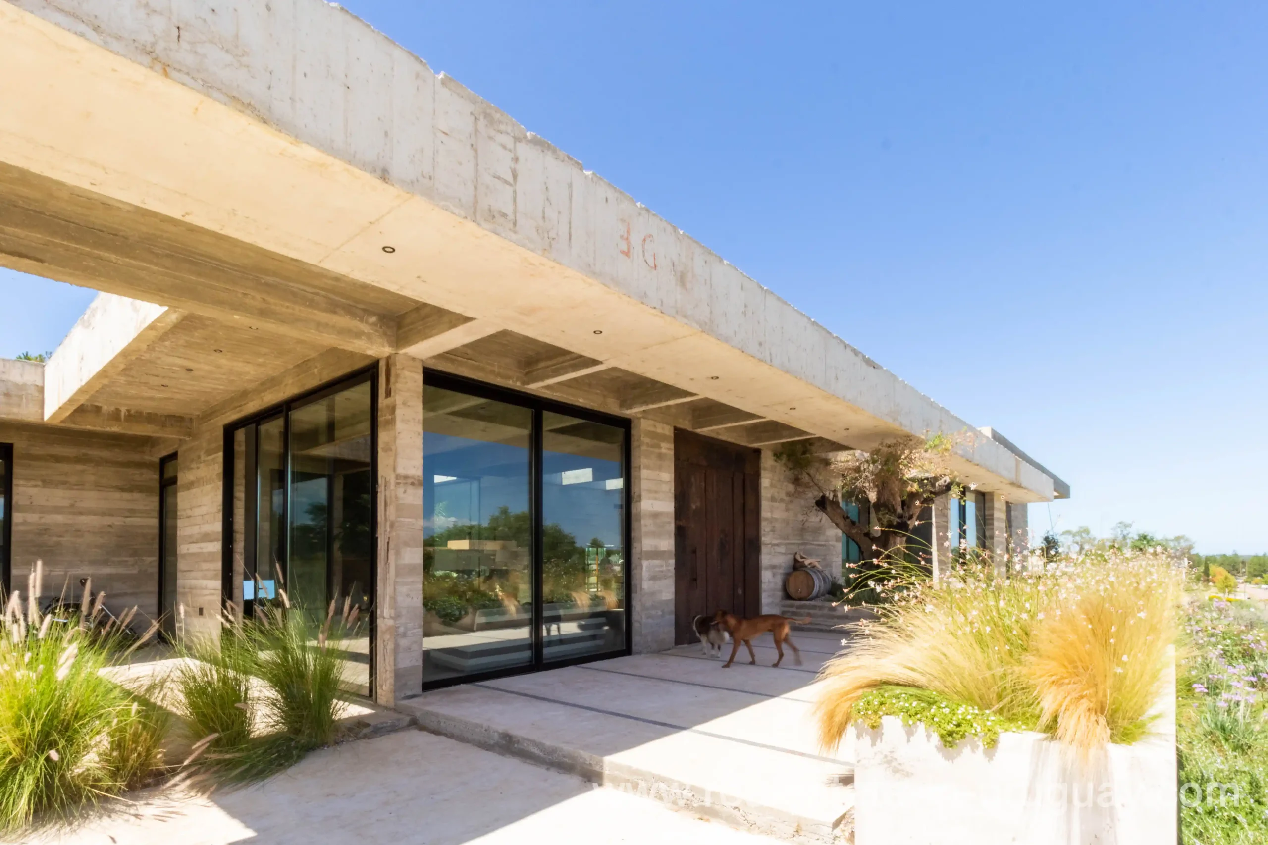 Dieses solide und helle, moderne Haus aus reinem Beton und Glas ist auf einer Etage konzipiert.
