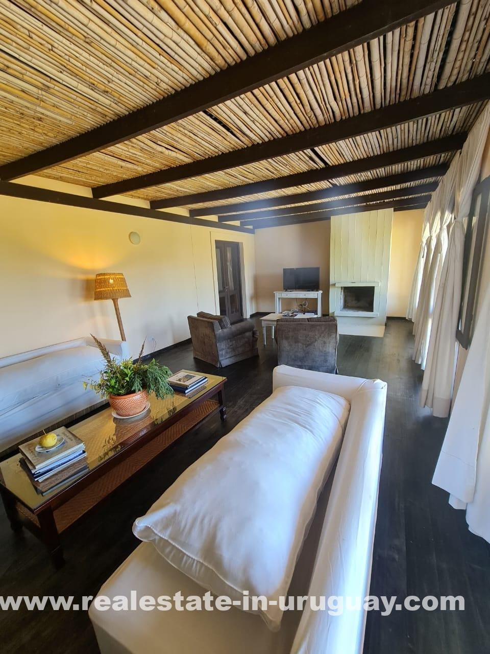 Das Haupthaus erstreckt sich über zwei Ebenen und beginnt im Erdgeschoss mit einer einladenden Eingangshalle, die in einen großzügigen Wohn- und Essbereich mit Kaminofen für ein gemütliches Ambiente führt. Die gut ausgestattete Küche verfügt über eine Frühstücksbar, ergänzt durch eine separate Personalküche, ein WC und eine Gästegarderobe. Im Erdgeschoss befinden sich außerdem zwei Semi-Suite-Schlafzimmer mit einem Gemeinschaftsbad sowie eine zusätzliche Suite mit Kamin, Ankleidezimmer und luxuriösem Badezimmer.