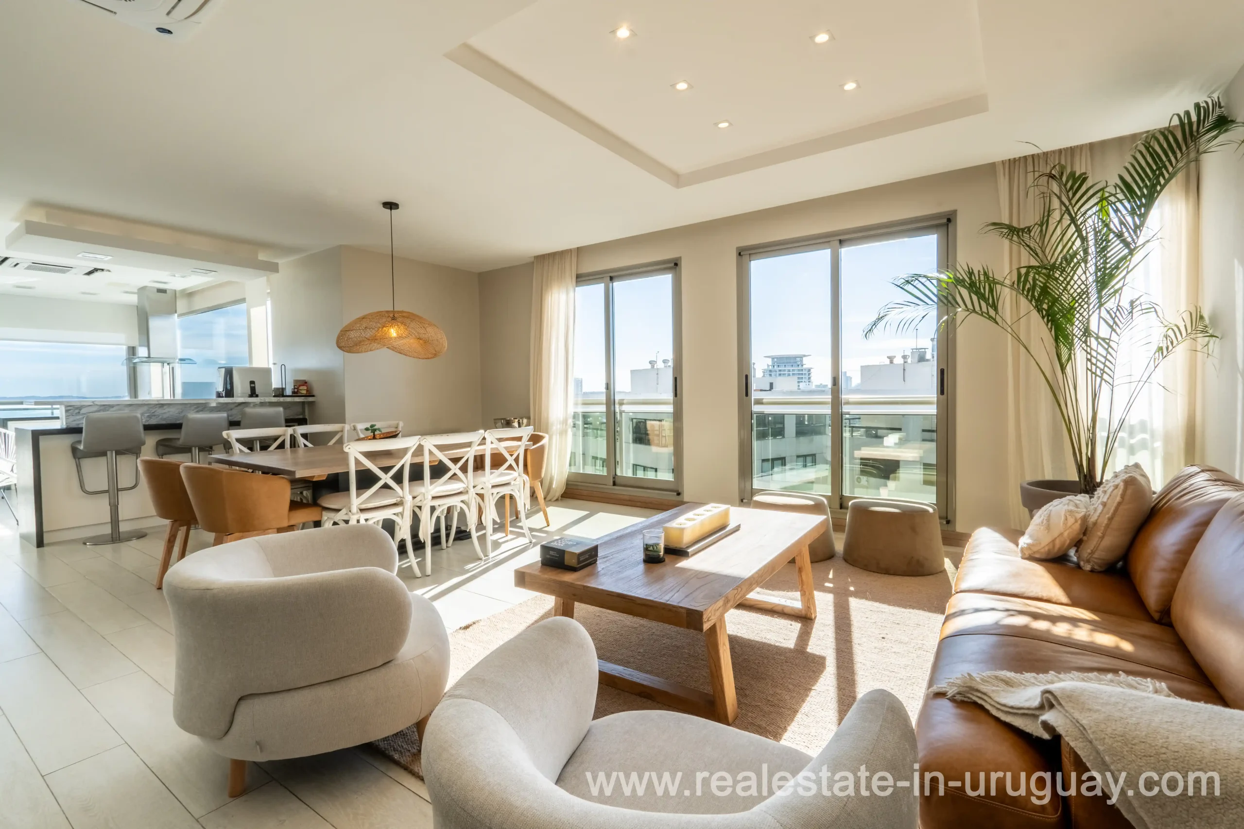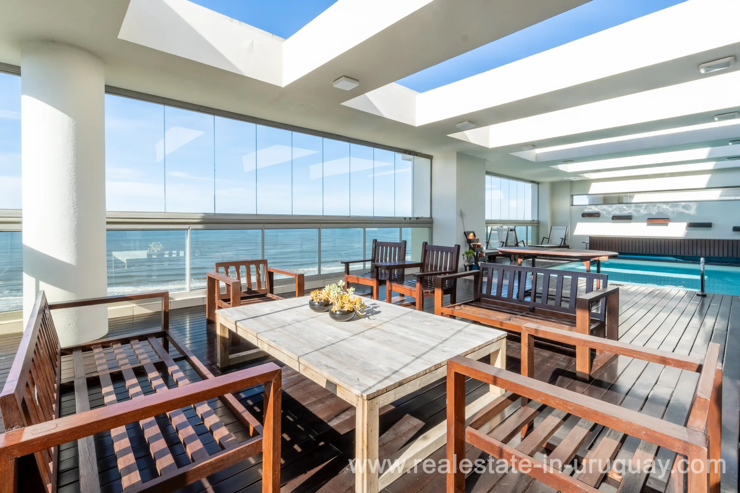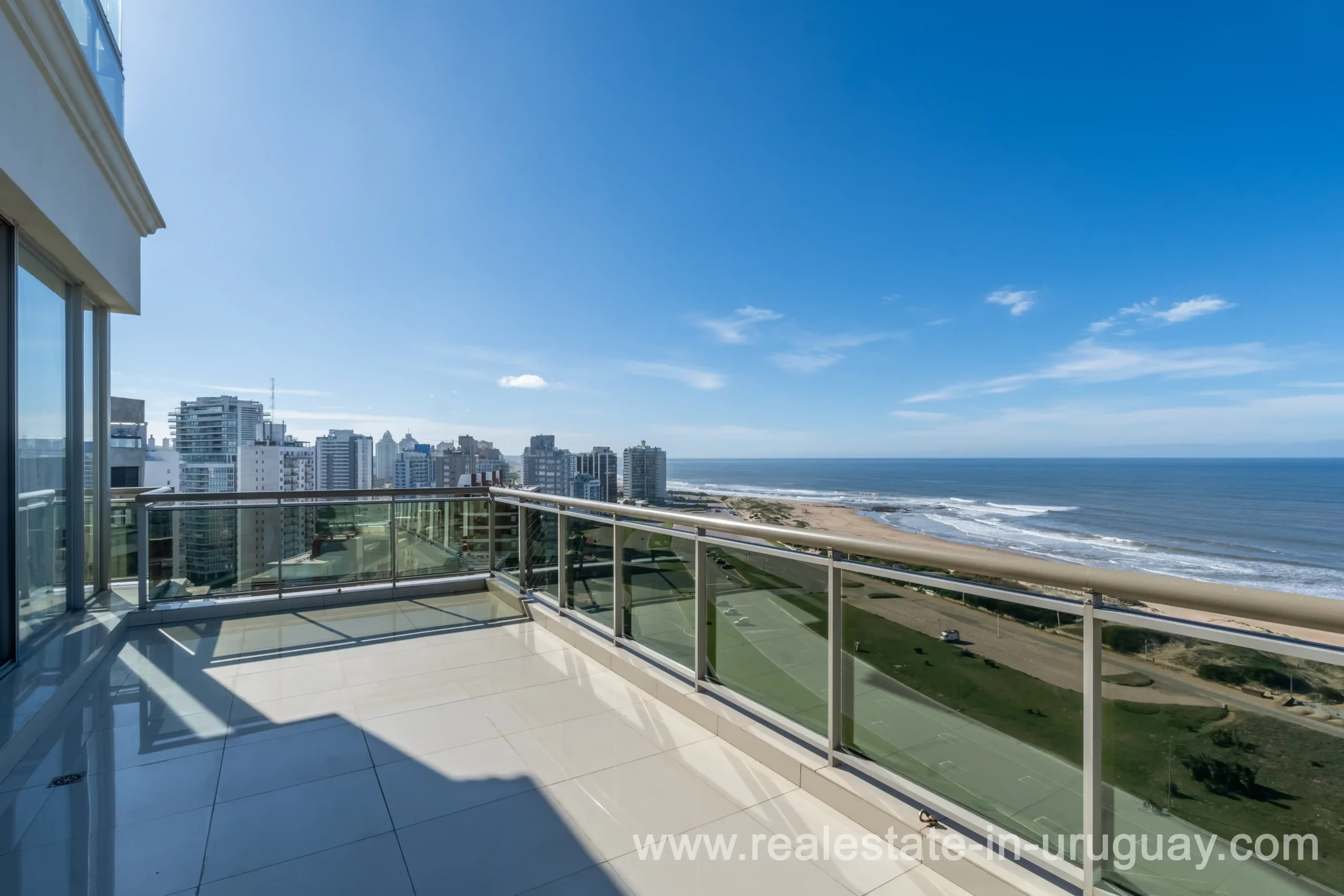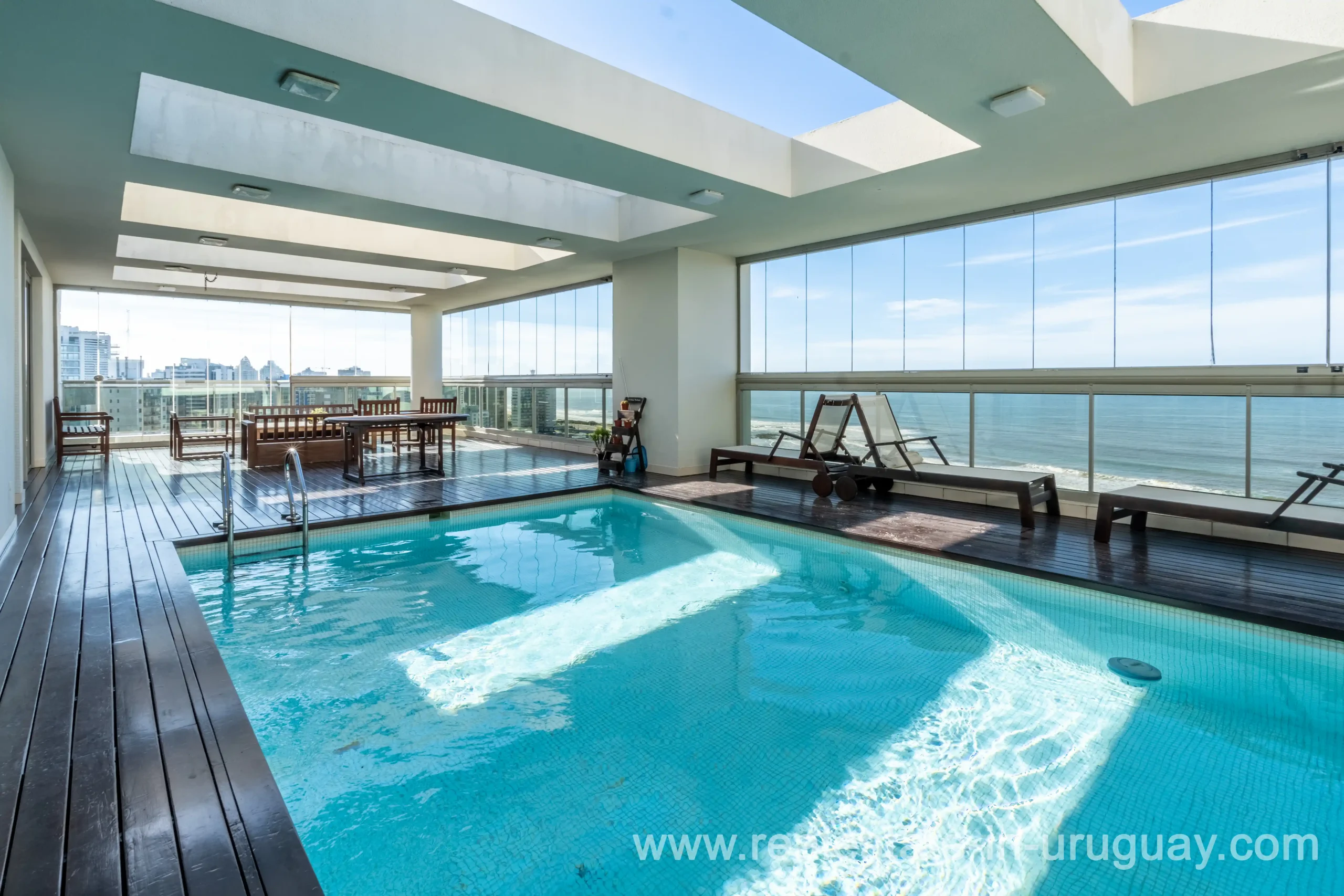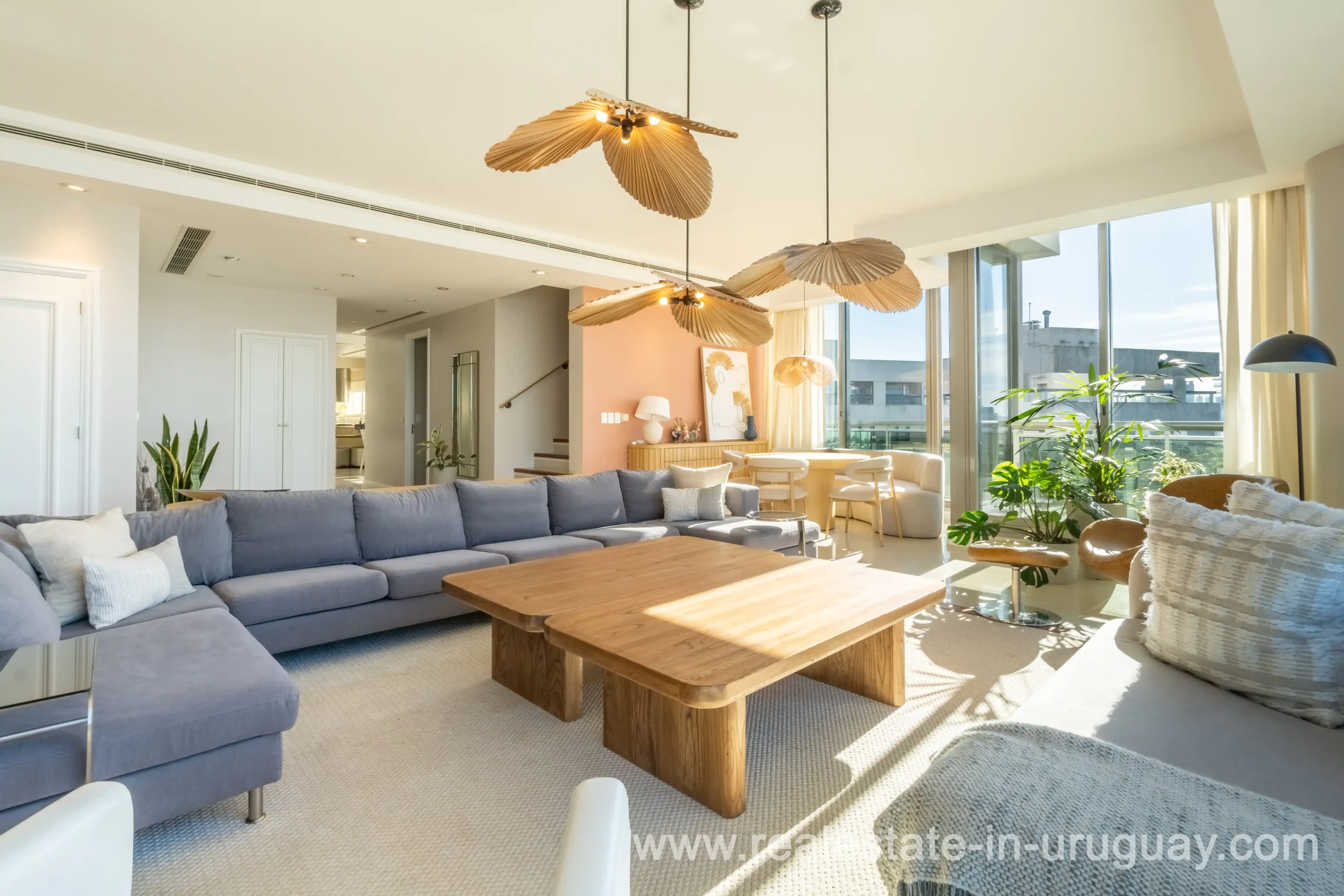 Dieses luxuriöse Duplex-Penthouse in der Nähe der Halbinsel in Punta Del Este liegt gegenüber der Playa Brava und bietet Meerblick sowie eine sehr gute Anbindung an alle Annehmlichkeiten, die Punta del Este zu bieten hat. Die spektakuläre Penthouse-Wohnung ist ideal für den Urlaub oder zum ganzjährigen Wohnen. Es besteht aus zwei Stockwerken und verfügt über großzügige Terrassen und einen großen privaten Swimmingpool. Auf der Hauptzugangsebene befinden sich ein helles Wohn-/Esszimmer mit einem vorderen Balkon, fünf Schlafzimmer mit eigenem Bad, ein Aufenthaltsraum, eine große Hauptküche, ein Gästebad, eine komplette Personalunterkunft und ein Hauswirtschaftsraum. Im Obergeschoss befinden sich ein großer, geschlossener Grill, eine zweite Küche, ein komplettes Badezimmer, ein Spielzimmer und eine geräumige Außenterrasse mit einem Swimmingpool und einem atemberaubenden Meerblick. Alle Zimmer sind mit Fußbodenheizung und Klimaanlage ausgestattet. Die Wohnung verfügt über fünf geschlossene Parkplätze und Abstellräume. Darüber hinaus bietet das Gebäude alle Arten von Dienstleistungen, darunter ein Freibad, ein beheiztes Hallenbad, einen Whirlpool, einen Fitnessraum mit modernsten Geräten, eine Sauna, gemeinschaftliche Spielbereiche für Jugendliche und Kinder, einen Kinosaal, ein Business Center, einen Tennisplatz, einen Mehrzweck-Synthetik-Sportplatz (Fußball, Volleyball und Basketball), drei Grills, die einzeln oder gemeinsam genutzt werden können, einen Friseursalon, ein Solarium, einen täglichen Zimmerservice, einen Wäscheservice und einen Strandservice.