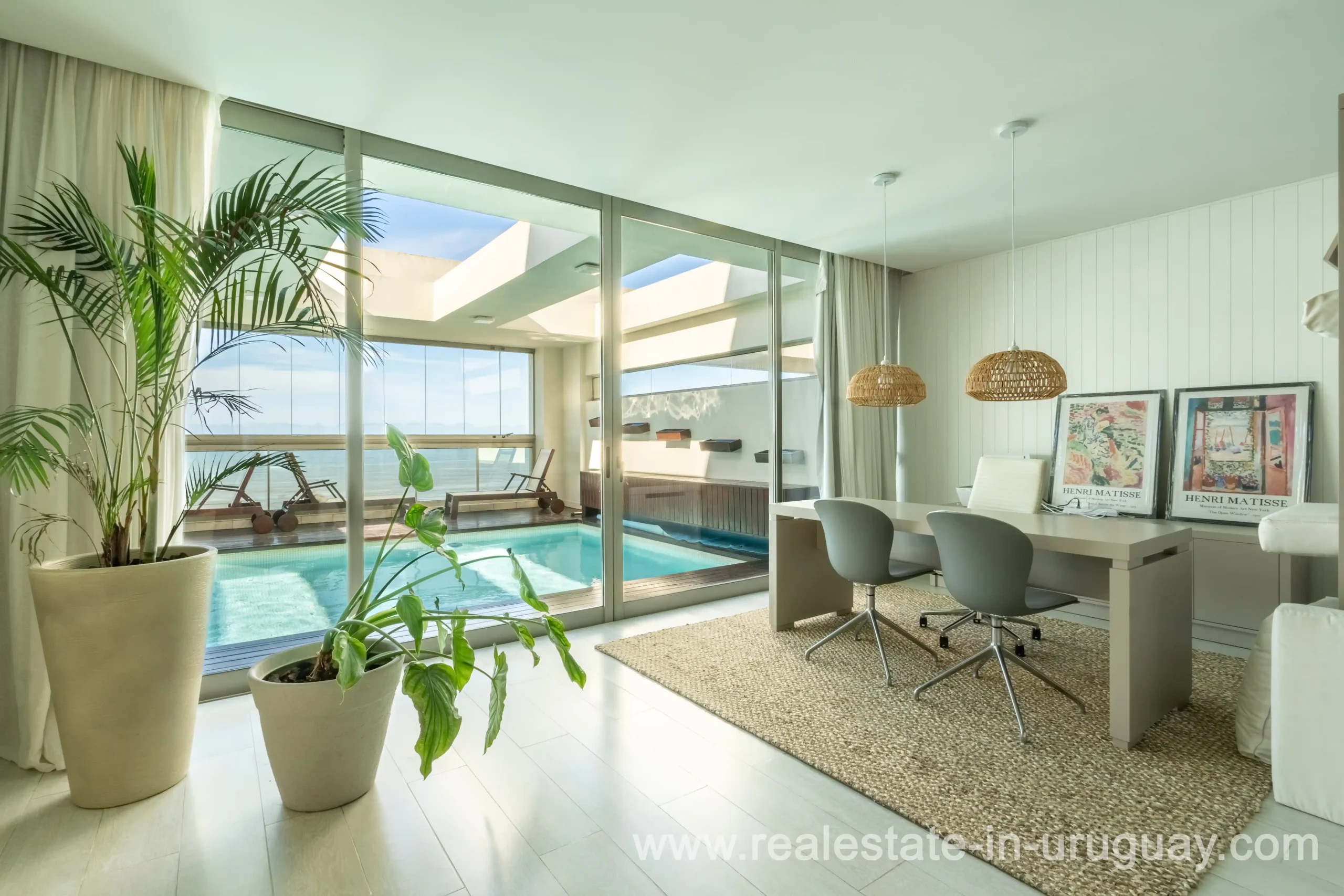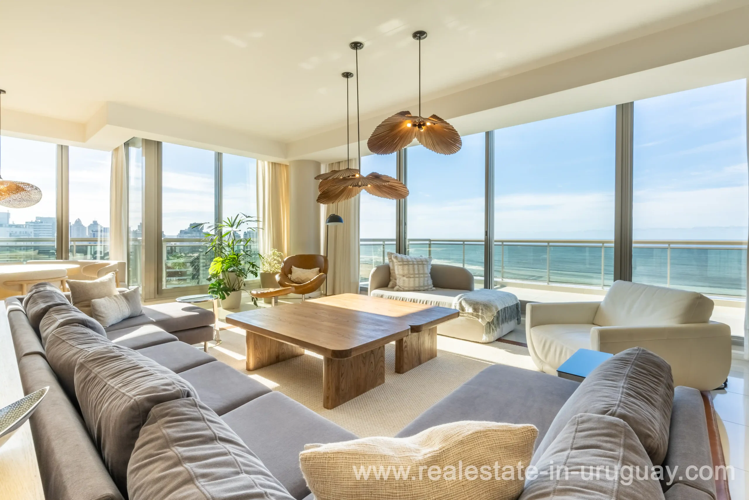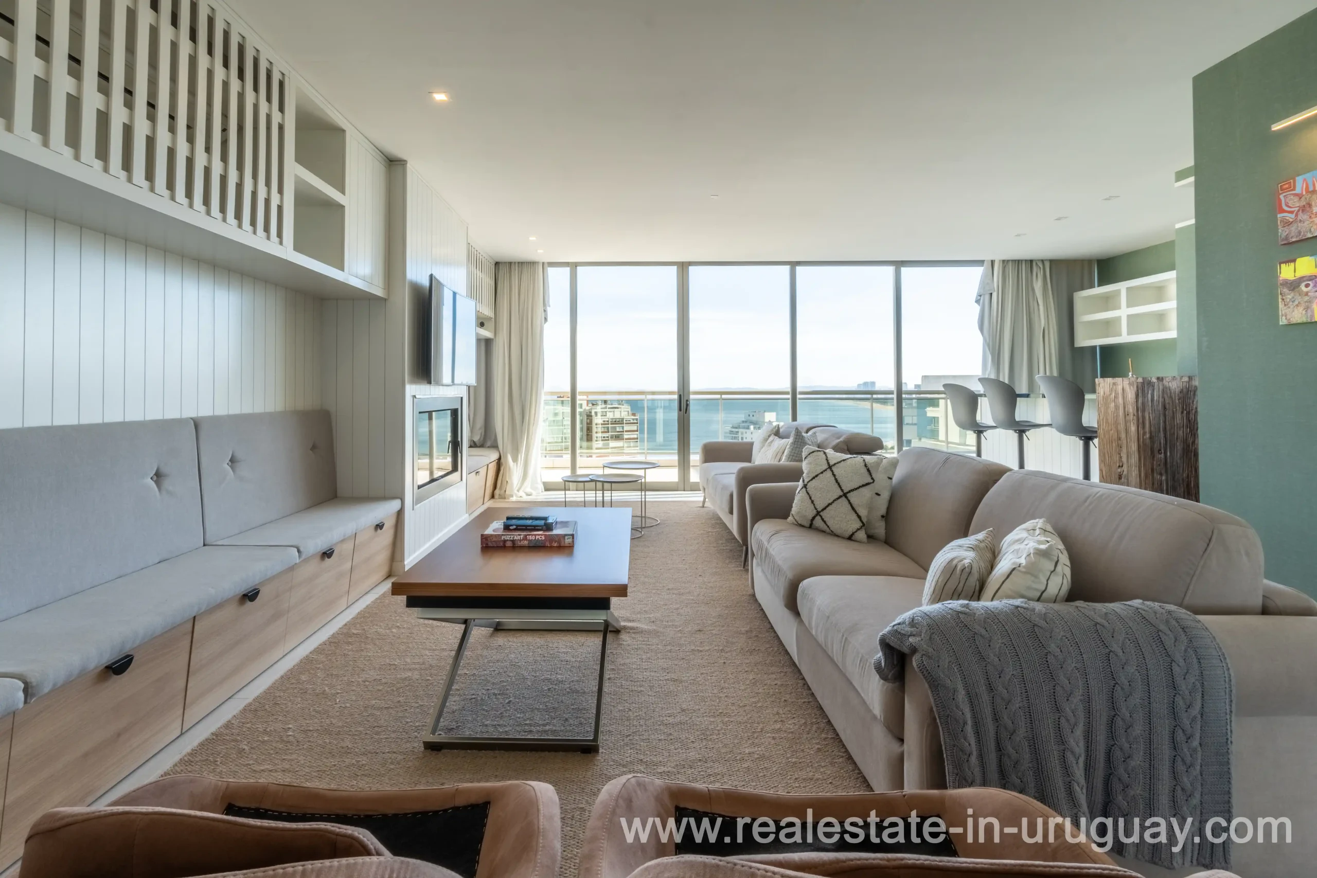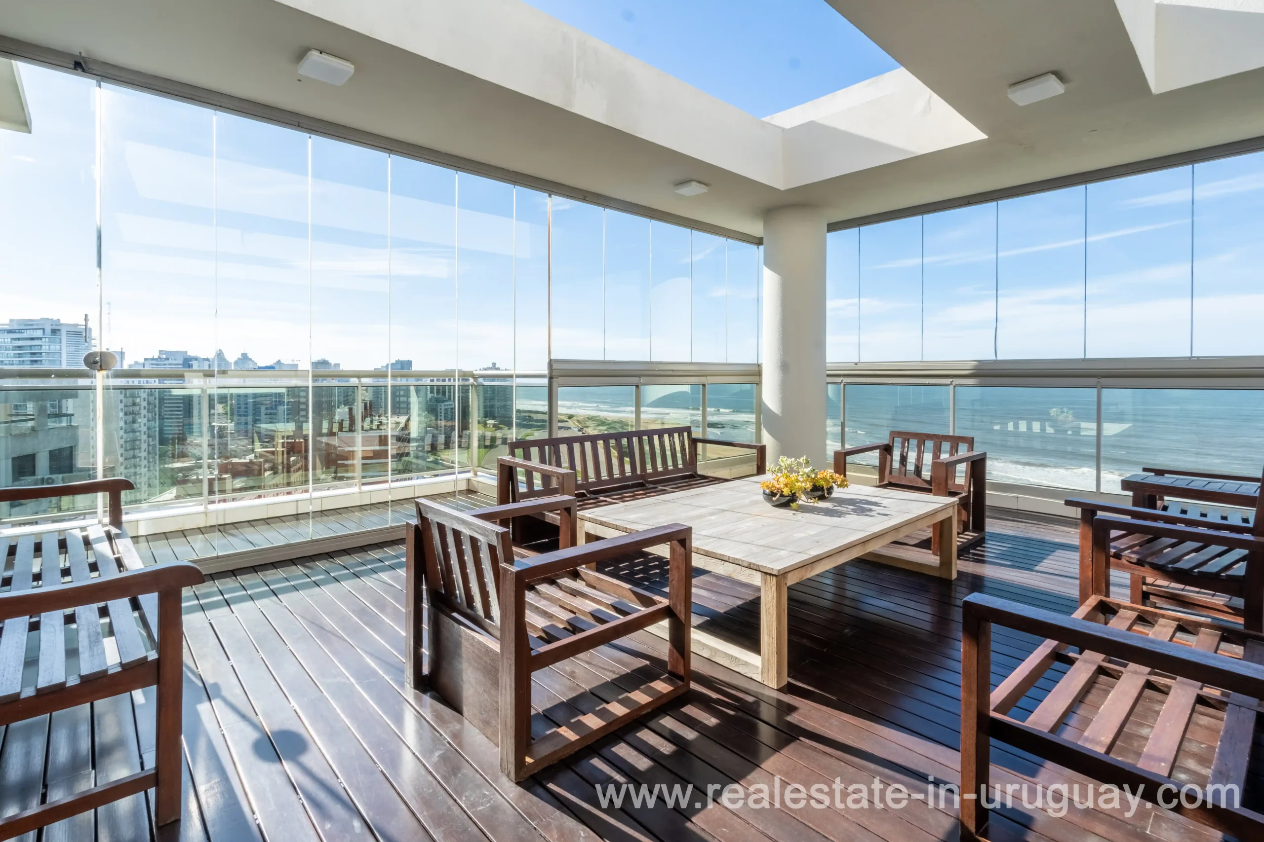 Dieses luxuriöse Duplex-Penthouse in der Nähe der Halbinsel in Punta Del Este liegt gegenüber der Playa Brava und bietet Meerblick sowie eine sehr gute Anbindung an alle Annehmlichkeiten, die Punta del Este zu bieten hat. Die spektakuläre Penthouse-Wohnung ist ideal für den Urlaub oder zum ganzjährigen Wohnen. Es besteht aus zwei Stockwerken und verfügt über großzügige Terrassen und einen großen privaten Swimmingpool. Auf der Hauptzugangsebene befinden sich ein helles Wohn-/Esszimmer mit einem vorderen Balkon, fünf Schlafzimmer mit eigenem Bad, ein Aufenthaltsraum, eine große Hauptküche, ein Gästebad, eine komplette Personalunterkunft und ein Hauswirtschaftsraum. Im Obergeschoss befinden sich ein großer, geschlossener Grill, eine zweite Küche, ein komplettes Badezimmer, ein Spielzimmer und eine geräumige Außenterrasse mit einem Swimmingpool und einem atemberaubenden Meerblick. Alle Zimmer sind mit Fußbodenheizung und Klimaanlage ausgestattet. Die Wohnung verfügt über fünf geschlossene Parkplätze und Abstellräume. Darüber hinaus bietet das Gebäude alle Arten von Dienstleistungen, darunter ein Freibad, ein beheiztes Hallenbad, einen Whirlpool, einen Fitnessraum mit modernsten Geräten, eine Sauna, gemeinschaftliche Spielbereiche für Jugendliche und Kinder, einen Kinosaal, ein Business Center, einen Tennisplatz, einen Mehrzweck-Synthetik-Sportplatz (Fußball, Volleyball und Basketball), drei Grills, die einzeln oder gemeinsam genutzt werden können, einen Friseursalon, ein Solarium, einen täglichen Zimmerservice, einen Wäscheservice und einen Strandservice.