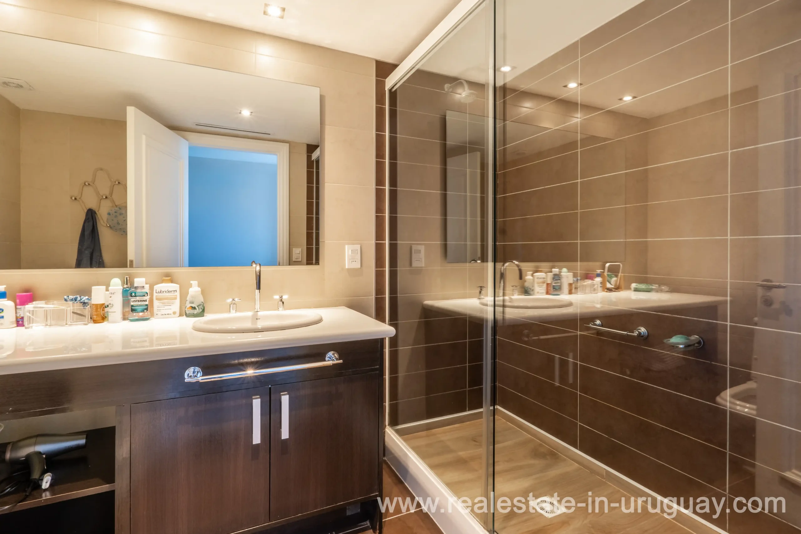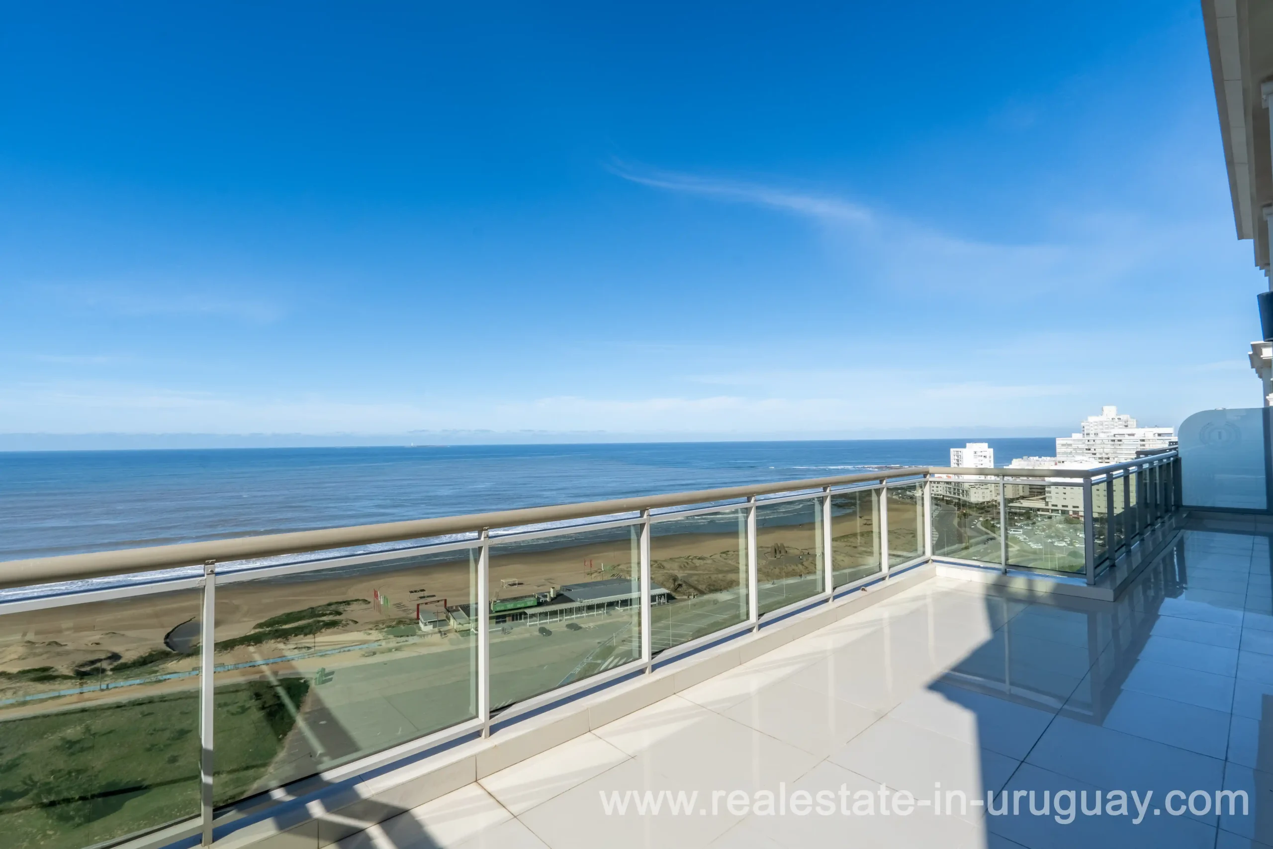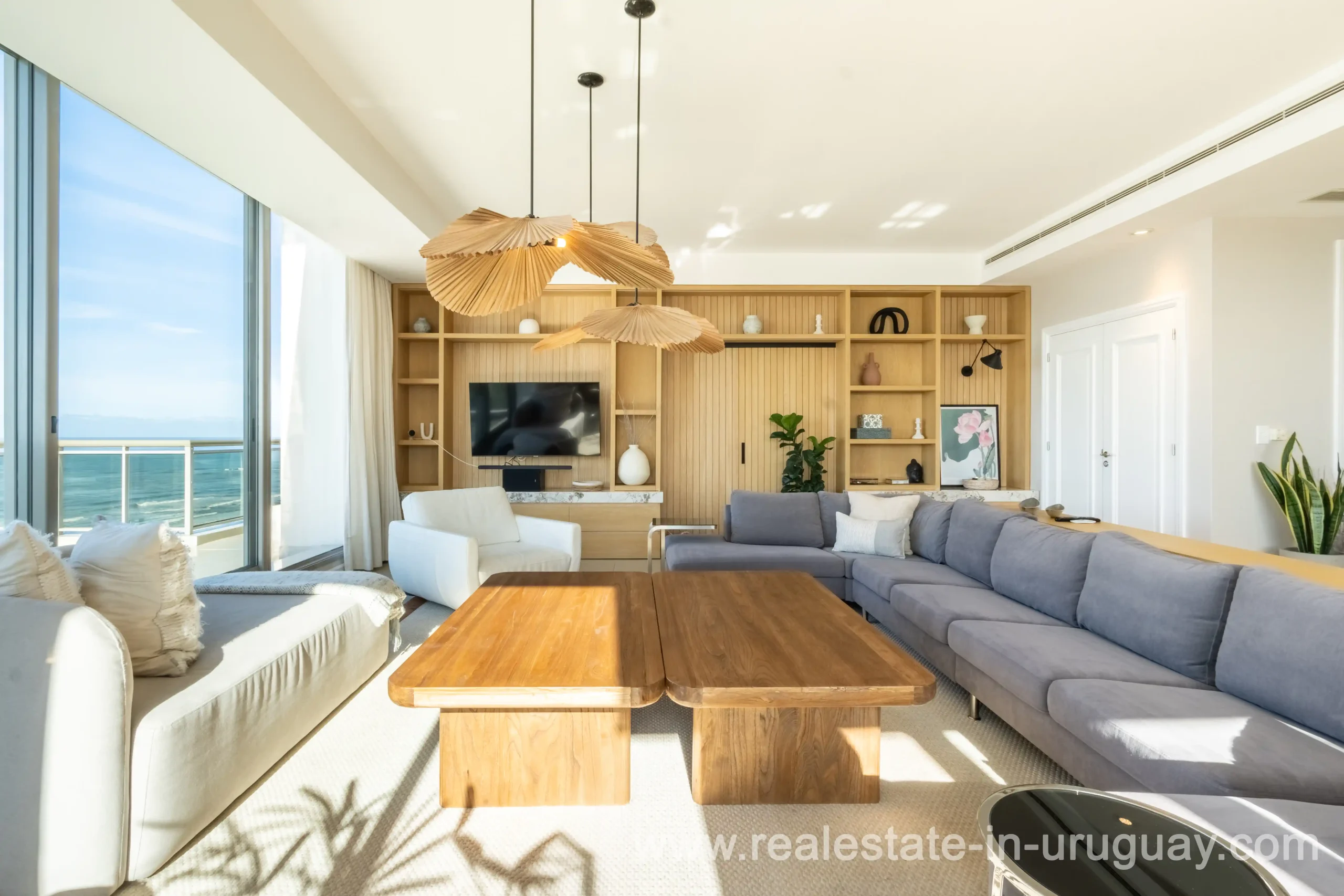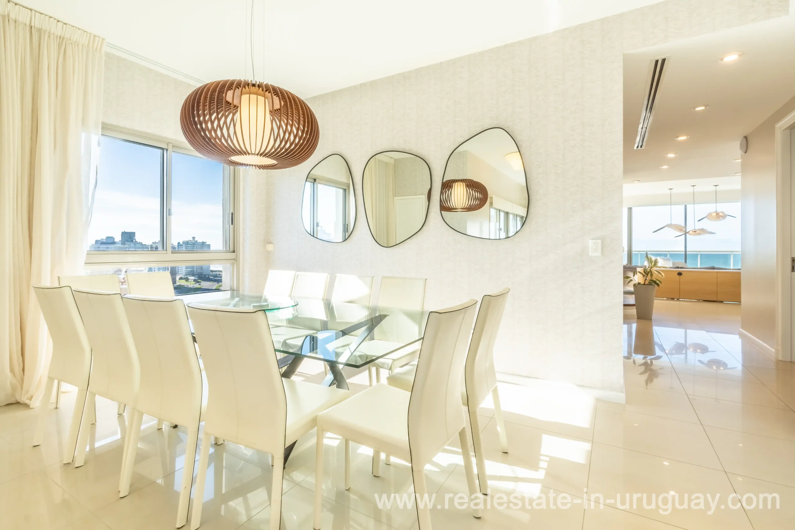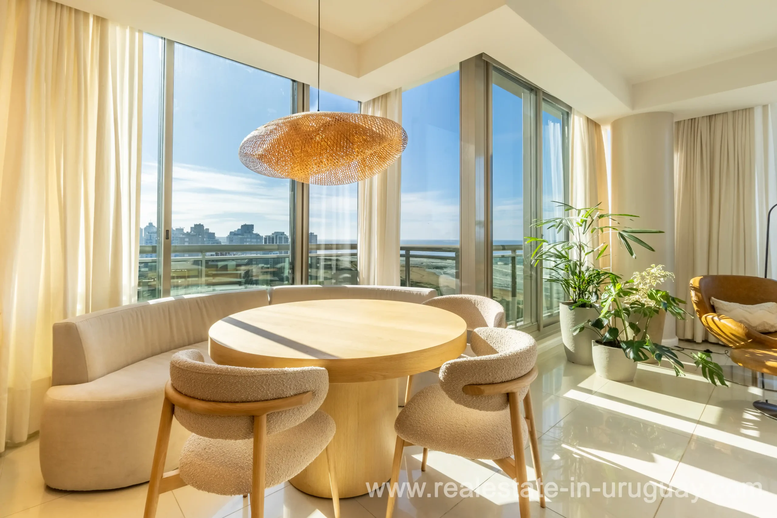 Dieses luxuriöse Duplex-Penthouse in der Nähe der Halbinsel in Punta Del Este liegt gegenüber der Playa Brava und bietet Meerblick sowie eine sehr gute Anbindung an alle Annehmlichkeiten, die Punta del Este zu bieten hat. Die spektakuläre Penthouse-Wohnung ist ideal für den Urlaub oder zum ganzjährigen Wohnen. Es besteht aus zwei Stockwerken und verfügt über großzügige Terrassen und einen großen privaten Swimmingpool. Auf der Hauptzugangsebene befinden sich ein helles Wohn-/Esszimmer mit einem vorderen Balkon, fünf Schlafzimmer mit eigenem Bad, ein Aufenthaltsraum, eine große Hauptküche, ein Gästebad, eine komplette Personalunterkunft und ein Hauswirtschaftsraum. Im Obergeschoss befinden sich ein großer, geschlossener Grill, eine zweite Küche, ein komplettes Badezimmer, ein Spielzimmer und eine geräumige Außenterrasse mit einem Swimmingpool und einem atemberaubenden Meerblick. Alle Zimmer sind mit Fußbodenheizung und Klimaanlage ausgestattet. Die Wohnung verfügt über fünf geschlossene Parkplätze und Abstellräume. Darüber hinaus bietet das Gebäude alle Arten von Dienstleistungen, darunter ein Freibad, ein beheiztes Hallenbad, einen Whirlpool, einen Fitnessraum mit modernsten Geräten, eine Sauna, gemeinschaftliche Spielbereiche für Jugendliche und Kinder, einen Kinosaal, ein Business Center, einen Tennisplatz, einen Mehrzweck-Synthetik-Sportplatz (Fußball, Volleyball und Basketball), drei Grills, die einzeln oder gemeinsam genutzt werden können, einen Friseursalon, ein Solarium, einen täglichen Zimmerservice, einen Wäscheservice und einen Strandservice.