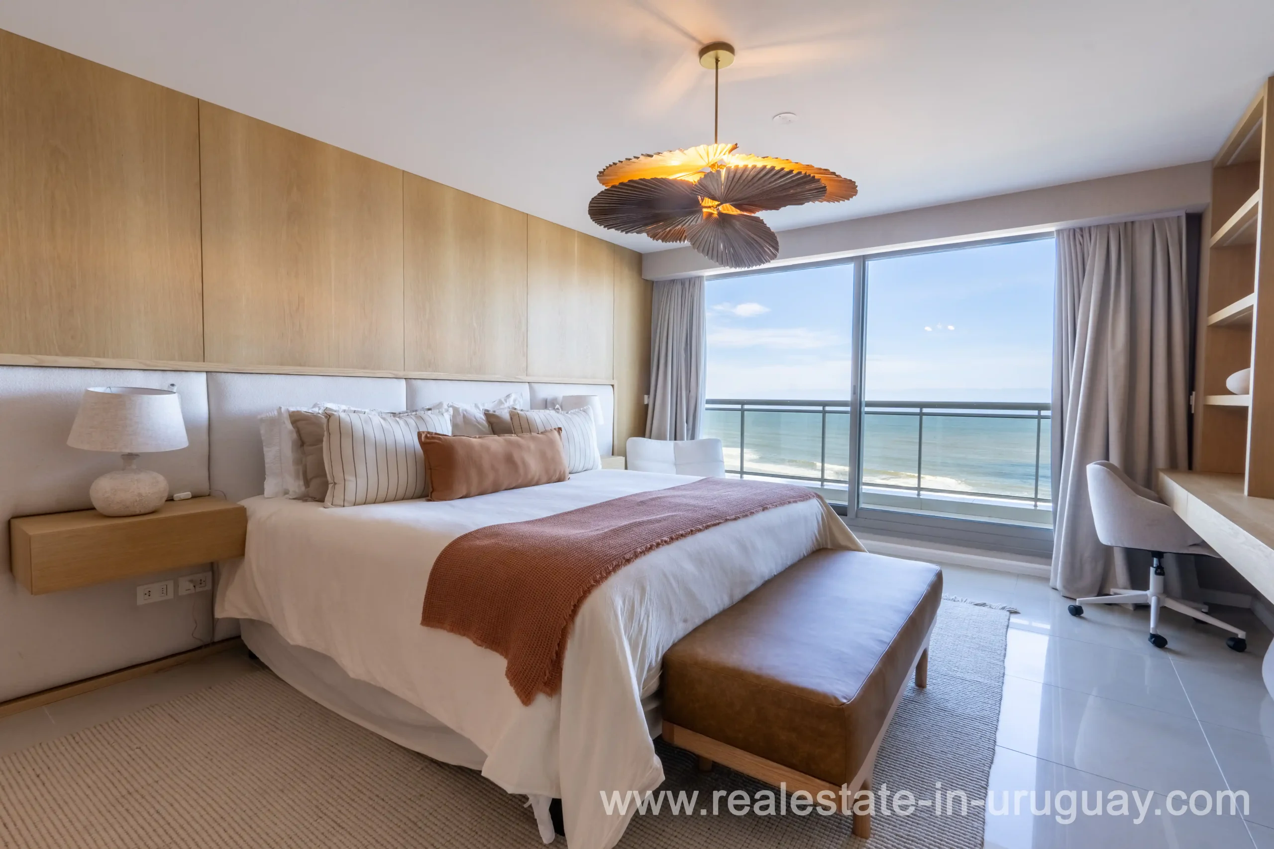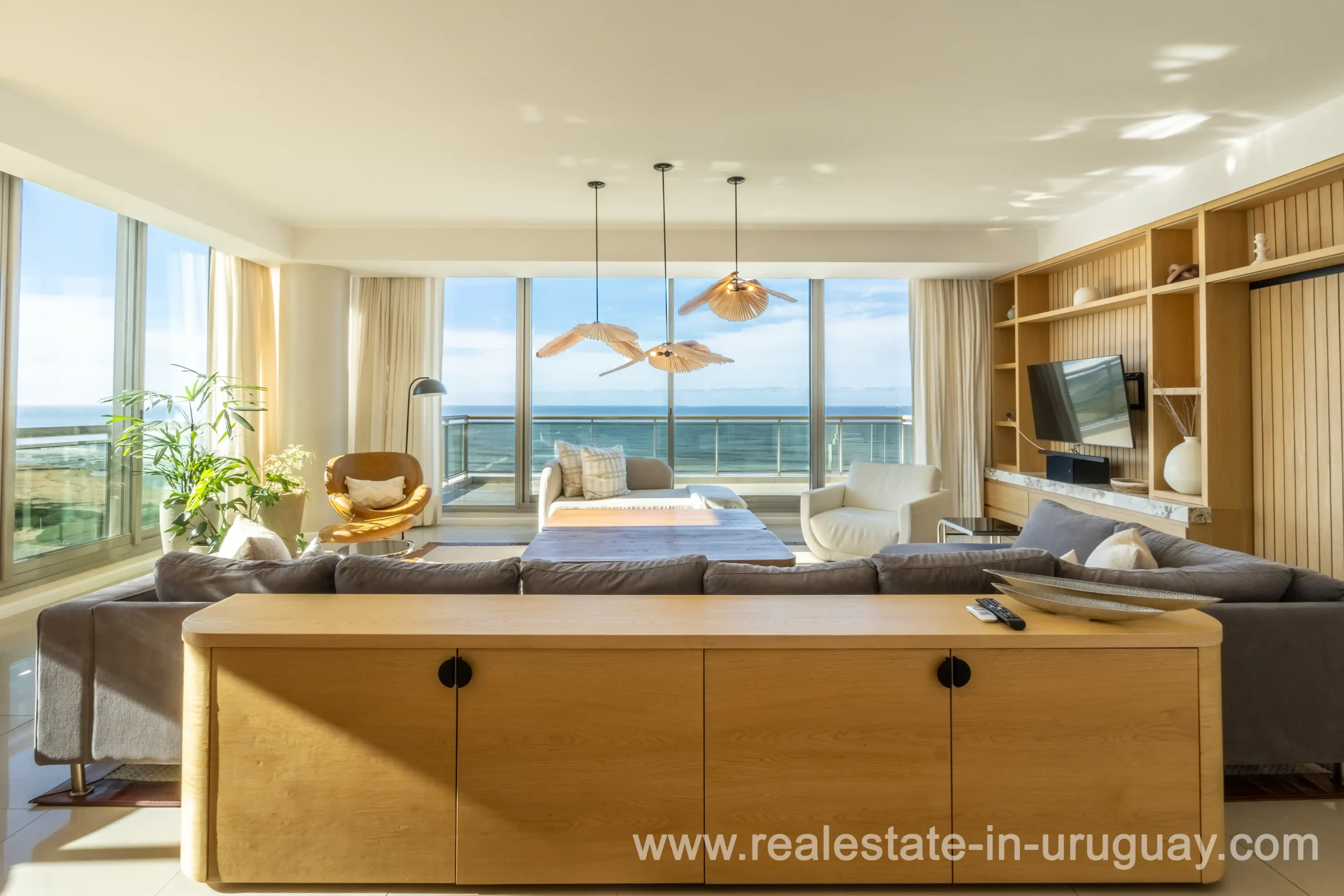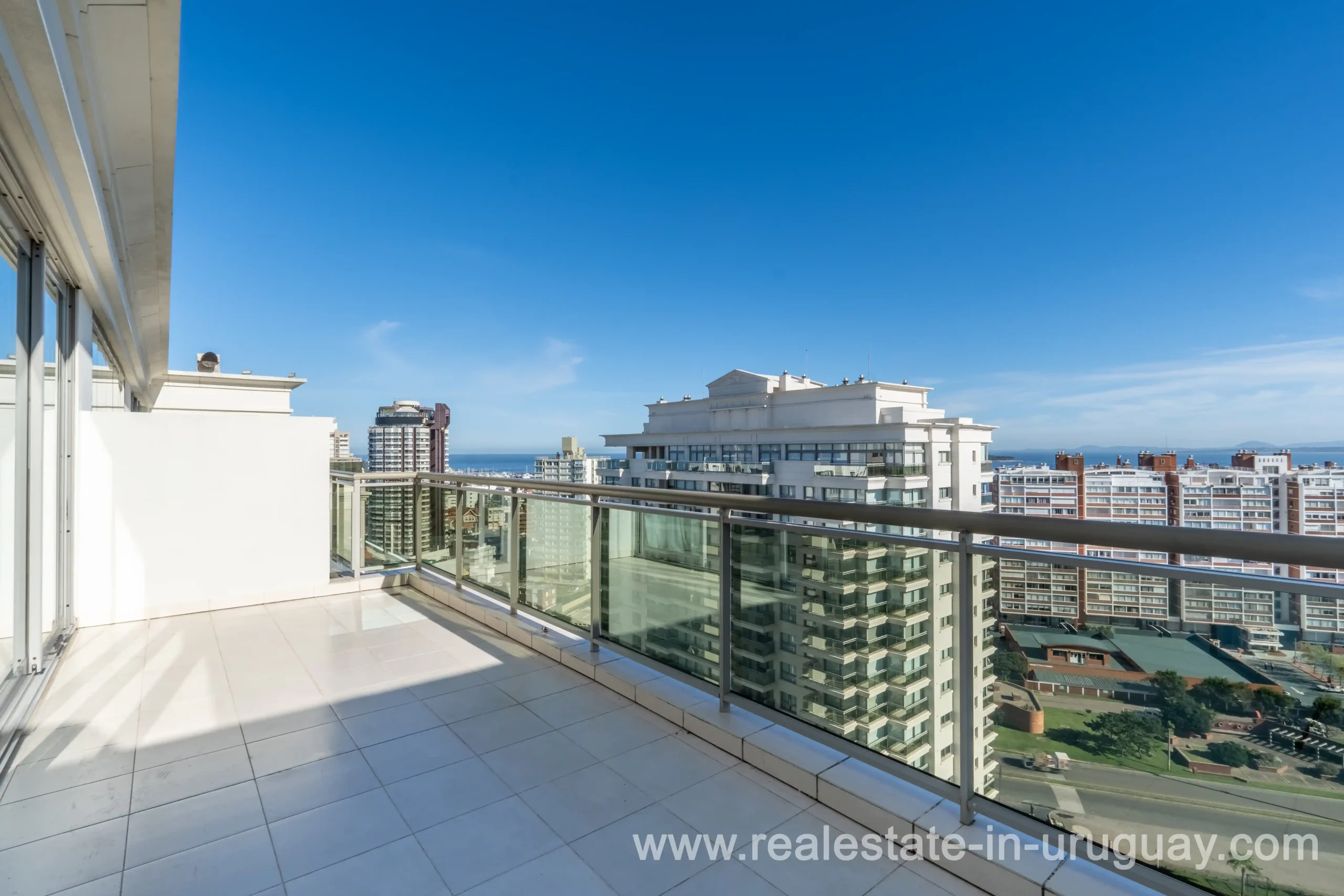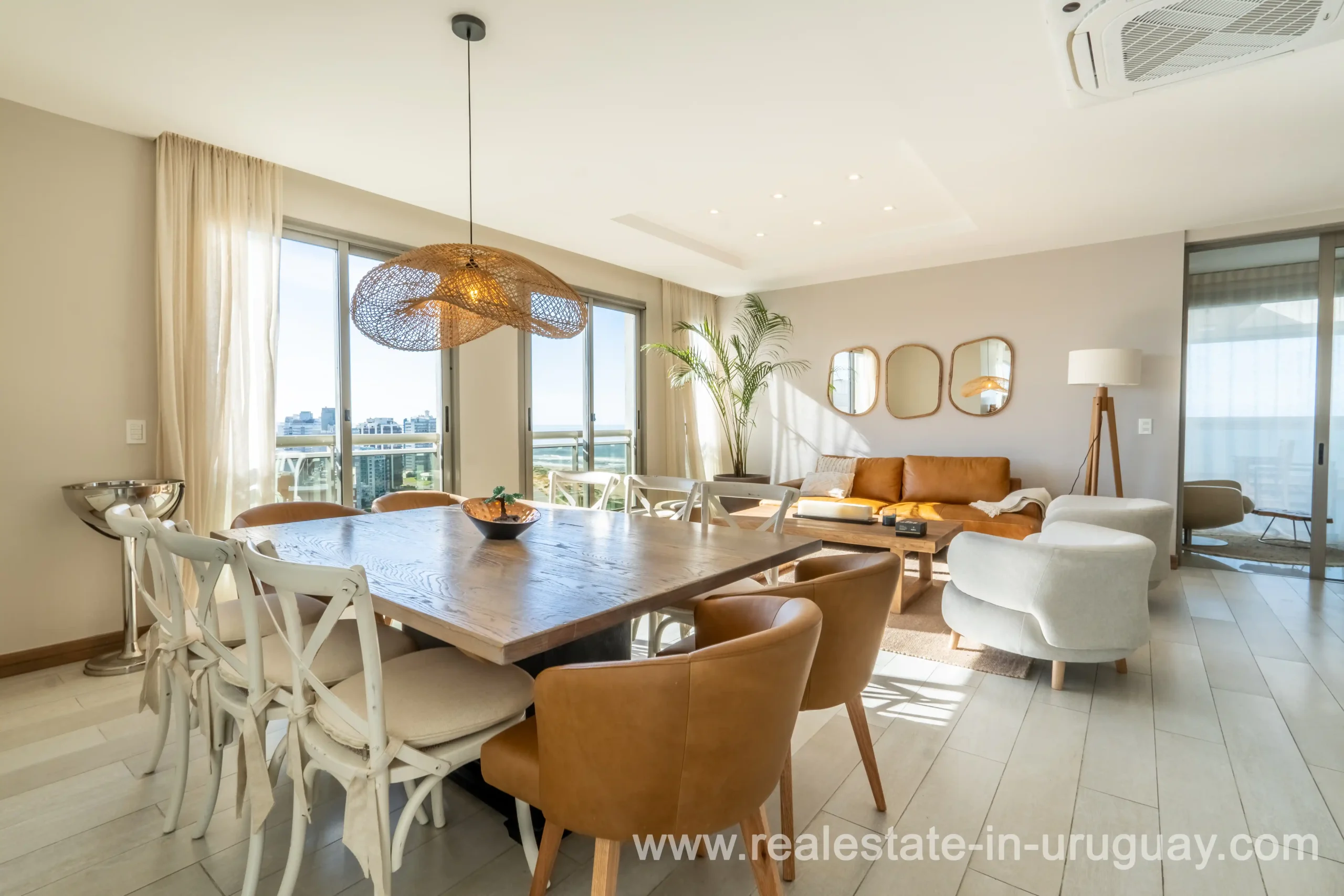 Dieses luxuriöse Duplex-Penthouse in der Nähe der Halbinsel in Punta Del Este liegt gegenüber der Playa Brava und bietet Meerblick sowie eine sehr gute Anbindung an alle Annehmlichkeiten, die Punta del Este zu bieten hat. Die spektakuläre Penthouse-Wohnung ist ideal für den Urlaub oder zum ganzjährigen Wohnen. Es besteht aus zwei Stockwerken und verfügt über großzügige Terrassen und einen großen privaten Swimmingpool. Auf der Hauptzugangsebene befinden sich ein helles Wohn-/Esszimmer mit einem vorderen Balkon, fünf Schlafzimmer mit eigenem Bad, ein Aufenthaltsraum, eine große Hauptküche, ein Gästebad, eine komplette Personalunterkunft und ein Hauswirtschaftsraum. Im Obergeschoss befinden sich ein großer, geschlossener Grill, eine zweite Küche, ein komplettes Badezimmer, ein Spielzimmer und eine geräumige Außenterrasse mit einem Swimmingpool und einem atemberaubenden Meerblick. Alle Zimmer sind mit Fußbodenheizung und Klimaanlage ausgestattet. Die Wohnung verfügt über fünf geschlossene Parkplätze und Abstellräume. Darüber hinaus bietet das Gebäude alle Arten von Dienstleistungen, darunter ein Freibad, ein beheiztes Hallenbad, einen Whirlpool, einen Fitnessraum mit modernsten Geräten, eine Sauna, gemeinschaftliche Spielbereiche für Jugendliche und Kinder, einen Kinosaal, ein Business Center, einen Tennisplatz, einen Mehrzweck-Synthetik-Sportplatz (Fußball, Volleyball und Basketball), drei Grills, die einzeln oder gemeinsam genutzt werden können, einen Friseursalon, ein Solarium, einen täglichen Zimmerservice, einen Wäscheservice und einen Strandservice.