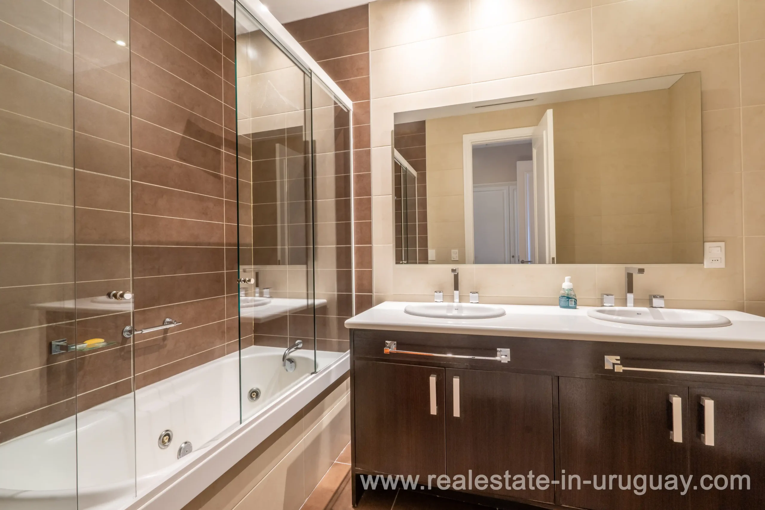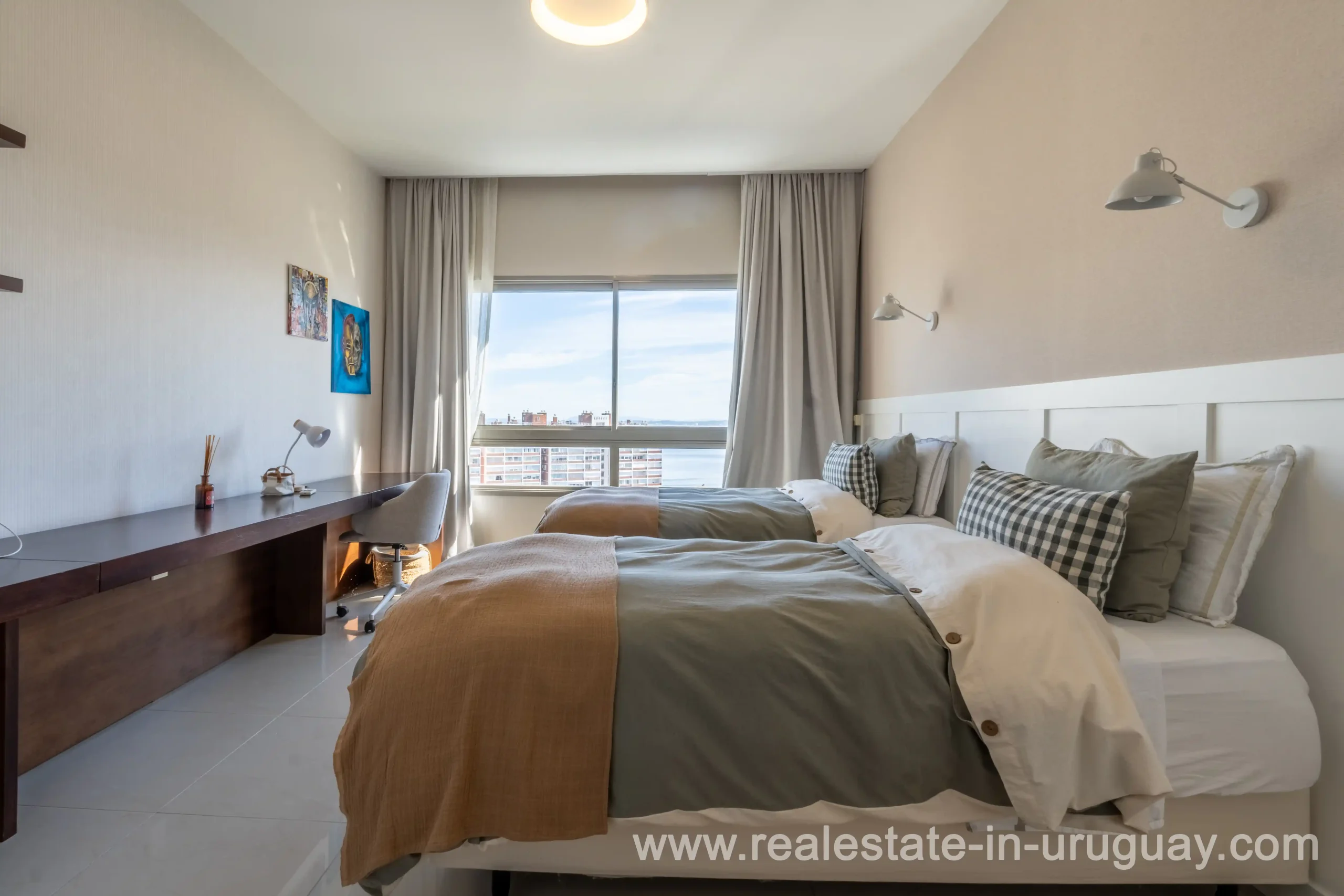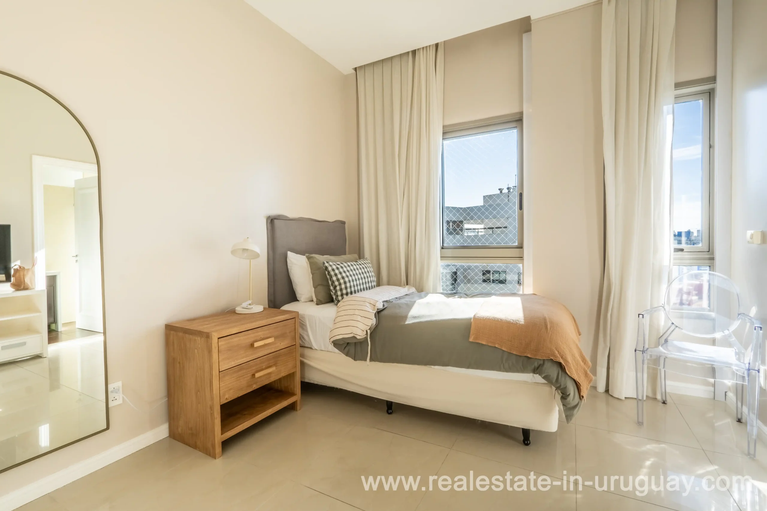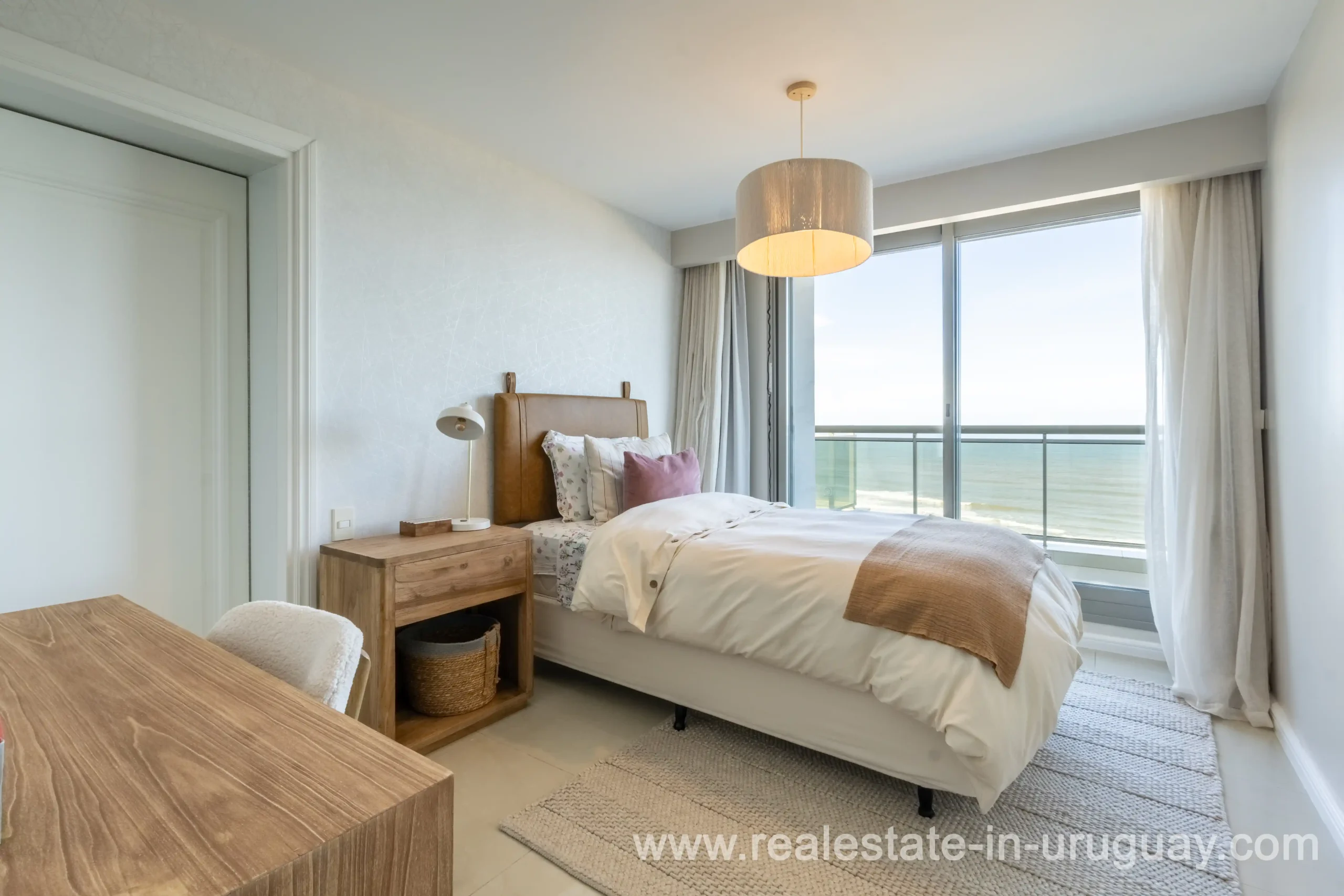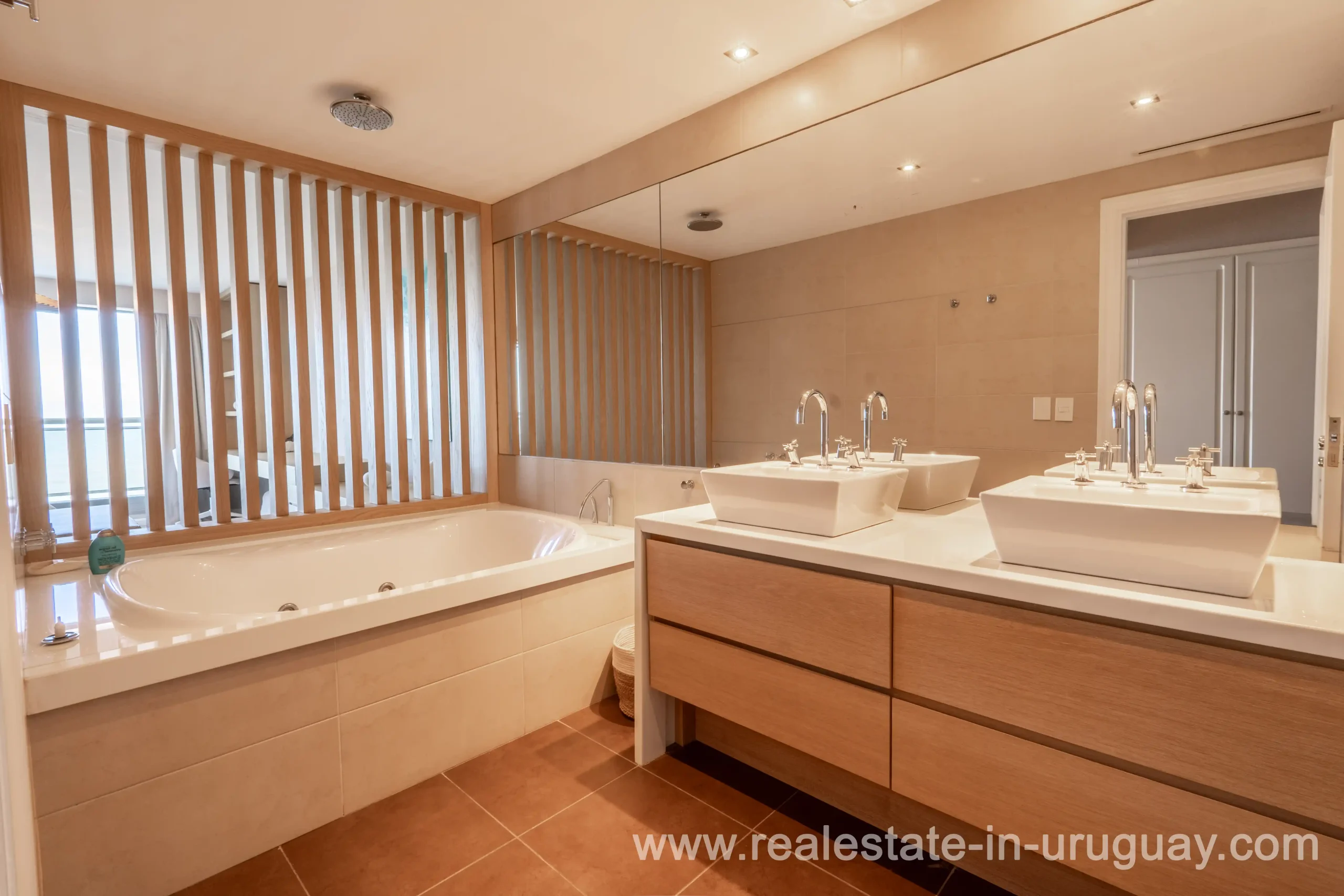 Dieses luxuriöse Duplex-Penthouse in der Nähe der Halbinsel in Punta Del Este liegt gegenüber der Playa Brava und bietet Meerblick sowie eine sehr gute Anbindung an alle Annehmlichkeiten, die Punta del Este zu bieten hat. Die spektakuläre Penthouse-Wohnung ist ideal für den Urlaub oder zum ganzjährigen Wohnen. Es besteht aus zwei Stockwerken und verfügt über großzügige Terrassen und einen großen privaten Swimmingpool. Auf der Hauptzugangsebene befinden sich ein helles Wohn-/Esszimmer mit einem vorderen Balkon, fünf Schlafzimmer mit eigenem Bad, ein Aufenthaltsraum, eine große Hauptküche, ein Gästebad, eine komplette Personalunterkunft und ein Hauswirtschaftsraum. Im Obergeschoss befinden sich ein großer, geschlossener Grill, eine zweite Küche, ein komplettes Badezimmer, ein Spielzimmer und eine geräumige Außenterrasse mit einem Swimmingpool und einem atemberaubenden Meerblick. Alle Zimmer sind mit Fußbodenheizung und Klimaanlage ausgestattet. Die Wohnung verfügt über fünf geschlossene Parkplätze und Abstellräume. Darüber hinaus bietet das Gebäude alle Arten von Dienstleistungen, darunter ein Freibad, ein beheiztes Hallenbad, einen Whirlpool, einen Fitnessraum mit modernsten Geräten, eine Sauna, gemeinschaftliche Spielbereiche für Jugendliche und Kinder, einen Kinosaal, ein Business Center, einen Tennisplatz, einen Mehrzweck-Synthetik-Sportplatz (Fußball, Volleyball und Basketball), drei Grills, die einzeln oder gemeinsam genutzt werden können, einen Friseursalon, ein Solarium, einen täglichen Zimmerservice, einen Wäscheservice und einen Strandservice.