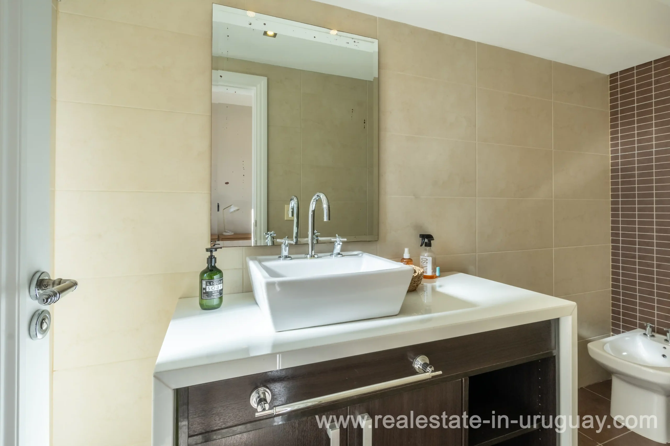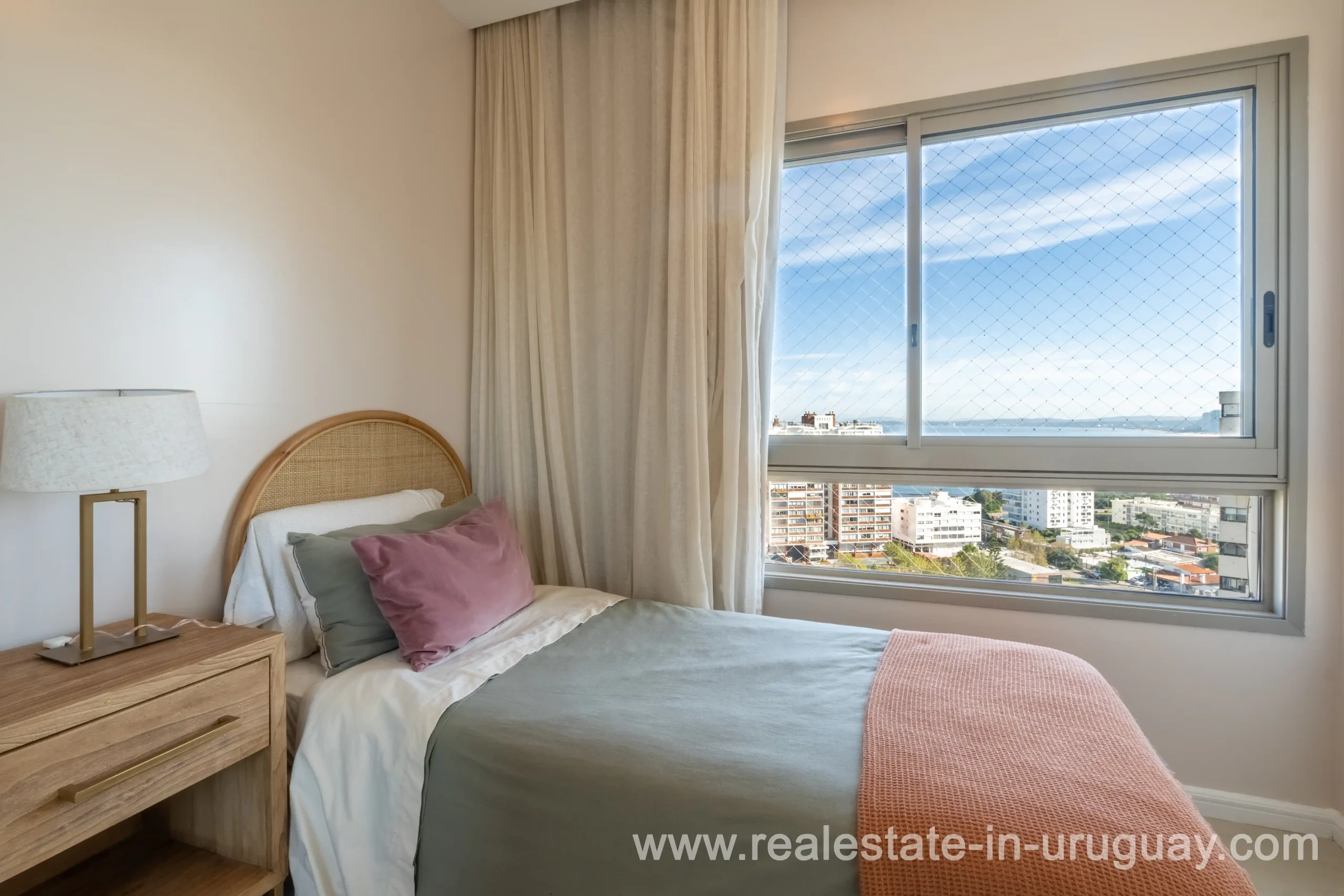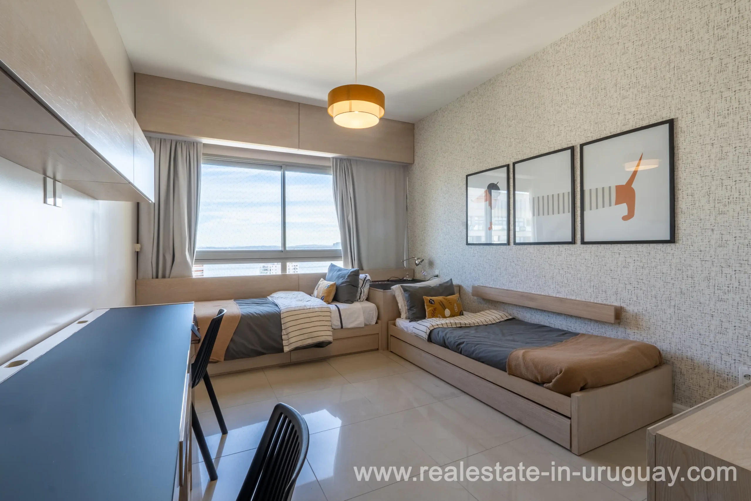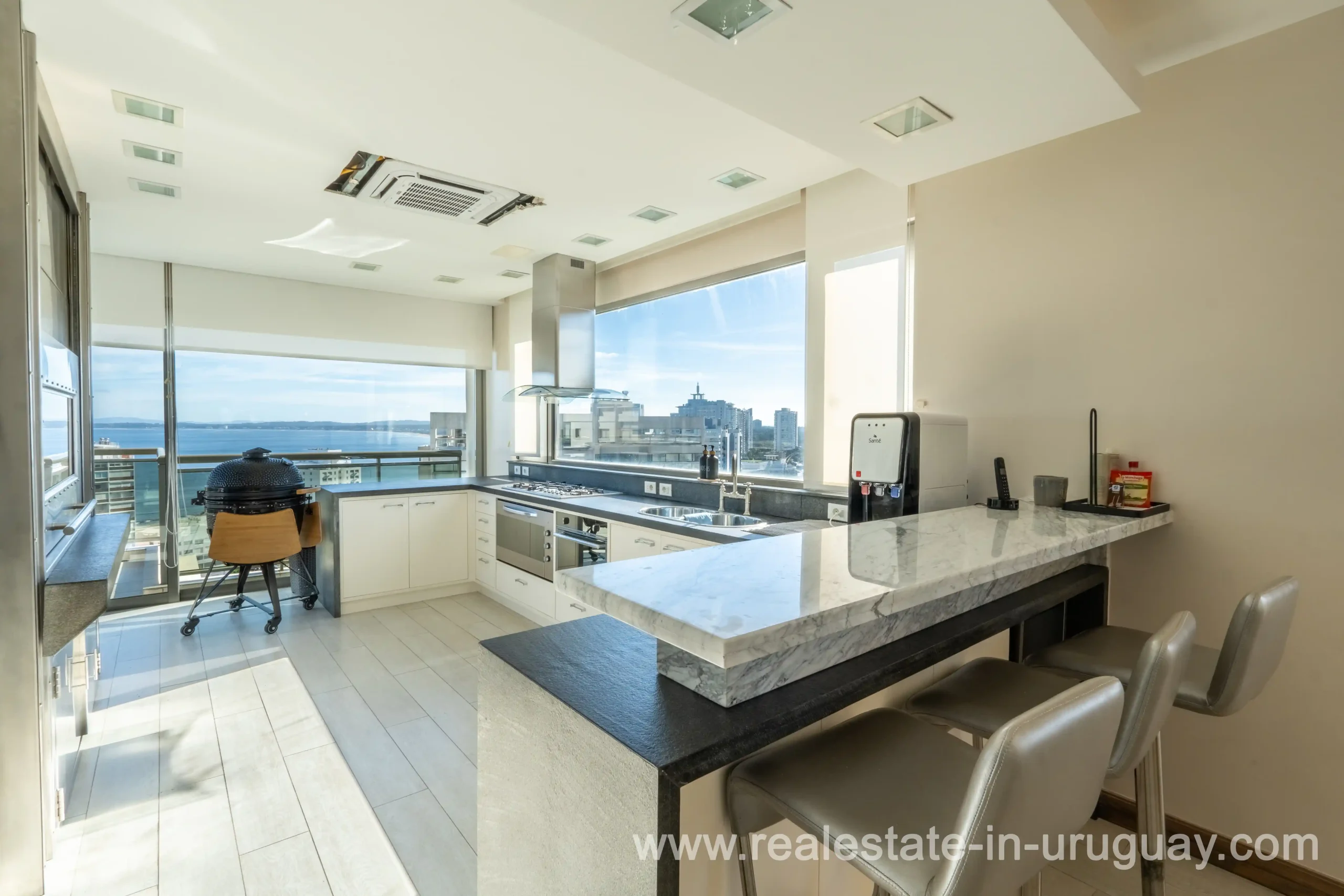 Dieses luxuriöse Duplex-Penthouse in der Nähe der Halbinsel in Punta Del Este liegt gegenüber der Playa Brava und bietet Meerblick sowie eine sehr gute Anbindung an alle Annehmlichkeiten, die Punta del Este zu bieten hat. Die spektakuläre Penthouse-Wohnung ist ideal für den Urlaub oder zum ganzjährigen Wohnen. Es besteht aus zwei Stockwerken und verfügt über großzügige Terrassen und einen großen privaten Swimmingpool. Auf der Hauptzugangsebene befinden sich ein helles Wohn-/Esszimmer mit einem vorderen Balkon, fünf Schlafzimmer mit eigenem Bad, ein Aufenthaltsraum, eine große Hauptküche, ein Gästebad, eine komplette Personalunterkunft und ein Hauswirtschaftsraum. Im Obergeschoss befinden sich ein großer, geschlossener Grill, eine zweite Küche, ein komplettes Badezimmer, ein Spielzimmer und eine geräumige Außenterrasse mit einem Swimmingpool und einem atemberaubenden Meerblick. Alle Zimmer sind mit Fußbodenheizung und Klimaanlage ausgestattet. Die Wohnung verfügt über fünf geschlossene Parkplätze und Abstellräume. Darüber hinaus bietet das Gebäude alle Arten von Dienstleistungen, darunter ein Freibad, ein beheiztes Hallenbad, einen Whirlpool, einen Fitnessraum mit modernsten Geräten, eine Sauna, gemeinschaftliche Spielbereiche für Jugendliche und Kinder, einen Kinosaal, ein Business Center, einen Tennisplatz, einen Mehrzweck-Synthetik-Sportplatz (Fußball, Volleyball und Basketball), drei Grills, die einzeln oder gemeinsam genutzt werden können, einen Friseursalon, ein Solarium, einen täglichen Zimmerservice, einen Wäscheservice und einen Strandservice.