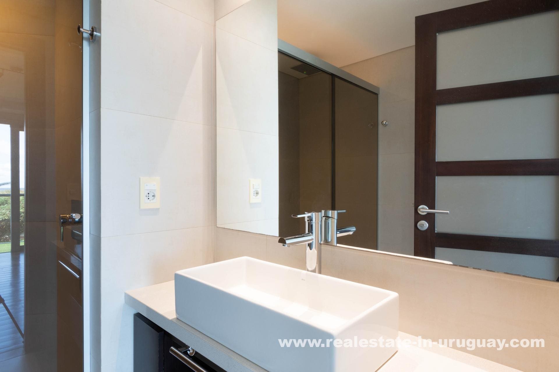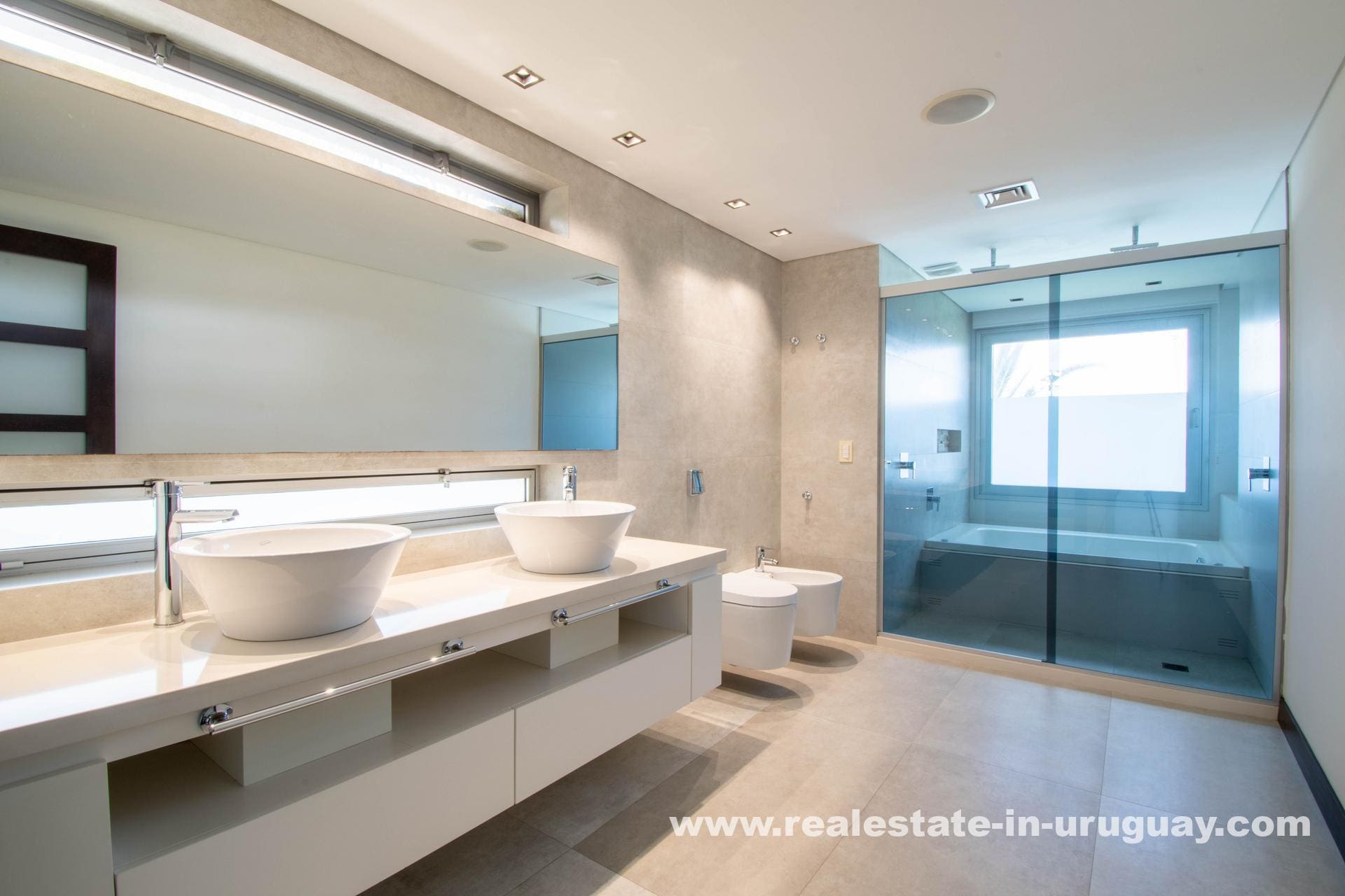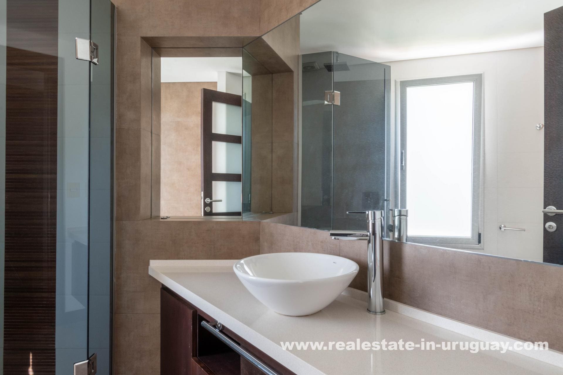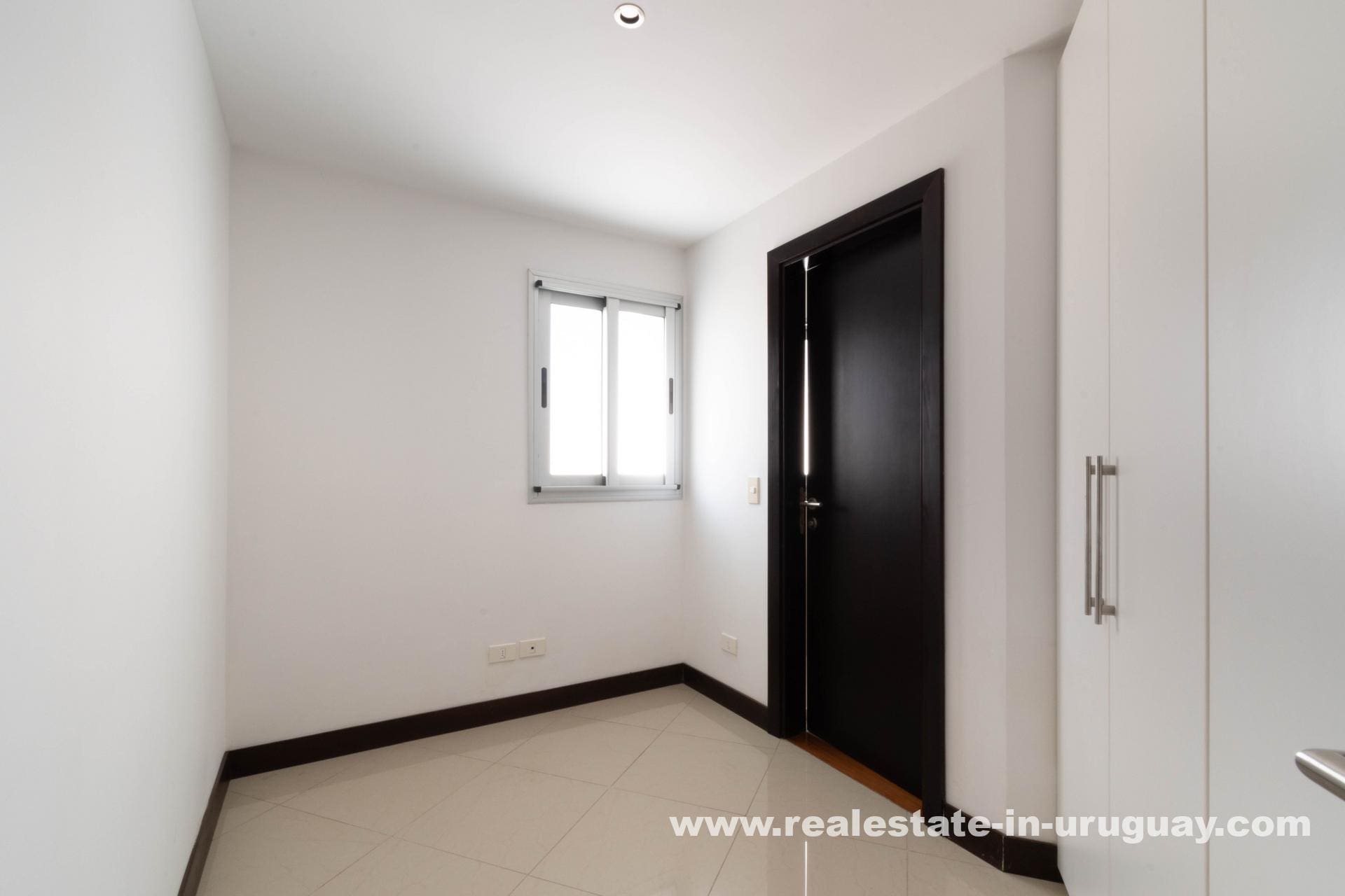 Der private Bereich besteht aus drei großzügigen Schlafzimmern, jedes mit eigenem Bad en suite. Die Master-Suite besticht durch direkten Terrassenzugang, einen begehbaren Kleiderschrank und ein luxuriöses Badezimmer mit Whirlpool-Badewanne und separater Dusche. Zu den weiteren Annehmlichkeiten gehören ein Waschraum, ein Personalzimmer mit Bad sowie zwei eigene Garagenstellplätze, die direkt vom Apartment aus zugänglich sind.