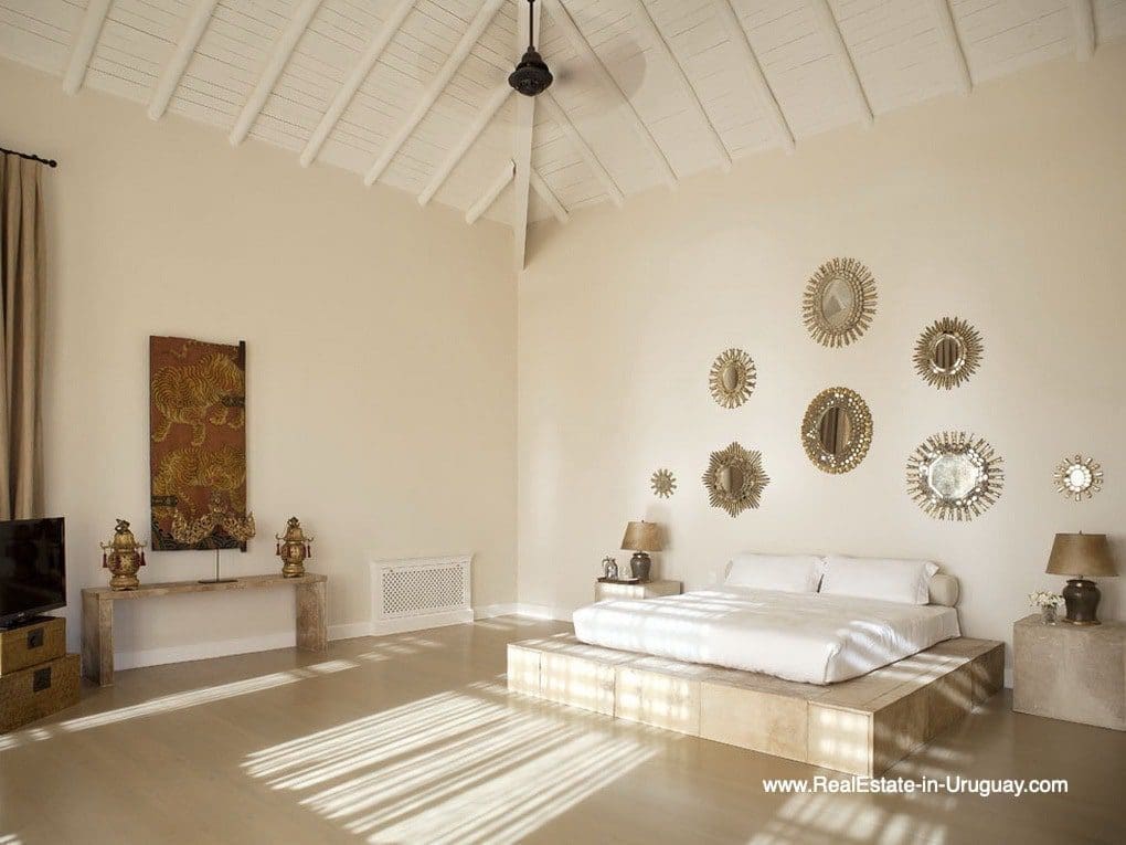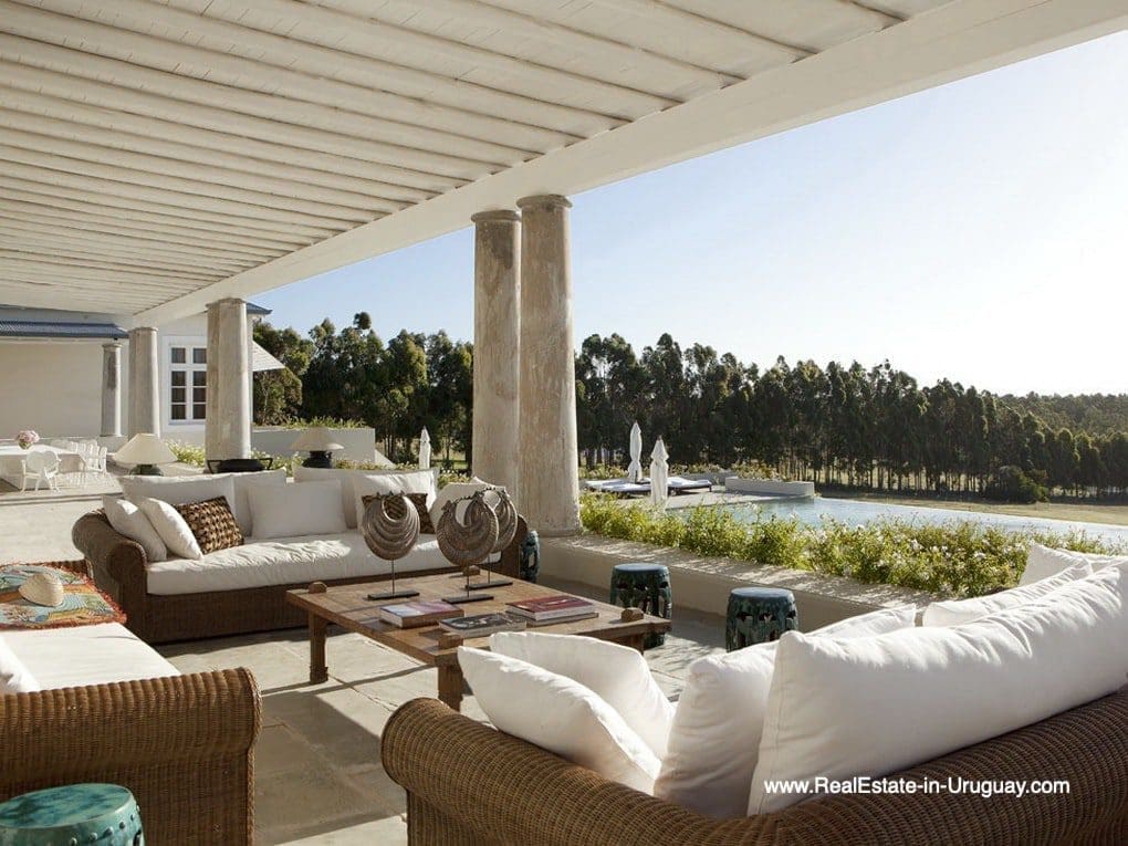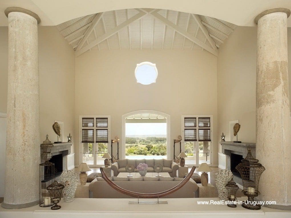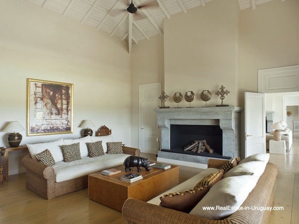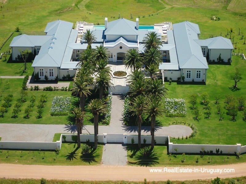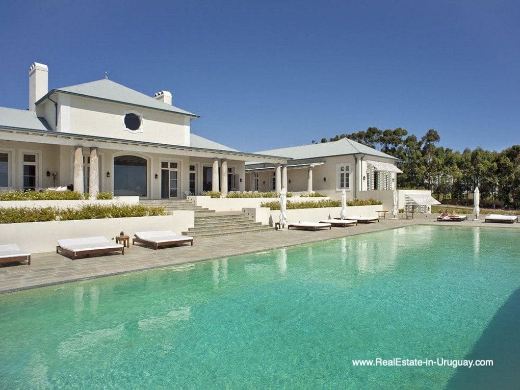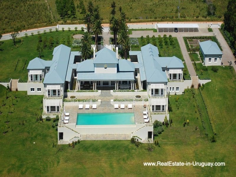This exceptional luxury country ranch by golf course La Barra outside Punta del Este on 5 hectares land is located in the exclusive area of ‚El Golf‘ in La Barra and just minutes from the center of the beach town La Barra and Manantiales and not far from José Ignacio. Built on a hill, it enjoys wonderful views over the Maldonado River and a beautiful lagoon as well as stunning sunset views. The impressive grounds were designed by the Italian landscape architect Stefano Baccari. The main house comprises seven suites with private terrace, TV lounge, living room with two wood burning stoves, lounge/dining room, spacious designer kitchen, office, utility room, gymnasium and spa with sauna. Outside, there is an almost Olympic-sized swimming pool, deck with living room and dining room catering for twenty-two people. The house also has two staff bedrooms with two bathrooms and caretaker’s lodge or separate security lodge. It’s impeccable design along with its excellent decor make this a unique property in the Punta del Este area
