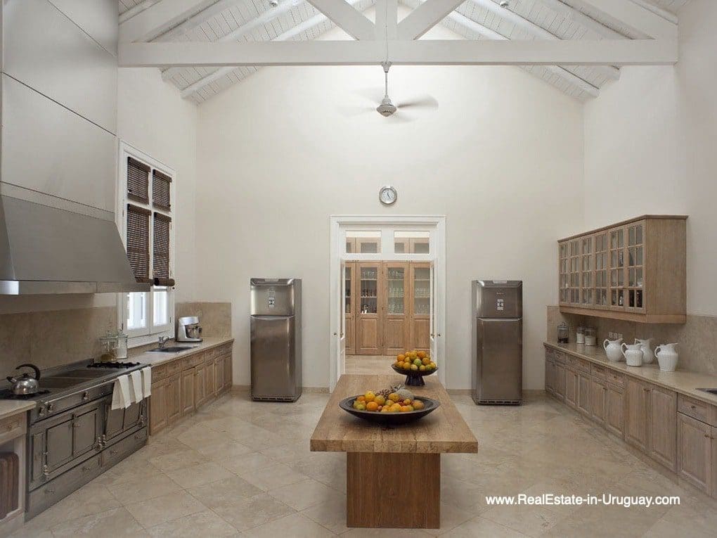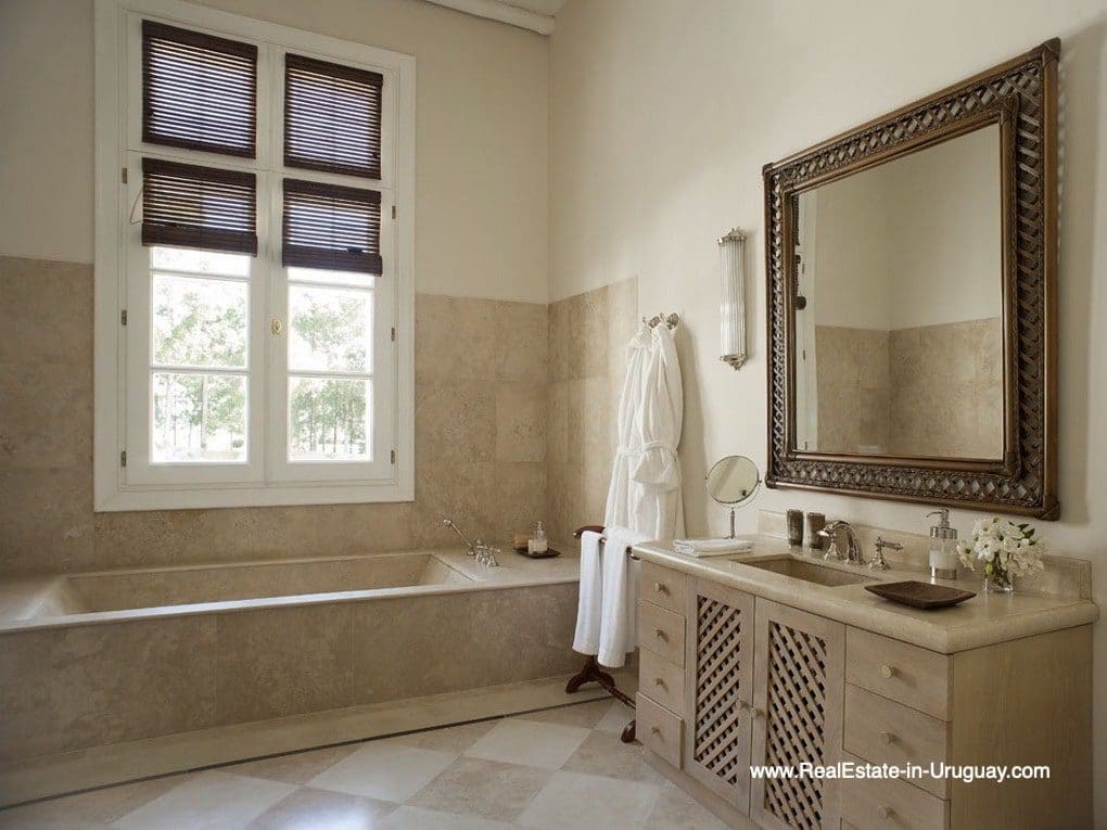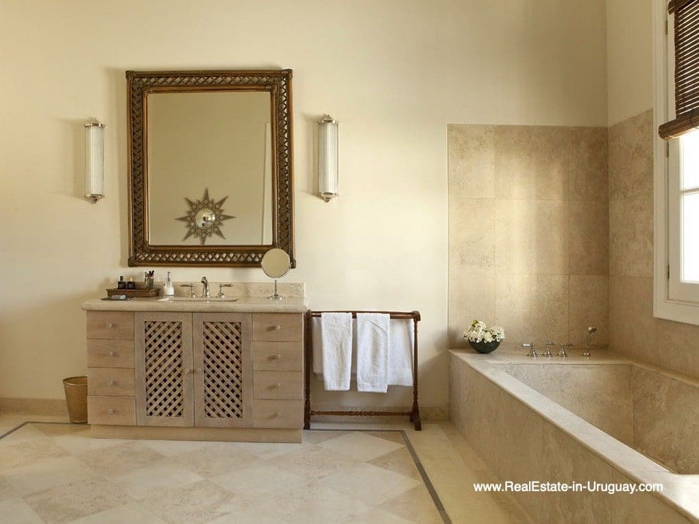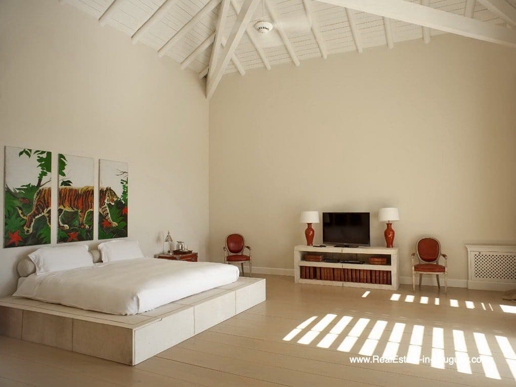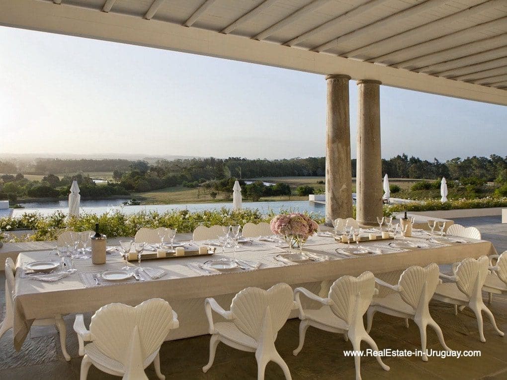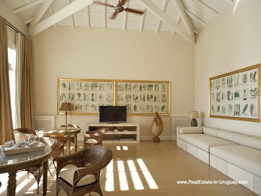 This exceptional luxury country ranch by golf course La Barra outside Punta del Este on 5 hectares land is located in the exclusive area of ‚El Golf‘ in La Barra and just minutes from the center of the beach town La Barra and Manantiales and not far from José Ignacio. Built on a hill, it enjoys wonderful views over the Maldonado River and a beautiful lagoon as well as stunning sunset views. The impressive grounds were designed by the Italian landscape architect Stefano Baccari. The main house comprises seven suites with private terrace, TV lounge, living room with two wood burning stoves, lounge/dining room, spacious designer kitchen, office, utility room, gymnasium and spa with sauna. Outside, there is an almost Olympic-sized swimming pool, deck with living room and dining room catering for twenty-two people. The house also has two staff bedrooms with two bathrooms and caretaker’s lodge or separate security lodge. It’s impeccable design along with its excellent decor make this a unique property in the Punta del Este area