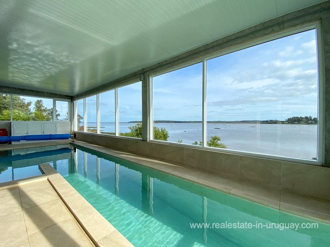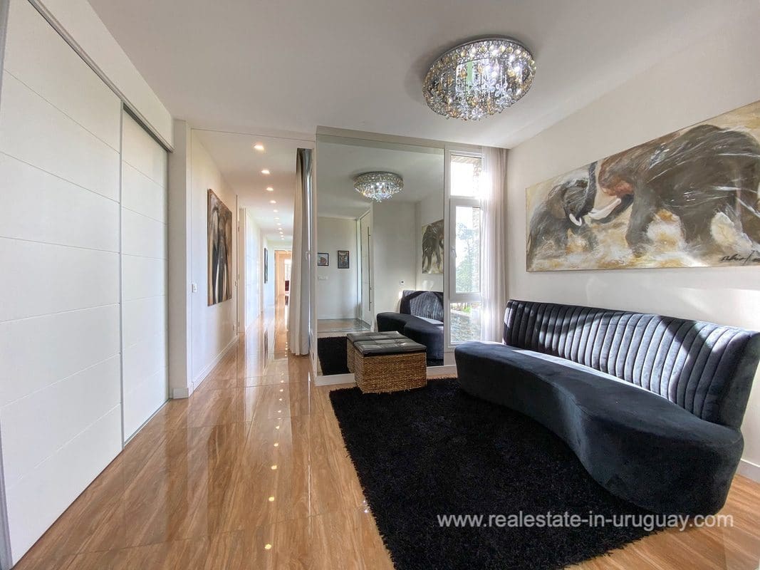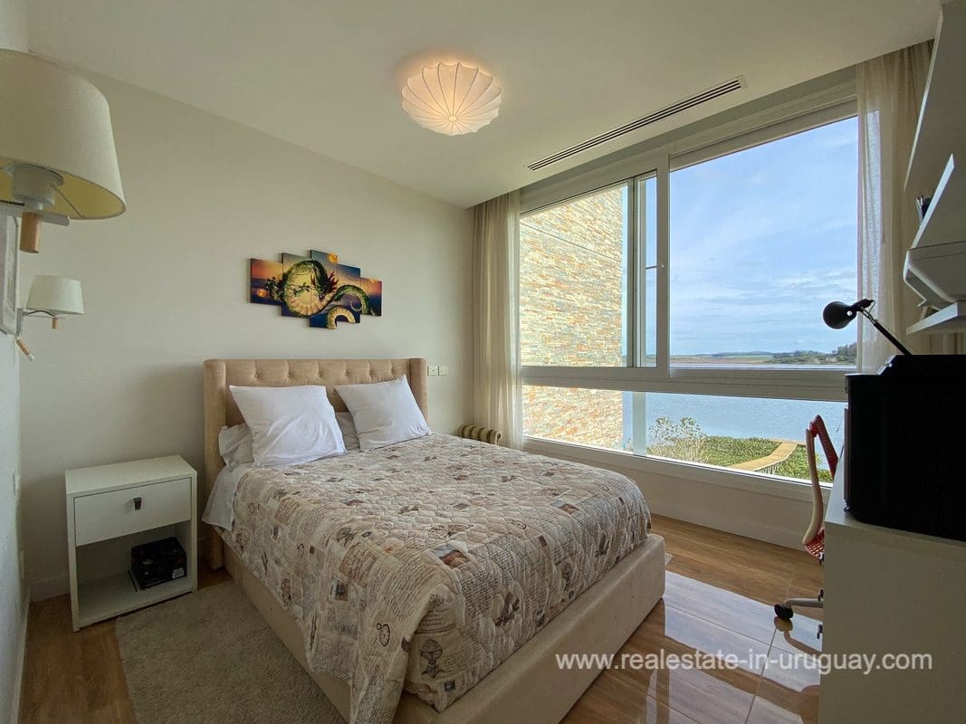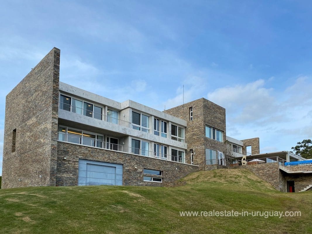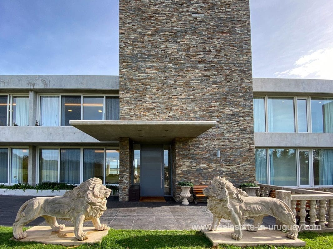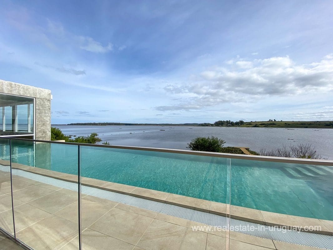 This modern house on Laguna del Sauce is located in a unique spot offering amazing sunset views and boasts a special, distinct and daring design. It is situated on a 18-hectare plot with a building measuring 1,200m2 with six bedrooms, making this a large property. Built in 2017, it has electric radial heating, electric blinds, a heated swimming pool, two staff apartments, and two water wells, and was all designed by the architect, Eleonora de Leon. Laguna del Sauce is the largest body of water in the town with tributaries from the rivers Sauce, Mallorquina, Potrero, and Pan de Azúcar. The east side of Laguna del Sauce has become an exclusive international neighborhood and has some beautiful local places, like the Las Cumbres resort and Pueblo Edén to the north of the lagoon and Solanas and Punta Ballena to the south nearby. Its strategic location is just 16km from the coast and the shopping center, 21km from Laguna del Sauce Airport, 25km from the Punta del Este peninsula, and 110km from Montevideo. An ideal place for someone looking to be on the water and having some land around the house.