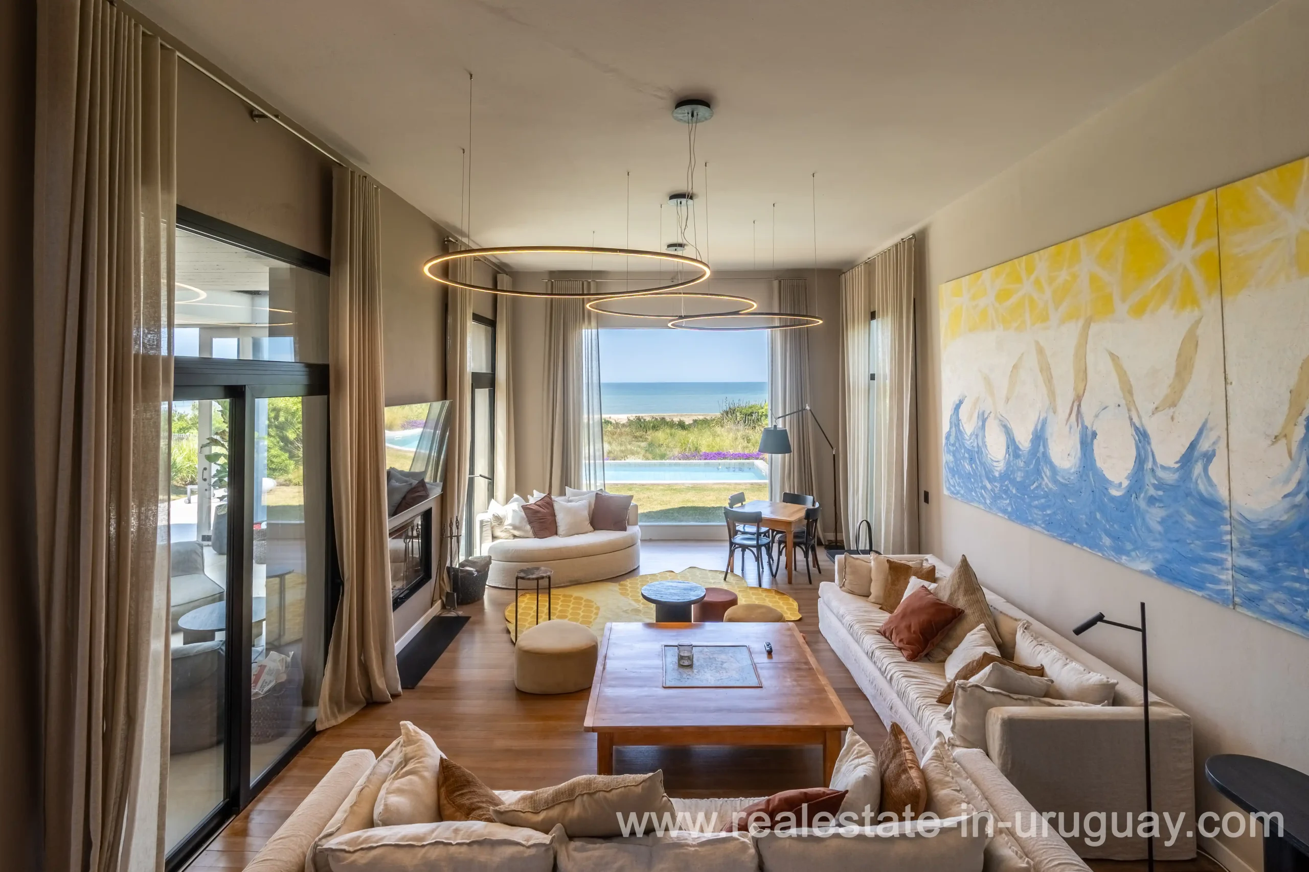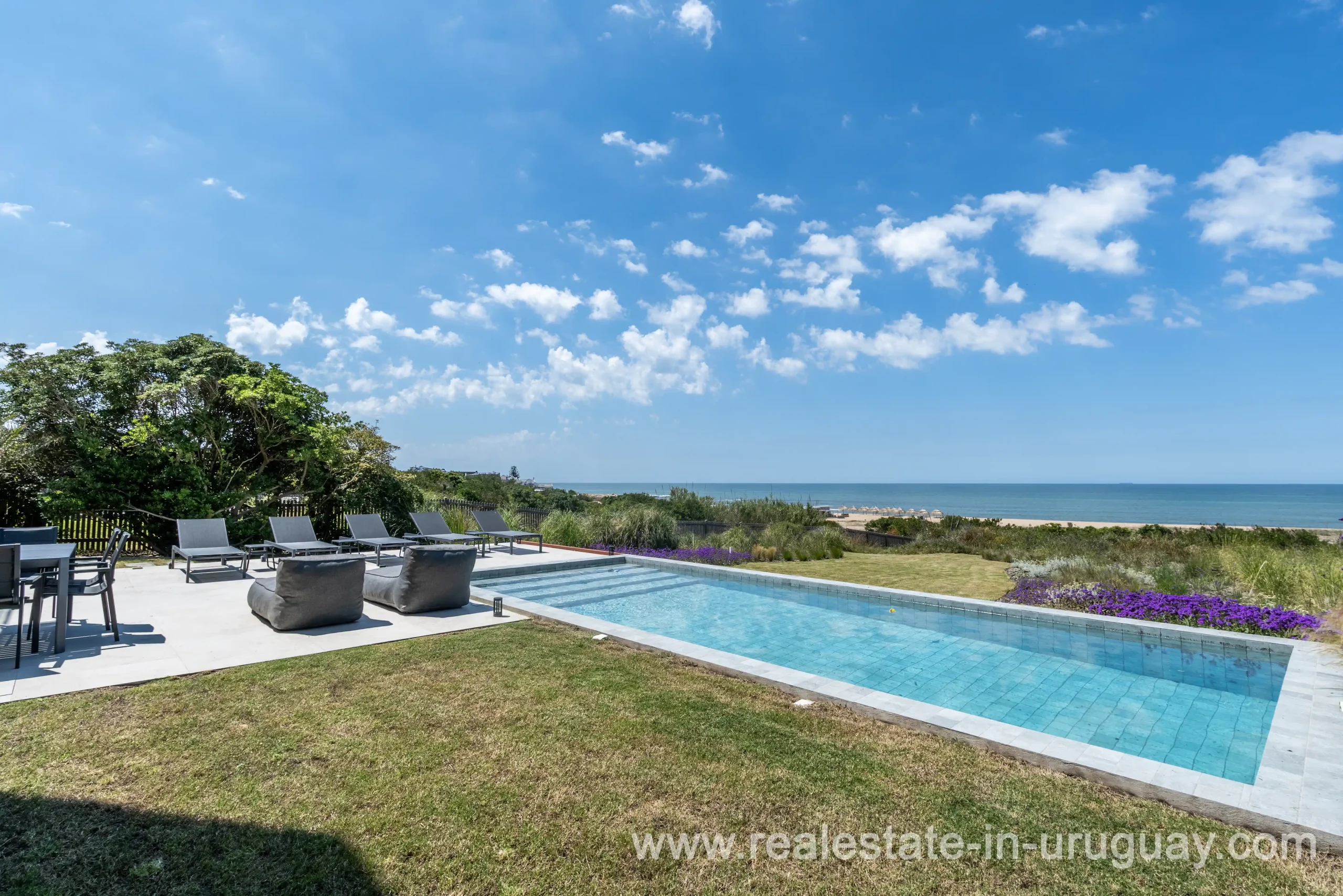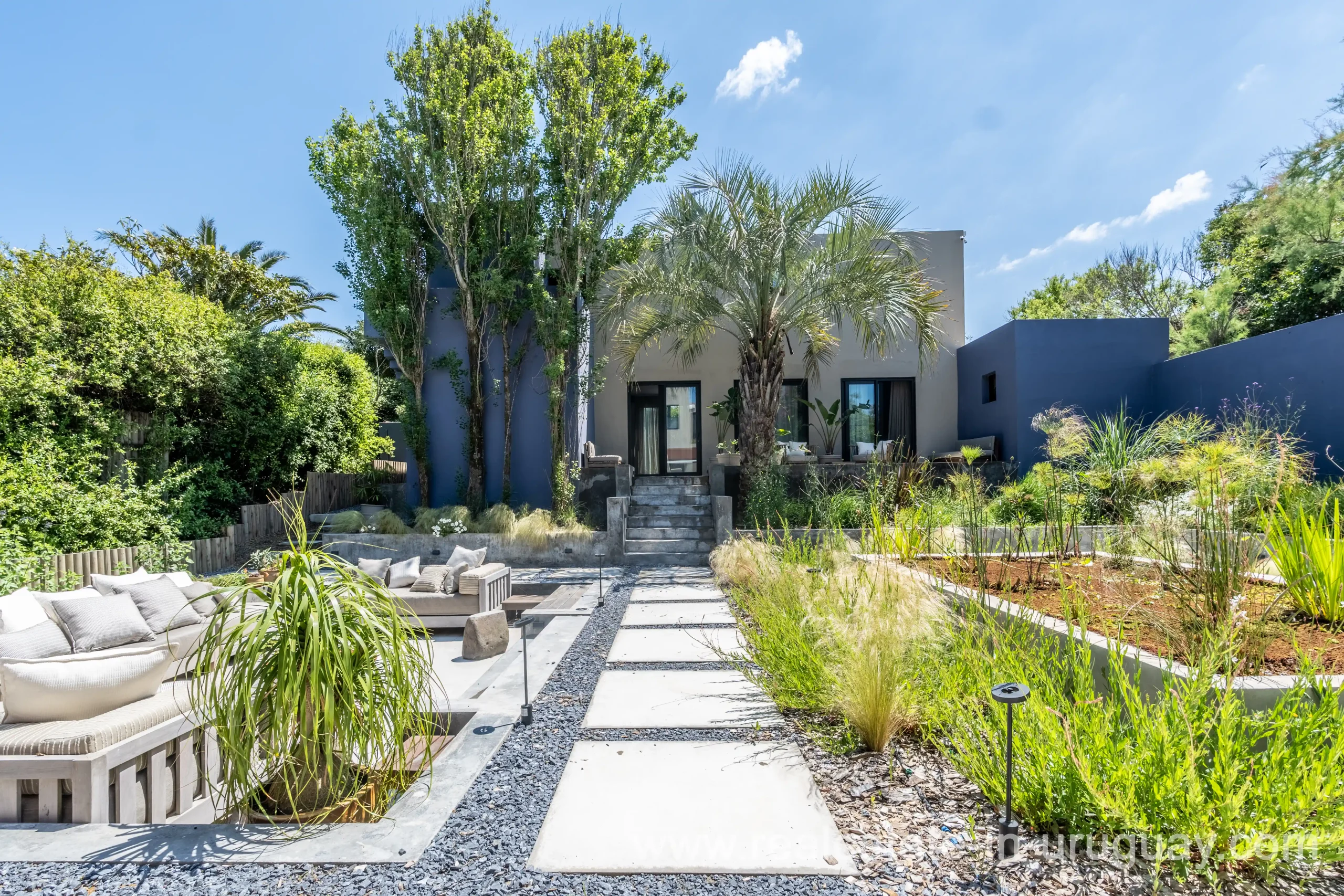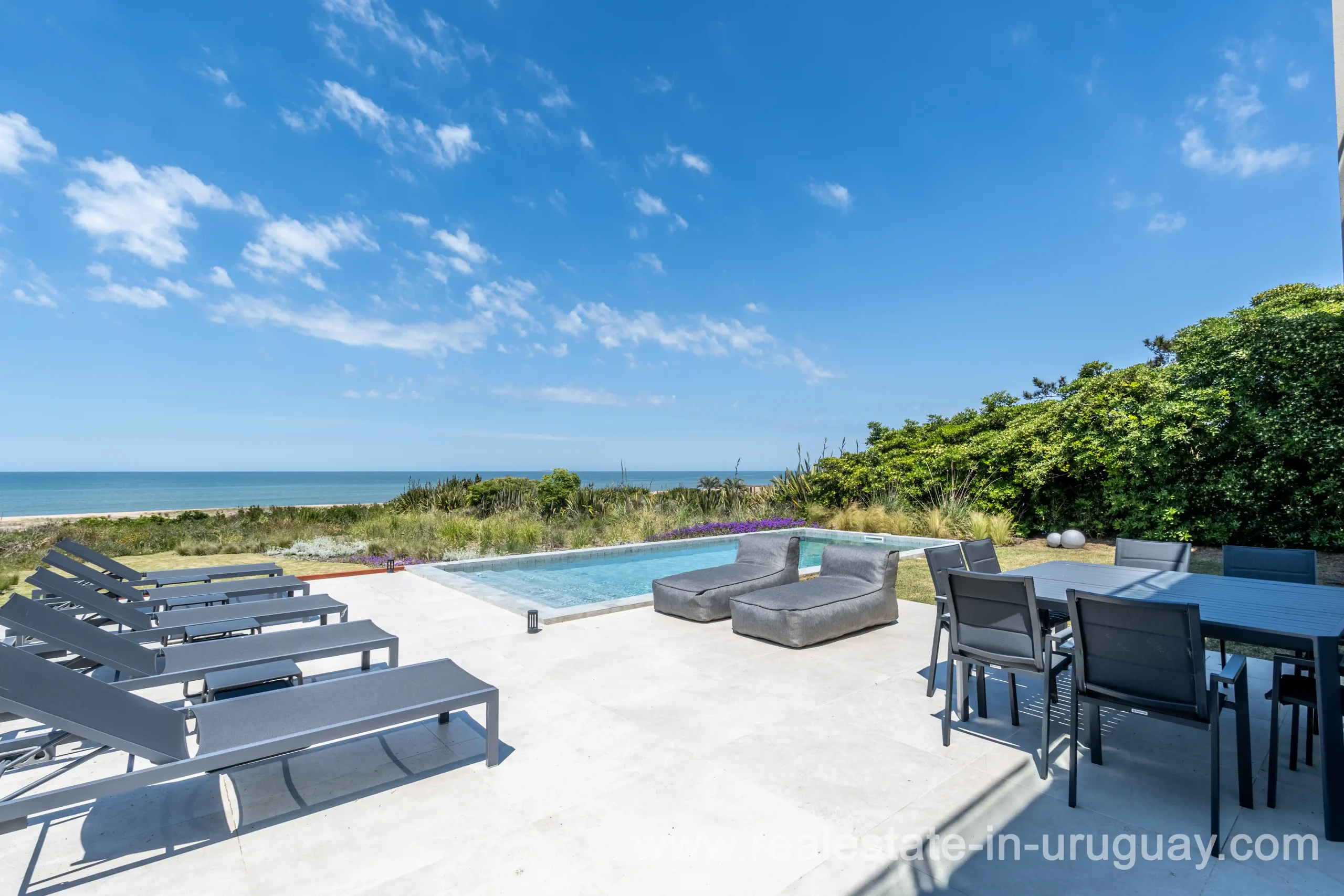 Dieses moderne Strandhaus in Manantiales wurde von einer der renommiertesten und bekanntesten Architektinnen von heute, Alexa Sanguinetti, entworfen. Dieses architektonische Meisterwerk bietet geräumige und gemütliche Zimmer mit traumhaftem Meerblick. Der Haupteingang ist sehr privat, ein wunderschöner Innenhof mit einem ausreichend großen, windgeschützten Swimmingpool und einem schönen Grillbereich, nur wenige Meter entfernt. Das Haupthaus verfügt über ein geräumiges Wohnzimmer mit Kamin und großen Fenstern sowie ein Esszimmer, die beide durch ihre Geräumigkeit und Höhe bestechen, eine voll ausgestattete, praktische Küche und vier Doppelschlafzimmer mit eigenem Bad. Im Poolbereich befinden sich zwei weitere Schlafzimmer, die sich ein Badezimmer teilen, sowie ein Haus für den Hausmeister. Sowohl aufgrund seiner Lage als auch seines Designs und seiner Aufteilung ist dies eine einzigartige Residenz, die unvergessliche Urlaubstage bietet.