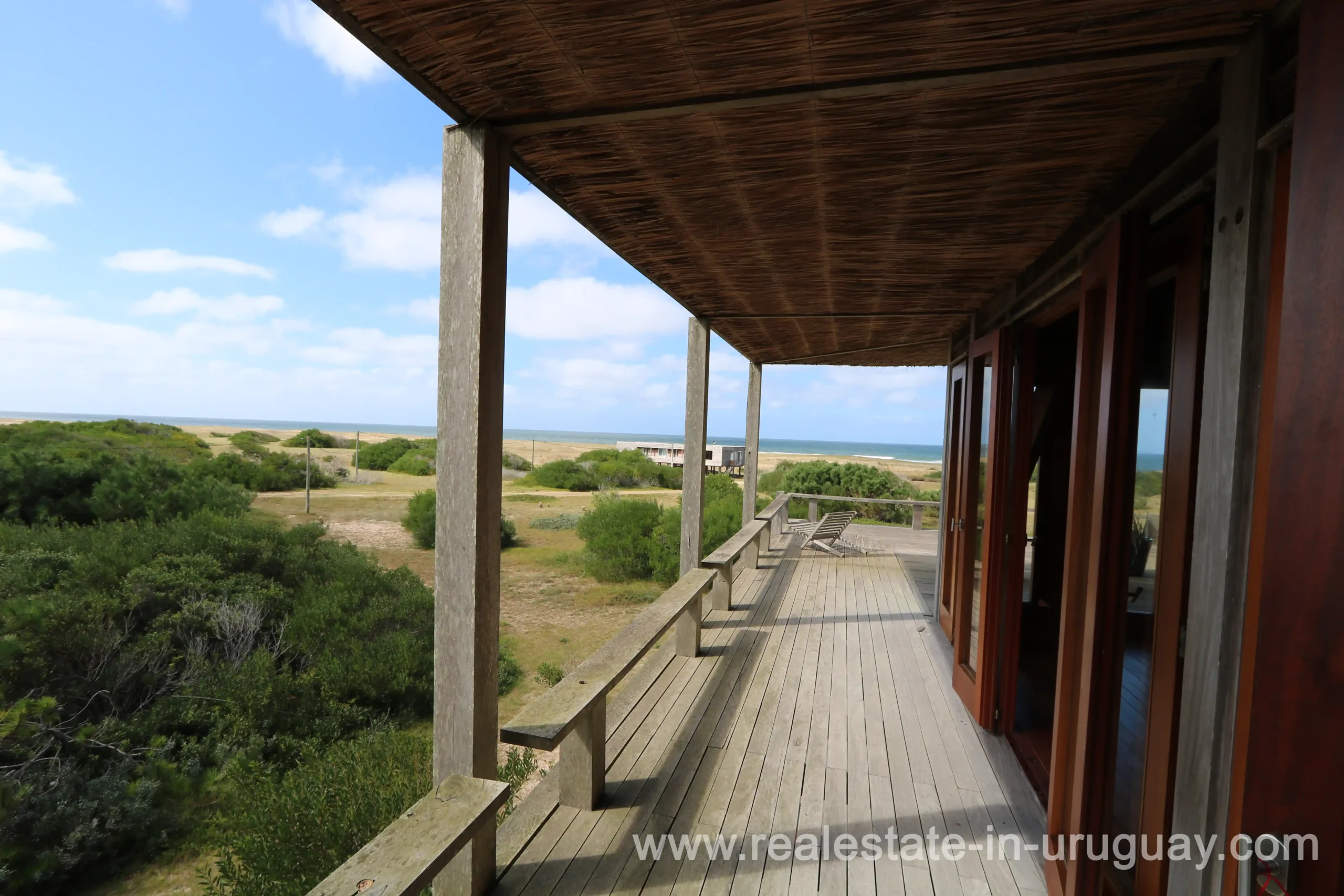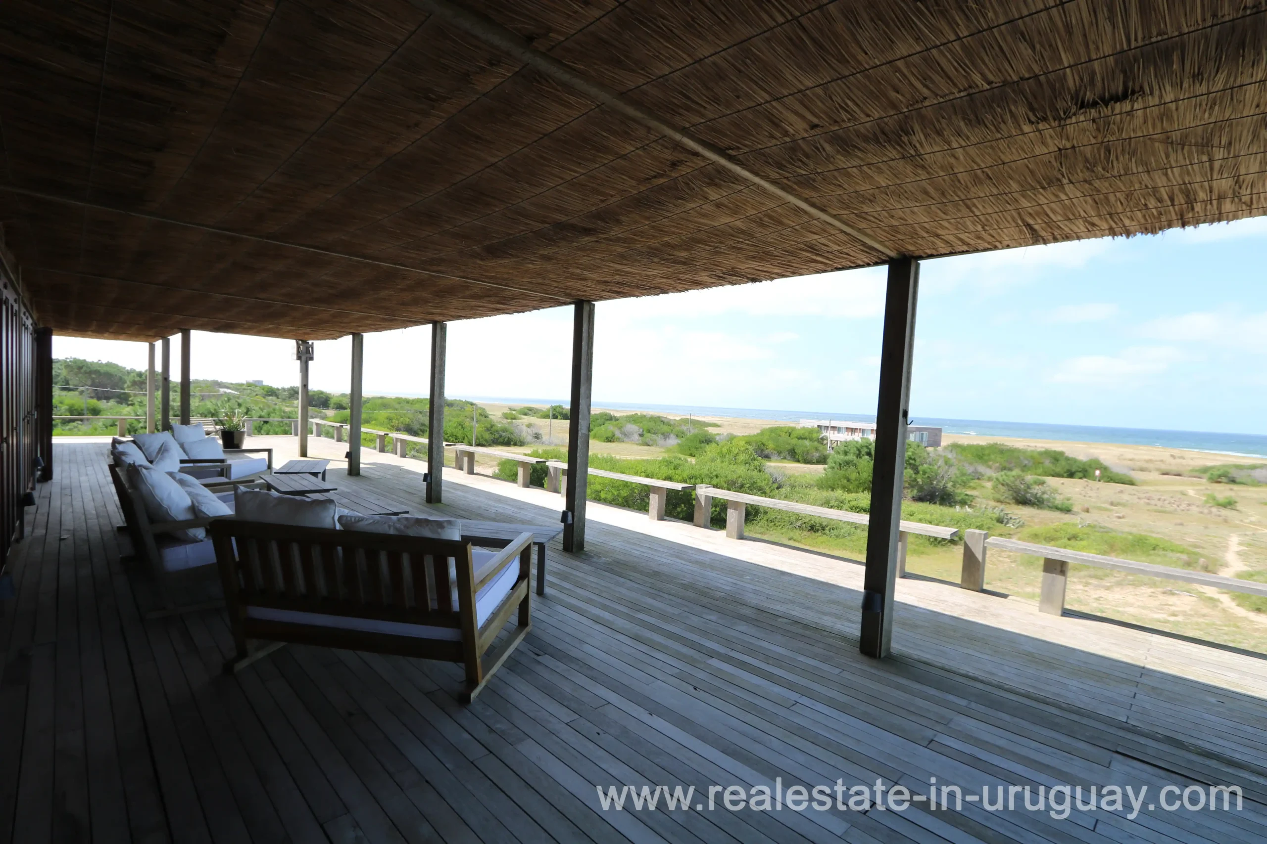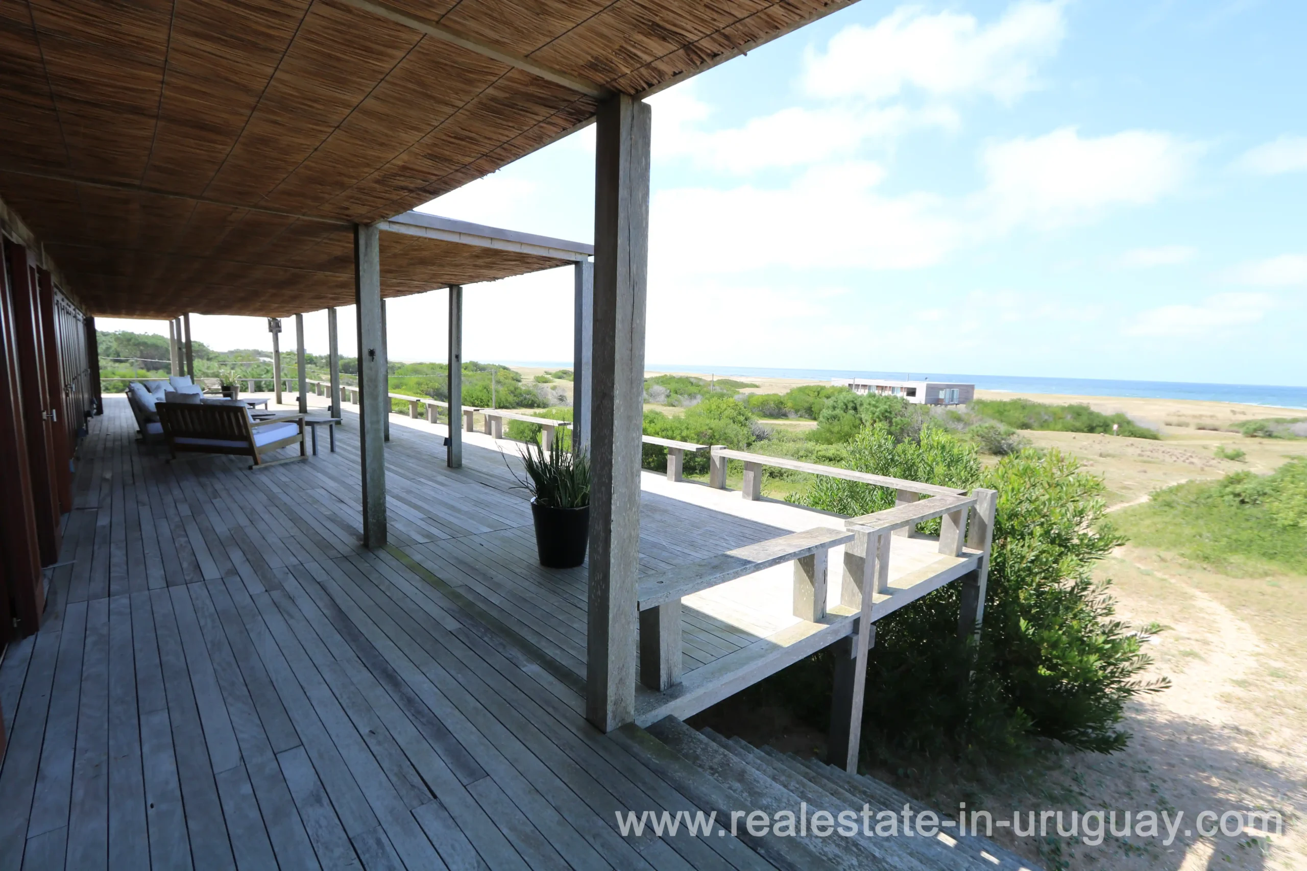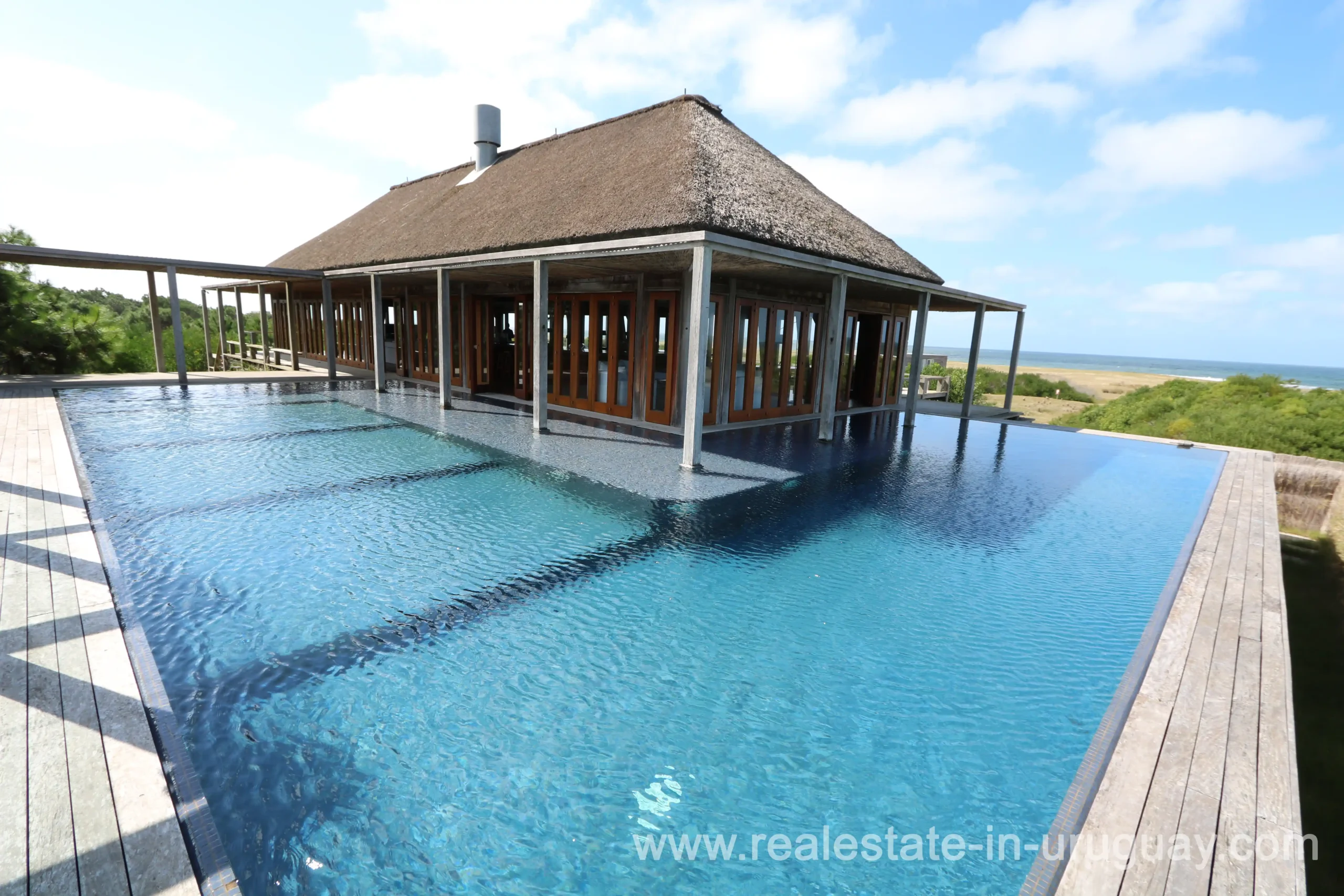 Gerade um 25% reduziert! Dieses Strandhaus in San Antonio bei La Pedrera wurde von dem renommierten Architekten Farina entworfen und befindet sich in der Ferienanlage San Antonio zwischen La Pedrera und Cabo Polonio am höchsten Punkt des Strandes mit freiem Meerblick. Das Haus mit Strohdach ist fast vollständig aus Lapacho-Holz mit Mahagoni-Türen und -Fenstern gebaut und verfügt über einen Garten mit einheimischen Pflanzen, was es äußerst praktisch und wirtschaftlich macht. Das 2013 erbaute Haus besteht aus zwei Einheiten, die über einen breiten und überdachten Lapacho-Holzsteg miteinander verbunden sind. Der obere Teil der Haupteinheit umfasst die sozialen Bereiche: professionelle Küche, Bar, Wohnzimmer, formelles Esszimmer, tägliches Esszimmer und darüber hinaus ein privates Wohnzimmer. Es handelt sich um einen offenen Bereich von 180 m2, der von großen Fenstern umgeben ist, die sich im Sommer zur vorderen Terrasse und zum hinteren Schwimmbad hin öffnen, um die Räume und Innenbereiche zu erweitern und ein Gefühl von Komfort zu vermitteln. Der untere Teil der Haupteinheit besteht aus vier geräumigen Schlafzimmern, alle mit Meerblick, drei Badezimmern, einem Maschinenraum und einem Waschraum. In der kleineren Einheit befindet sich die Master-Suite mit einem großen Ankleidezimmer und einem atemberaubenden Ausblick. Abgerundet wird das Anwesen durch einen 130 m2 großen Swimmingpool mit Sonnenterrasse, die an einen Teil des Wohnzimmers angrenzt, eine Gaszentralheizung, einen eigenen Brunnen, einen offenen Parkplatz für mehrere Fahrzeuge und einen Pferdestall. Diese Immobilie ist einzigartig durch ihren eleganten und doch schlichten Stil, ihre Bauqualität, ihre Lage direkt am Strand und ihren Komfort direkt am Meer. Ein besonderes Haus, um unglaubliche Ferien in einer ruhigen, friedlichen Gegend zu verbringen, umgeben von Sanddünen und dem Meer. Die Stadt La Pedrera mit ihren vielen Restaurants und Geschäften ist nicht weit entfernt.