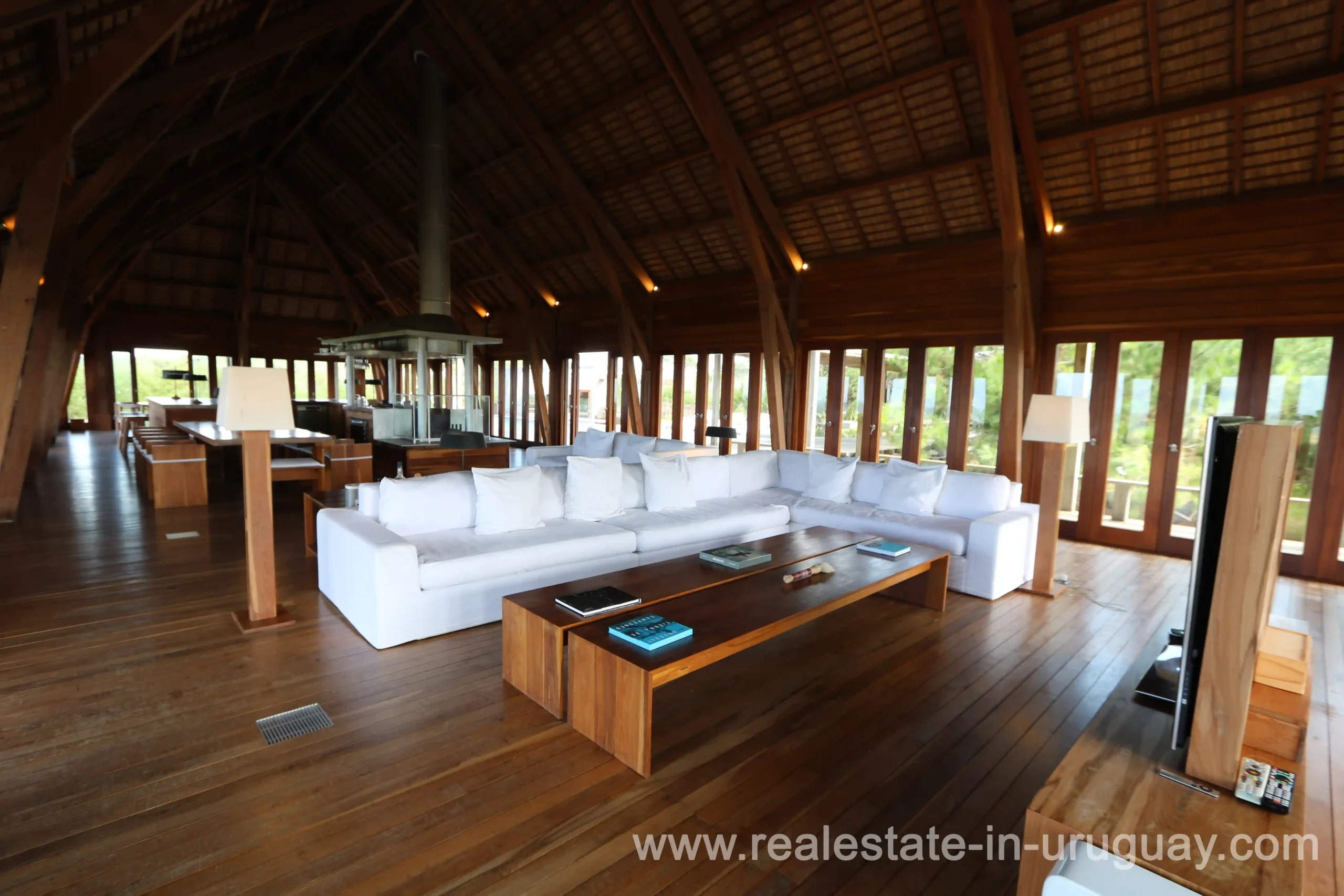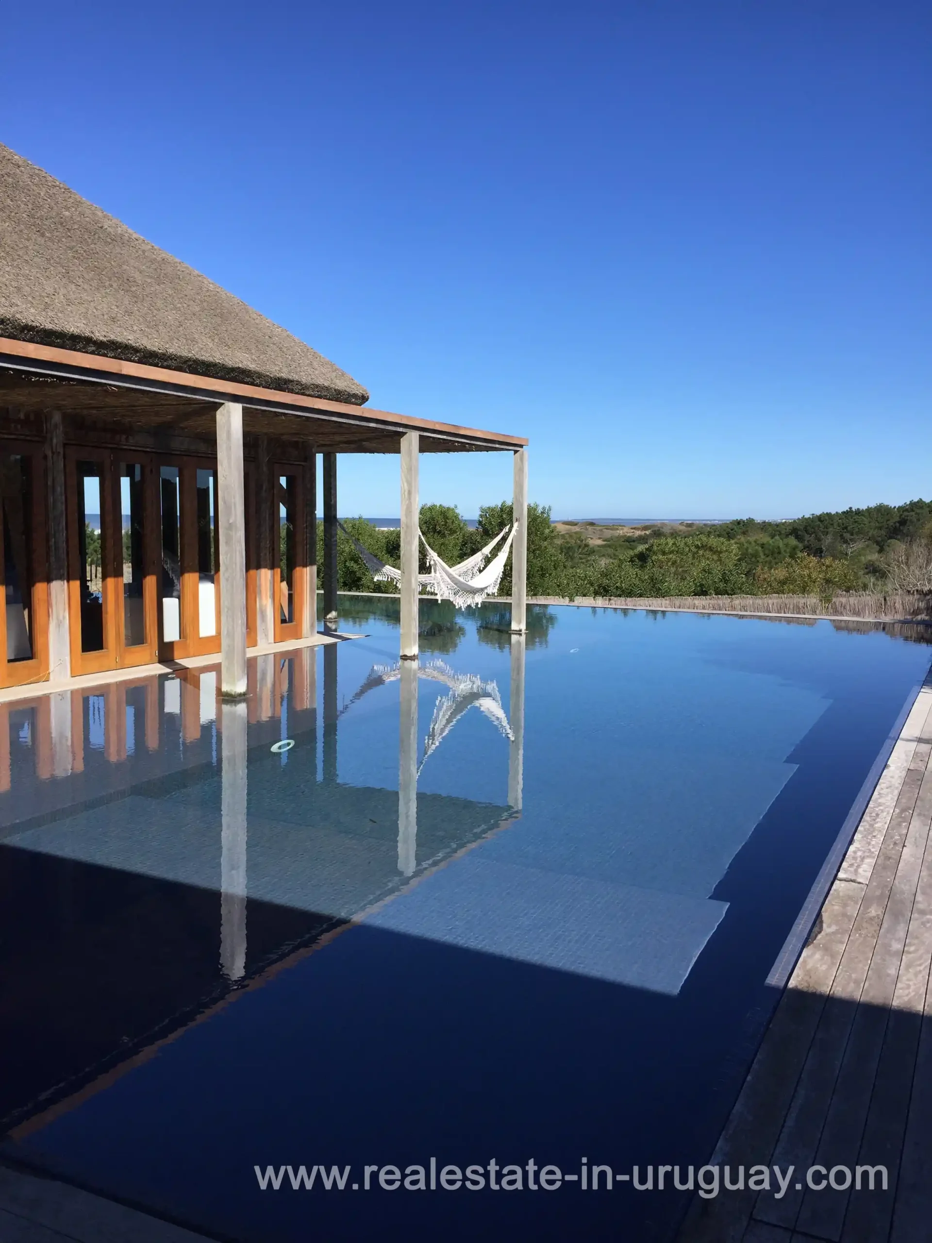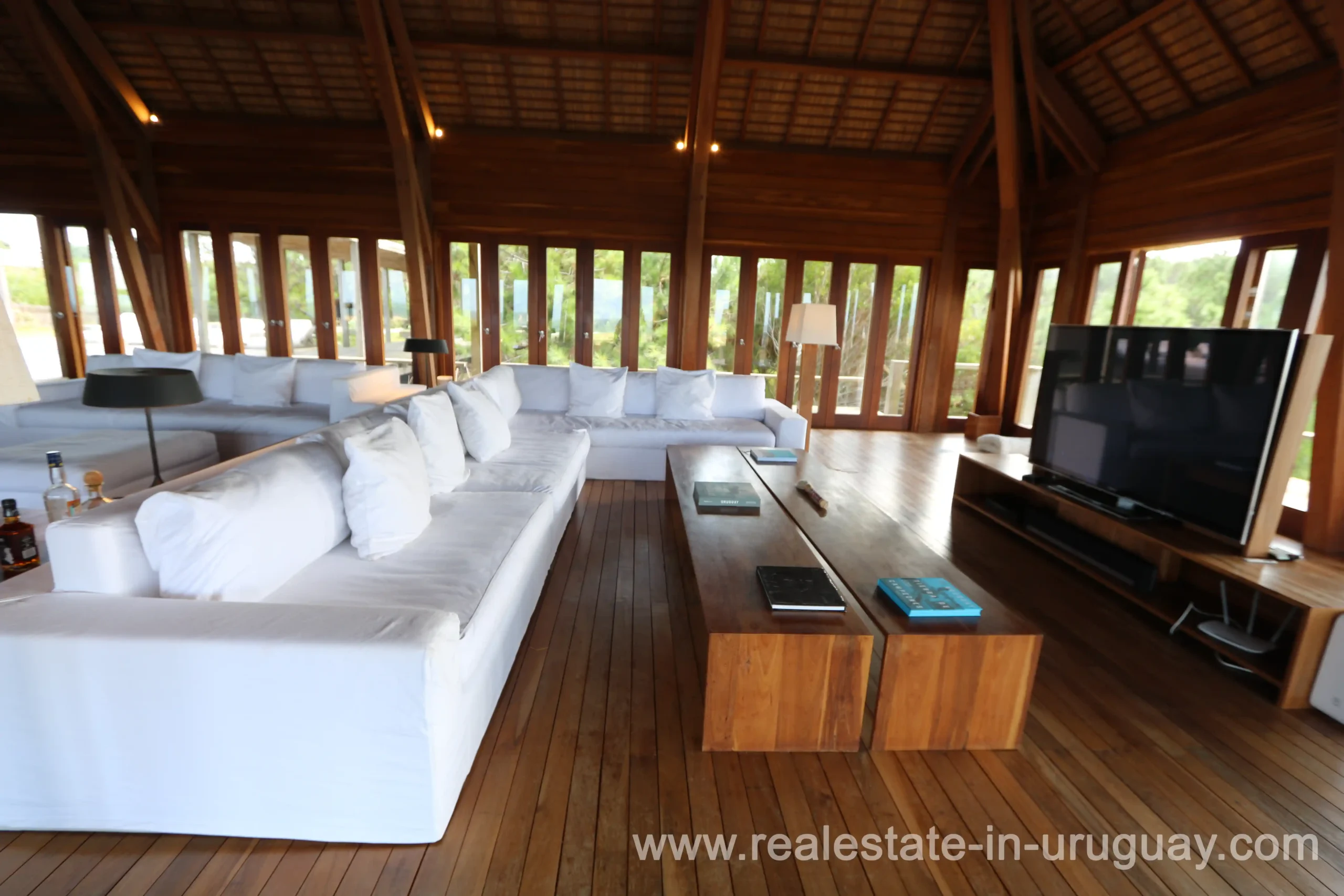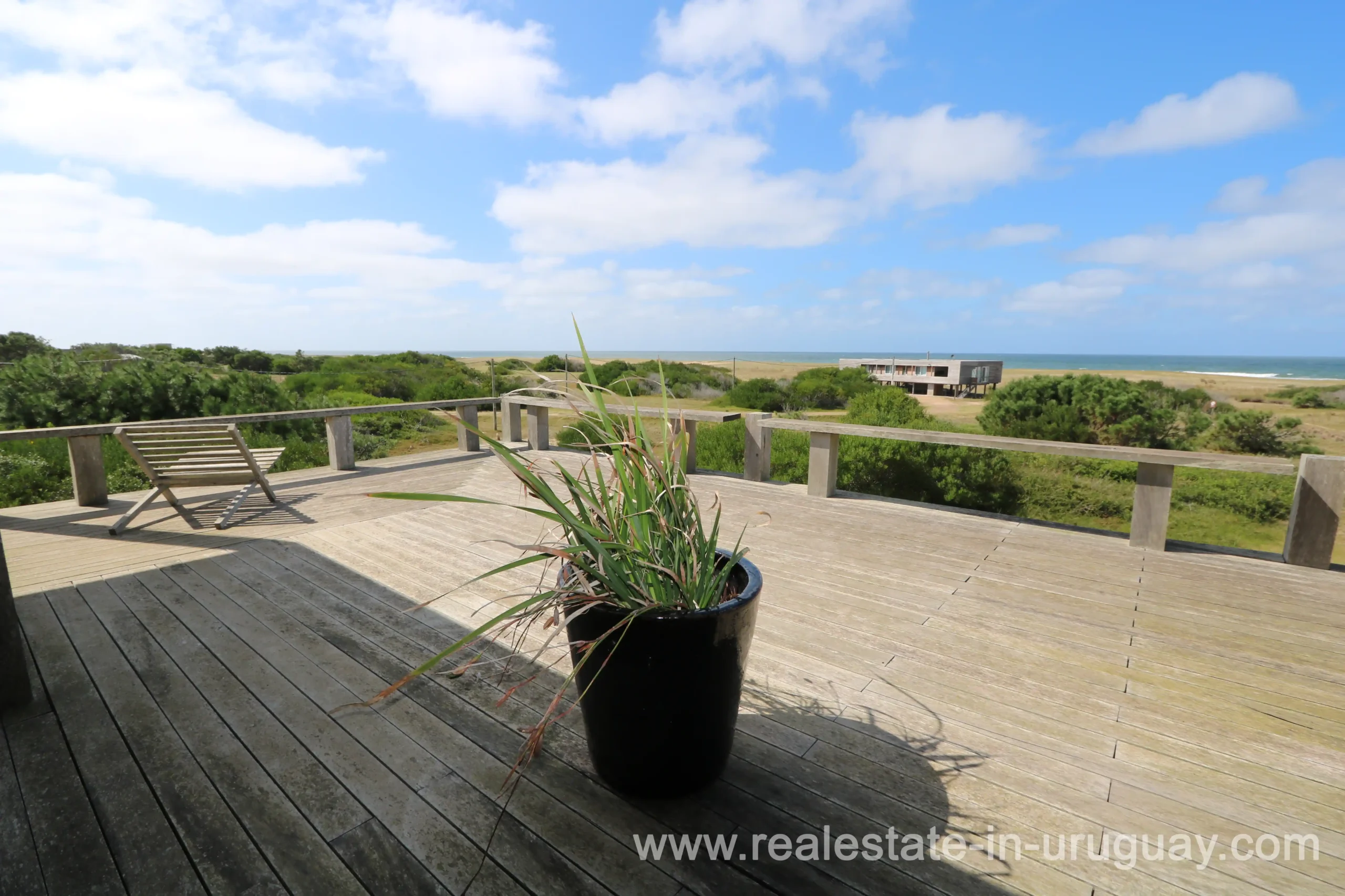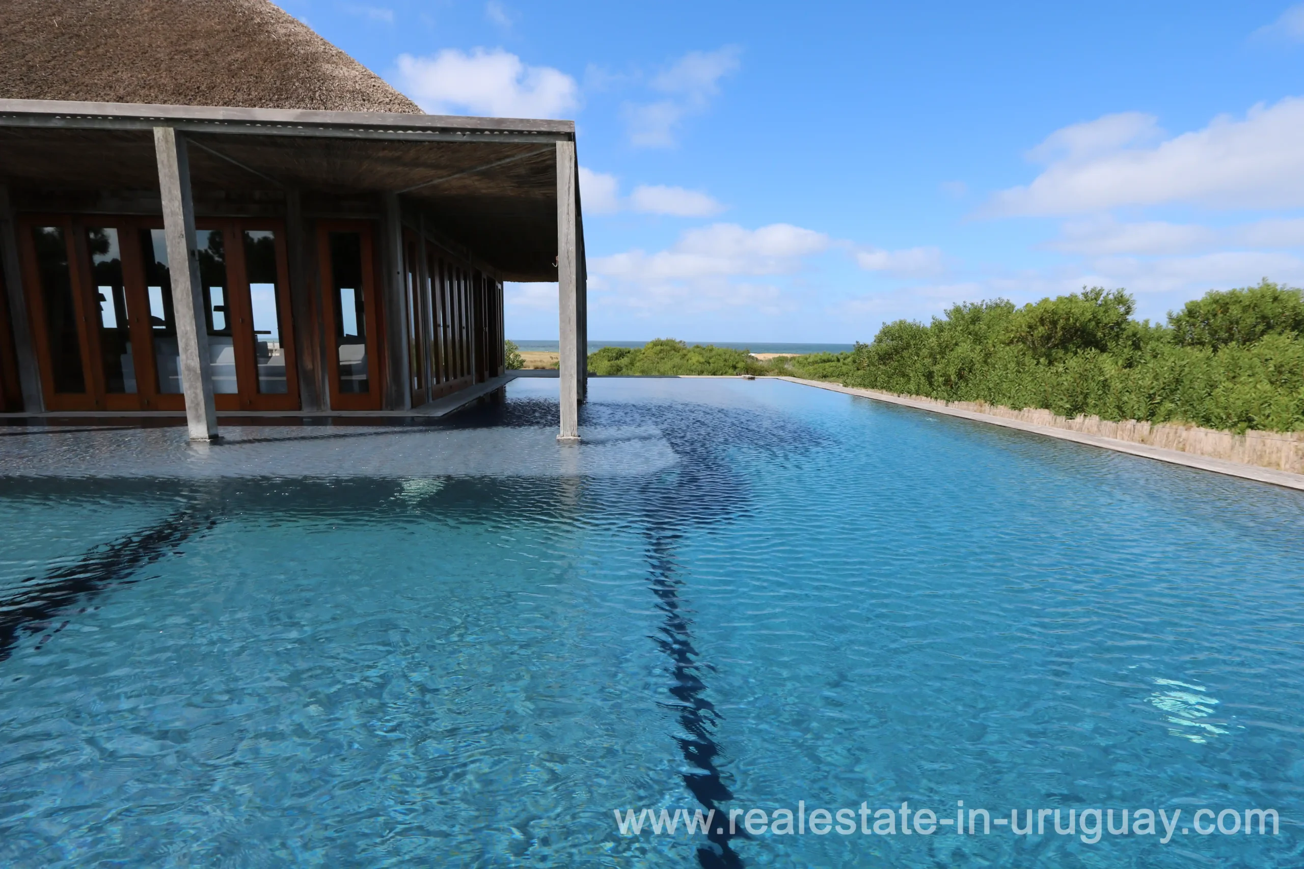 Gerade um 25% reduziert! Dieses Strandhaus in San Antonio bei La Pedrera wurde von dem renommierten Architekten Farina entworfen und befindet sich in der Ferienanlage San Antonio zwischen La Pedrera und Cabo Polonio am höchsten Punkt des Strandes mit freiem Meerblick. Das Haus mit Strohdach ist fast vollständig aus Lapacho-Holz mit Mahagoni-Türen und -Fenstern gebaut und verfügt über einen Garten mit einheimischen Pflanzen, was es äußerst praktisch und wirtschaftlich macht. Das 2013 erbaute Haus besteht aus zwei Einheiten, die über einen breiten und überdachten Lapacho-Holzsteg miteinander verbunden sind. Der obere Teil der Haupteinheit umfasst die sozialen Bereiche: professionelle Küche, Bar, Wohnzimmer, formelles Esszimmer, tägliches Esszimmer und darüber hinaus ein privates Wohnzimmer. Es handelt sich um einen offenen Bereich von 180 m2, der von großen Fenstern umgeben ist, die sich im Sommer zur vorderen Terrasse und zum hinteren Schwimmbad hin öffnen, um die Räume und Innenbereiche zu erweitern und ein Gefühl von Komfort zu vermitteln. Der untere Teil der Haupteinheit besteht aus vier geräumigen Schlafzimmern, alle mit Meerblick, drei Badezimmern, einem Maschinenraum und einem Waschraum. In der kleineren Einheit befindet sich die Master-Suite mit einem großen Ankleidezimmer und einem atemberaubenden Ausblick. Abgerundet wird das Anwesen durch einen 130 m2 großen Swimmingpool mit Sonnenterrasse, die an einen Teil des Wohnzimmers angrenzt, eine Gaszentralheizung, einen eigenen Brunnen, einen offenen Parkplatz für mehrere Fahrzeuge und einen Pferdestall. Diese Immobilie ist einzigartig durch ihren eleganten und doch schlichten Stil, ihre Bauqualität, ihre Lage direkt am Strand und ihren Komfort direkt am Meer. Ein besonderes Haus, um unglaubliche Ferien in einer ruhigen, friedlichen Gegend zu verbringen, umgeben von Sanddünen und dem Meer. Die Stadt La Pedrera mit ihren vielen Restaurants und Geschäften ist nicht weit entfernt.