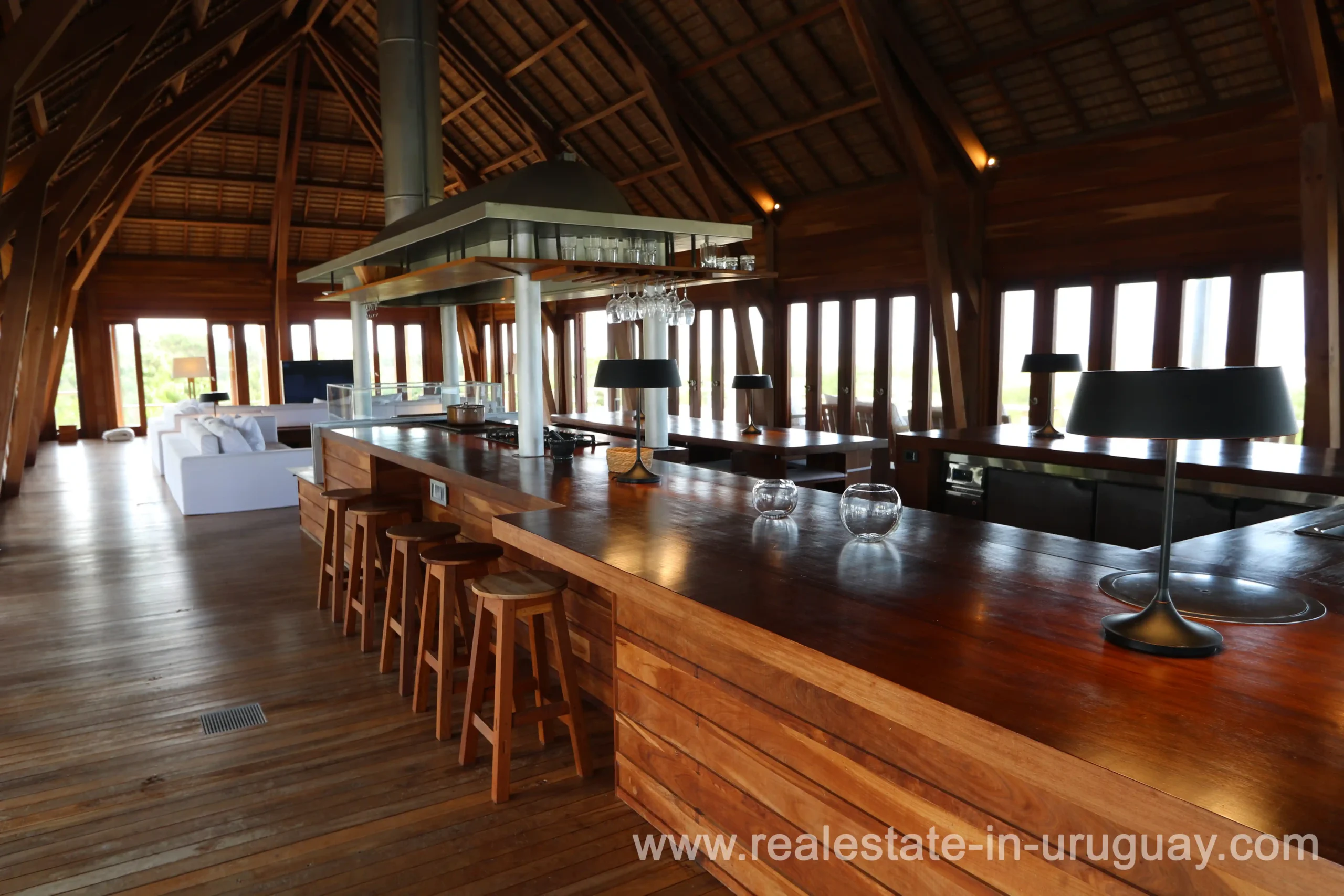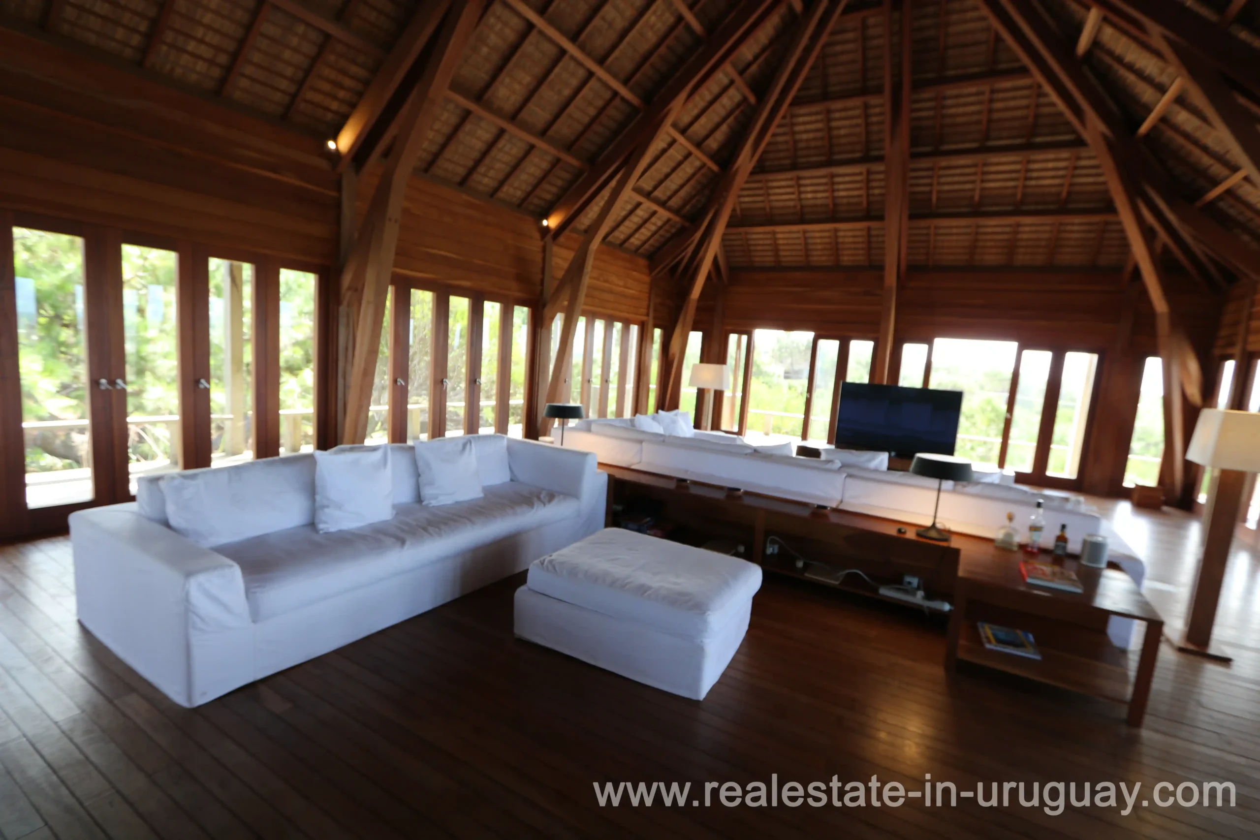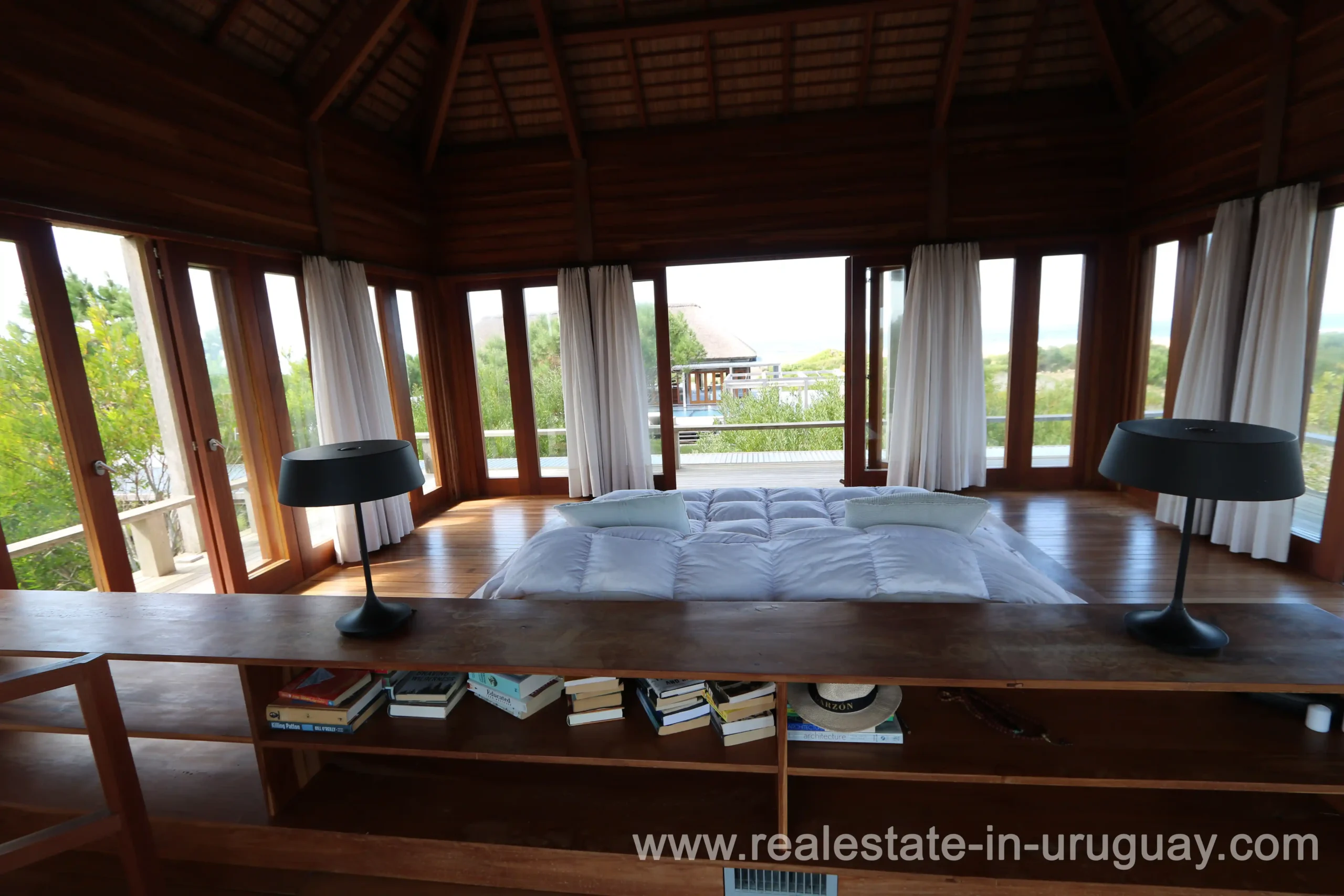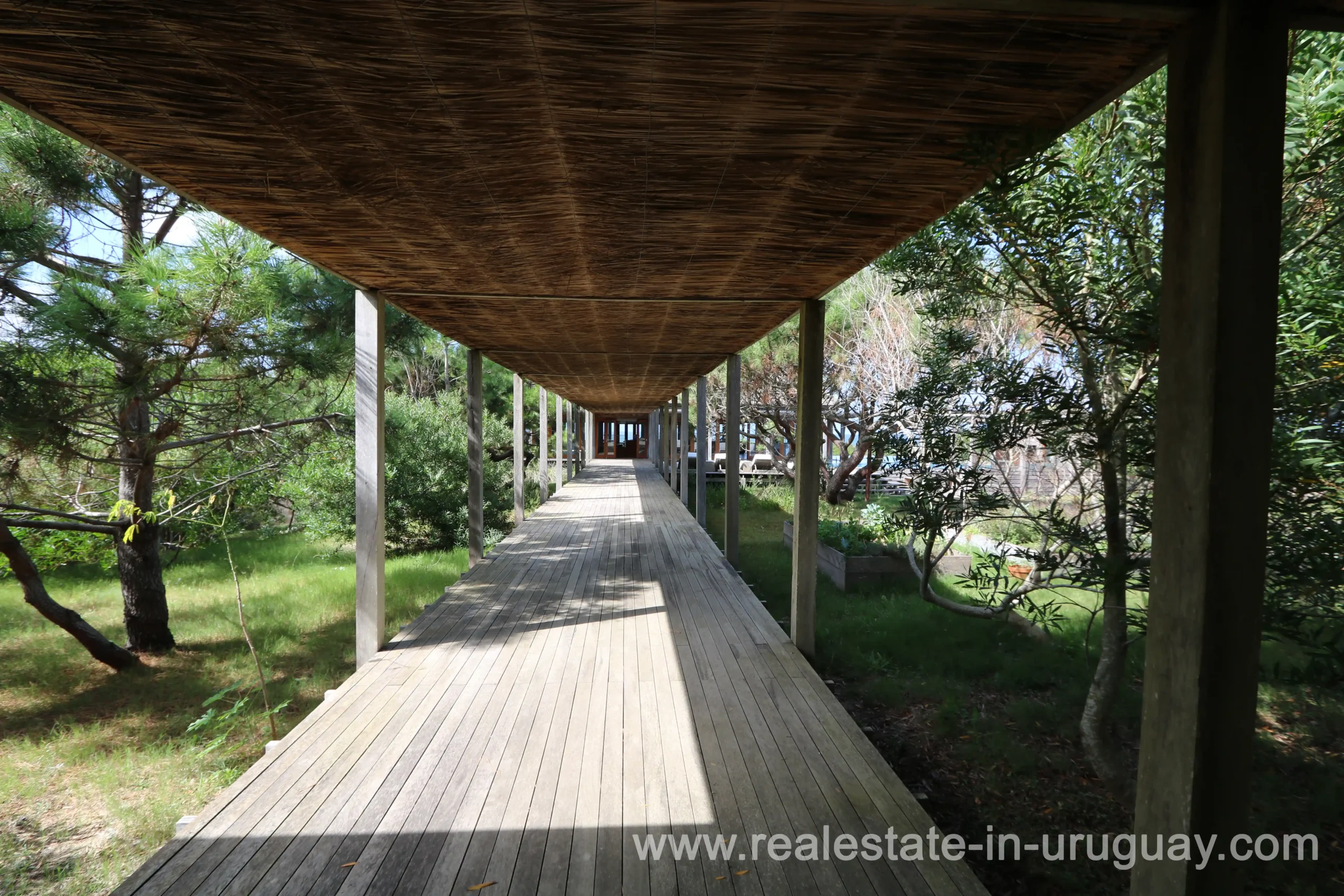 Gerade um 25% reduziert! Dieses Strandhaus in San Antonio bei La Pedrera wurde von dem renommierten Architekten Farina entworfen und befindet sich in der Ferienanlage San Antonio zwischen La Pedrera und Cabo Polonio am höchsten Punkt des Strandes mit freiem Meerblick. Das Haus mit Strohdach ist fast vollständig aus Lapacho-Holz mit Mahagoni-Türen und -Fenstern gebaut und verfügt über einen Garten mit einheimischen Pflanzen, was es äußerst praktisch und wirtschaftlich macht. Das 2013 erbaute Haus besteht aus zwei Einheiten, die über einen breiten und überdachten Lapacho-Holzsteg miteinander verbunden sind. Der obere Teil der Haupteinheit umfasst die sozialen Bereiche: professionelle Küche, Bar, Wohnzimmer, formelles Esszimmer, tägliches Esszimmer und darüber hinaus ein privates Wohnzimmer. Es handelt sich um einen offenen Bereich von 180 m2, der von großen Fenstern umgeben ist, die sich im Sommer zur vorderen Terrasse und zum hinteren Schwimmbad hin öffnen, um die Räume und Innenbereiche zu erweitern und ein Gefühl von Komfort zu vermitteln. Der untere Teil der Haupteinheit besteht aus vier geräumigen Schlafzimmern, alle mit Meerblick, drei Badezimmern, einem Maschinenraum und einem Waschraum. In der kleineren Einheit befindet sich die Master-Suite mit einem großen Ankleidezimmer und einem atemberaubenden Ausblick. Abgerundet wird das Anwesen durch einen 130 m2 großen Swimmingpool mit Sonnenterrasse, die an einen Teil des Wohnzimmers angrenzt, eine Gaszentralheizung, einen eigenen Brunnen, einen offenen Parkplatz für mehrere Fahrzeuge und einen Pferdestall. Diese Immobilie ist einzigartig durch ihren eleganten und doch schlichten Stil, ihre Bauqualität, ihre Lage direkt am Strand und ihren Komfort direkt am Meer. Ein besonderes Haus, um unglaubliche Ferien in einer ruhigen, friedlichen Gegend zu verbringen, umgeben von Sanddünen und dem Meer. Die Stadt La Pedrera mit ihren vielen Restaurants und Geschäften ist nicht weit entfernt.