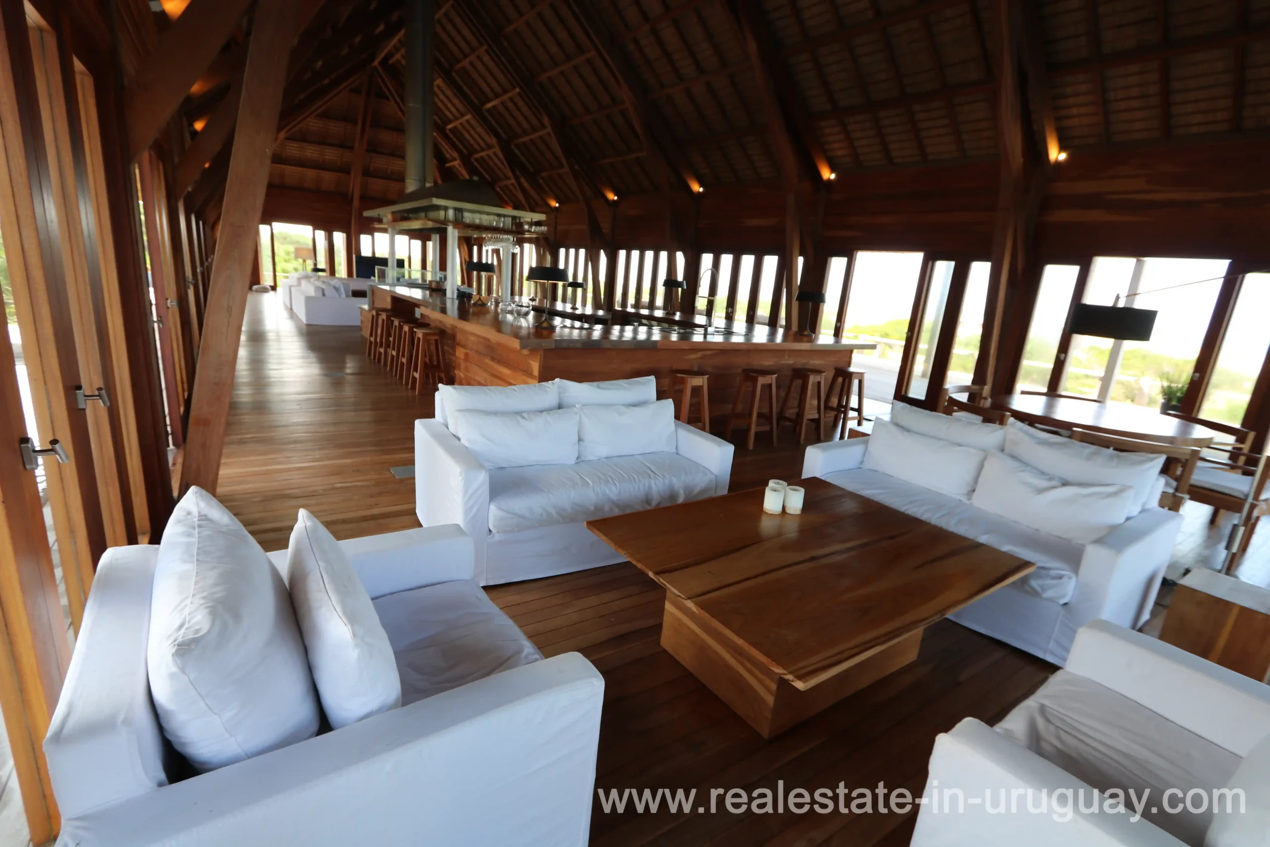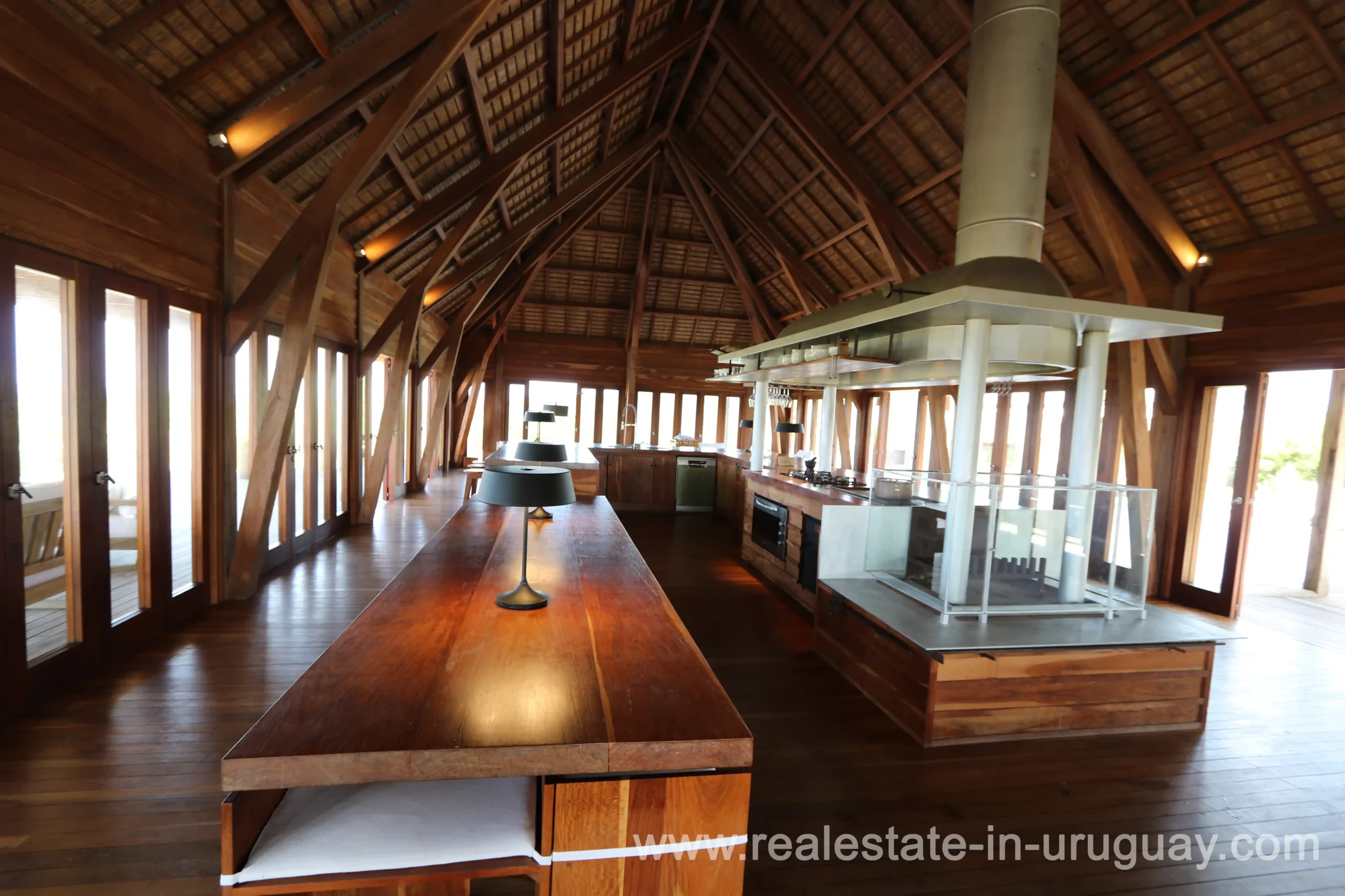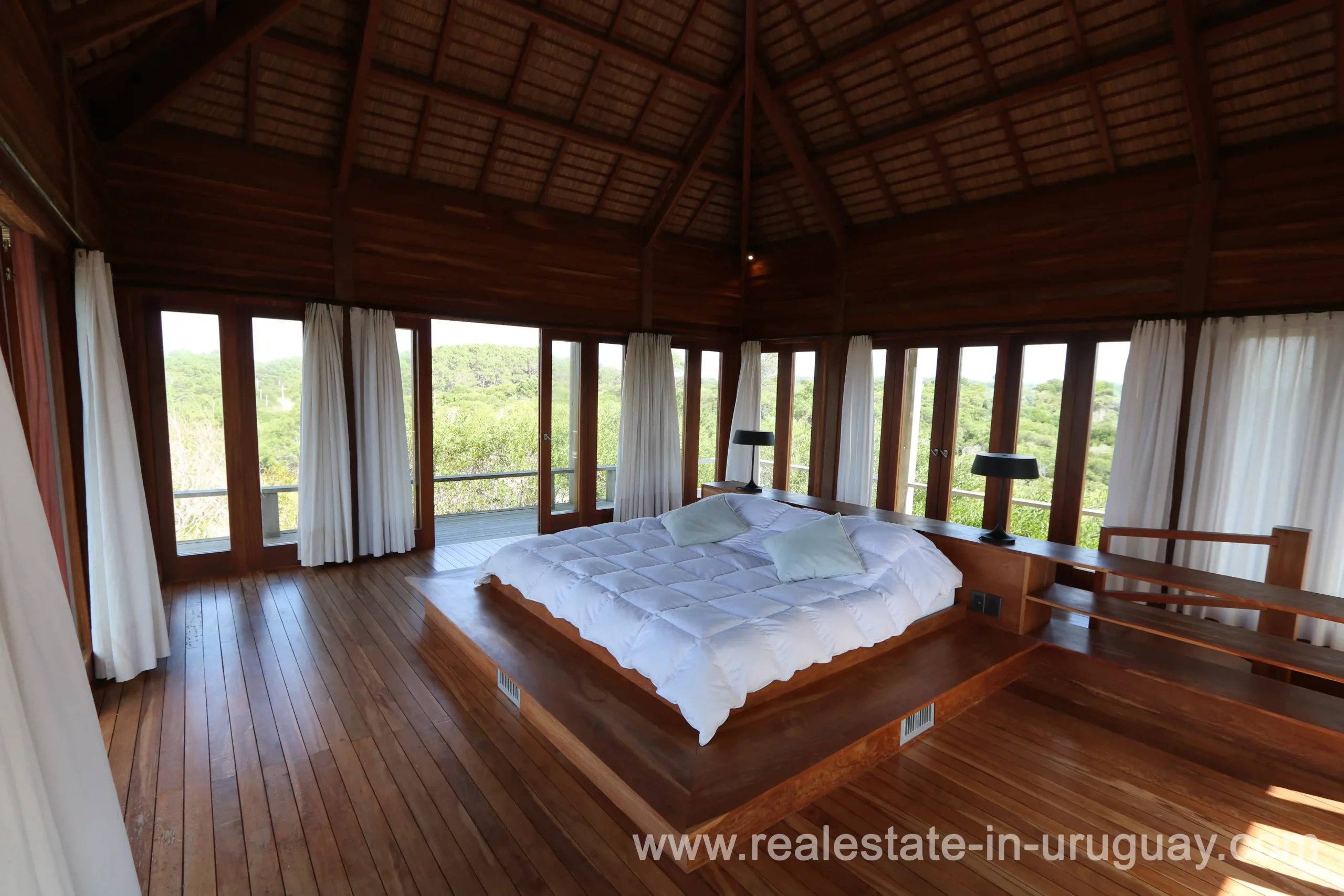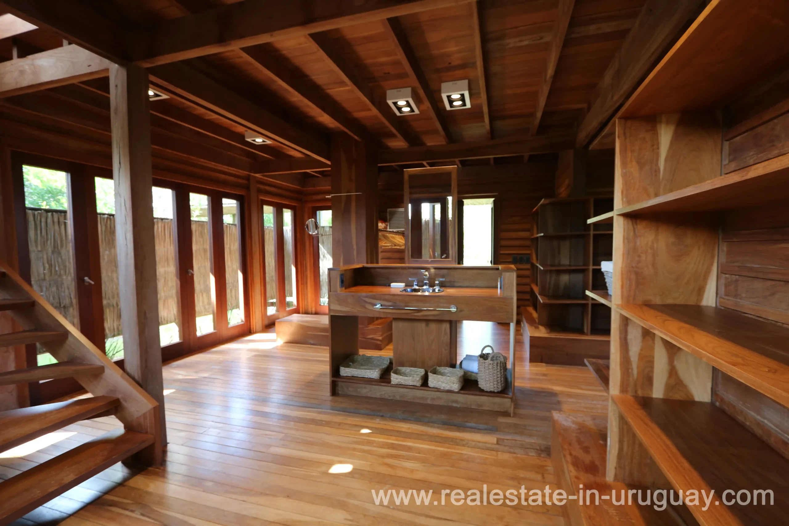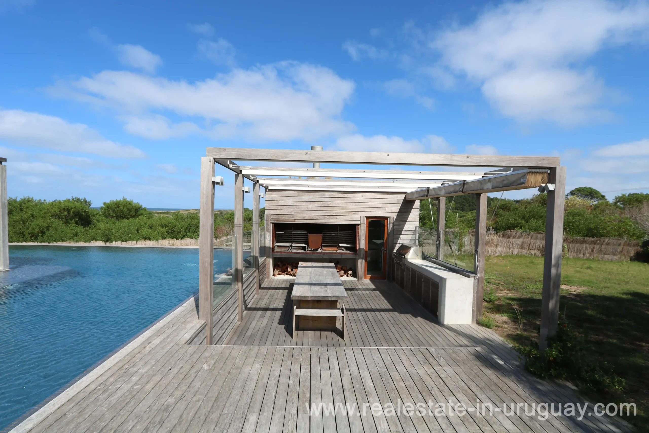 Gerade um 25% reduziert! Dieses Strandhaus in San Antonio bei La Pedrera wurde von dem renommierten Architekten Farina entworfen und befindet sich in der Ferienanlage San Antonio zwischen La Pedrera und Cabo Polonio am höchsten Punkt des Strandes mit freiem Meerblick. Das Haus mit Strohdach ist fast vollständig aus Lapacho-Holz mit Mahagoni-Türen und -Fenstern gebaut und verfügt über einen Garten mit einheimischen Pflanzen, was es äußerst praktisch und wirtschaftlich macht. Das 2013 erbaute Haus besteht aus zwei Einheiten, die über einen breiten und überdachten Lapacho-Holzsteg miteinander verbunden sind. Der obere Teil der Haupteinheit umfasst die sozialen Bereiche: professionelle Küche, Bar, Wohnzimmer, formelles Esszimmer, tägliches Esszimmer und darüber hinaus ein privates Wohnzimmer. Es handelt sich um einen offenen Bereich von 180 m2, der von großen Fenstern umgeben ist, die sich im Sommer zur vorderen Terrasse und zum hinteren Schwimmbad hin öffnen, um die Räume und Innenbereiche zu erweitern und ein Gefühl von Komfort zu vermitteln. Der untere Teil der Haupteinheit besteht aus vier geräumigen Schlafzimmern, alle mit Meerblick, drei Badezimmern, einem Maschinenraum und einem Waschraum. In der kleineren Einheit befindet sich die Master-Suite mit einem großen Ankleidezimmer und einem atemberaubenden Ausblick. Abgerundet wird das Anwesen durch einen 130 m2 großen Swimmingpool mit Sonnenterrasse, die an einen Teil des Wohnzimmers angrenzt, eine Gaszentralheizung, einen eigenen Brunnen, einen offenen Parkplatz für mehrere Fahrzeuge und einen Pferdestall. Diese Immobilie ist einzigartig durch ihren eleganten und doch schlichten Stil, ihre Bauqualität, ihre Lage direkt am Strand und ihren Komfort direkt am Meer. Ein besonderes Haus, um unglaubliche Ferien in einer ruhigen, friedlichen Gegend zu verbringen, umgeben von Sanddünen und dem Meer. Die Stadt La Pedrera mit ihren vielen Restaurants und Geschäften ist nicht weit entfernt.