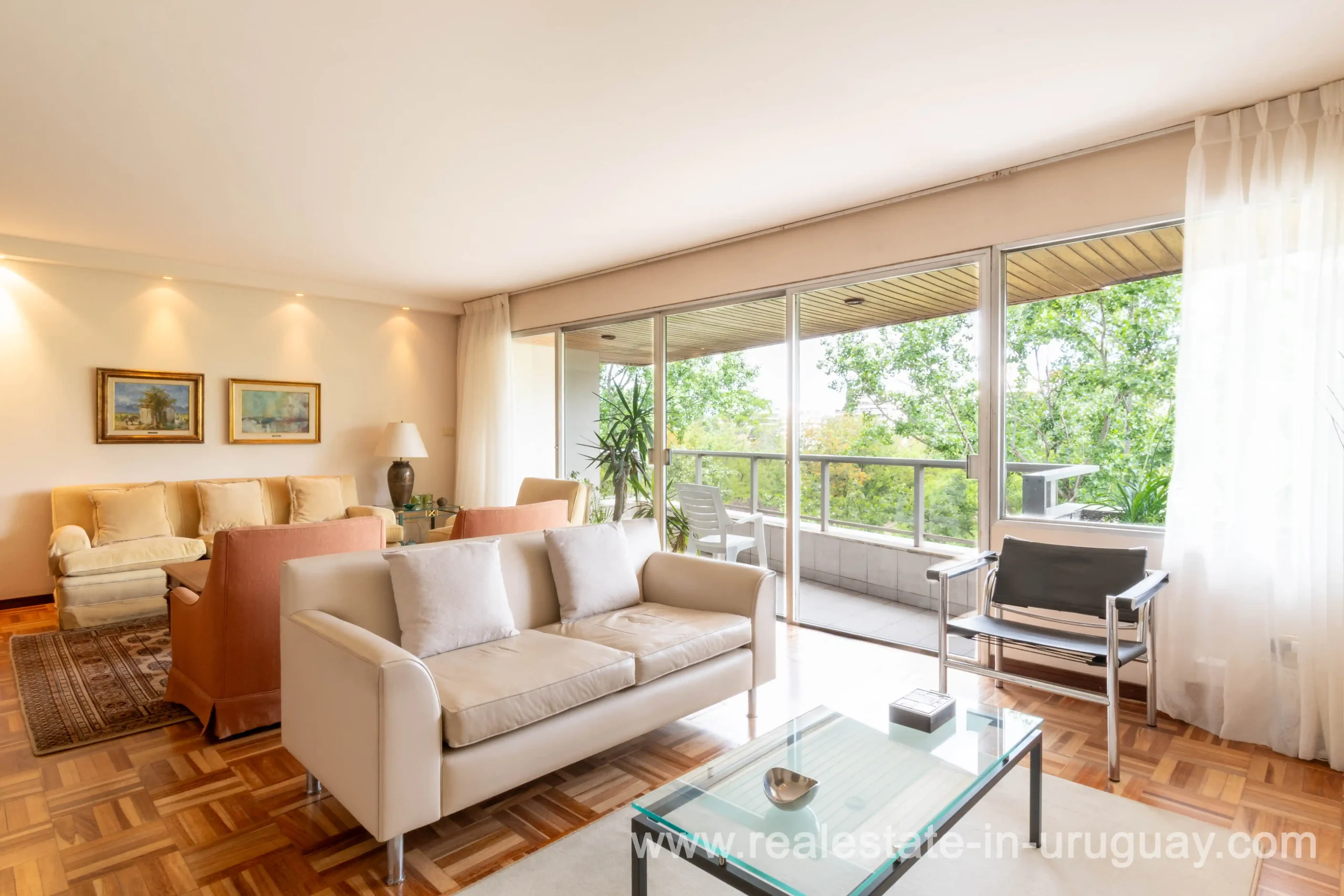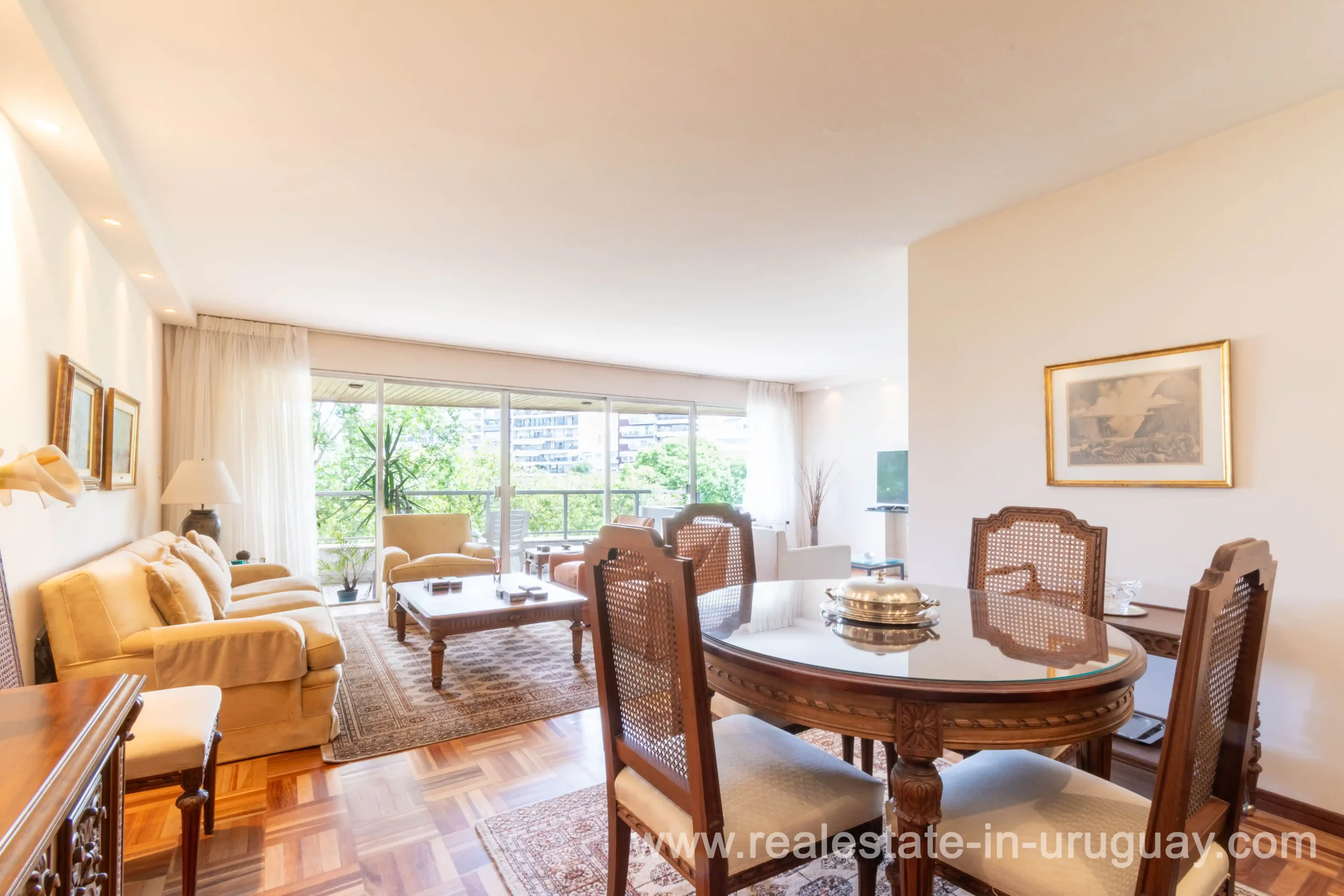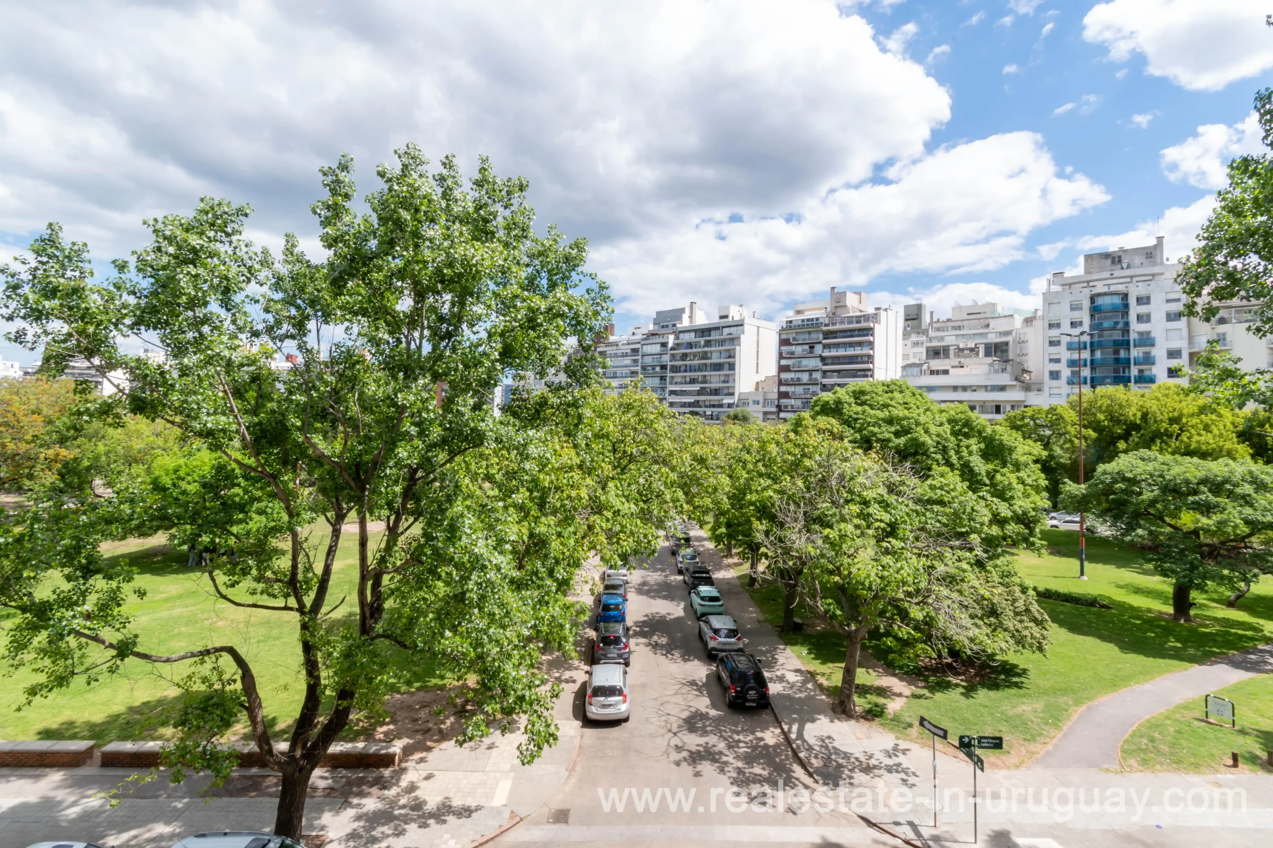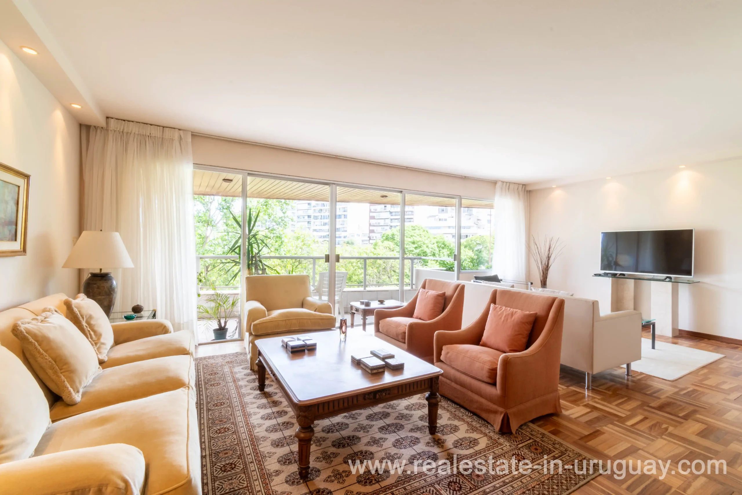 Geräumige und helle Wohnung im Herzen von Punta Carretas, mit wunderschönem Blick auf den Villa Biarritz Park in einer ruhigen, grünen Umgebung. Beim Betreten durch die Haupttür empfängt Sie ein großes Wohn- und Esszimmer von über 7 Metern Breite, mit Fenstern, die einen freien Blick auf den Park bieten und den Raum mit natürlichem Licht durchfluten. Die Parkettböden, in ausgezeichnetem Zustand, verleihen dem Interieur Wärme. Vom Wohnzimmer aus gelangen Sie auf einen 9 m² großen Balkon, ideal zum Entspannen und Genießen des Grüns im Freien. Das Hauptschlafzimmer, ebenfalls zur Vorderseite ausgerichtet und sehr hell, verfügt über ein eigenes Bad und einen separaten begehbaren Kleiderschrank. Ein Flur verbindet zwei Hauptbereiche: a) die Küche, die mit der Waschküche verbunden ist und einen Grillbereich sowie das Dienstmädchenzimmer und -bad umfasst; b) ein Ess- oder Mehrzweckraum, ebenfalls mit dem Grillbereich verbunden, nutzbar als Bibliothek, TV-Zimmer oder Spielbereich. Von diesem Bereich aus gelangen Sie zu den beiden hinteren Schlafzimmern, beide mit Außenfenstern, Einbauschränken und natürlichem Licht, die sich ein komplettes Badezimmer teilen. Die Wohnung umfasst eine leicht zugängliche Garage, mit der Option, einen zweiten Parkplatz anzumieten.