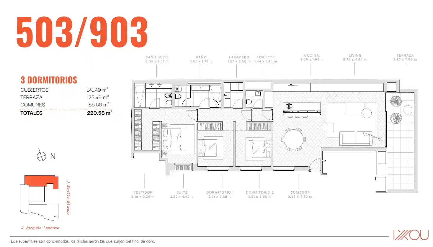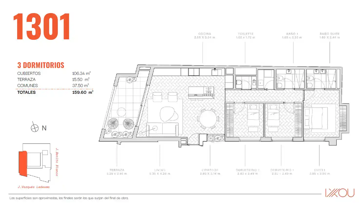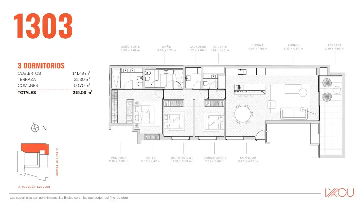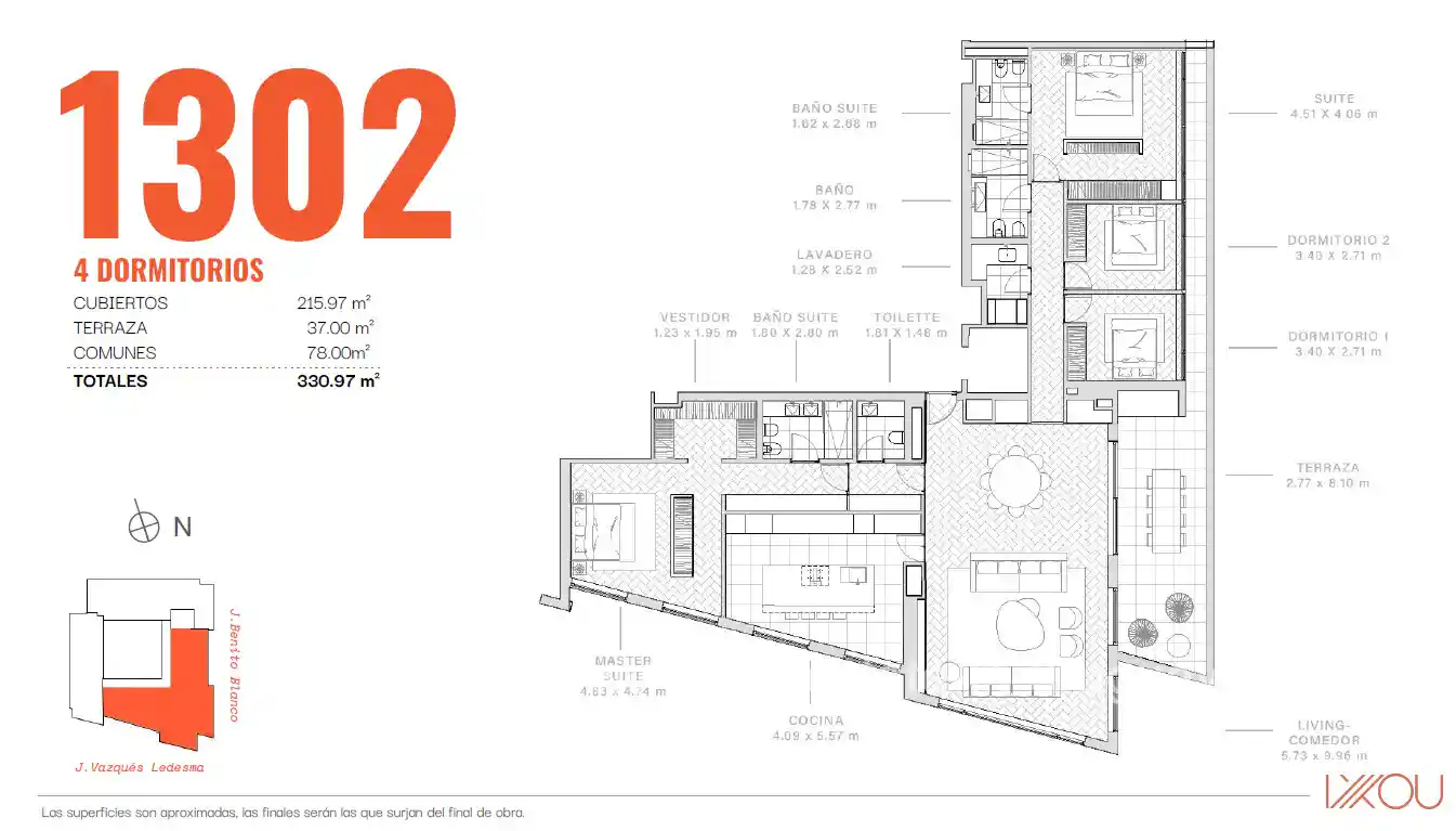 Verfügbare Einheiten: – Einheit 1002 – Gesamtfläche: 299 m² – Preis: 1.749.700 US$ Wohn-Essbereich mit einem 20 m² großen Balkon, separater Küche und Hauptsuite mit Blick auf den Park. Die zweite Suite und die restlichen beiden Schlafzimmer sind zur Benito Blanco ausgerichtet. – Einheit 1302 – Gesamtfläche: 331 m² – Preis: 1.985.800 US$. Sie hat den gleichen Grundriss wie Einheit 1002, verfügt jedoch über eine 37 m² große Eckterrasse, die zusätzlich zum Wohnbereich auch die drei Schlafzimmer zur Benito Blanco hin abdeckt. Garagen sind nicht im Preis inbegriffen und ab 45.000 US$ erhältlich. Das Projekt befindet sich derzeit im Bau, die Fertigstellung ist für Juni 2027 geplant.
