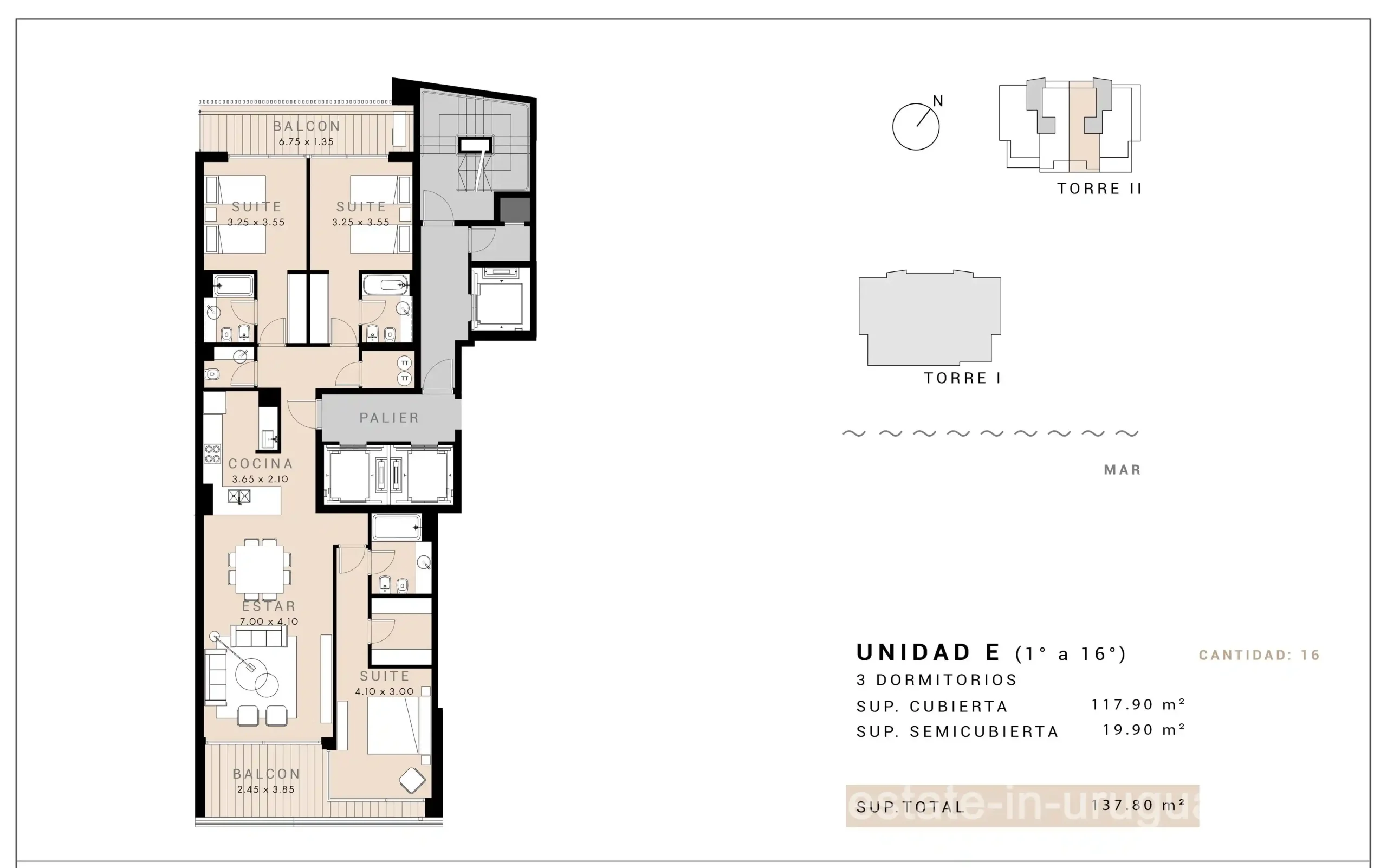 Luxury tower apartment in Torre Playa Brava. 3 bedrooms with panoramic views. Open-concept kitchen. Living room and main bedroom with sea views. Toilet. 2 parking spaces. Storage room. Total area: 138 m². Payment terms: 10% deposit, 15% upon signing, 75% in 30 installments. Delivery expected mid-2028. Located in an exclusive development in the heart of the new residential corridor of Punta del Este. This project stands out for its innovative design, high-quality amenities, and unbeatable location. With architecture that harmoniously integrates with the natural surroundings, it becomes the ideal place for those seeking a dynamic and sophisticated lifestyle. Every detail has been meticulously designed to offer comfort, well-being, and an unparalleled living experience. Situated at Stop 30 of Brava, just steps from one of Punta del Este’s best beaches, it symbolizes the perfect balance between modernity and nature. The units are designed to meet the highest standards of quality and comfort. We offer 4-bedroom en-suite apartments with optional service quarters, ranging from 170 m2 to 220 m2 of covered area, excluding balconies. Each unit features large windows that flood the interior with natural light and offer stunning panoramic views of the sea, Punta, La Barra, and the mouth of the river (rearview). Additionally, the complex includes a gym, paddle courts, pools, spa, beach service, children’s club, laundry, online package reception, maid service, and 24-hour security.