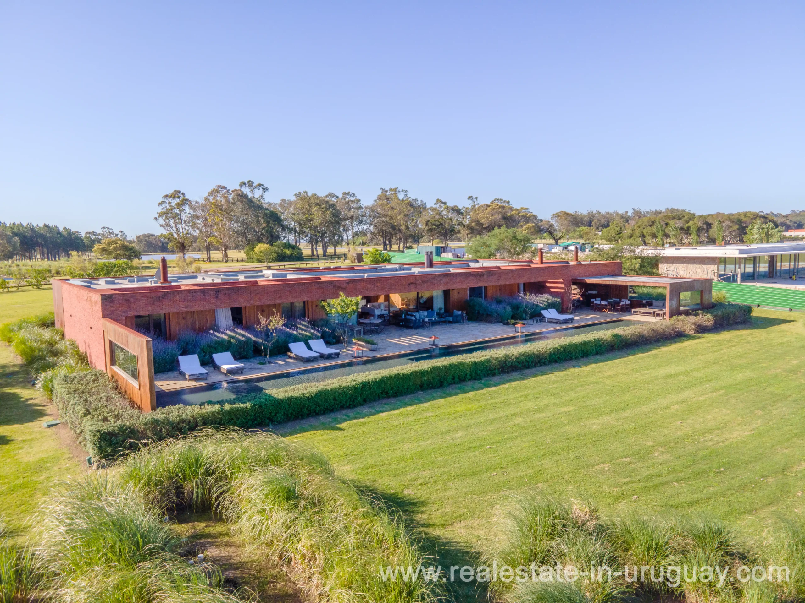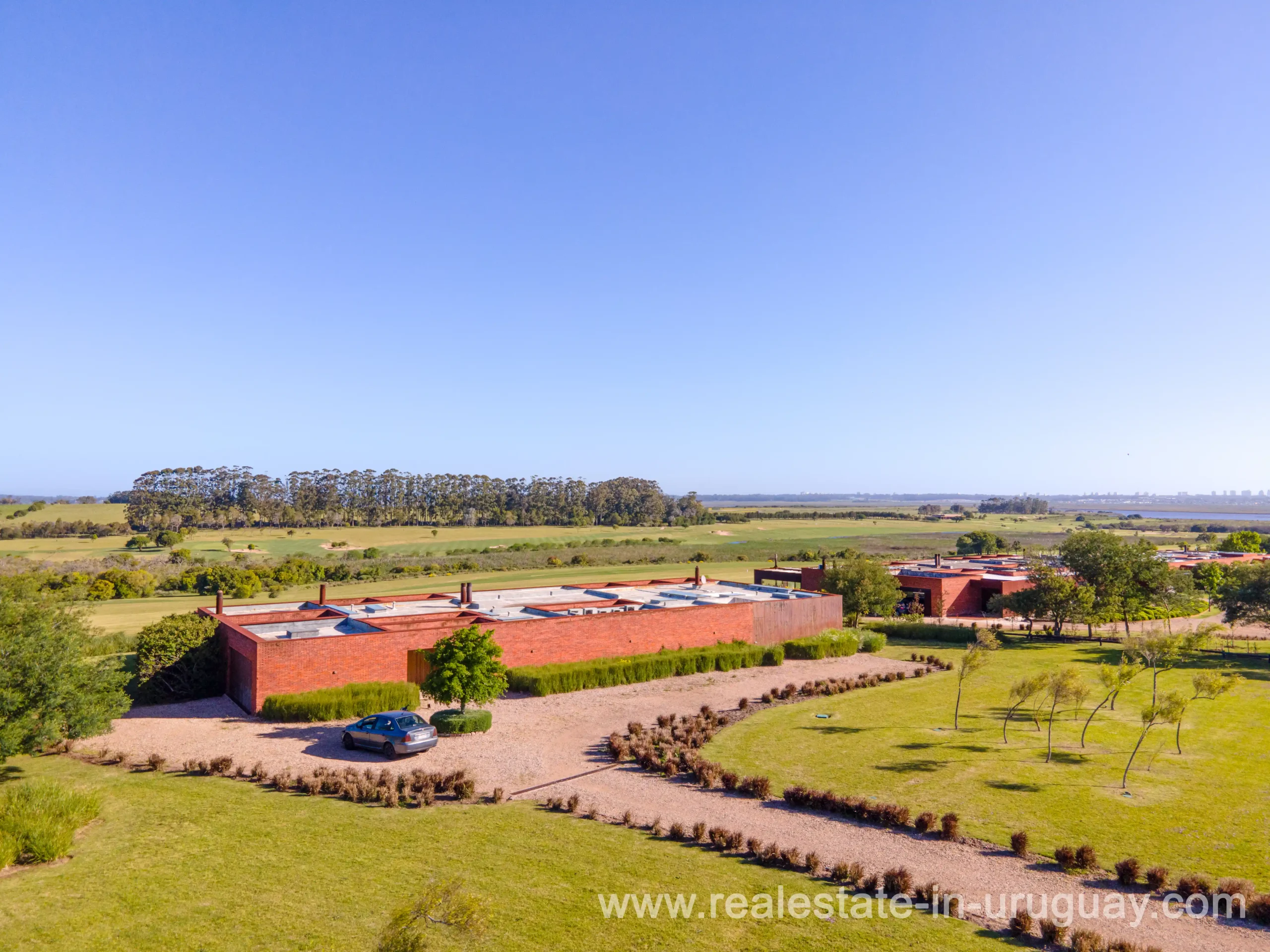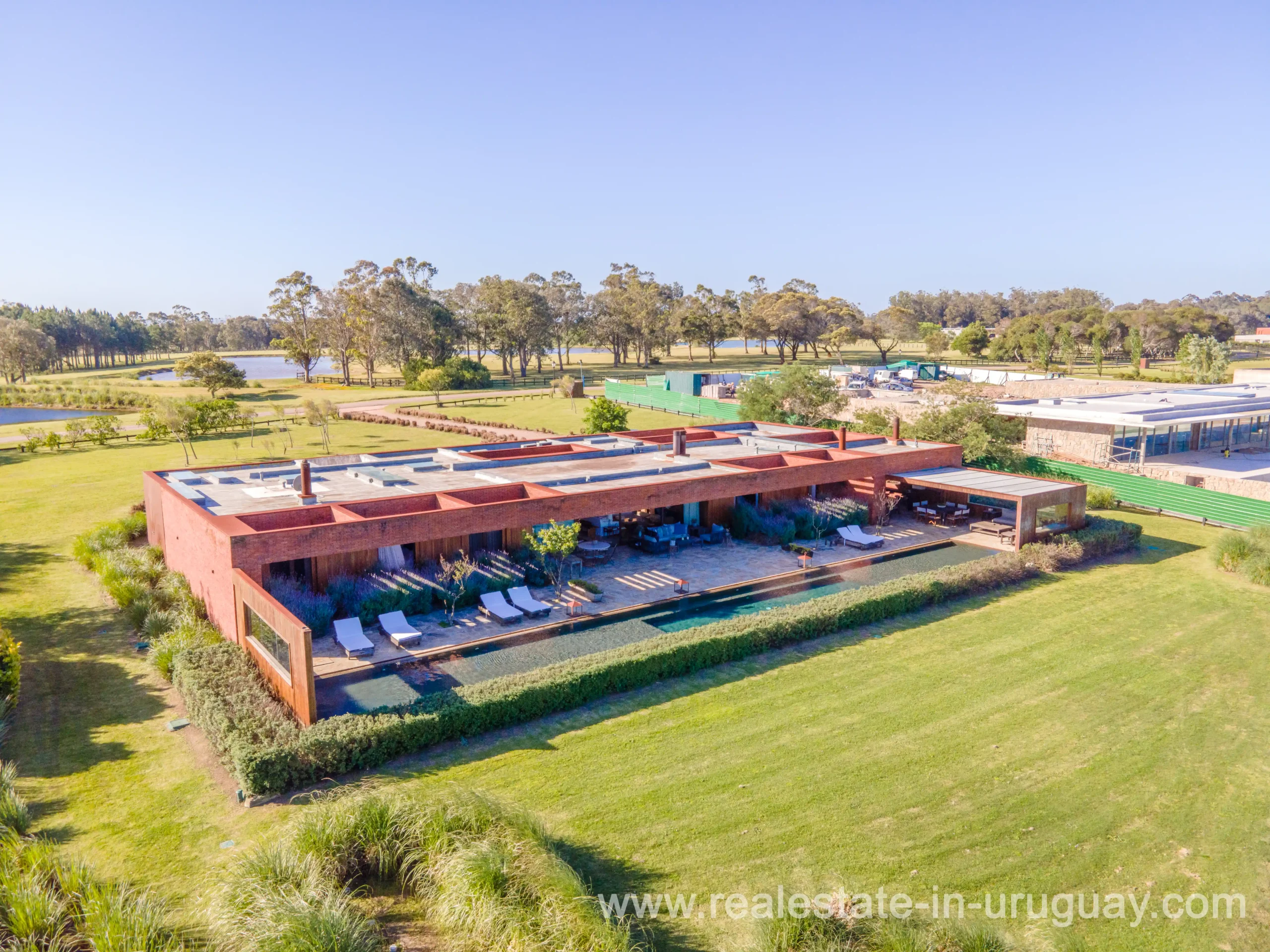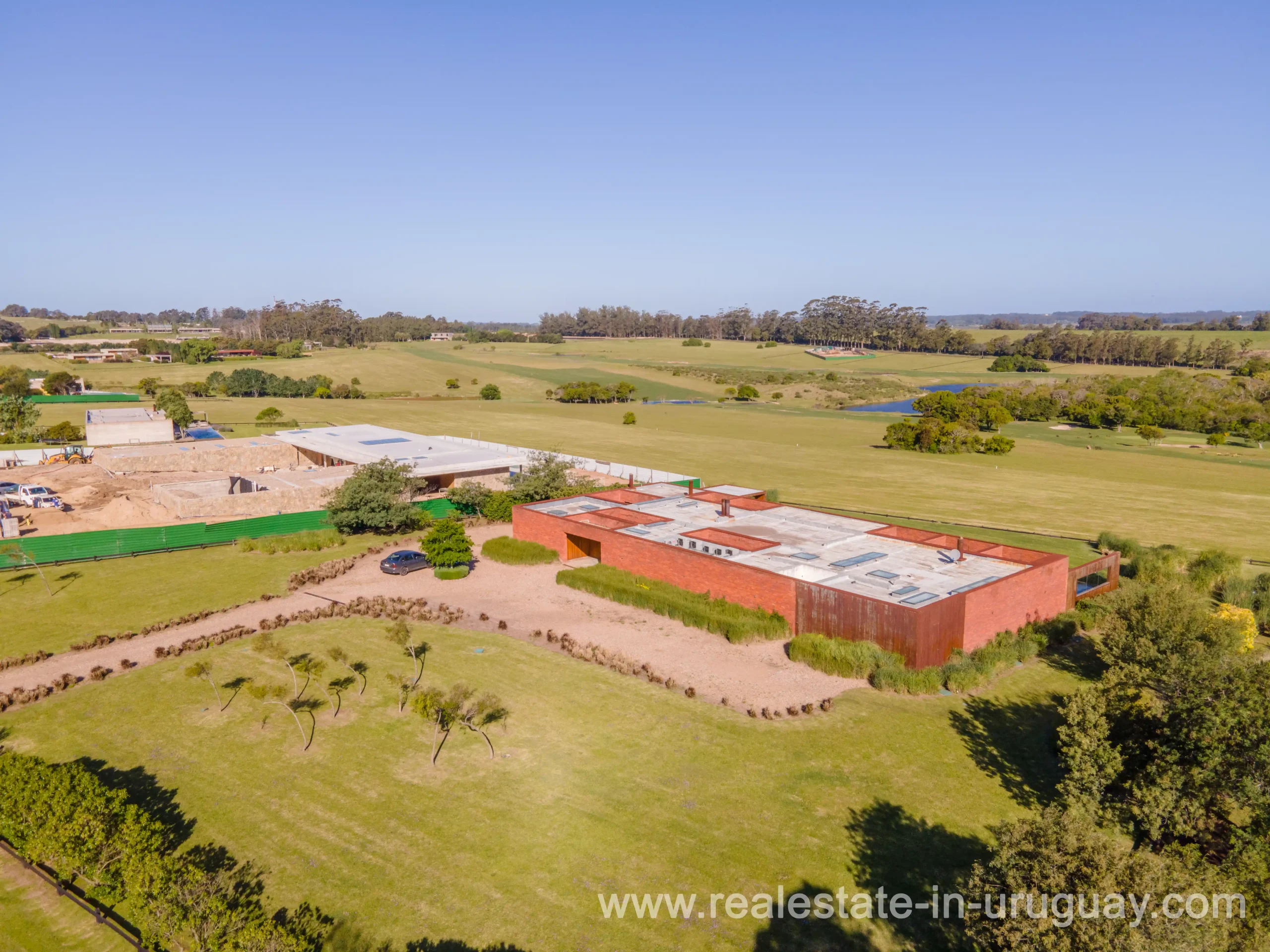 This new bright and modern amazing villa in Fasano is located in one of the best private communities in Uruguay, ‘Las Piedras’, with all kinds of amenities, security and a five star hotel with renowned restaurant. The property is on a golf course designed by Arnold Palmer and affords open views to the lovely landscape. Characterized as much for its architectural design as for its interior, it features quality finishes combining materials such as stone, brick and Lapacho wood. On a single story, all rooms in the property enjoy access to outdoors and are bright and spacious thanks to large windows and interior gardens as well as skylights which allow natural light into all rooms. The property comprises a large living/dining room, kitchen, spacious master suite, three further suites, outdoor terrace with BBQ/grill, dining room and covered living room, sauna, large swimming pool with sun deck, storage area and double garage plus a golf buggy. The staff bedroom is next to the utility area and has a separate entrance. The house is decorated fully equipped with underfloor heating and air conditioning in all rooms. The complex offers its own hotel service and has a horse-riding area with stables, heliport, tennis court, kids’ club, sauna, heated swimming pool, etc.