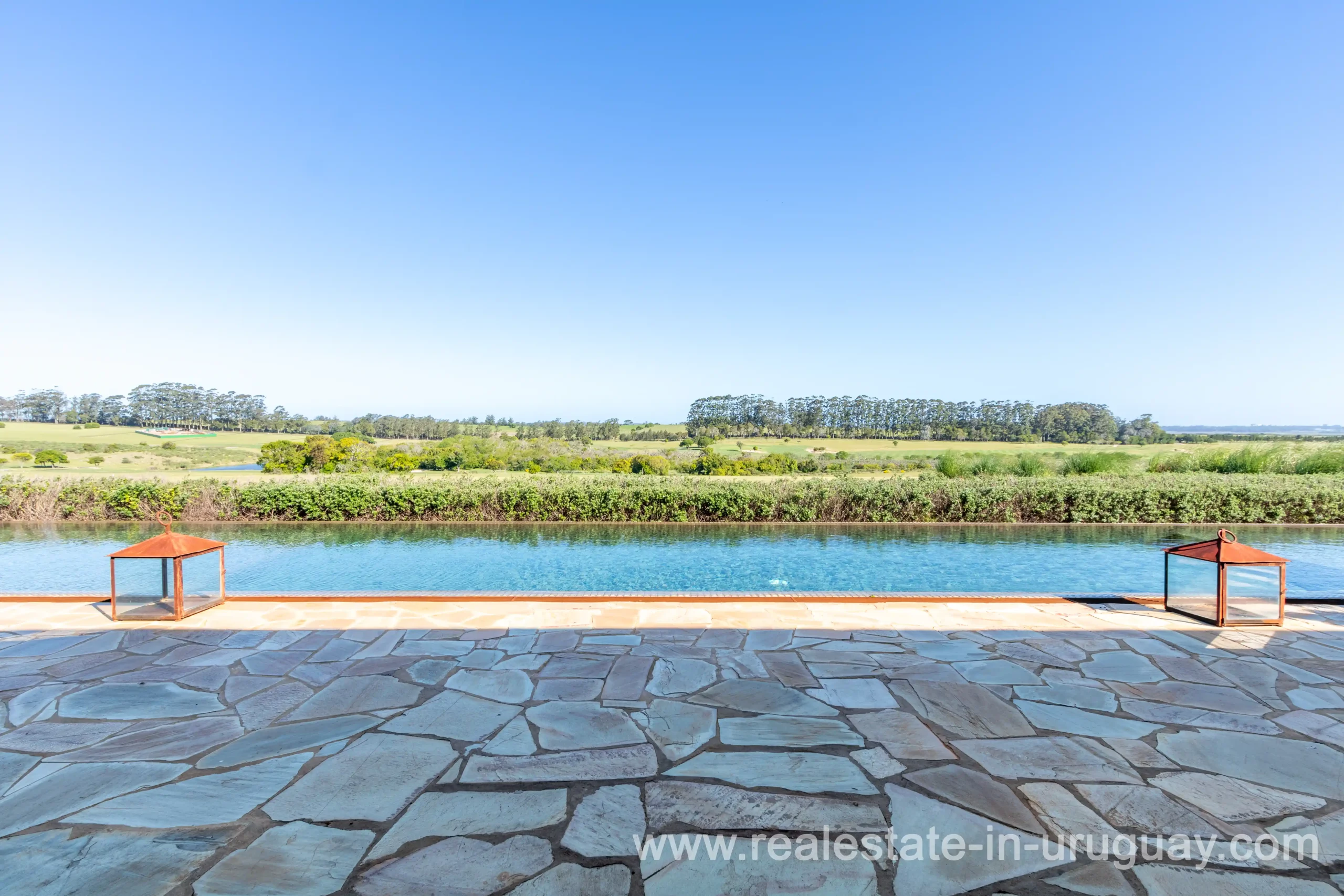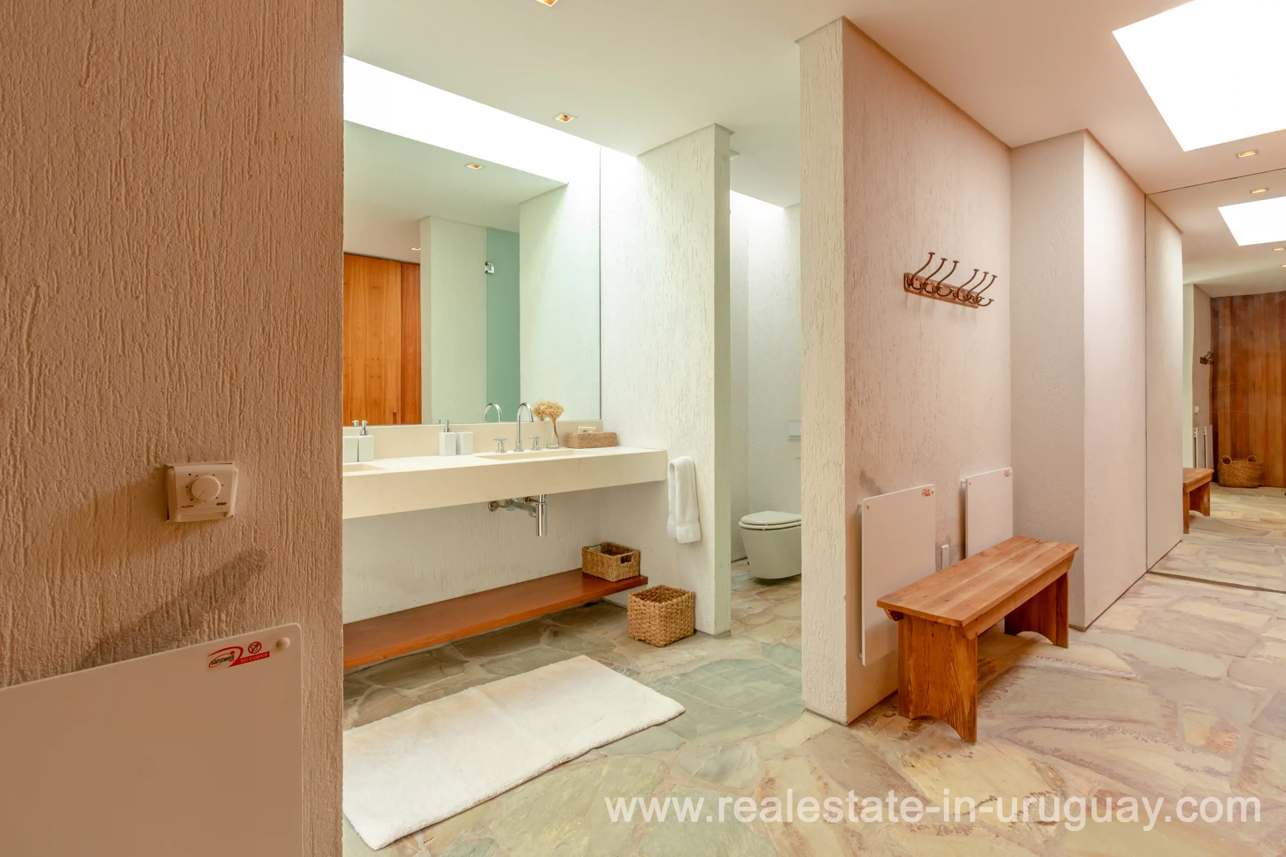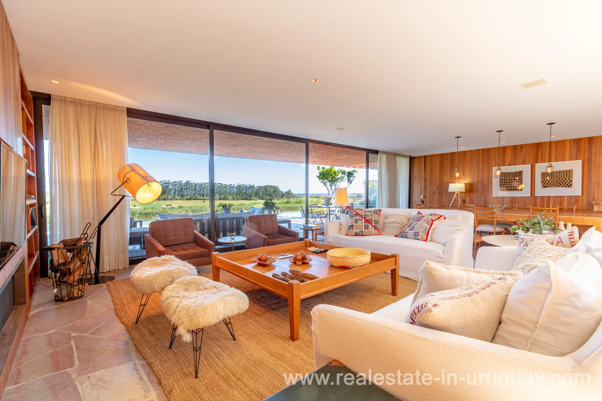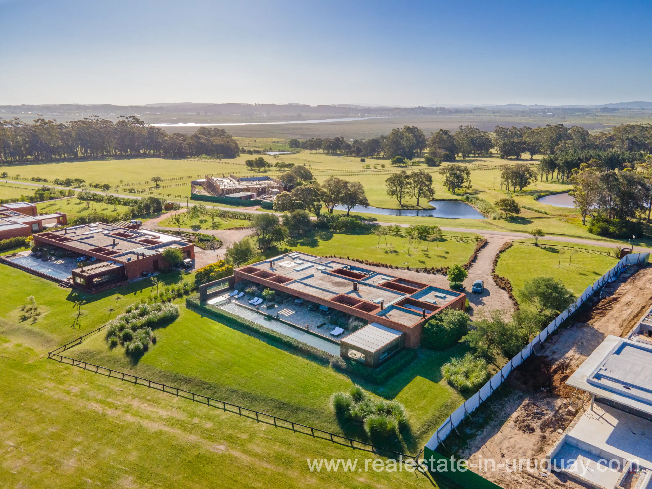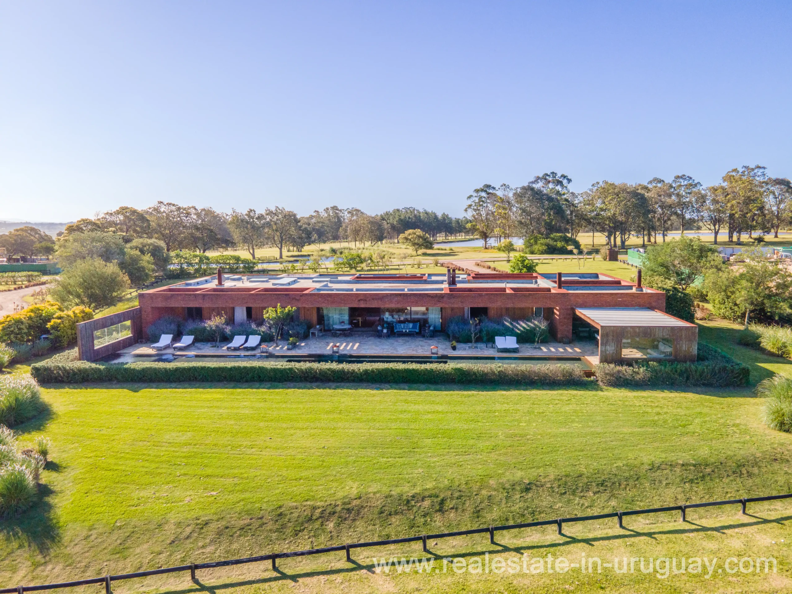 This new bright and modern amazing villa in Fasano is located in one of the best private communities in Uruguay, ‘Las Piedras’, with all kinds of amenities, security and a five star hotel with renowned restaurant. The property is on a golf course designed by Arnold Palmer and affords open views to the lovely landscape. Characterized as much for its architectural design as for its interior, it features quality finishes combining materials such as stone, brick and Lapacho wood. On a single story, all rooms in the property enjoy access to outdoors and are bright and spacious thanks to large windows and interior gardens as well as skylights which allow natural light into all rooms. The property comprises a large living/dining room, kitchen, spacious master suite, three further suites, outdoor terrace with BBQ/grill, dining room and covered living room, sauna, large swimming pool with sun deck, storage area and double garage plus a golf buggy. The staff bedroom is next to the utility area and has a separate entrance. The house is decorated fully equipped with underfloor heating and air conditioning in all rooms. The complex offers its own hotel service and has a horse-riding area with stables, heliport, tennis court, kids’ club, sauna, heated swimming pool, etc.
