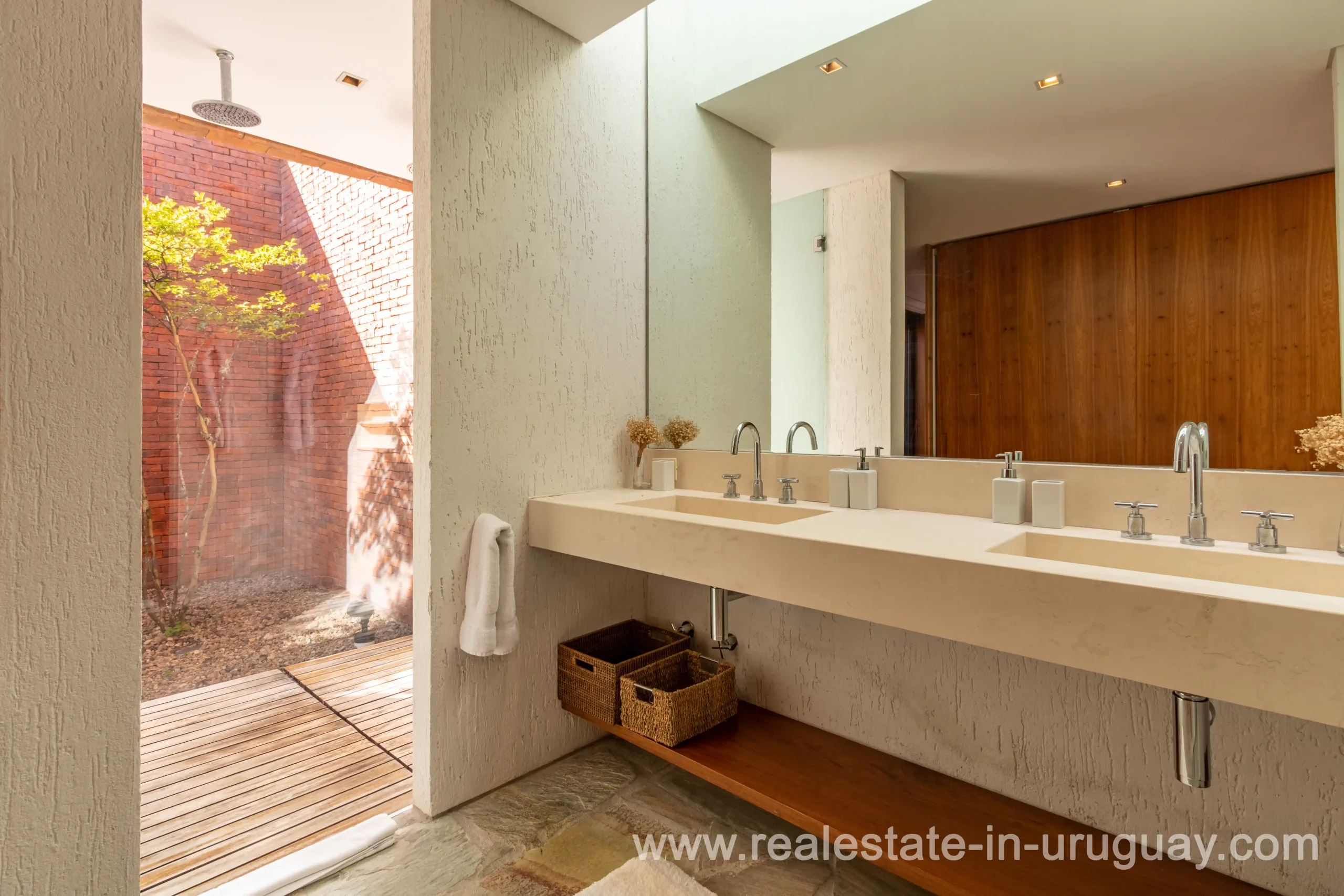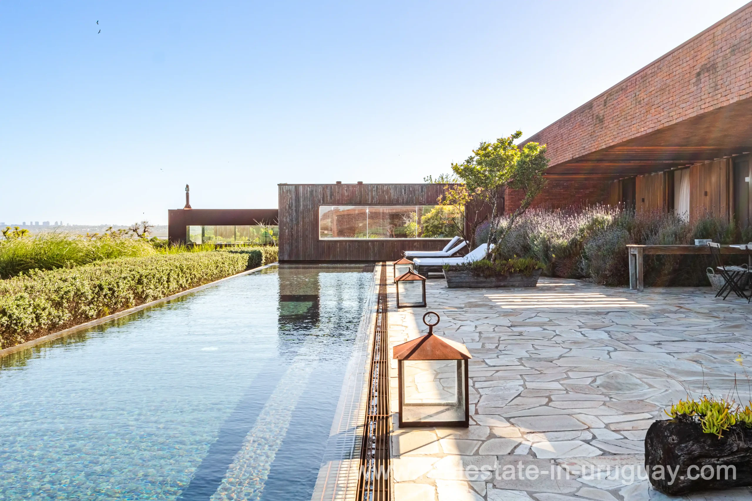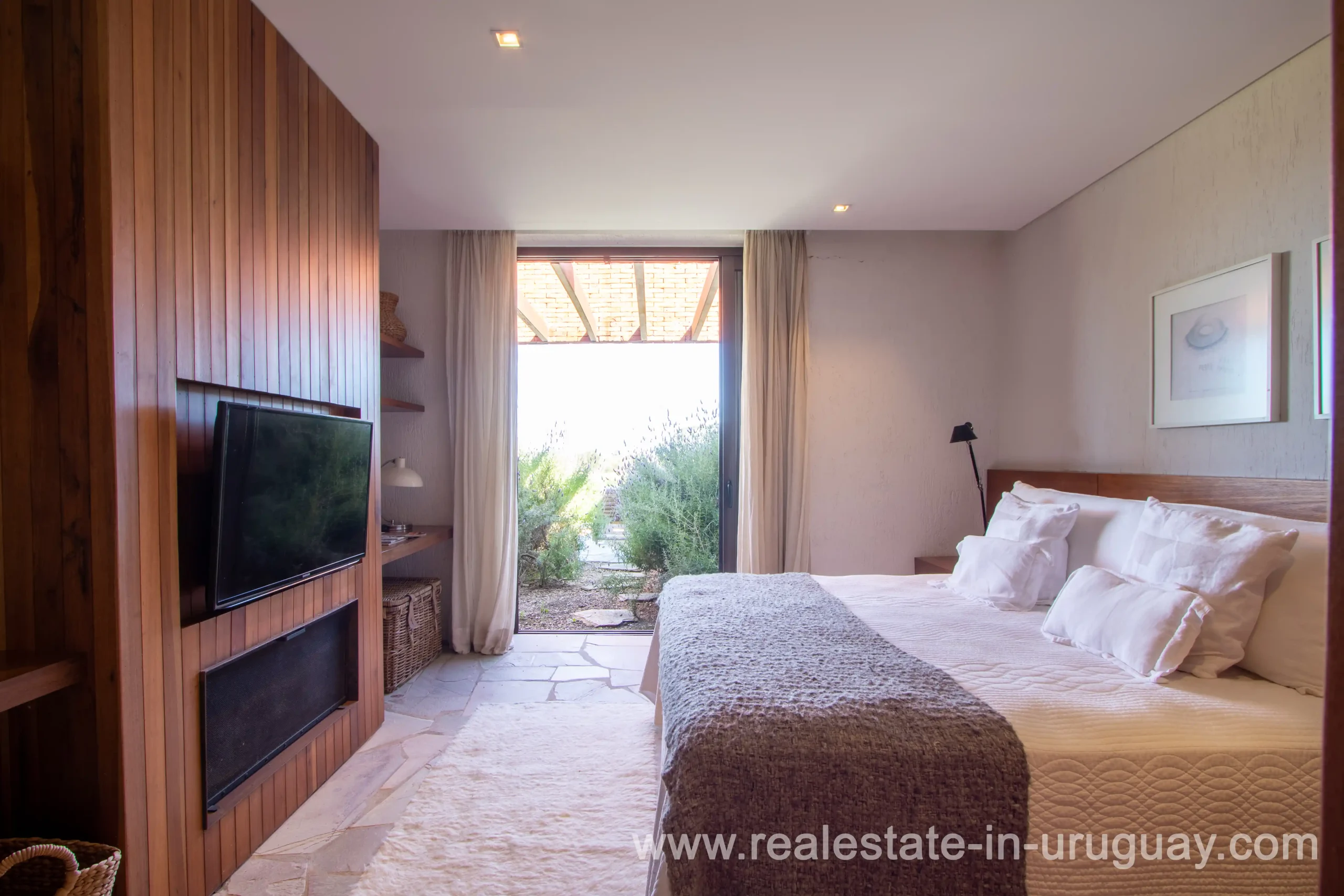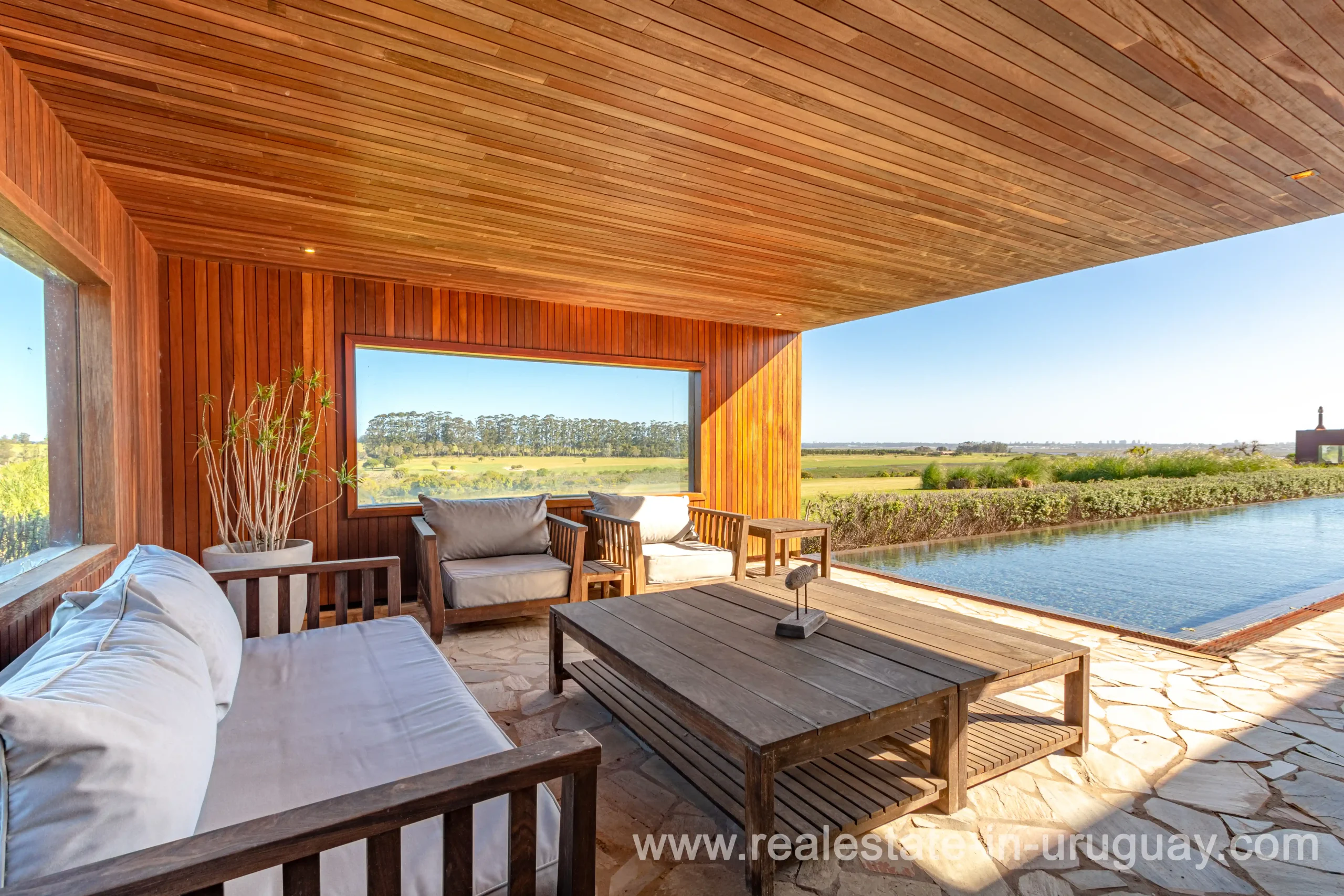 This new bright and modern amazing villa in Fasano is located in one of the best private communities in Uruguay, ‘Las Piedras’, with all kinds of amenities, security and a five star hotel with renowned restaurant. The property is on a golf course designed by Arnold Palmer and affords open views to the lovely landscape. Characterized as much for its architectural design as for its interior, it features quality finishes combining materials such as stone, brick and Lapacho wood. On a single story, all rooms in the property enjoy access to outdoors and are bright and spacious thanks to large windows and interior gardens as well as skylights which allow natural light into all rooms. The property comprises a large living/dining room, kitchen, spacious master suite, three further suites, outdoor terrace with BBQ/grill, dining room and covered living room, sauna, large swimming pool with sun deck, storage area and double garage plus a golf buggy. The staff bedroom is next to the utility area and has a separate entrance. The house is decorated fully equipped with underfloor heating and air conditioning in all rooms. The complex offers its own hotel service and has a horse-riding area with stables, heliport, tennis court, kids’ club, sauna, heated swimming pool, etc.