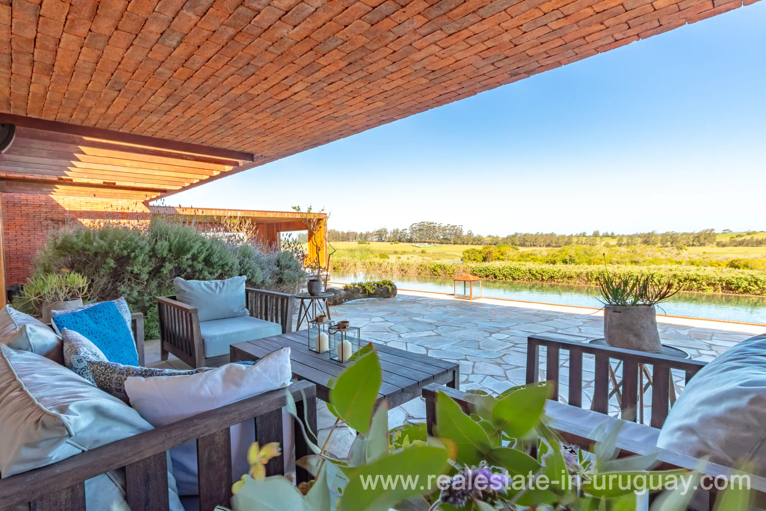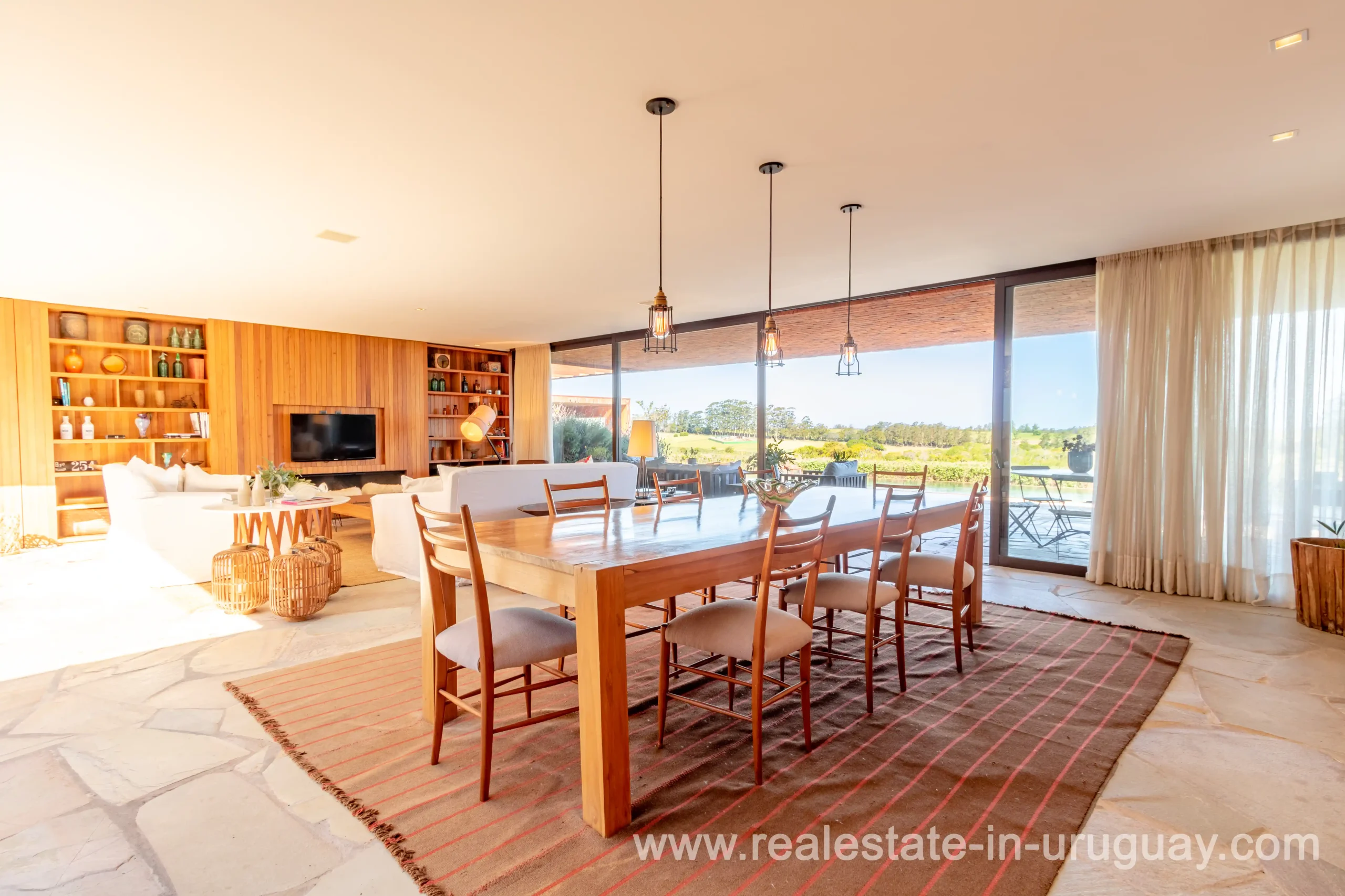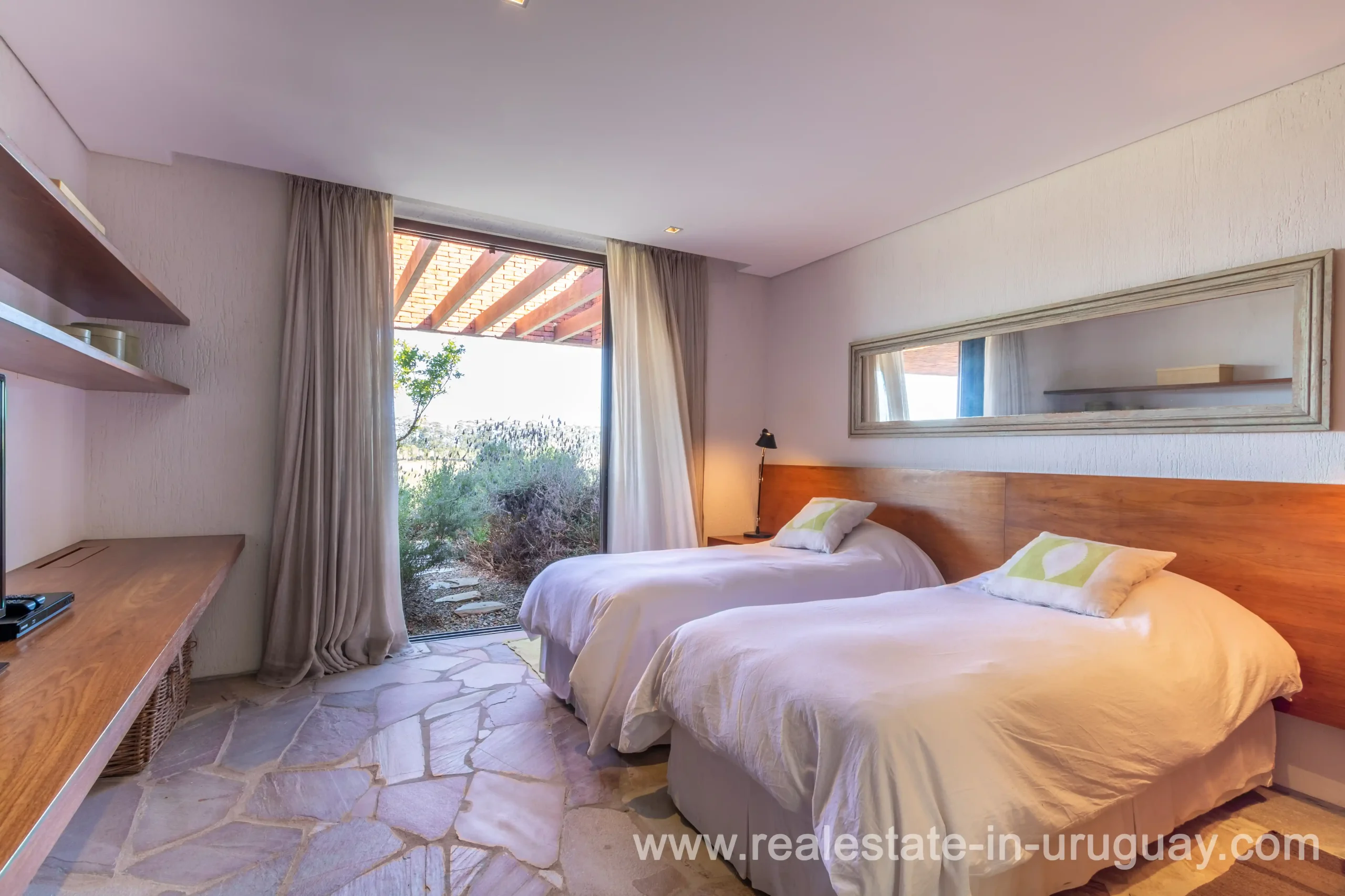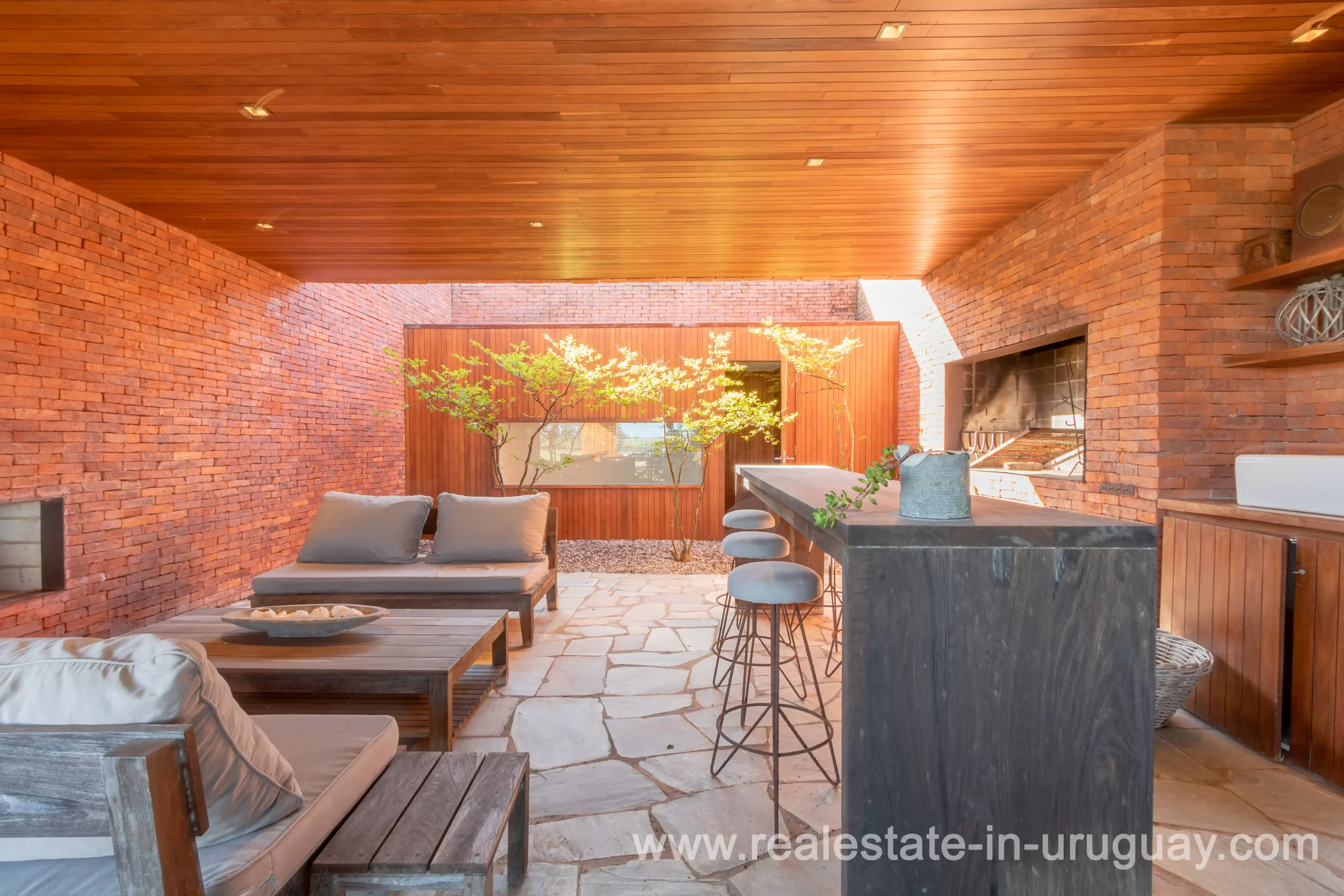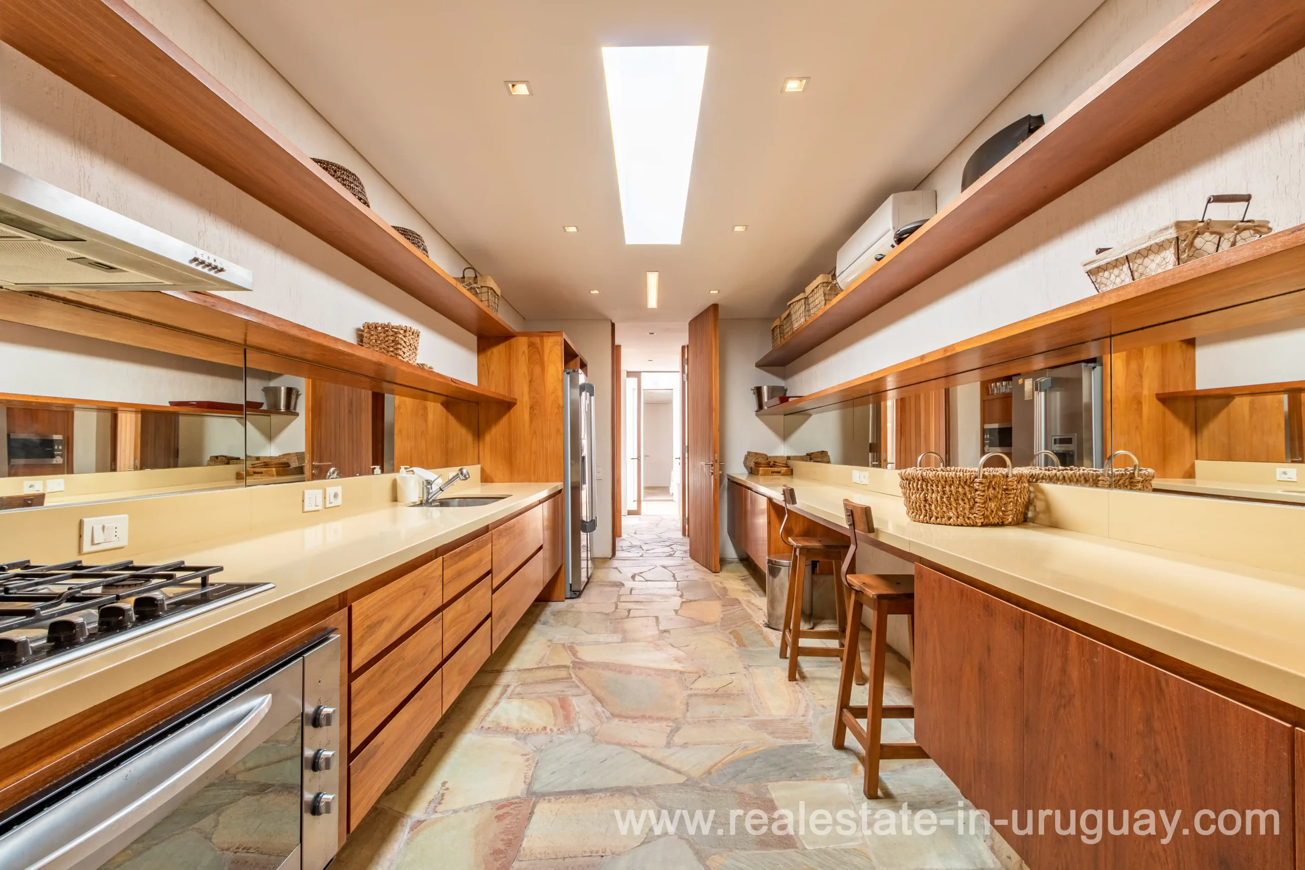 This new bright and modern amazing villa in Fasano is located in one of the best private communities in Uruguay, ‘Las Piedras’, with all kinds of amenities, security and a five star hotel with renowned restaurant. The property is on a golf course designed by Arnold Palmer and affords open views to the lovely landscape. Characterized as much for its architectural design as for its interior, it features quality finishes combining materials such as stone, brick and Lapacho wood. On a single story, all rooms in the property enjoy access to outdoors and are bright and spacious thanks to large windows and interior gardens as well as skylights which allow natural light into all rooms. The property comprises a large living/dining room, kitchen, spacious master suite, three further suites, outdoor terrace with BBQ/grill, dining room and covered living room, sauna, large swimming pool with sun deck, storage area and double garage plus a golf buggy. The staff bedroom is next to the utility area and has a separate entrance. The house is decorated fully equipped with underfloor heating and air conditioning in all rooms. The complex offers its own hotel service and has a horse-riding area with stables, heliport, tennis court, kids’ club, sauna, heated swimming pool, etc.