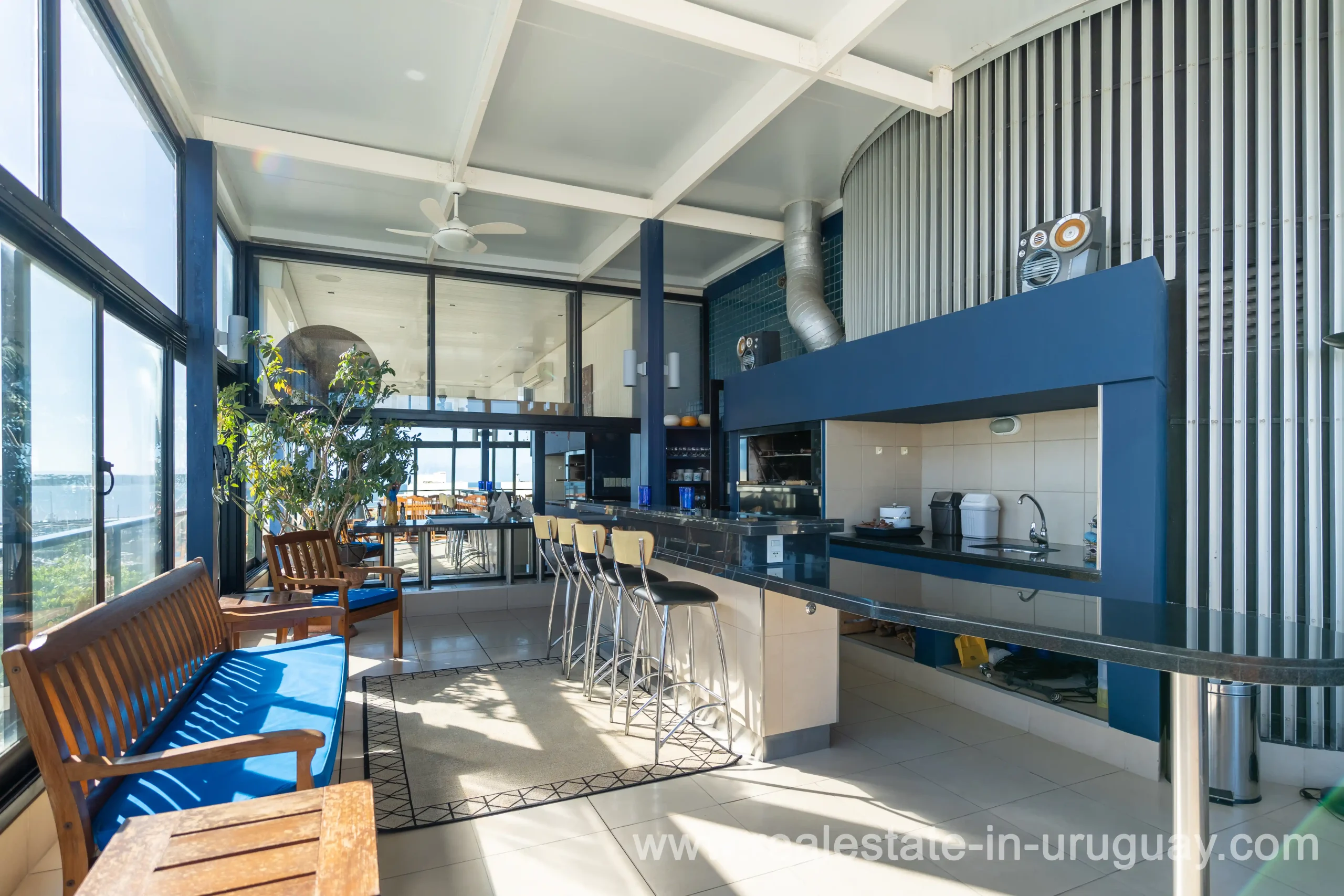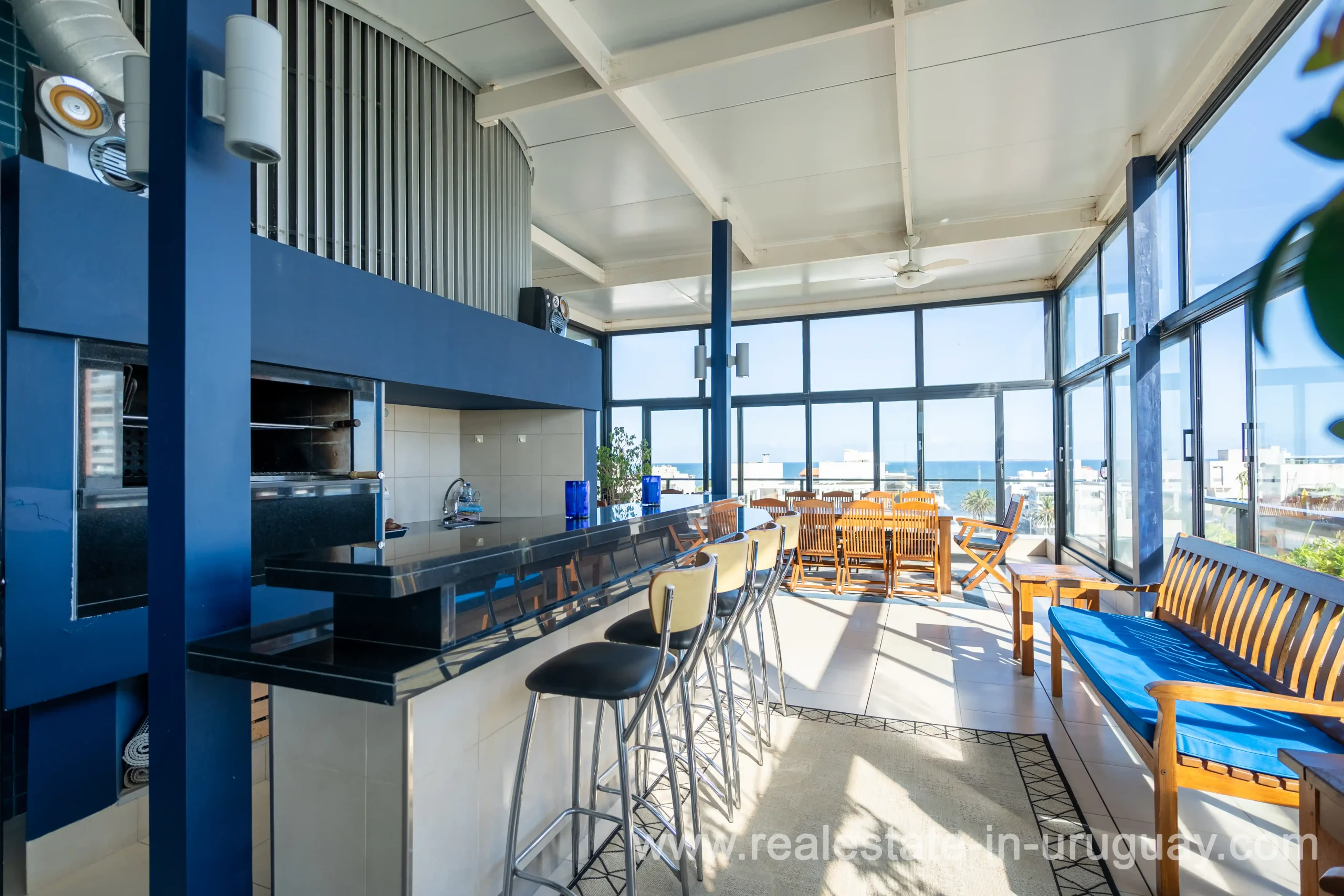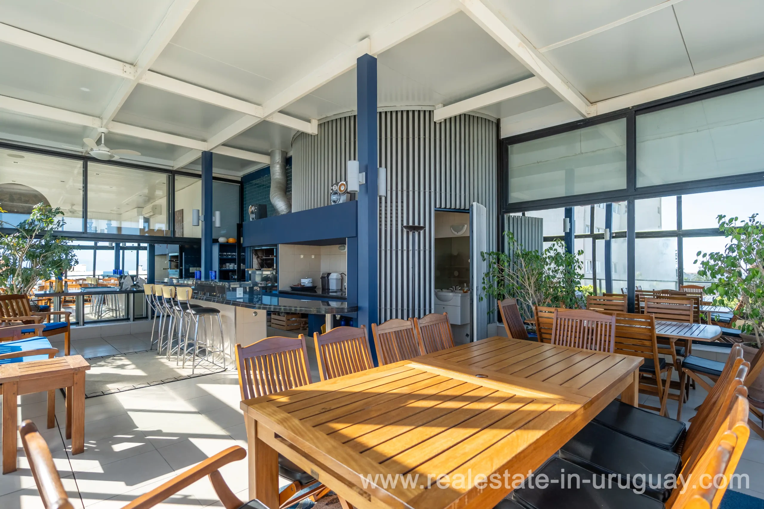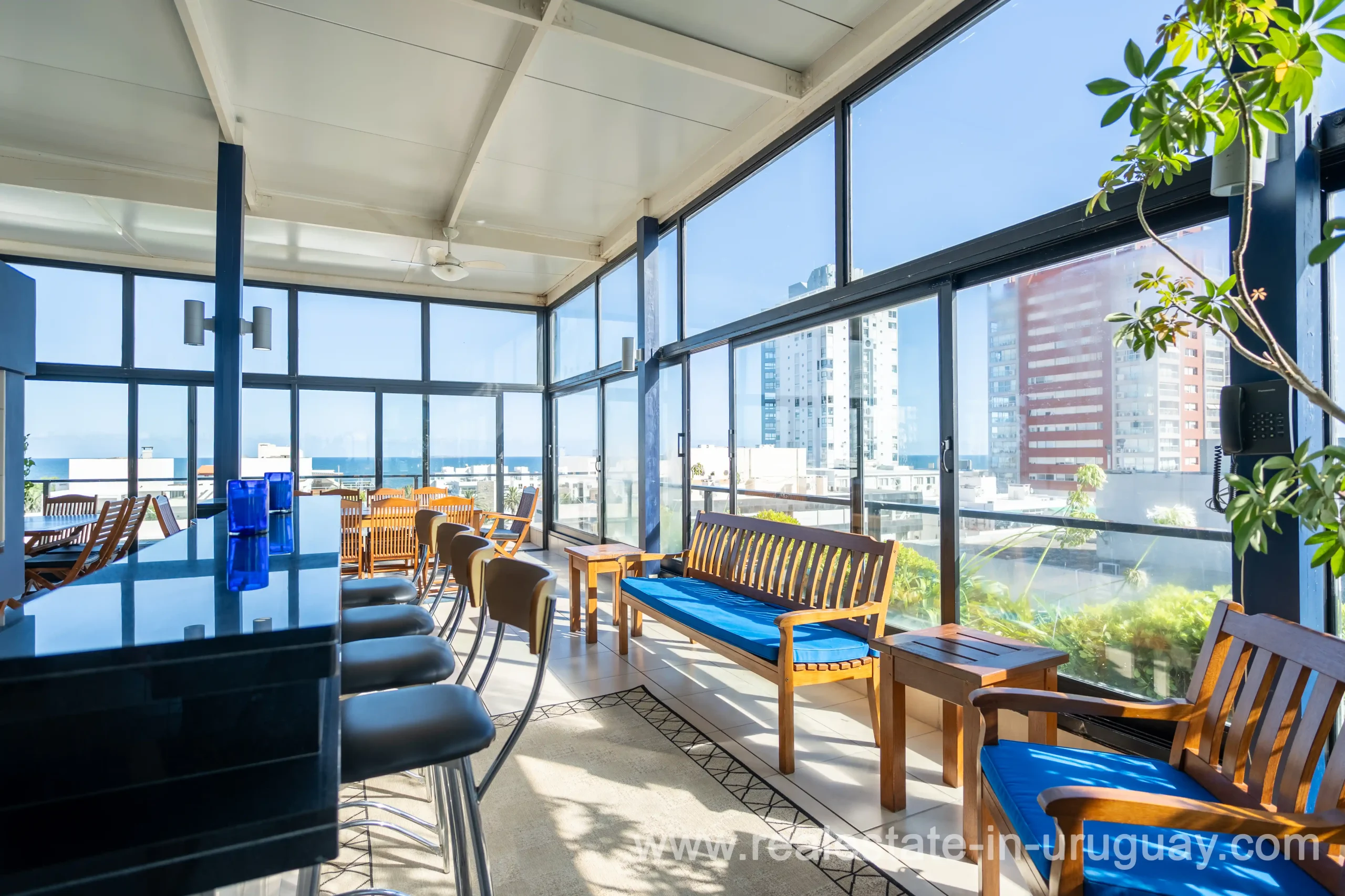 Located opposite the port of Punta del Este, just steps away from all services and restaurants, we find this apartment situated in a classic, high-end building designed by the renowned architect Mario Roberto Álvarez. With a 170 m2 corner floor plan, the front features a spacious living-dining room, which leads to a 30 m2 balcony with spectacular sunset views. Also at the front is the master bedroom with an en-suite bathroom and walk-in wardrobe. Additionally, there are two more en-suite bedrooms, an independent kitchen, a guest toilet, and a service room. All rooms are equipped with underfloor heating. On the building’s rooftop, this unit boasts a large, enclosed barbecue area for exclusive use. It also includes two parking spaces and two storage rooms. Daily housekeeping service and 24-hour reception.