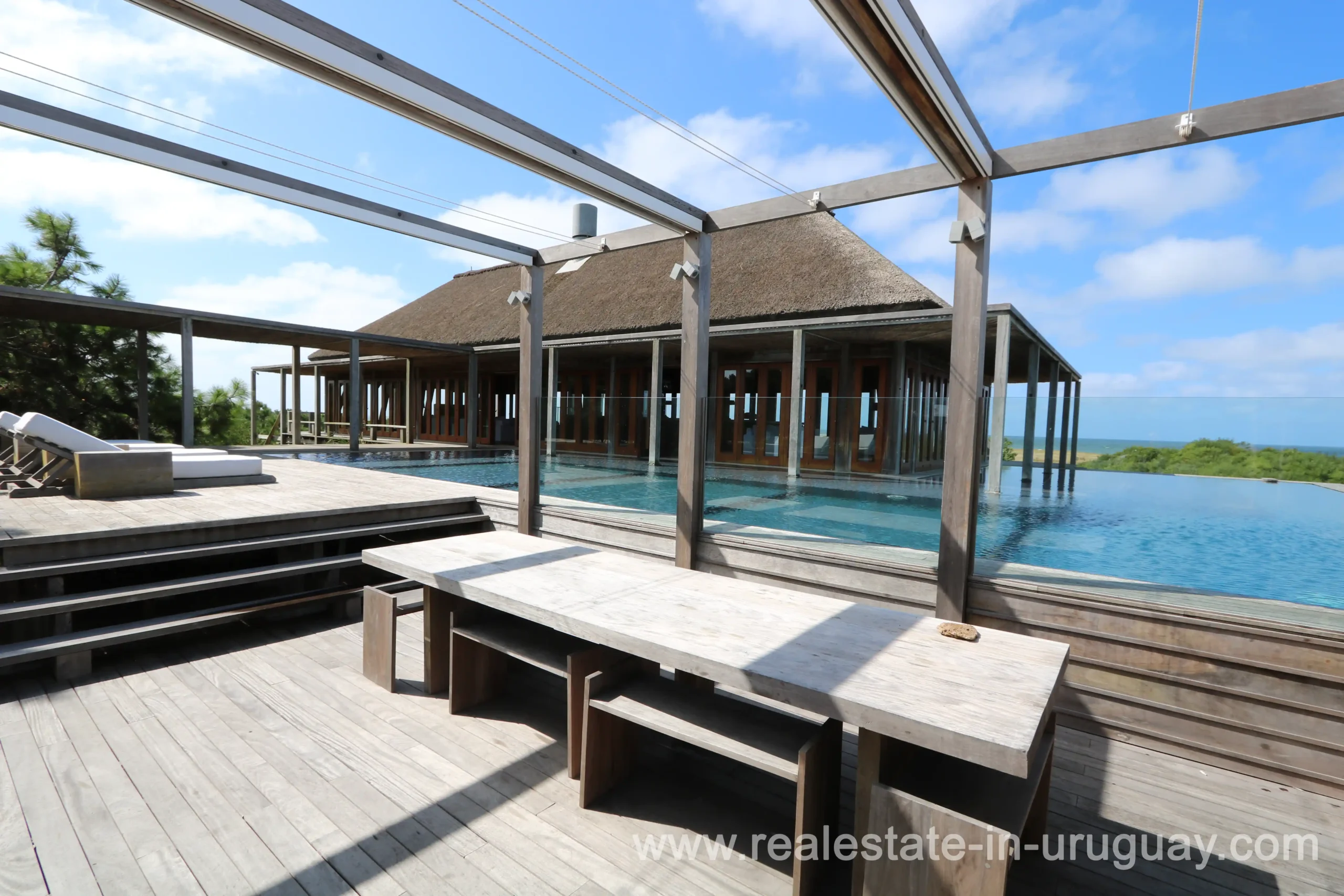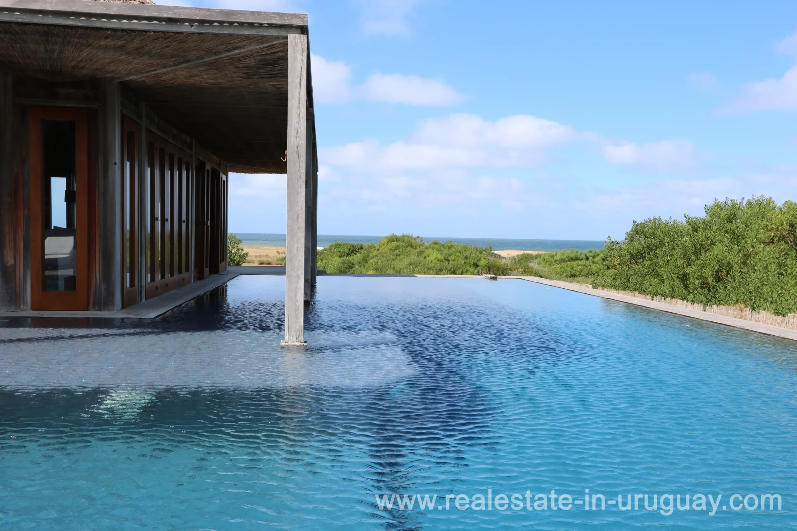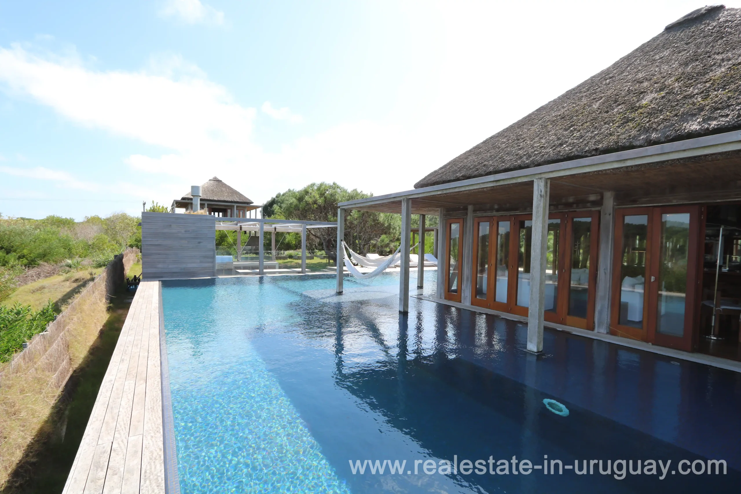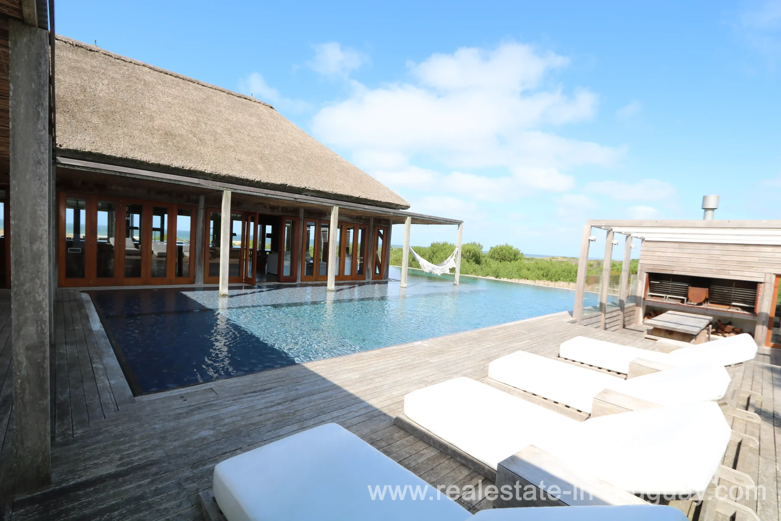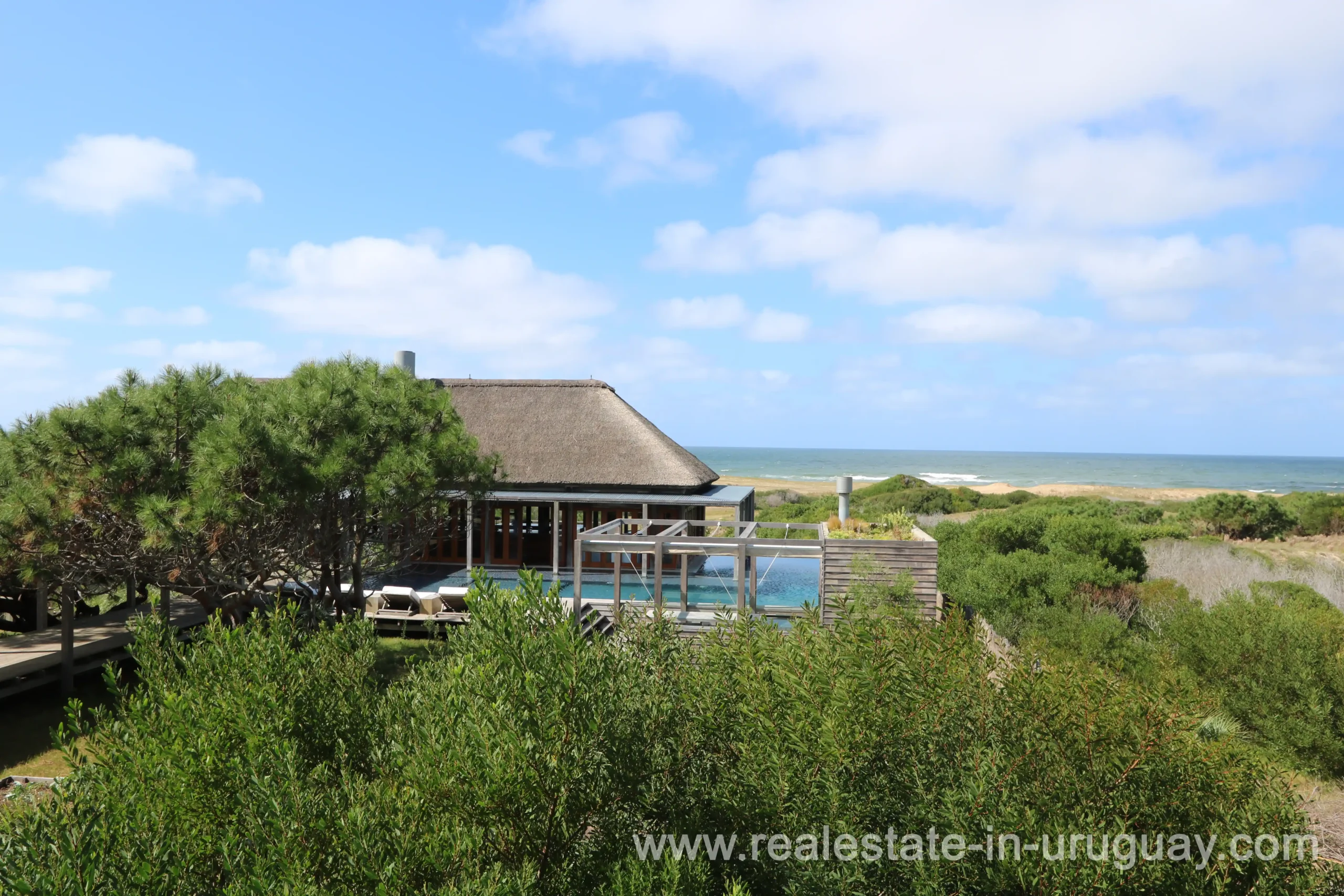 Just reduced 25%! This beach home in San Antonio by La Pedrera was designed by the renowned architect Farina and is located within the resort of San Antonio between La Pedrera and Cabo Polonio at the highest point on the beach affording open sea views. With a thatched roof, the house is almost entirely built out of Lapacho wood with Mahagony doors and windows and has grounds containing indigenous plants making it extremely practical and economic to maintain. The property built in 2013 has two units which are connected via a wide and covered Lapacho wood roof walkway. The upper part of the main unit comprises the social areas: professional kitchen, bar, living room, formal dining room, daily dining room and further more a private living room. It is an open area measuring 180m2 surrounded by large windows which open out in the summer to the front deck and the swimming pool at the rear to extend the rooms and indoor areas and providing a sensation of comfort. The lower part of the main unit consists of four spacious bedrooms all with ocean views, three bathrooms, machinery room and laundry area. The smaller unit features the master suite with a large dressing room and stunning views. Completing the property, there is a 130m2 swimming pool with sun deck which adjoins part of the living room, gas central heating system, own water well, open parking area for several vehicles, plus a corral for horses. This is a unique property for its elegant yet simple style, its quality of construction, its location directly at the beach and for its comfort on the ocean’s edge. Special home to spend incredible vacations in a quiet peaceful area surrounded by sand dunes and the ocean. La Pedrera town offers many restaurants and shops and is not far away.