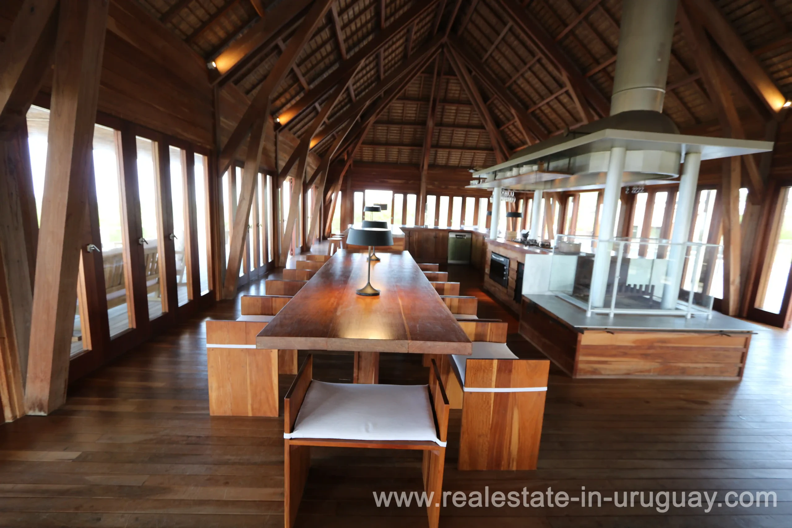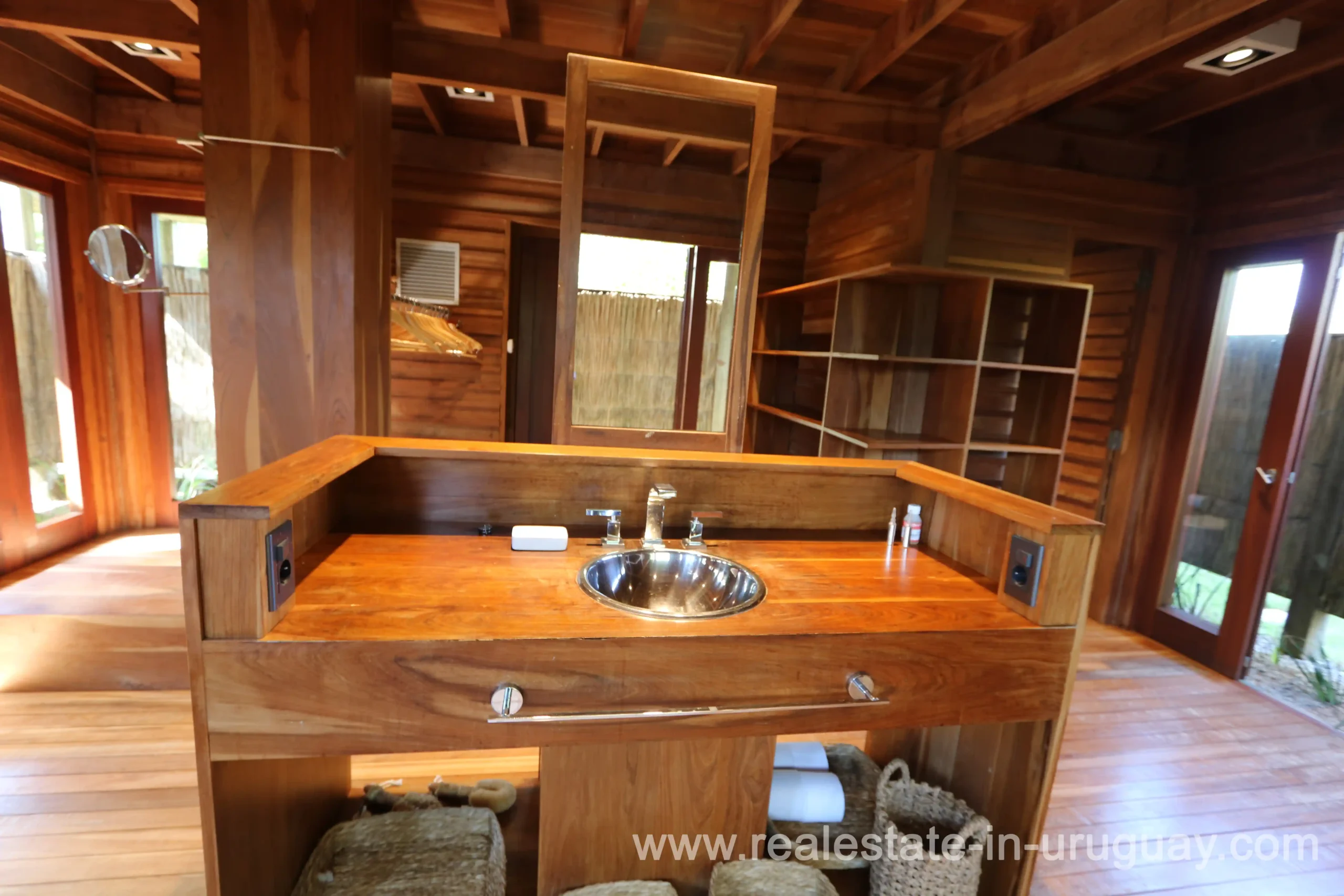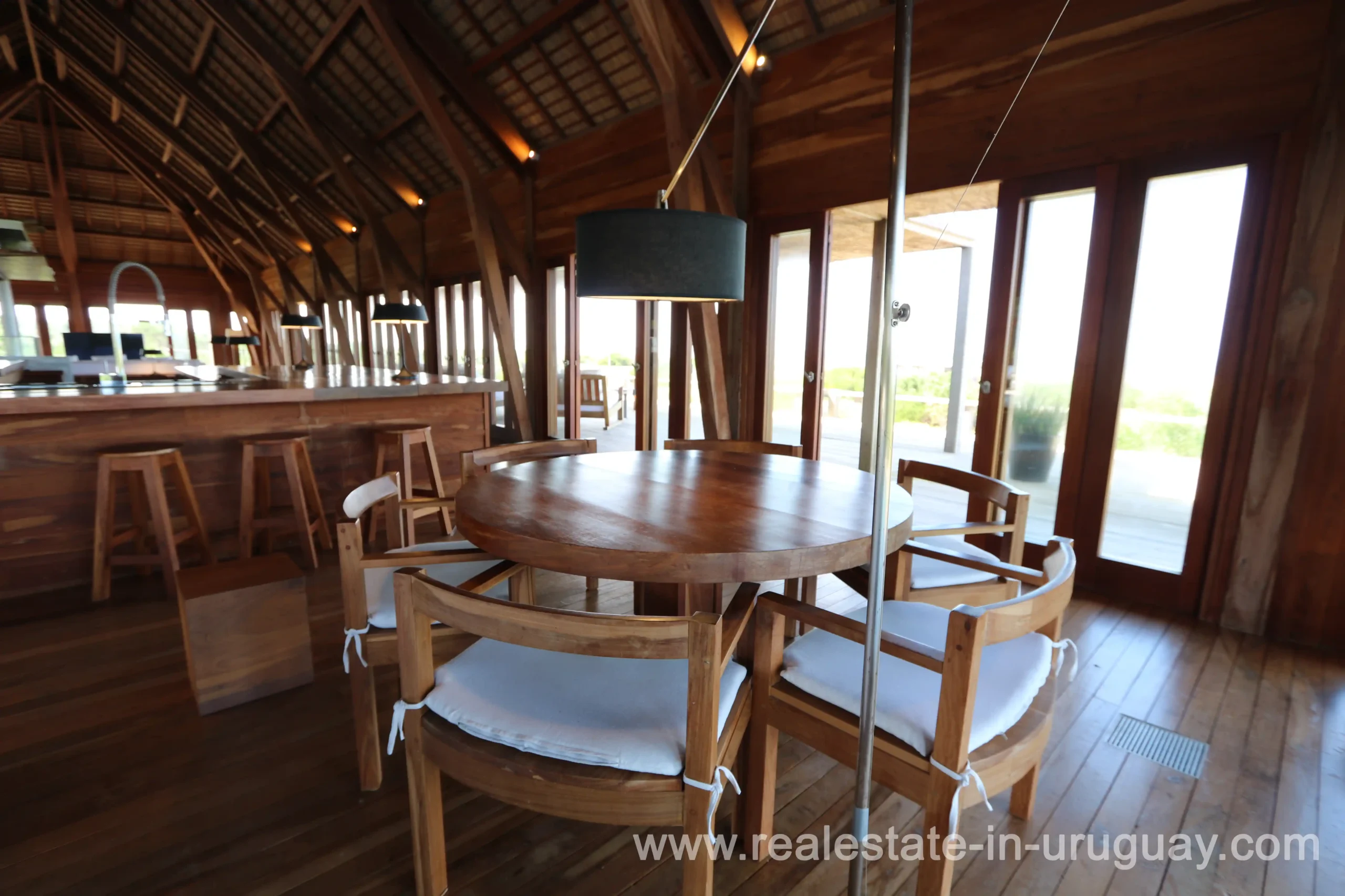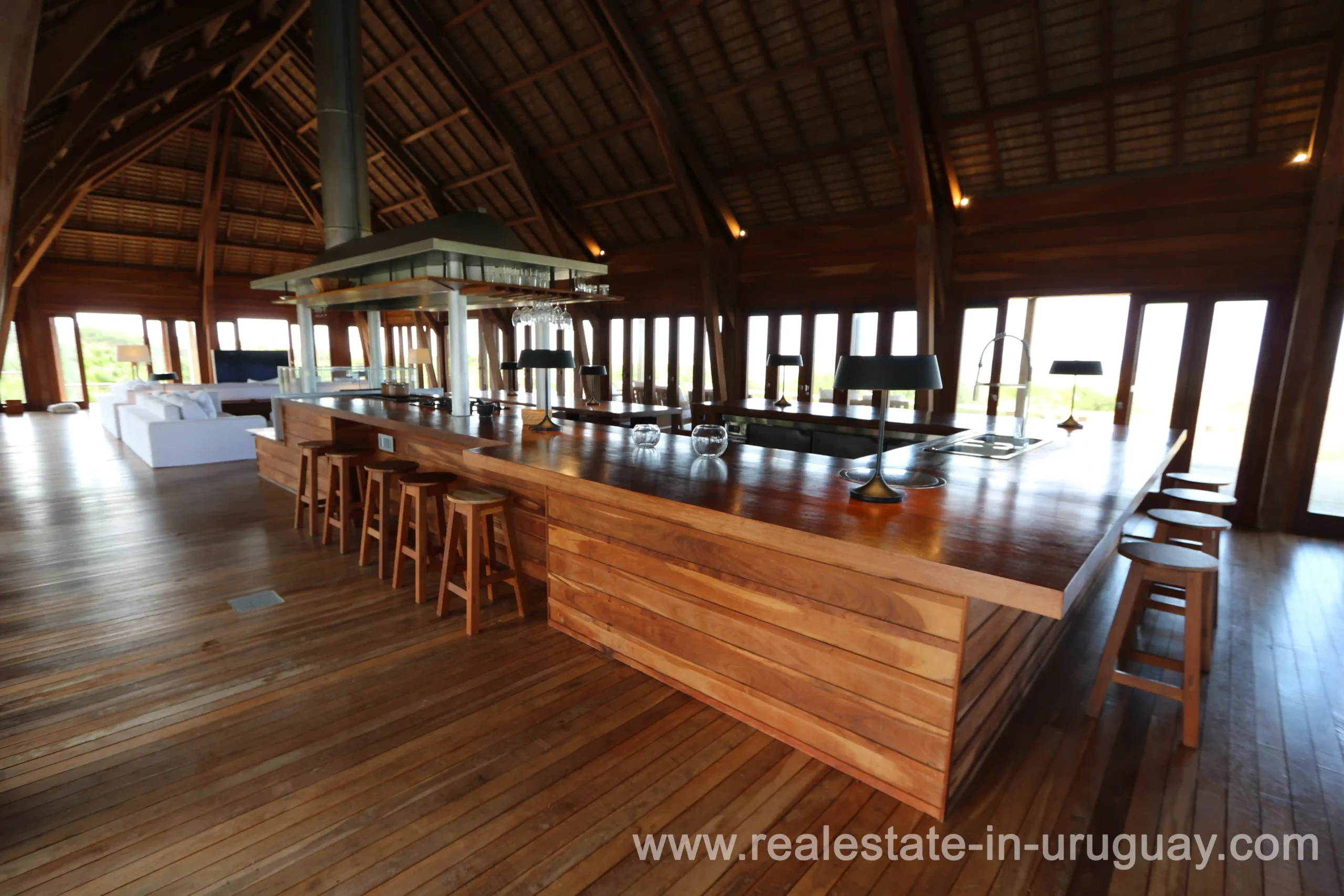 Just reduced 25%! This beach home in San Antonio by La Pedrera was designed by the renowned architect Farina and is located within the resort of San Antonio between La Pedrera and Cabo Polonio at the highest point on the beach affording open sea views. With a thatched roof, the house is almost entirely built out of Lapacho wood with Mahagony doors and windows and has grounds containing indigenous plants making it extremely practical and economic to maintain. The property built in 2013 has two units which are connected via a wide and covered Lapacho wood roof walkway. The upper part of the main unit comprises the social areas: professional kitchen, bar, living room, formal dining room, daily dining room and further more a private living room. It is an open area measuring 180m2 surrounded by large windows which open out in the summer to the front deck and the swimming pool at the rear to extend the rooms and indoor areas and providing a sensation of comfort. The lower part of the main unit consists of four spacious bedrooms all with ocean views, three bathrooms, machinery room and laundry area. The smaller unit features the master suite with a large dressing room and stunning views. Completing the property, there is a 130m2 swimming pool with sun deck which adjoins part of the living room, gas central heating system, own water well, open parking area for several vehicles, plus a corral for horses. This is a unique property for its elegant yet simple style, its quality of construction, its location directly at the beach and for its comfort on the ocean’s edge. Special home to spend incredible vacations in a quiet peaceful area surrounded by sand dunes and the ocean. La Pedrera town offers many restaurants and shops and is not far away.