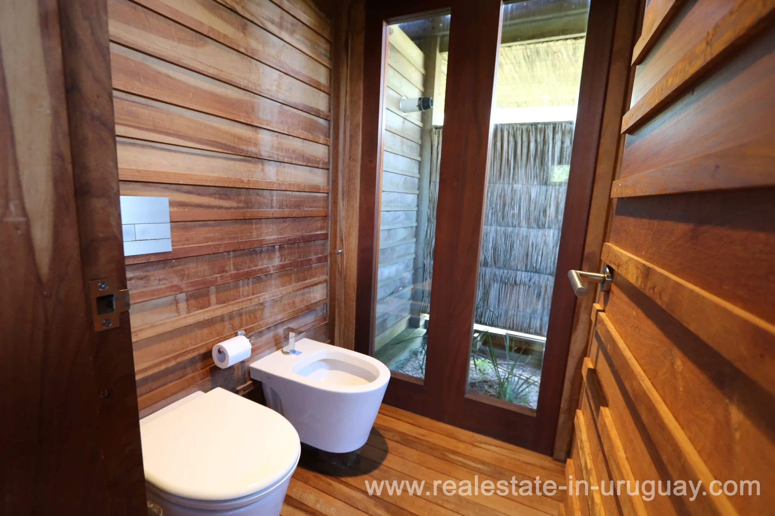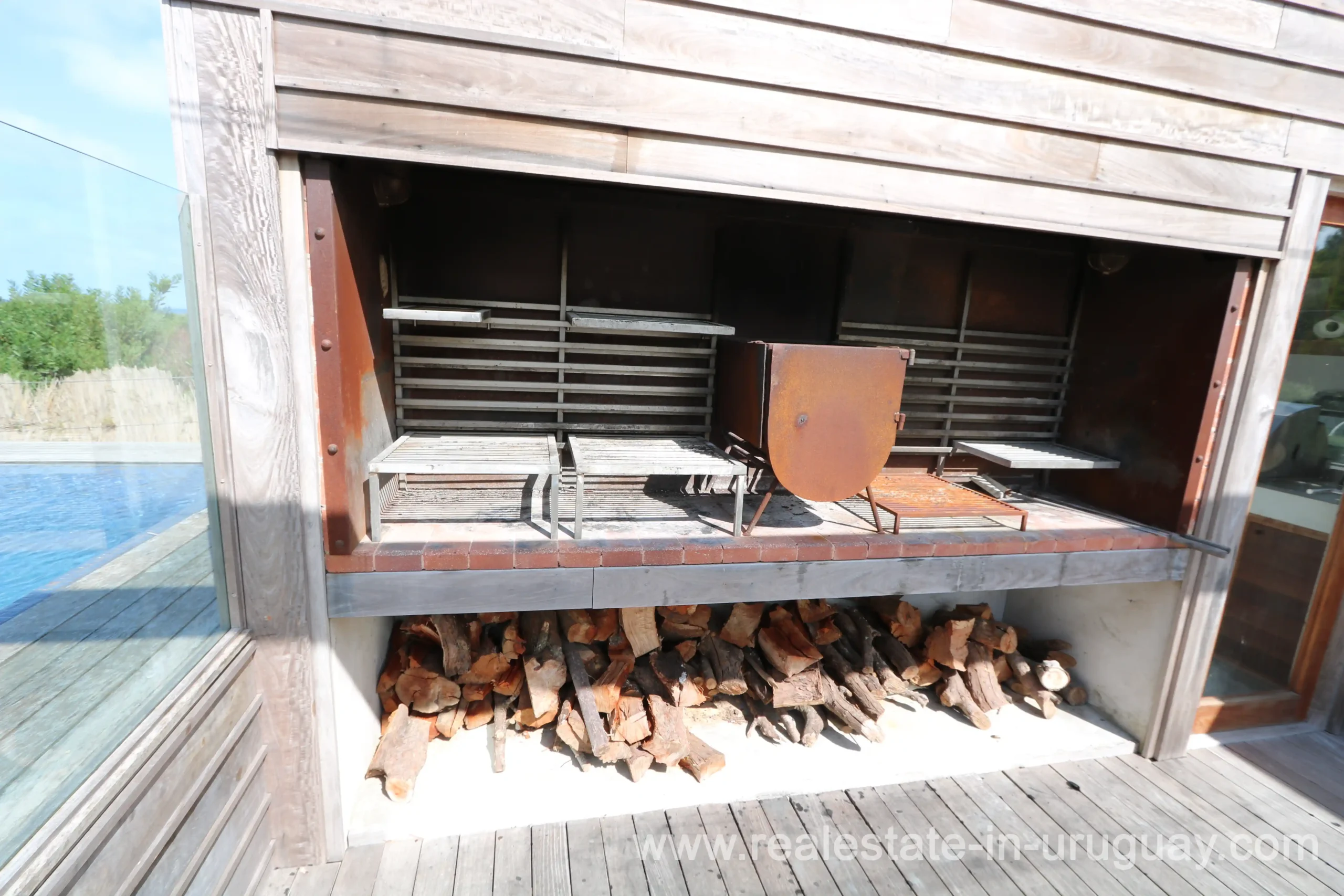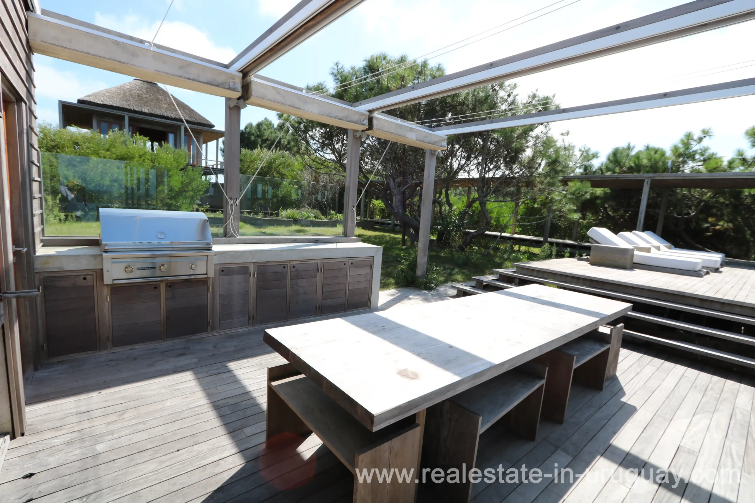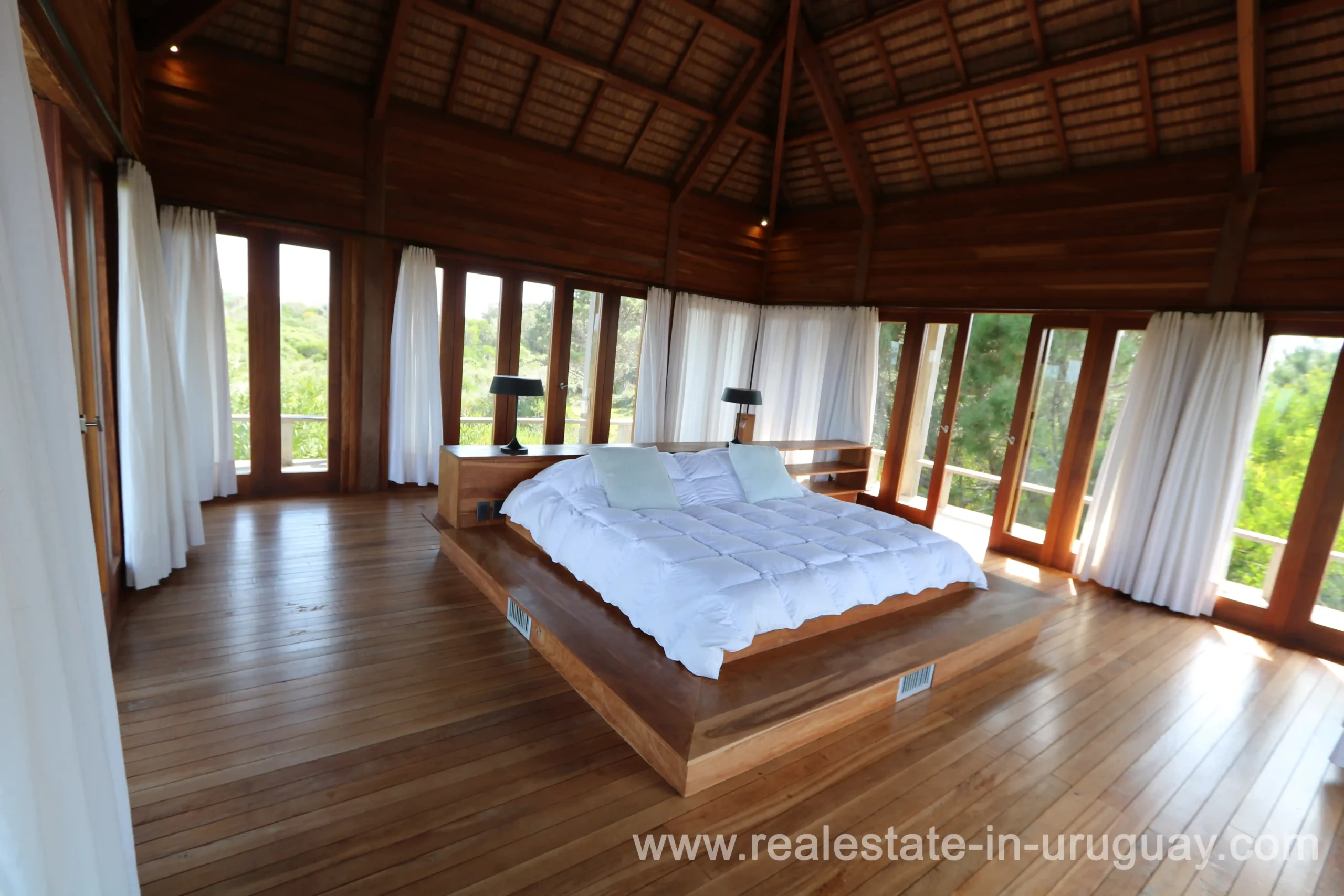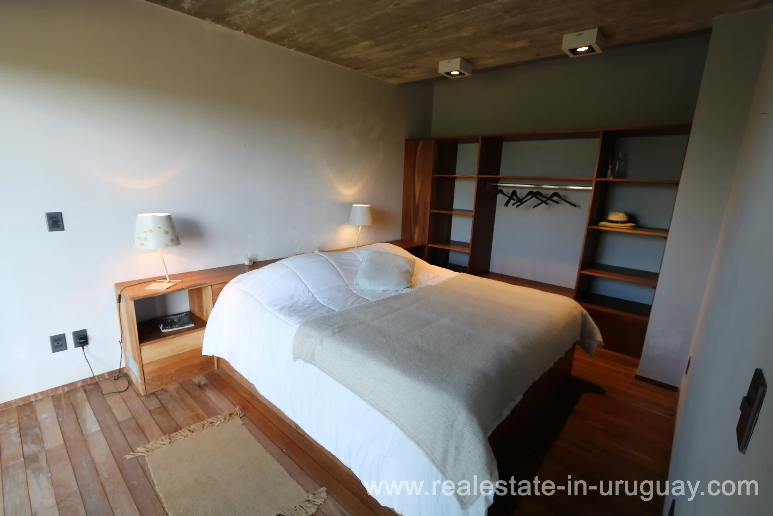 Just reduced 25%! This beach home in San Antonio by La Pedrera was designed by the renowned architect Farina and is located within the resort of San Antonio between La Pedrera and Cabo Polonio at the highest point on the beach affording open sea views. With a thatched roof, the house is almost entirely built out of Lapacho wood with Mahagony doors and windows and has grounds containing indigenous plants making it extremely practical and economic to maintain. The property built in 2013 has two units which are connected via a wide and covered Lapacho wood roof walkway. The upper part of the main unit comprises the social areas: professional kitchen, bar, living room, formal dining room, daily dining room and further more a private living room. It is an open area measuring 180m2 surrounded by large windows which open out in the summer to the front deck and the swimming pool at the rear to extend the rooms and indoor areas and providing a sensation of comfort. The lower part of the main unit consists of four spacious bedrooms all with ocean views, three bathrooms, machinery room and laundry area. The smaller unit features the master suite with a large dressing room and stunning views. Completing the property, there is a 130m2 swimming pool with sun deck which adjoins part of the living room, gas central heating system, own water well, open parking area for several vehicles, plus a corral for horses. This is a unique property for its elegant yet simple style, its quality of construction, its location directly at the beach and for its comfort on the ocean’s edge. Special home to spend incredible vacations in a quiet peaceful area surrounded by sand dunes and the ocean. La Pedrera town offers many restaurants and shops and is not far away.