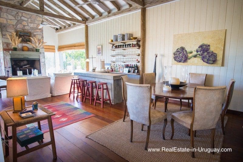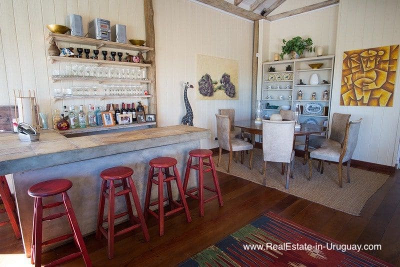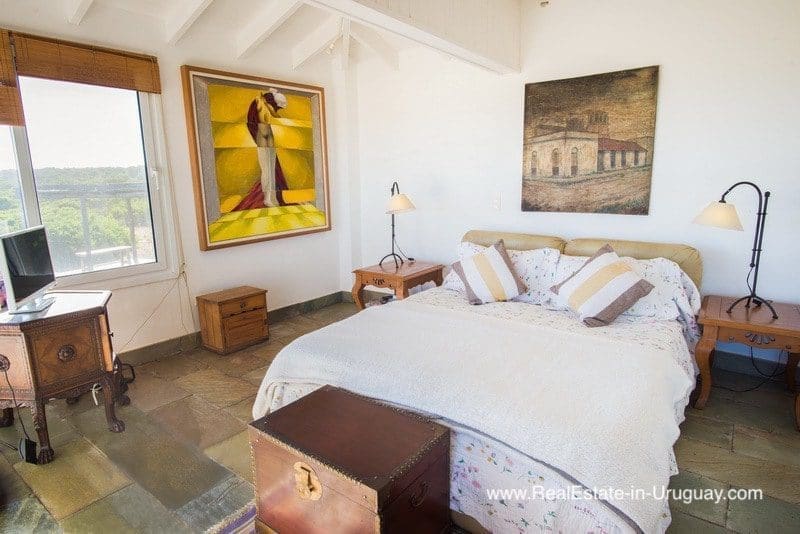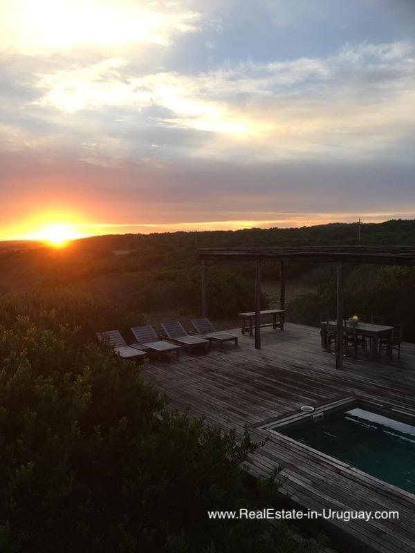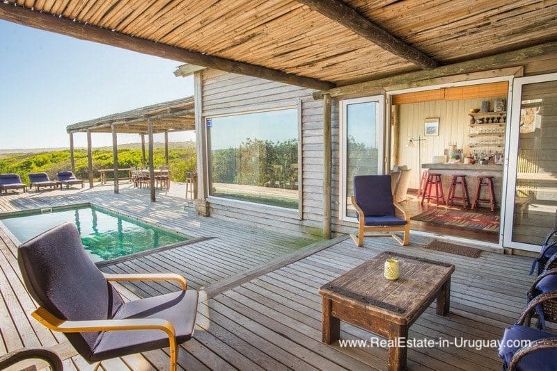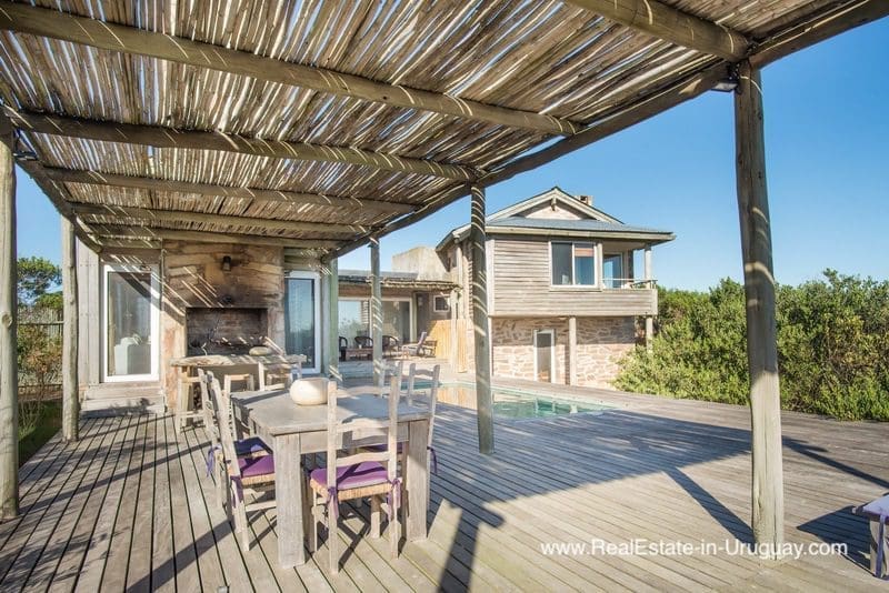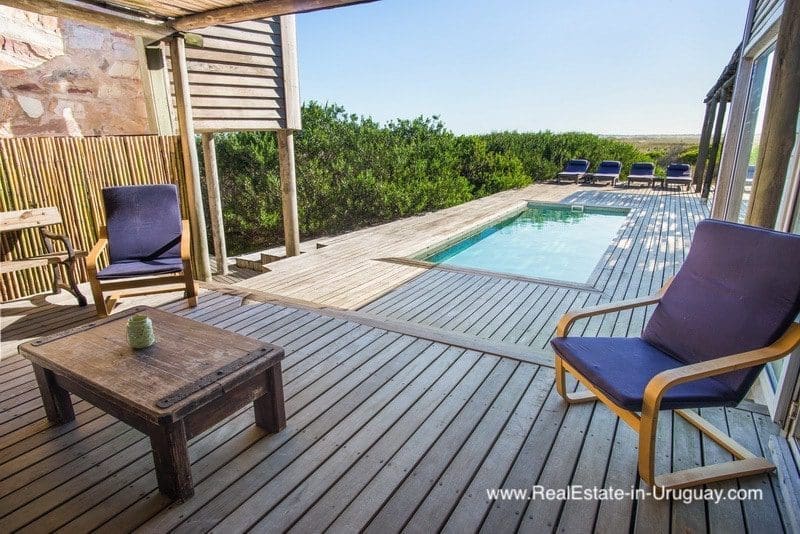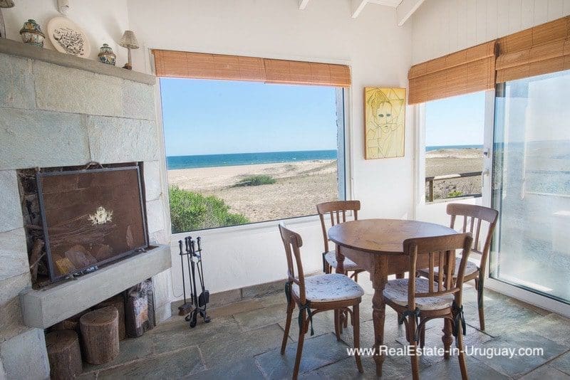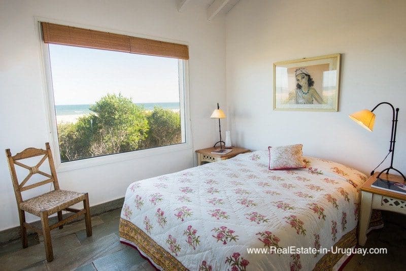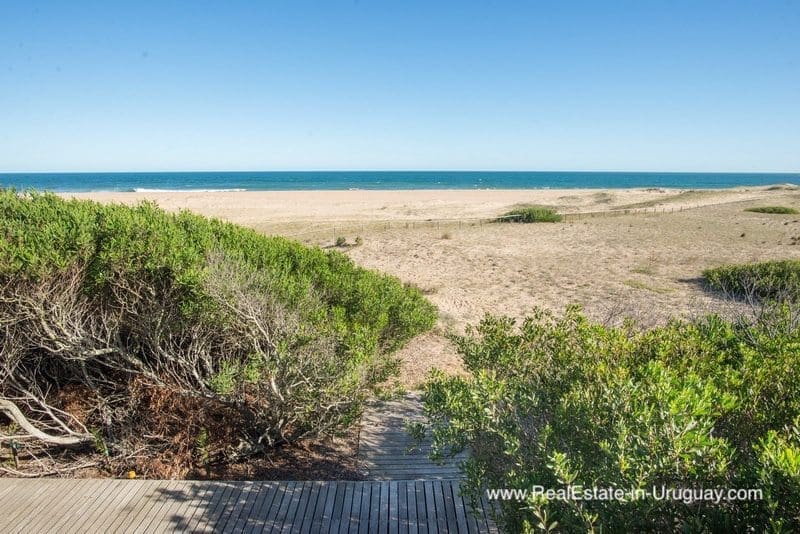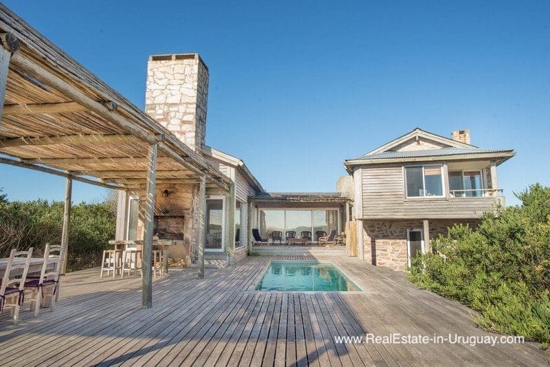 This beachfront home in privileged area in Jose Ignacio is located on a plot measuring almost half a hectare on the beach with direct access to the sea. It is surrounded by acacia trees and other vegetation, which provides maximum privacy. The three-story house comprises a kitchen, guest bathroom, cozy living/dining room with fireplace and access to an exterior deck with an outdoor living area, sun deck, swimming pool and BBQ/grill with covered dining room, all located on the middle floor. The ground floor consists of two bedroom suites with independent access and front terrace. The upper floor comprises two bedrooms with en suite bathrooms affording stunning ocean views, one with a fireplace and small terrace for enjoying sunrise and sunset views. There is also a double staff bedroom with bathroom, utility room, room or storage area, plus another storage area to keep the outdoor furniture. A unique place due to its location, plot, views and proximity to the charismatic fishing town of José Ignacio and Garzón Lagoon in Uruguay. A very peaceful and exclusive area.