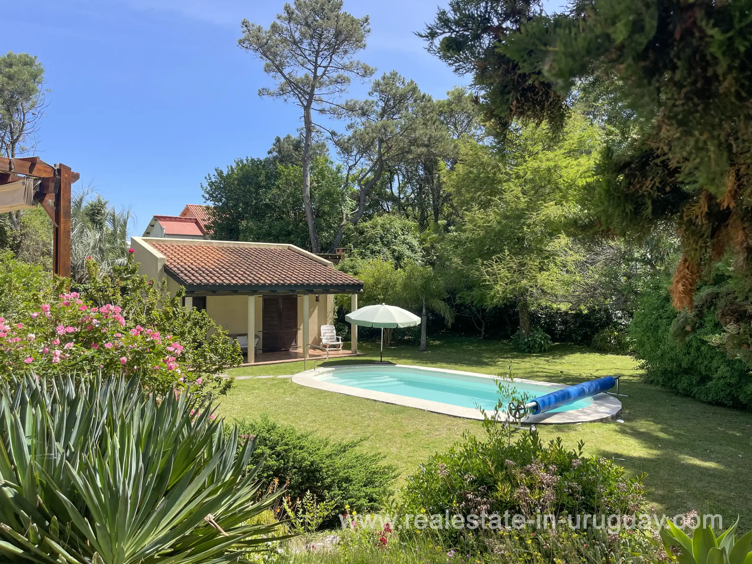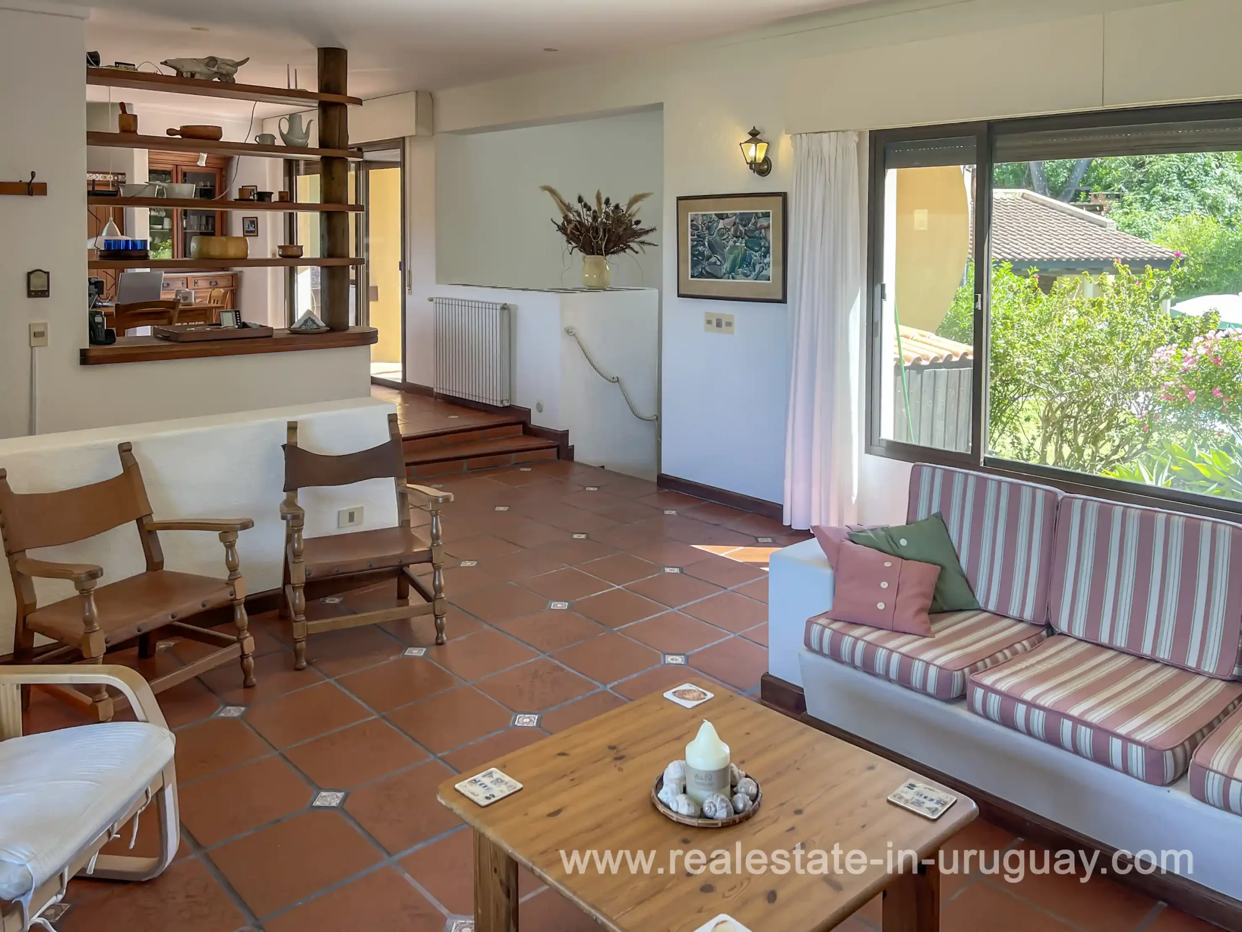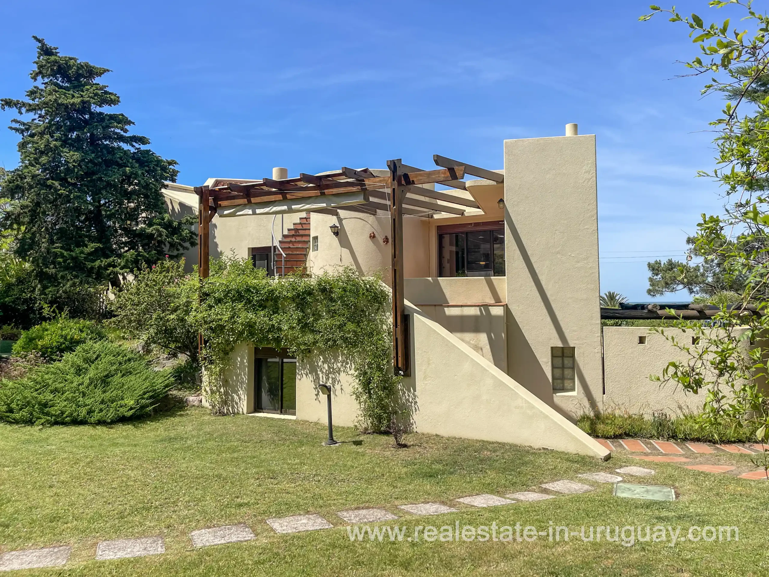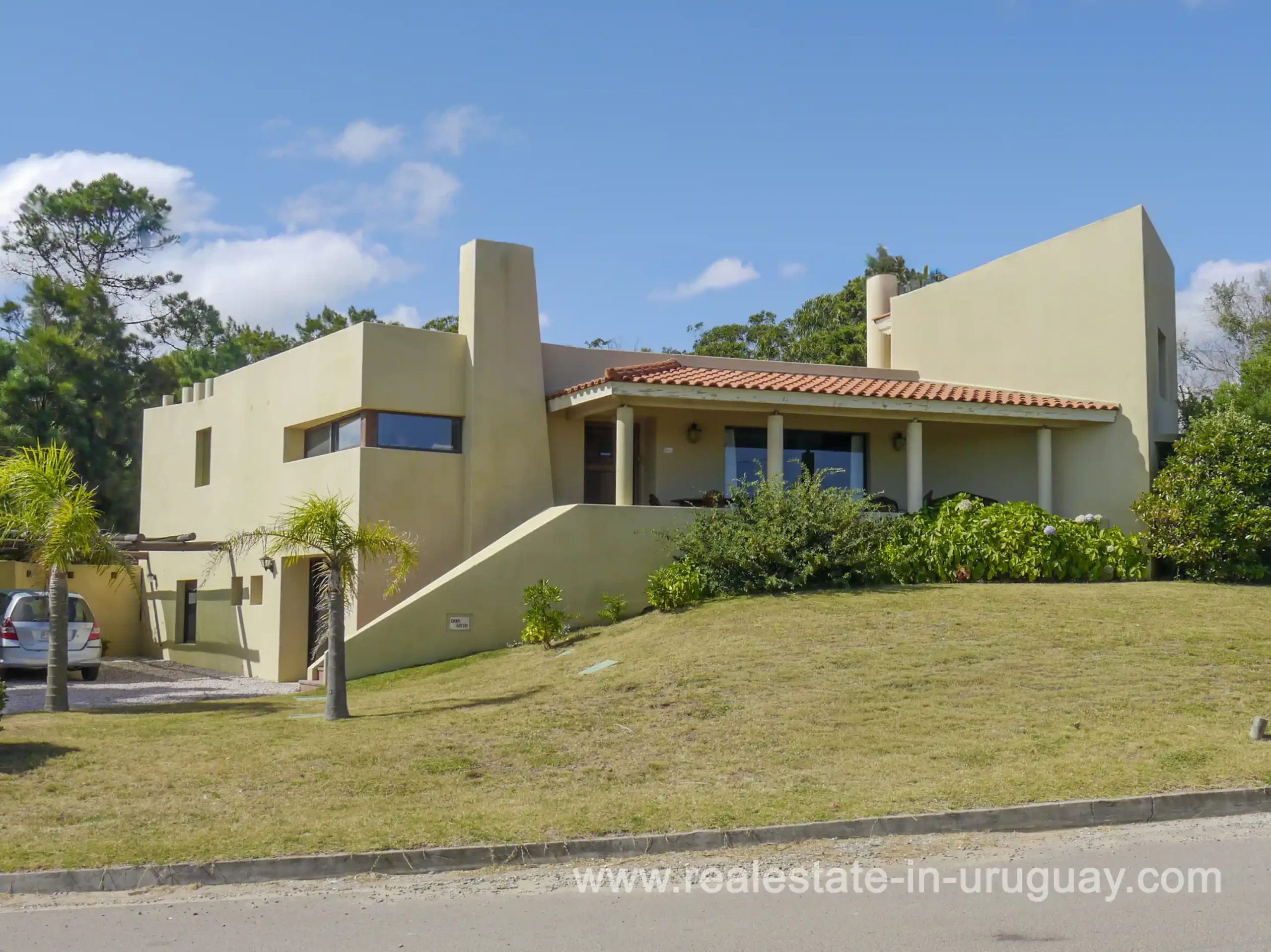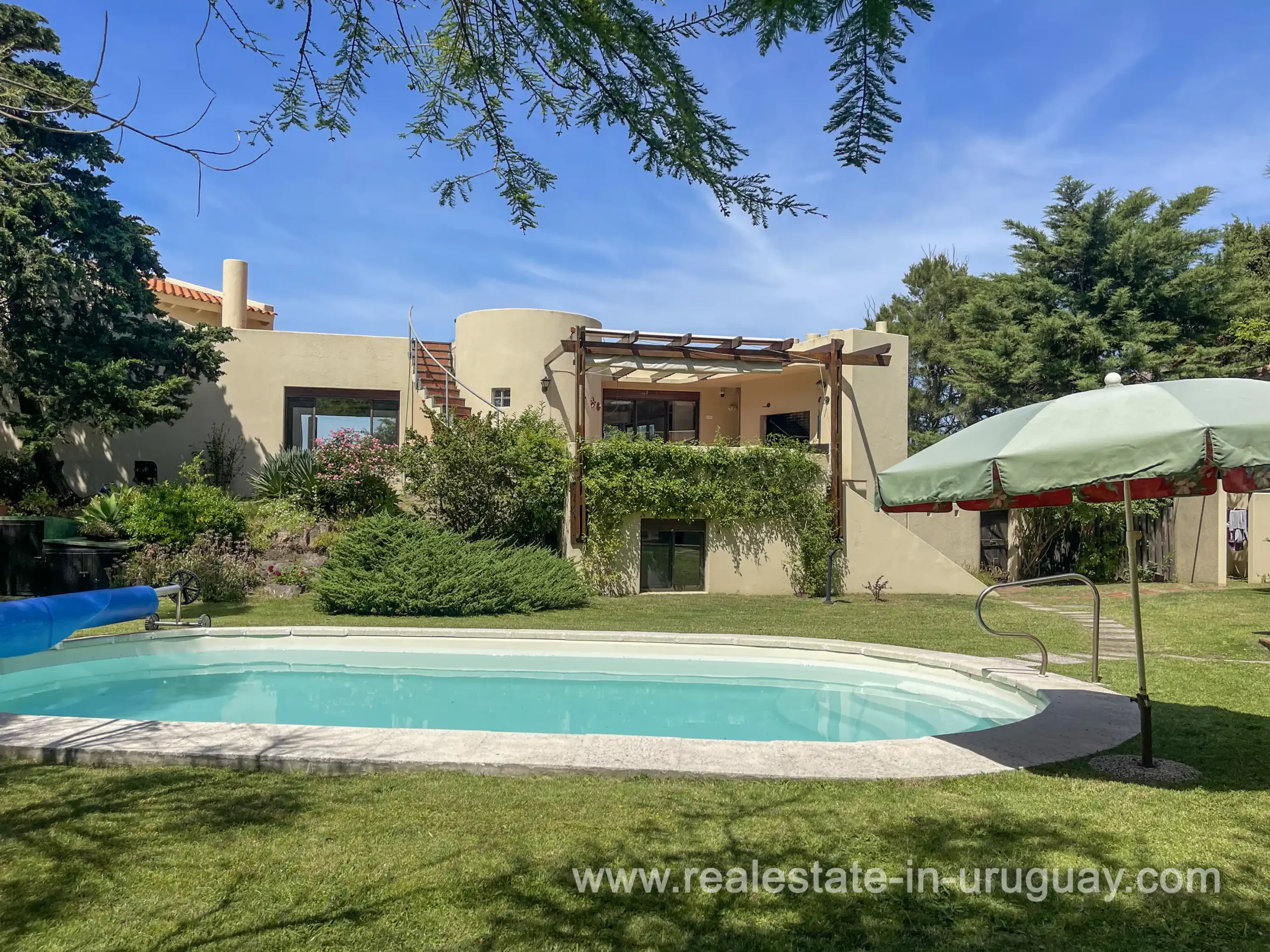 Built in 1999, this architecturally distinctive home is situated on the front row of Playa Verde, offering unobstructed sea views. The multi-level rooms are arranged on several asymmetrically staggered tiers. The central living and dining area features an open-concept American-style kitchen and a terrace with an outdoor grill. Two staircases lead from here, one descending to the garden and the other ascending to a spacious rooftop terrace. The master bedroom, with an en-suite bathroom and an open gallery-ideal for a small home office with a view of Río de la Plata-is on the same level. On the lower floor are two additional bedrooms, a bathroom, and the garage. Next to the solar-heated pool, the garden includes a small guest house with a bedroom and bathroom. Constructed with high-quality materials, the home offers excellent insulation, including double walls and double-glazed windows. In cooler months, an open fireplace in the living area and an oil-fired central heating system ensure comfort. The house has been well-maintained, is in excellent, defect-free condition, and is ready for immediate move-in. Playa Verde is a tranquil, family-friendly seaside resort near the historic town of Piriápolis. Situated slightly above sea level and surrounded by greenery, it features diverse coastal elements, including coves, rocky outcrops, and sandy beaches, which give the area its charm. Playa Verde and nearby communities provide good shopping, restaurants, and beach cafés, while Piriápolis, just minutes away by car, offers complete infrastructure, including schools, medical facilities, and a weekly market. Layout: Living/dining area with American-style kitchen, three bedrooms (including one en suite with an open gallery), and two bathrooms.
