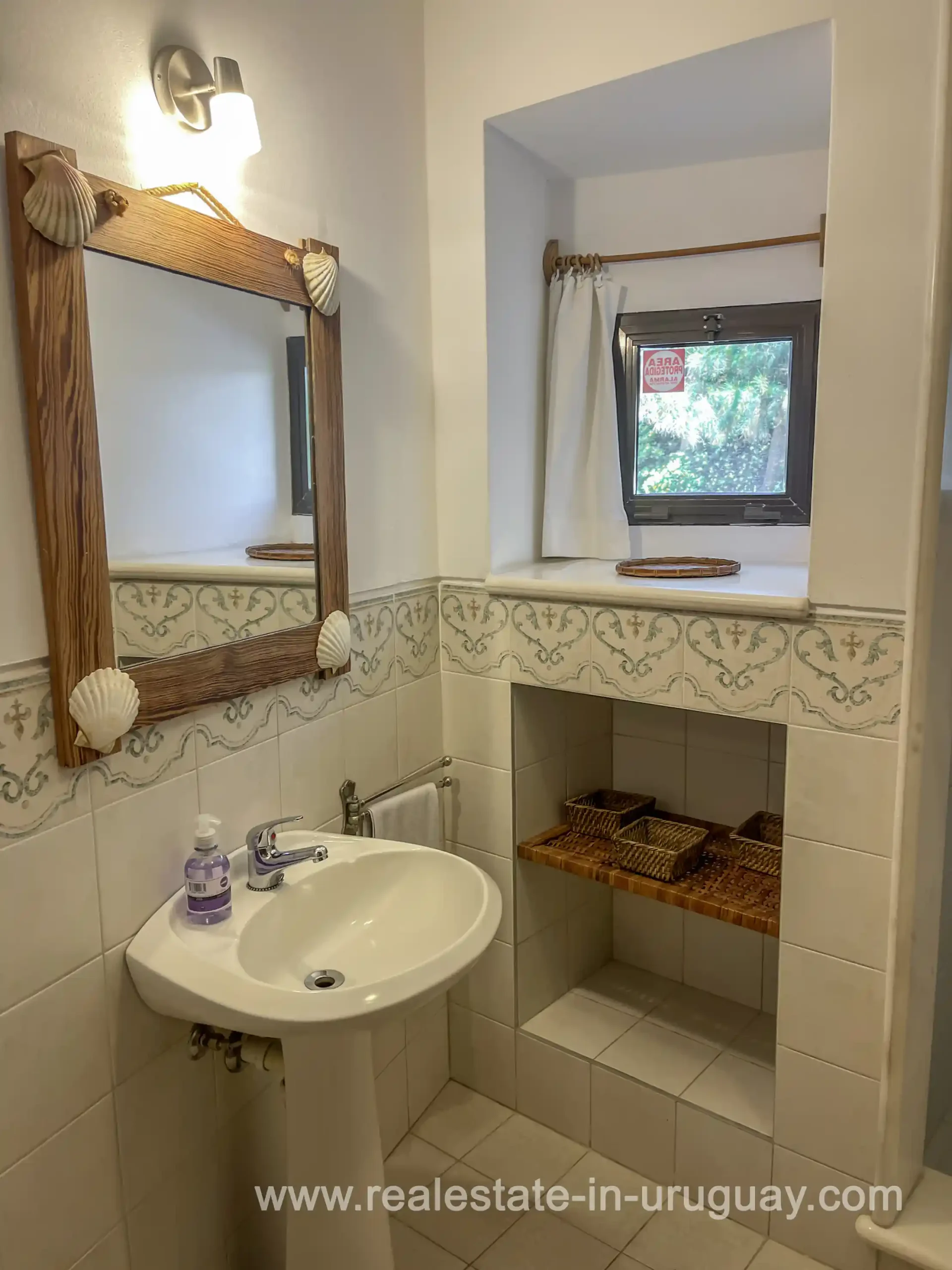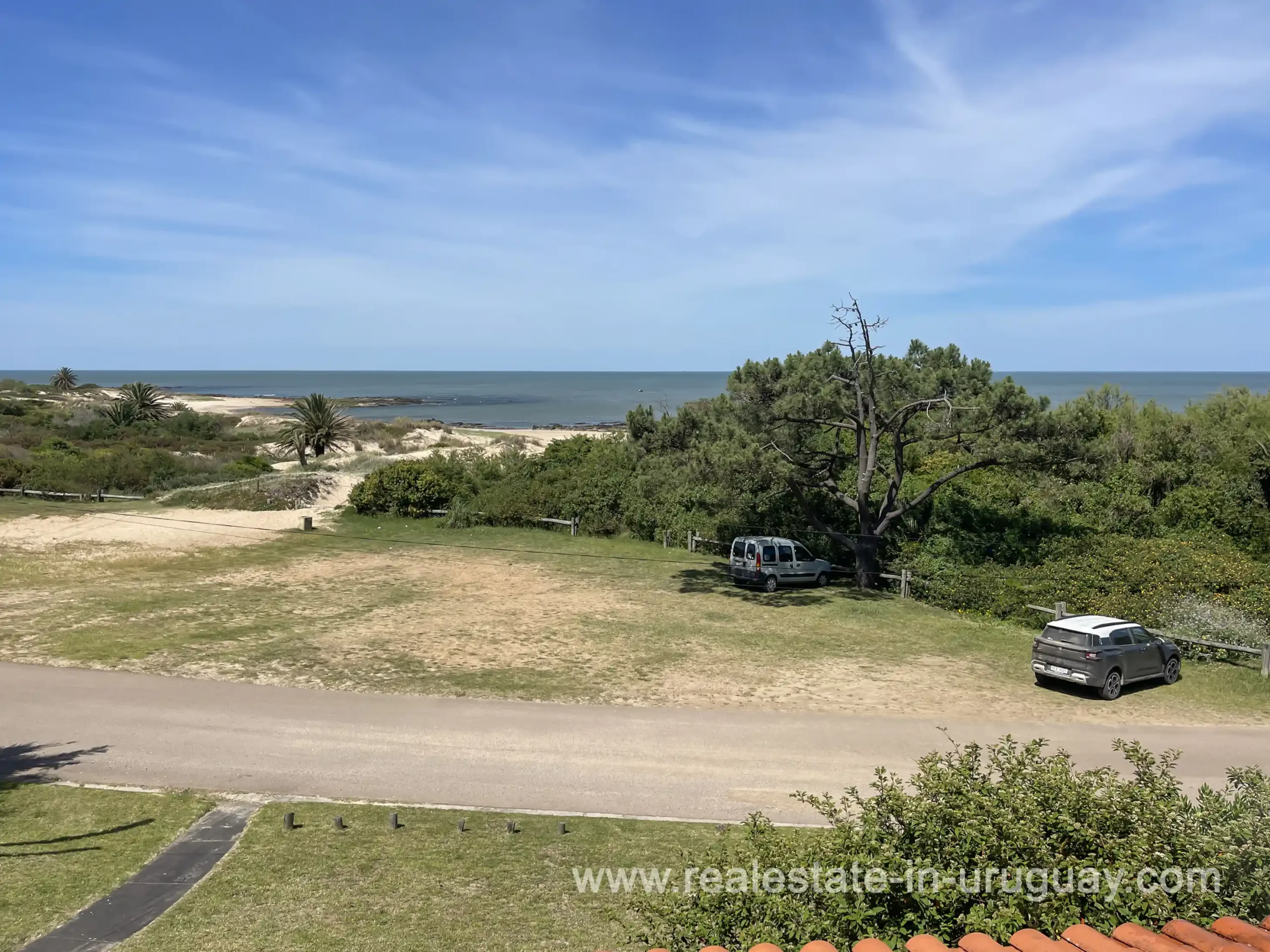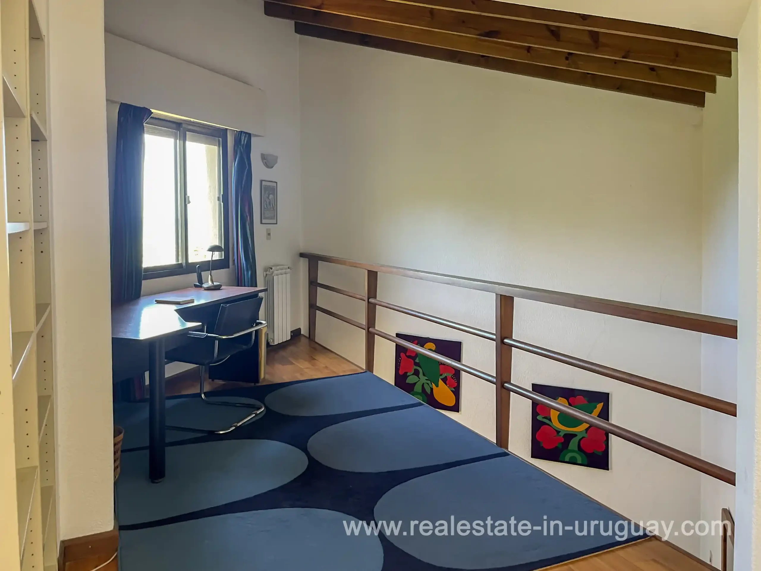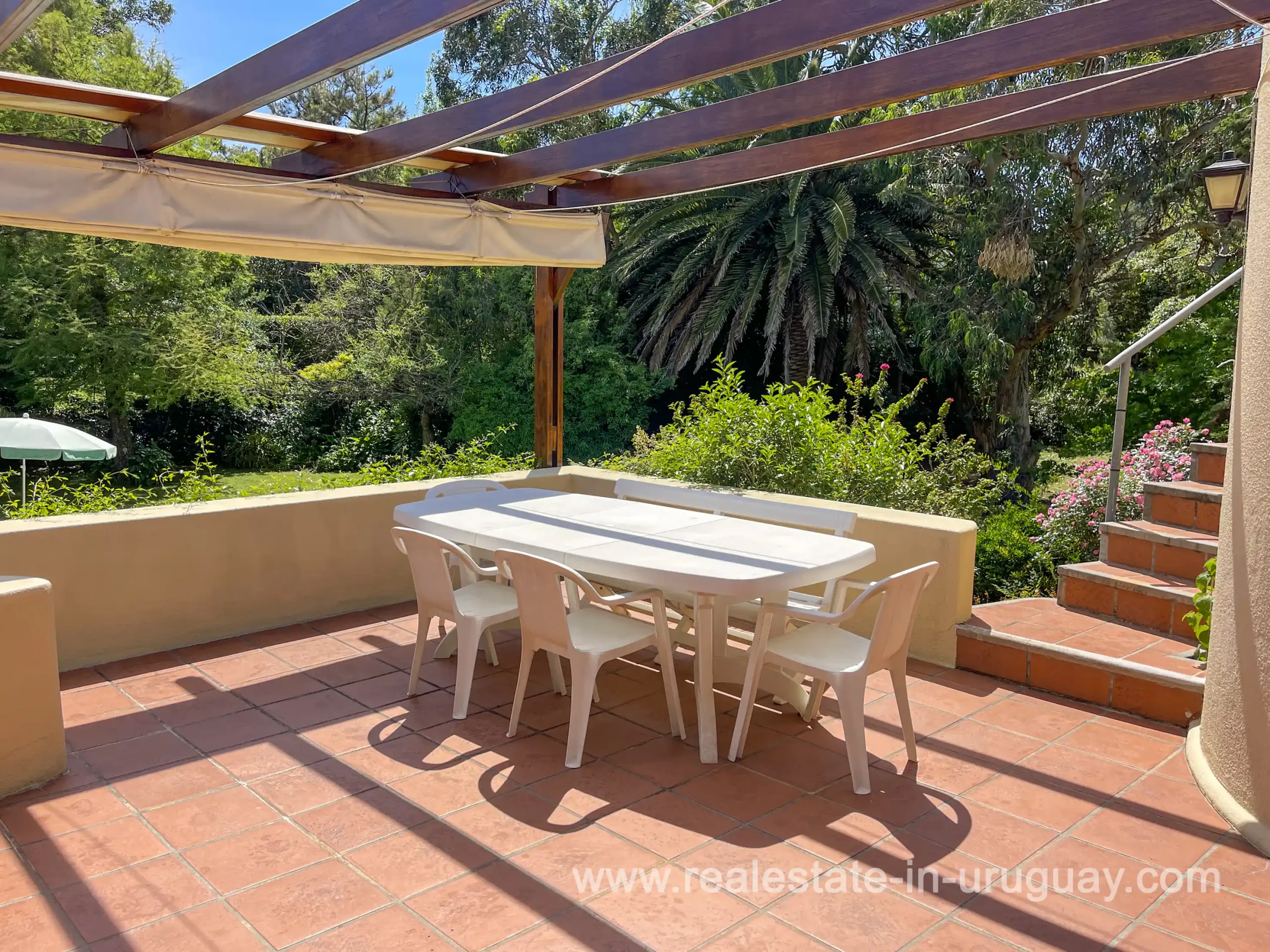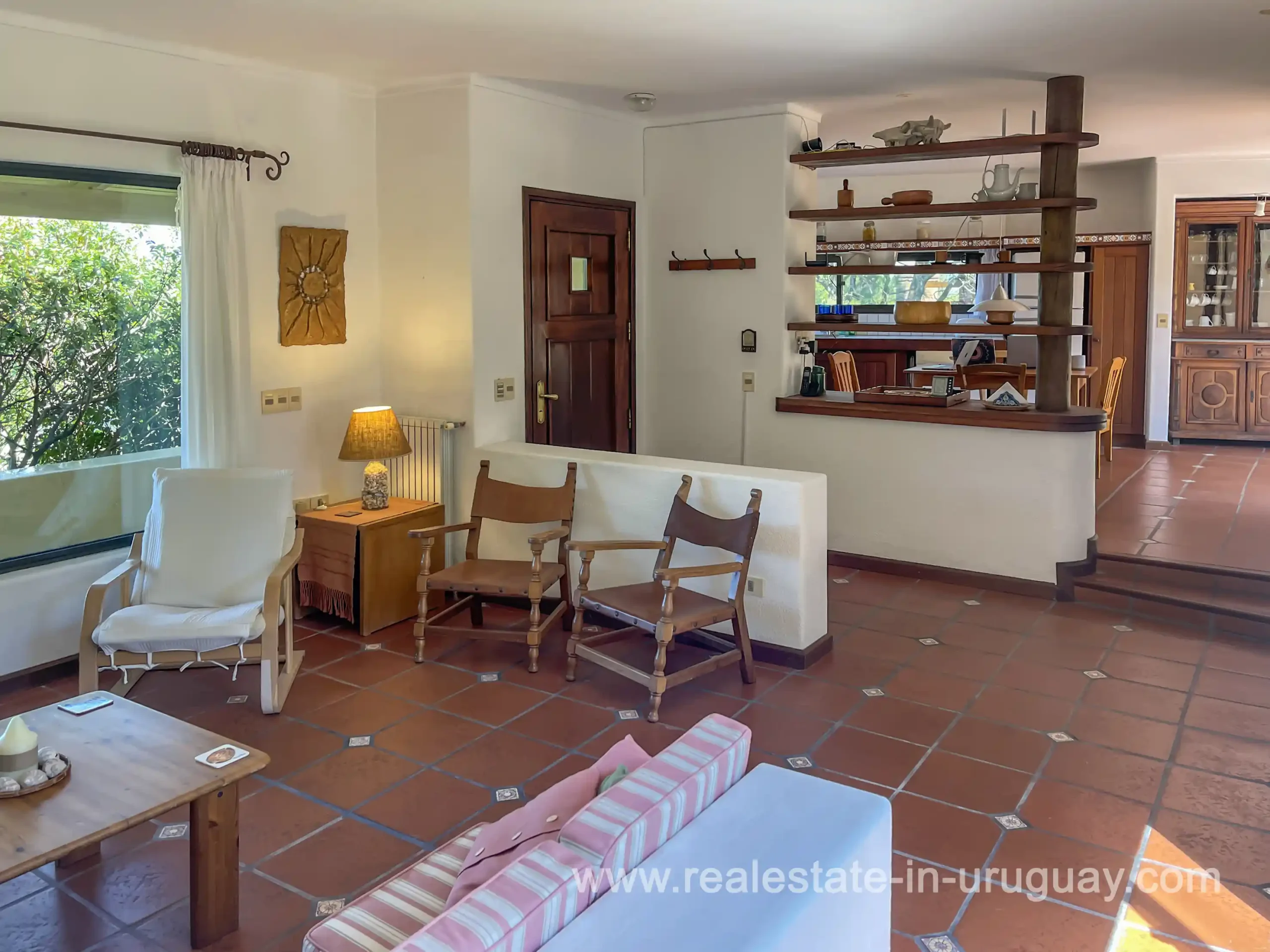 Built in 1999, this architecturally distinctive home is situated on the front row of Playa Verde, offering unobstructed sea views. The multi-level rooms are arranged on several asymmetrically staggered tiers. The central living and dining area features an open-concept American-style kitchen and a terrace with an outdoor grill. Two staircases lead from here, one descending to the garden and the other ascending to a spacious rooftop terrace. The master bedroom, with an en-suite bathroom and an open gallery-ideal for a small home office with a view of Río de la Plata-is on the same level. On the lower floor are two additional bedrooms, a bathroom, and the garage. Next to the solar-heated pool, the garden includes a small guest house with a bedroom and bathroom. Constructed with high-quality materials, the home offers excellent insulation, including double walls and double-glazed windows. In cooler months, an open fireplace in the living area and an oil-fired central heating system ensure comfort. The house has been well-maintained, is in excellent, defect-free condition, and is ready for immediate move-in. Playa Verde is a tranquil, family-friendly seaside resort near the historic town of Piriápolis. Situated slightly above sea level and surrounded by greenery, it features diverse coastal elements, including coves, rocky outcrops, and sandy beaches, which give the area its charm. Playa Verde and nearby communities provide good shopping, restaurants, and beach cafés, while Piriápolis, just minutes away by car, offers complete infrastructure, including schools, medical facilities, and a weekly market. Layout: Living/dining area with American-style kitchen, three bedrooms (including one en suite with an open gallery), and two bathrooms.