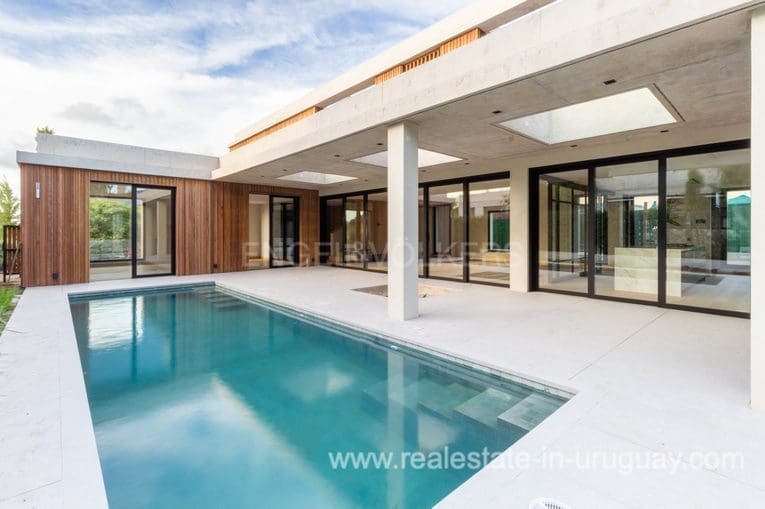 Fantastic brand-new house in the San Nicolas gated community. Characterized by its high-quality construction and quality finishes, this elegant two-story designer house comprises 414 m2, built on a plot of 989 m2. On the ground floor, there is a reception, a large living/dining room, a spacious sitting room with a high-performance wood-burning stove, and access to a deck with a barbecue. There is a semi-integrated equipped kitchen with top-quality finishes, a laundry room, and staff quarters. Upstairs, there are four bedrooms: a master suite with a walk-in wardrobe, a second suite, and two bedrooms sharing a bathroom. There is underfloor heating via a heat pump, Samsung ducted air conditioning, and gas central hot water. There is a landscaped garden and a large swimming pool, an exterior bathroom for a swimming pool, a garage for two cars, and additional parking space. There is also a 24-hour alarm and security system in the San Nicolás neighborhood of Montevideo.