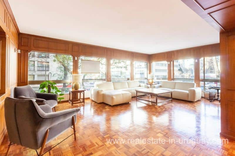 A large 270m2 classic apartment in Pocitos Montevideo with a privileged location steps away from La Rambla, is available for sale. It includes a bright and spacious living room with access to a 5m2 terrace, a renovated kitchen, and a laundry terrace. It also consists of four bedrooms, plus a full staff bedroom (fifth bedroom option). The master bedroom has an en suite bathroom and dressing room. There are three bathrooms in total. There is underfloor central heating and additional air conditioning. There is also a single garage and a 24-hour doorman.