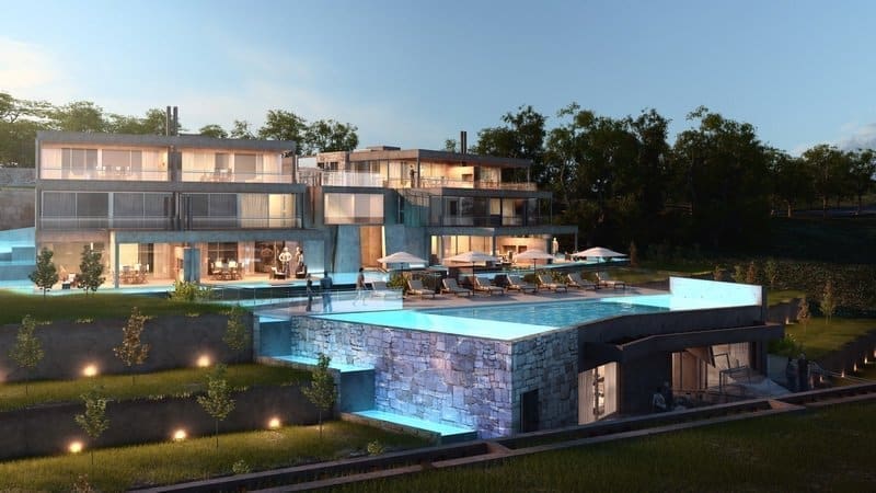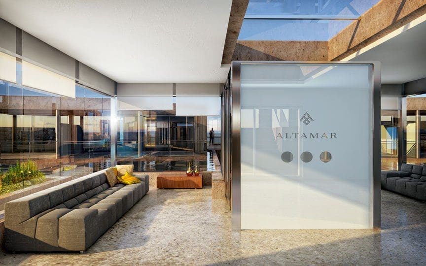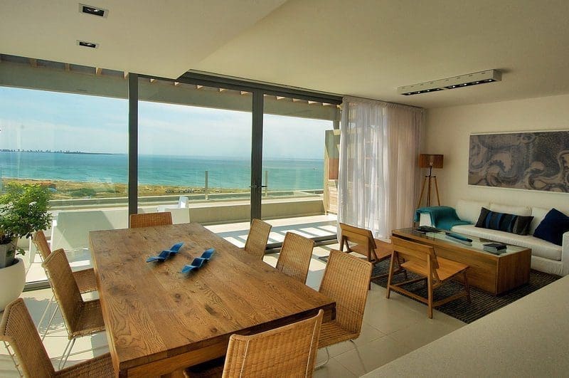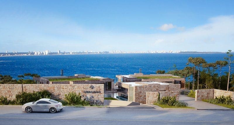 In one of the most breathtaking spots in Uruguay on the Punta del Este coast is Punta Ballena, where a mountain range meets the sea creating unique and unmatched views. There, on a 10,000m2 plot situated on the highest point of Punta Ballena and with open views to Punta del Este and the beach, is the development ALTAMAR. This condo Altamar in Punta Ballena is located in a complex comprising four buildings on 3 – 4 levels with garages and underground storage. The complex enjoys direct access from the Scenic Route and consists of a total of 32 apartments: 12 duplex and 20 single storey – all with sea views, large terraces and own BBQ/grills. When entering the complex at the top end, the complex is seen to blend in with the rocky and rugged surroundings with landscaped areas and lit water features rising and falling across its surface.