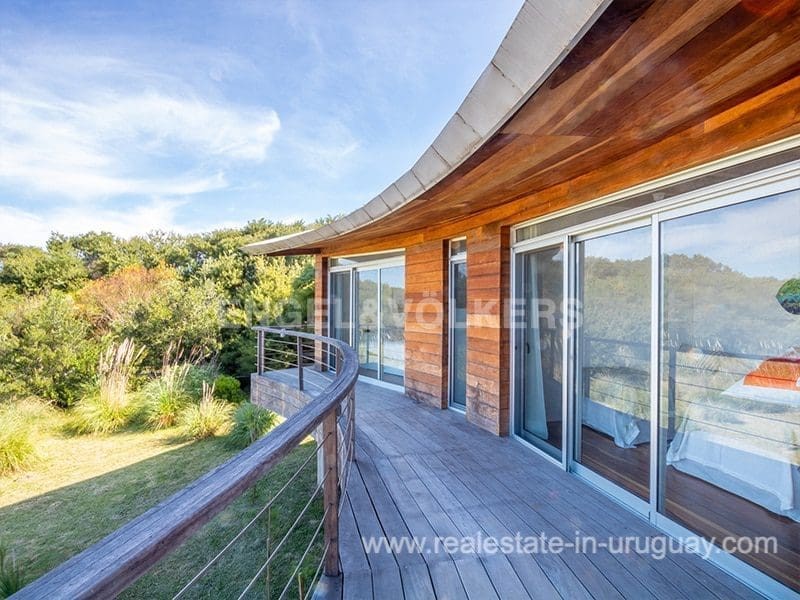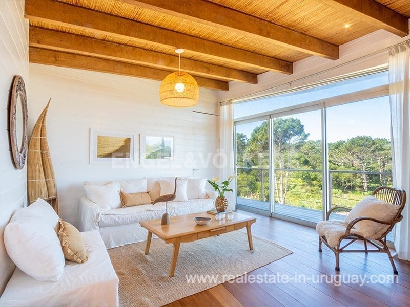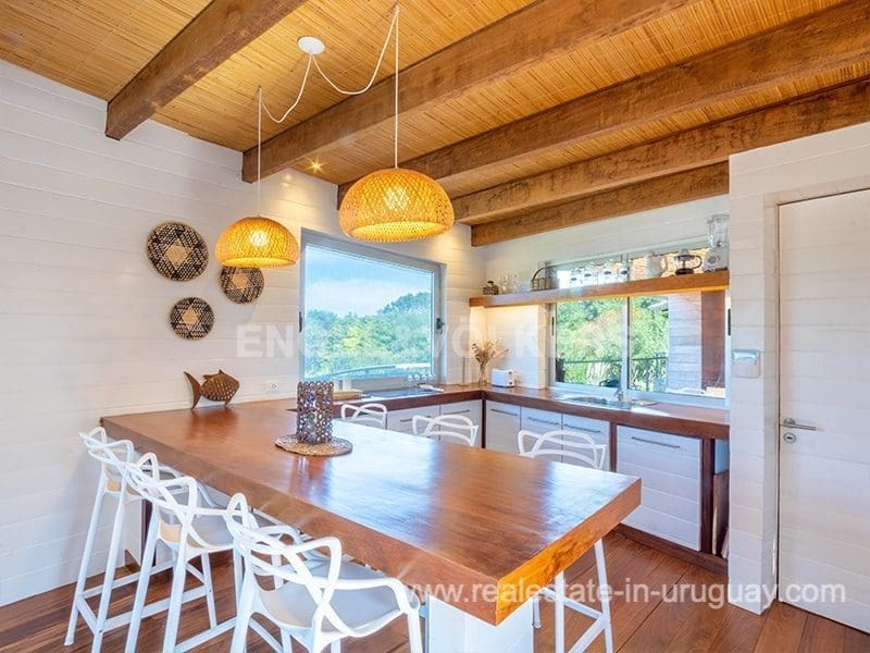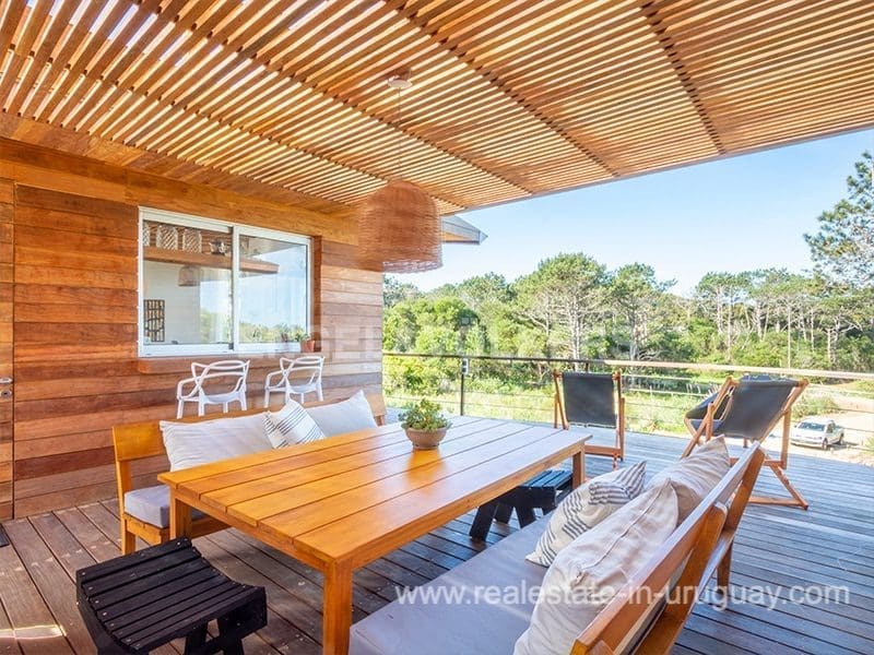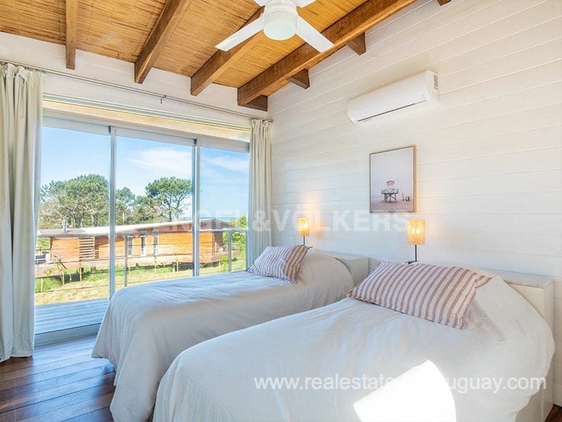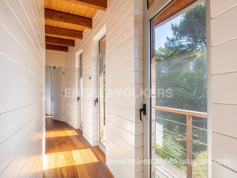 This Designer House in La Pedrera, designed by the architect Matias Sambarino, was built in 2022 and is located in a gated complex with direct access to the beach of El Barco. Built with top quality materials with exterior lapacho wood finishes and hydro lacquered solid wooden decks and interior flooring. It comprises three bedrooms, one en suite, and two bathrooms, a large covered deck with a barbecue, and a laundry room with a covered outdoor hot water shower. Due to the elevation of the terrain and its location, the house enjoys sea views. The complex has a caretaker all year round, garden maintenance, and a tennis court. A property to enjoy surfing and maritime sports in general in peaceful wooded and beach surroundings just a few blocks from the center of La Pedrera in Rocha. The house comes fully equipped (TV, washing clothes, dishwasher, etc.).