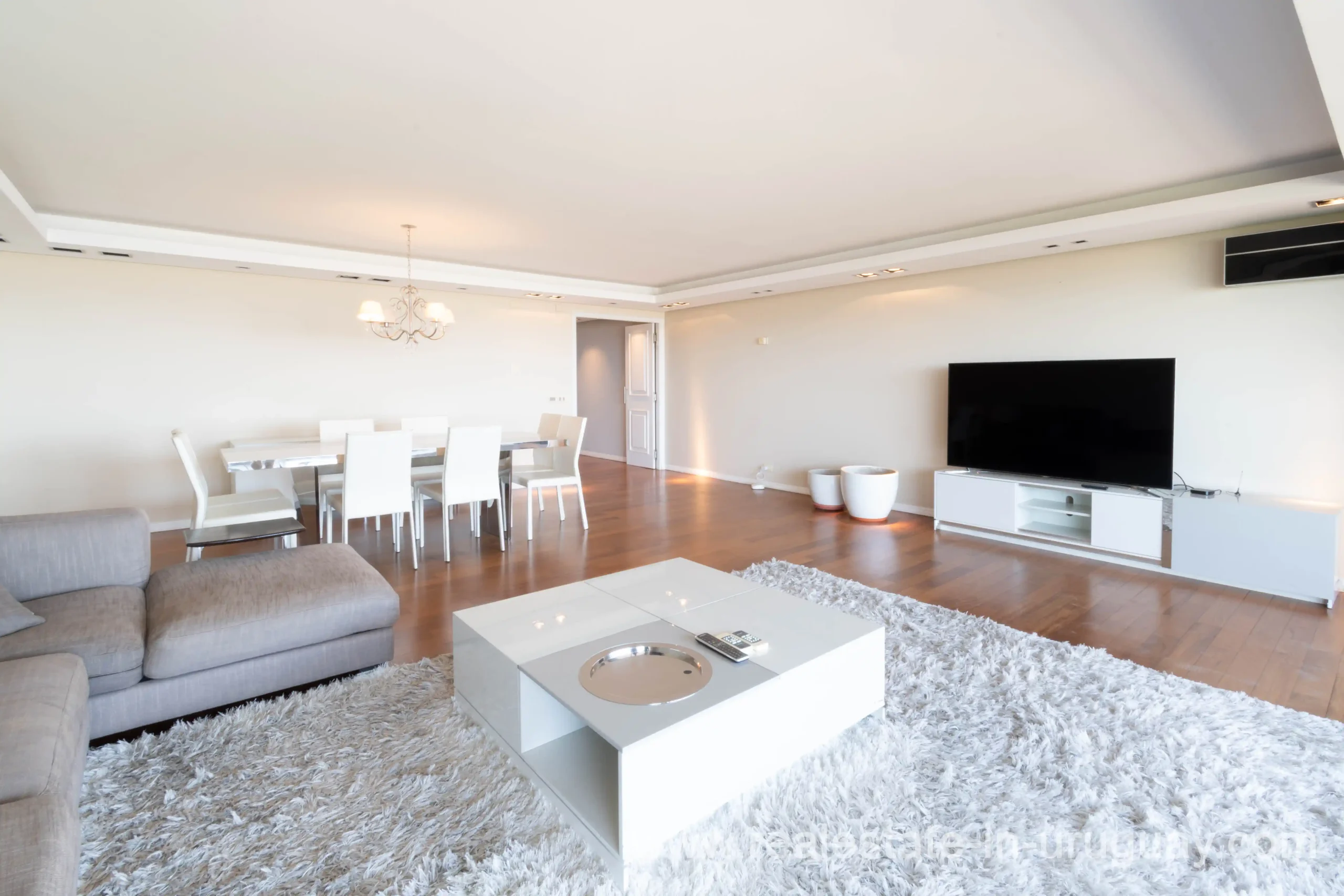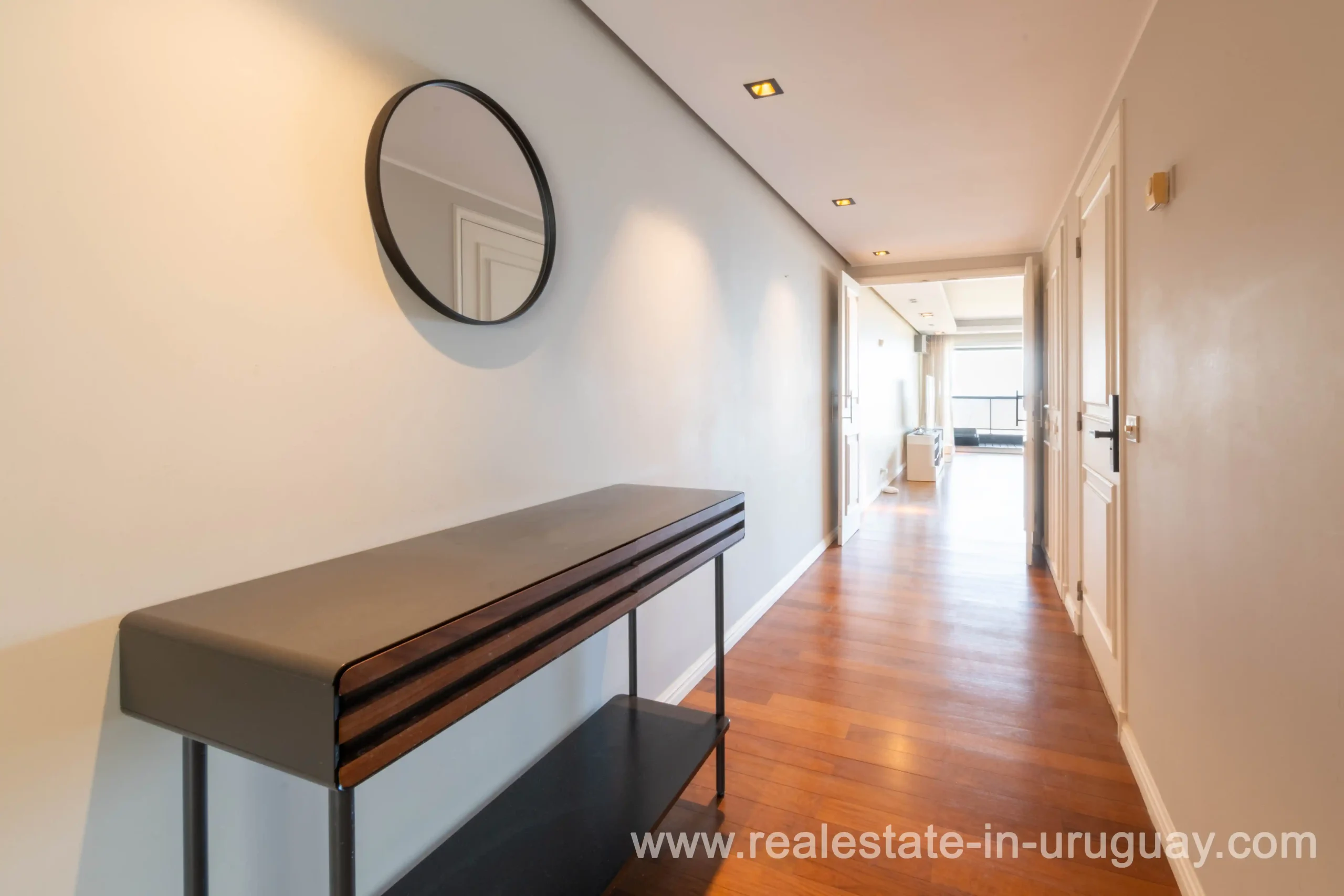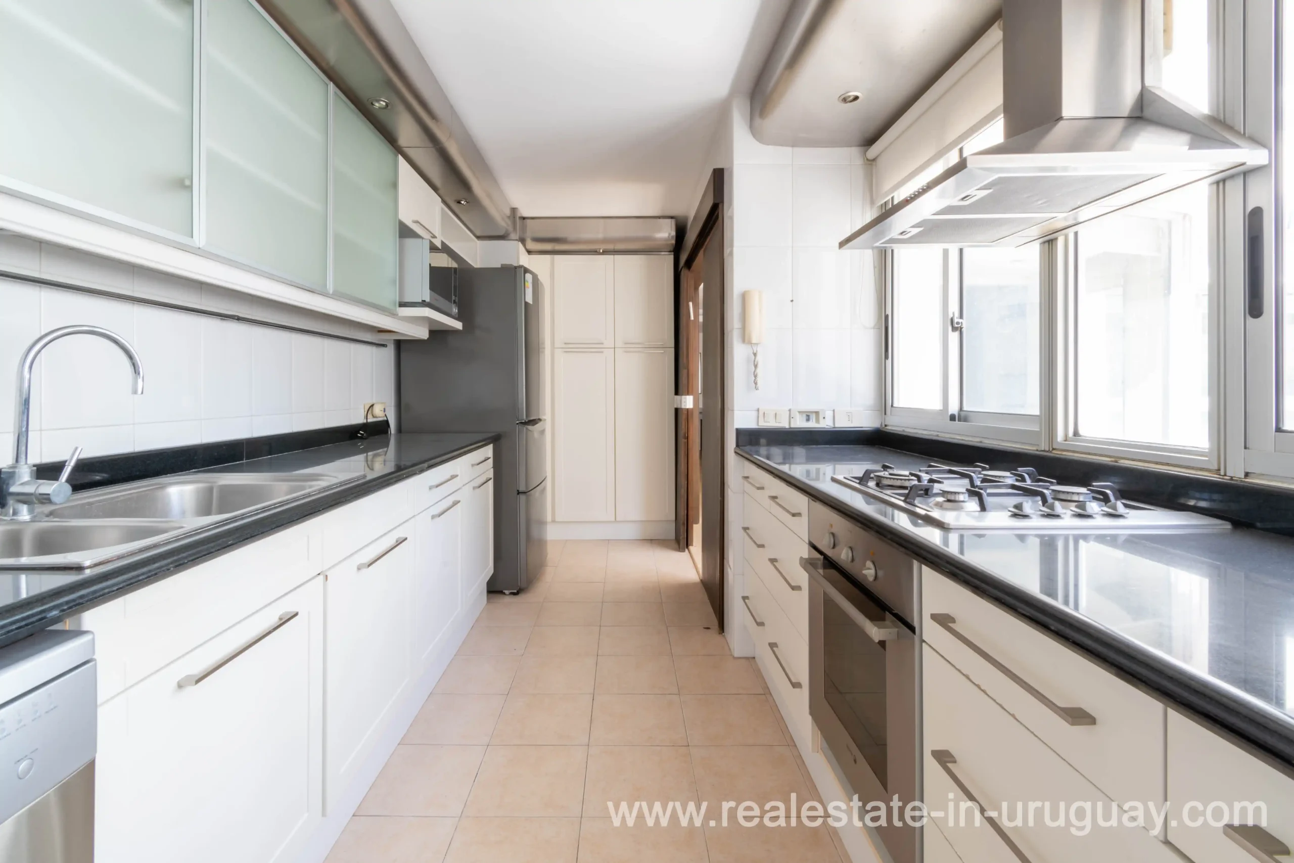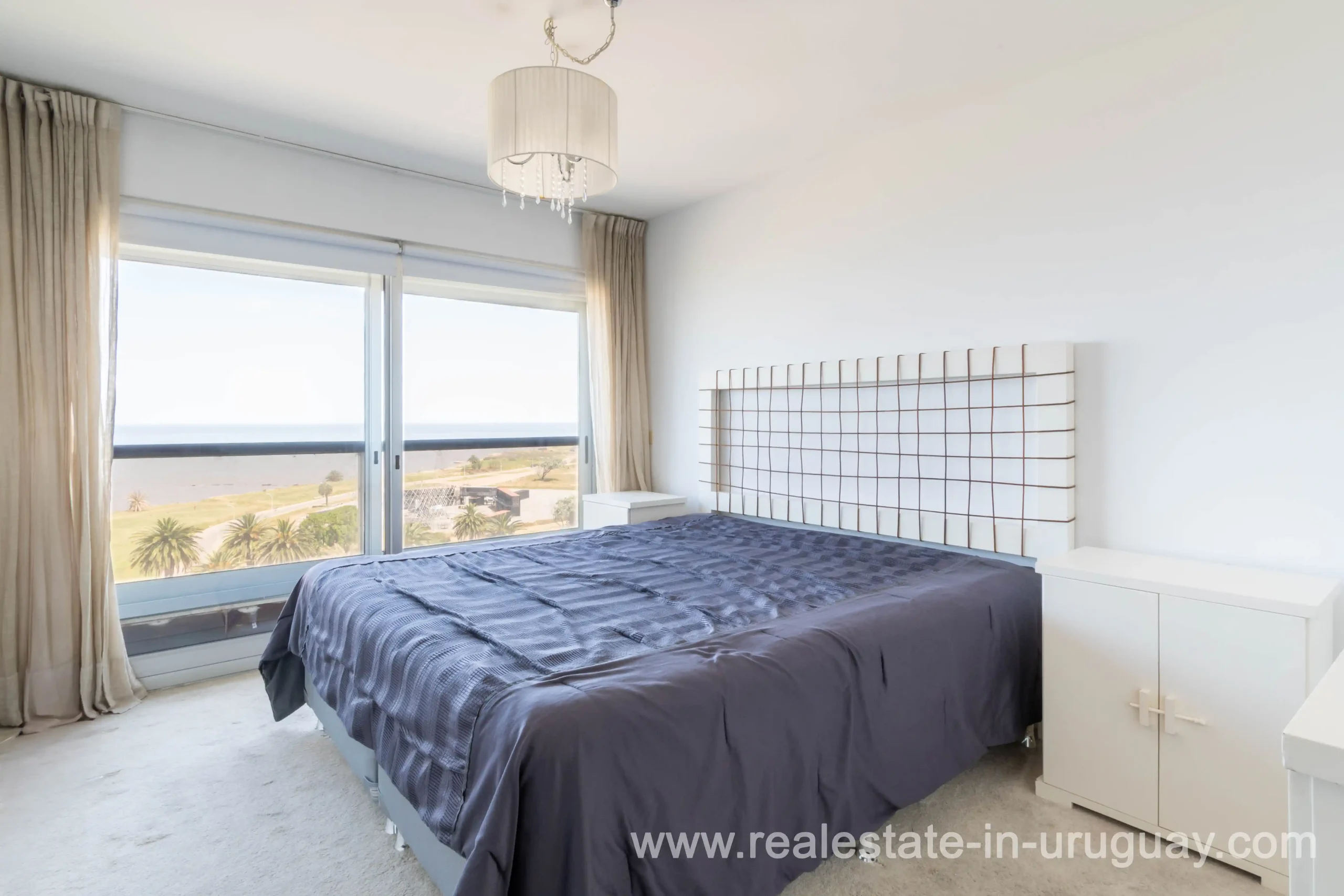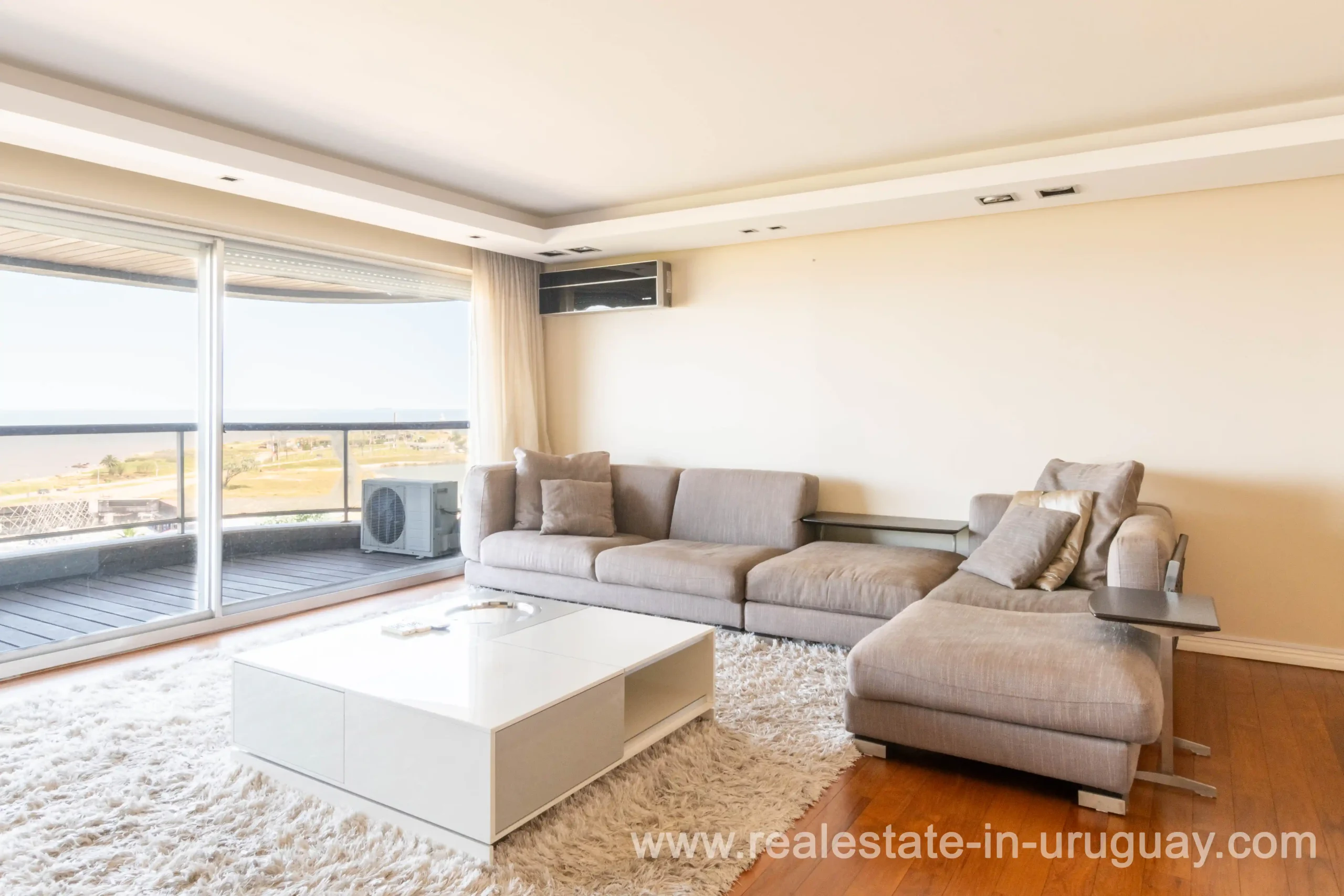 This spacious and bright apartment is situated on the front line facing the Río de la Plata, in a privileged area of the Punta Carretas neighborhood. It is a solid construction covering 205 m2, offering excellent views and a well-thought-out layout. You enter through a reception hall that leads to a stunning living-dining room with floor-to-ceiling windows, lapacho floors, and access to a large terrace balcony that blends seamlessly with the surroundings. From the entrance hall, there’s also access to a spacious private living area that connects to the fully renovated kitchen, which is filled with natural light. The private section includes three bedrooms, the main one being en suite with a view of the front. The other two bedrooms are spacious, with ample closet space and plenty of daylight. The finishes and materials throughout the unit are of high quality, with porcelain tile predominant in the other rooms. The apartment includes a fully equipped kitchen, a laundry terrace, and two conveniently located garage spaces. The high-end building features 24-hour security, a gym, and a comfortable multipurpose room with a barbecue area.