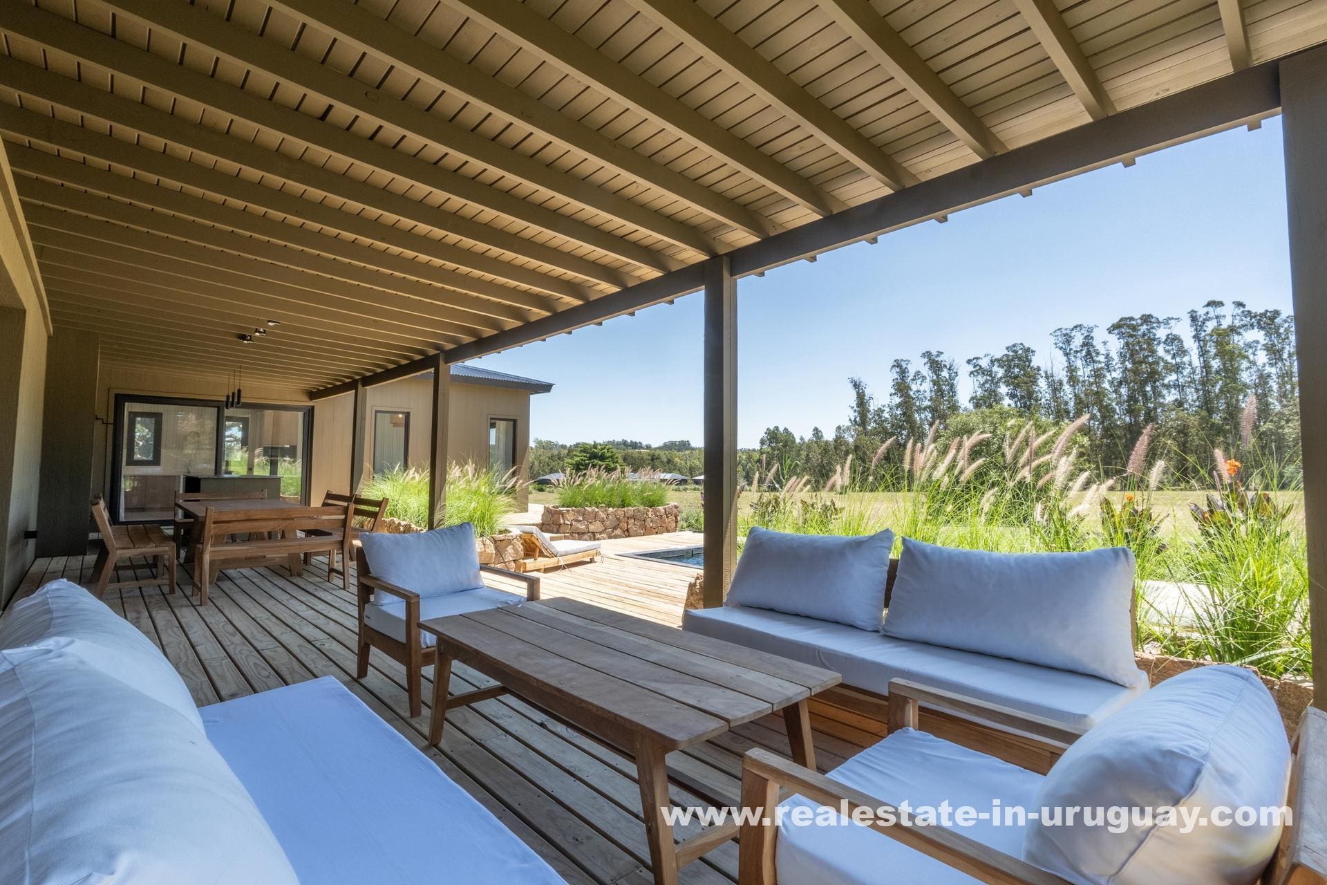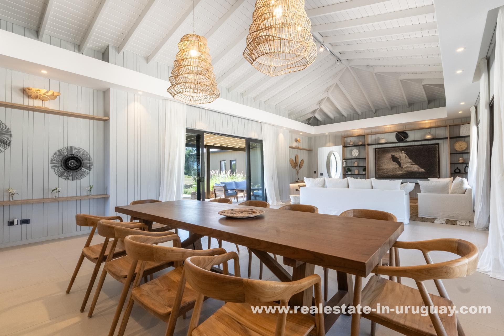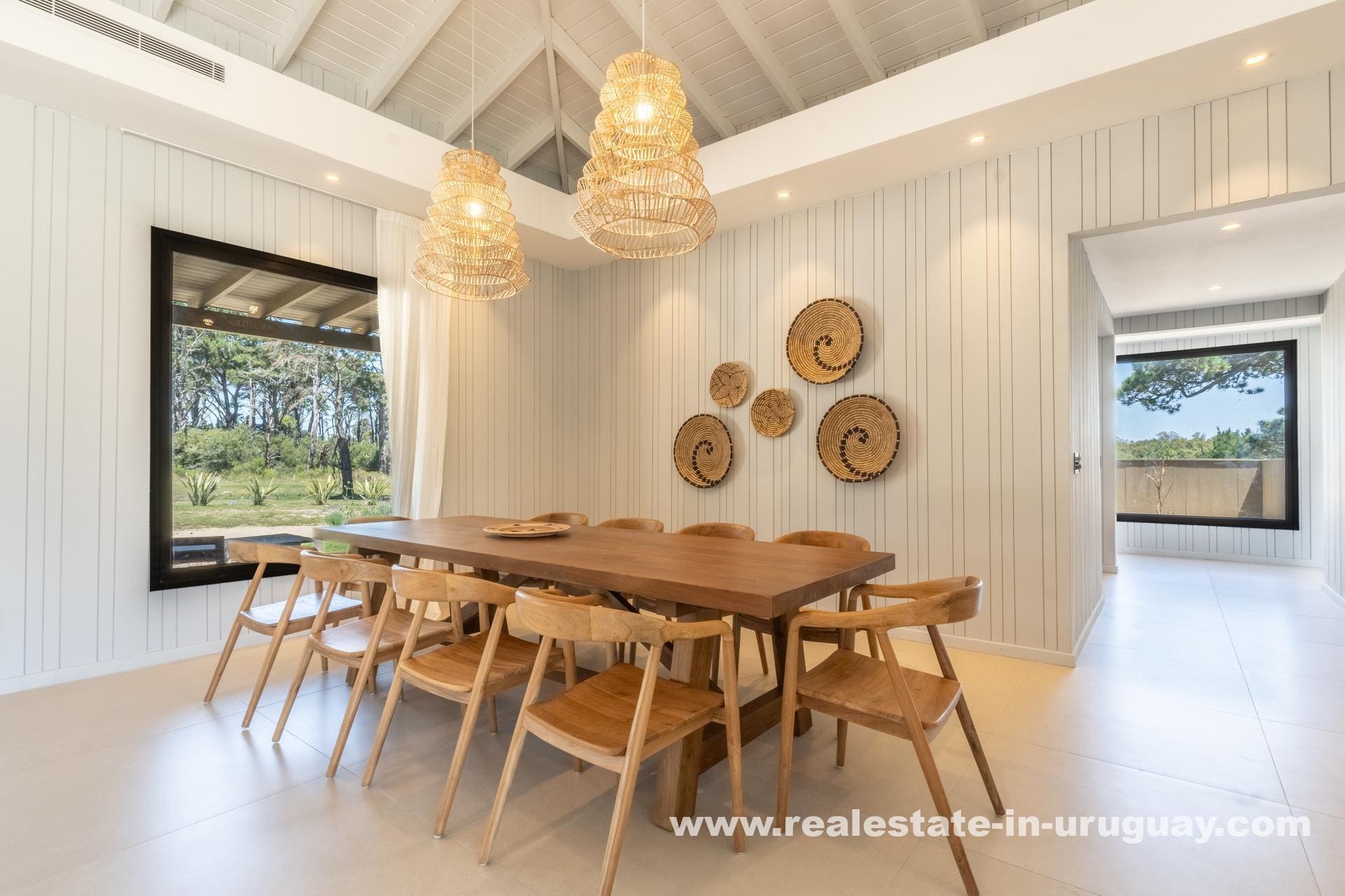 The house boasts a spacious, light-filled living-dining area, perfect for entertaining or unwinding with family, with large windows offering panoramic views of the lush landscape. The sleek, modern kitchen is integrated into the living space, designed to cater to everyday culinary experiences.