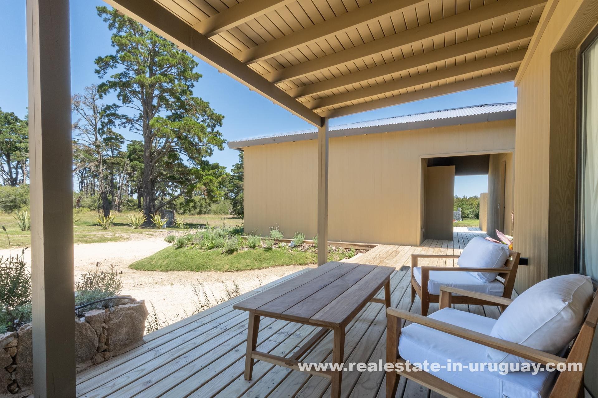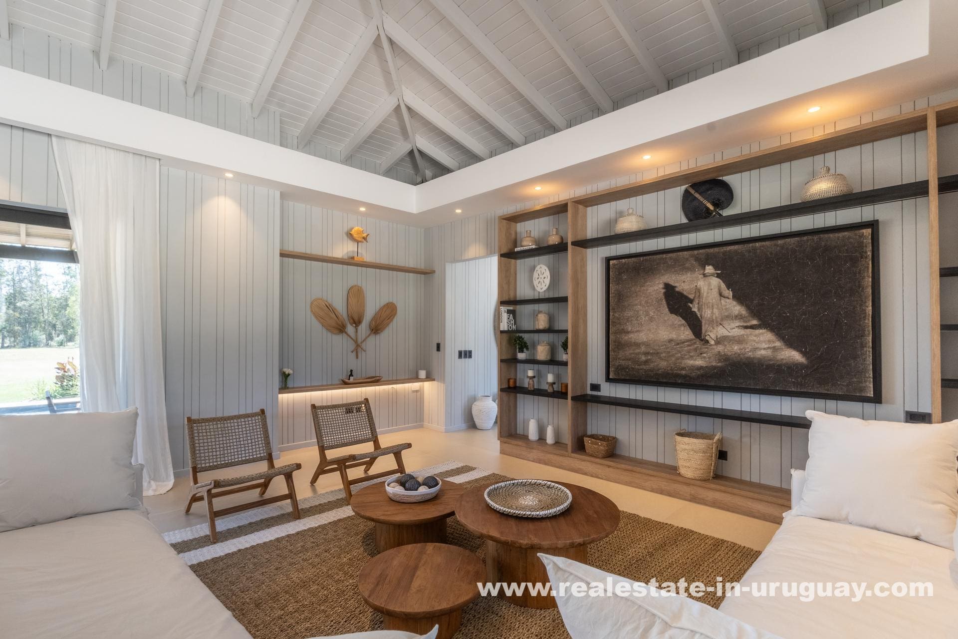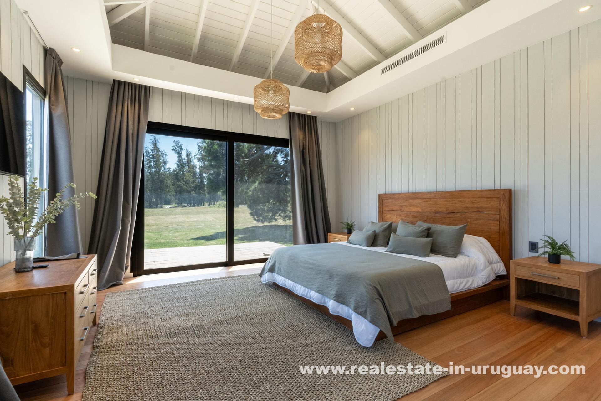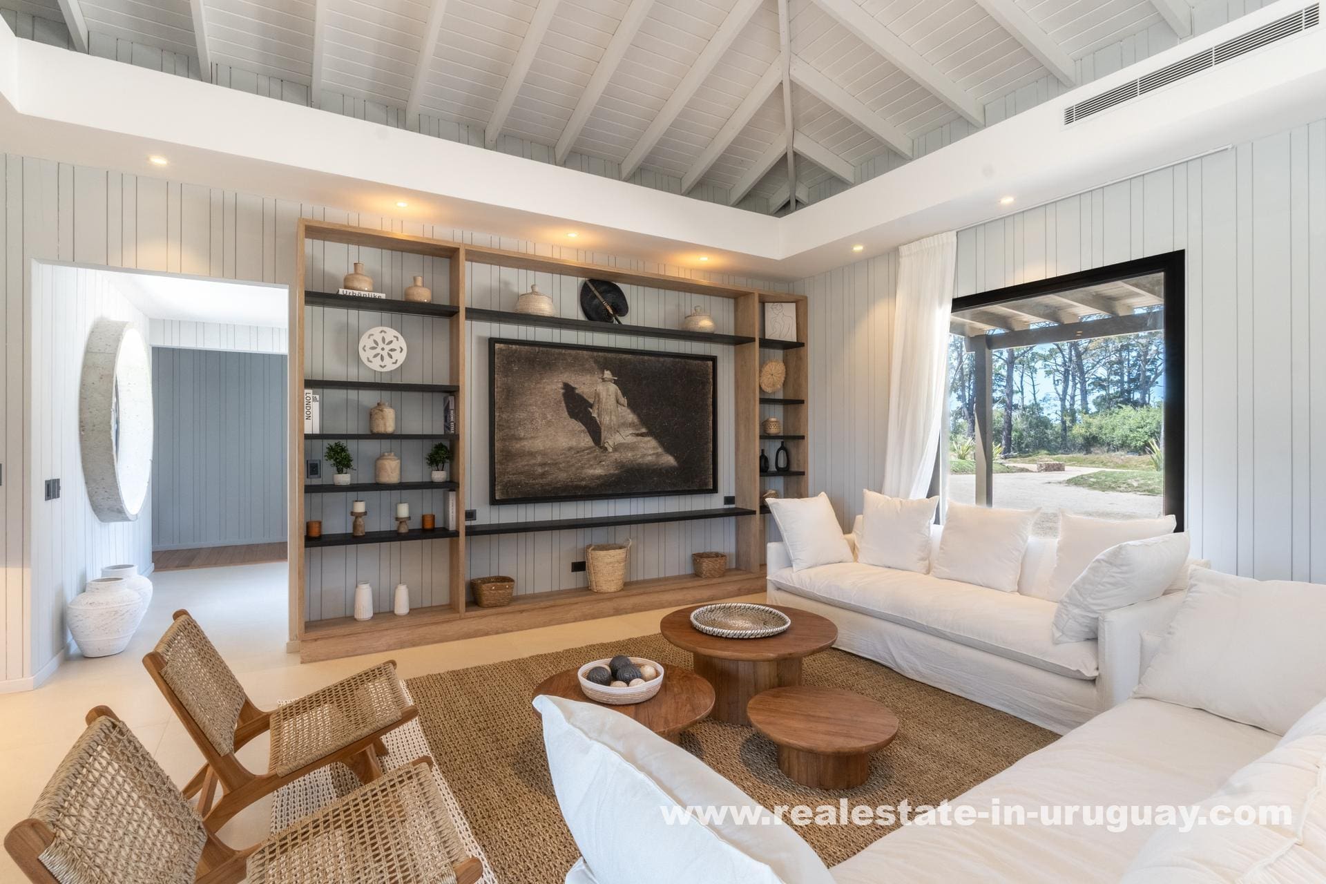 The house boasts a spacious, light-filled living-dining area, perfect for entertaining or unwinding with family, with large windows offering panoramic views of the lush landscape. The sleek, modern kitchen is integrated into the living space, designed to cater to everyday culinary experiences.