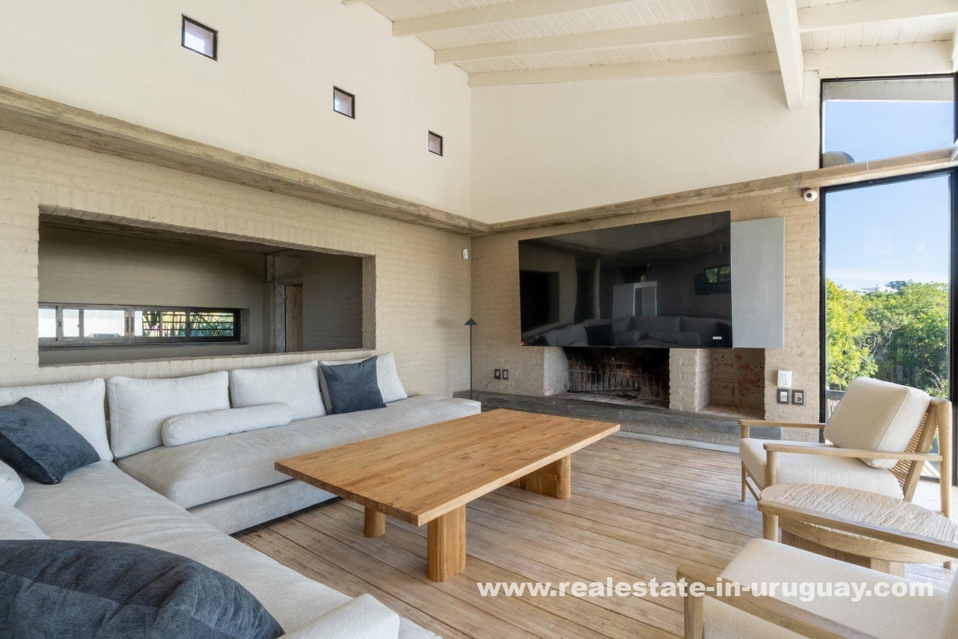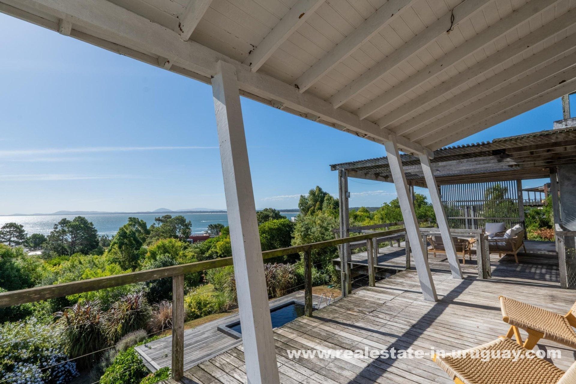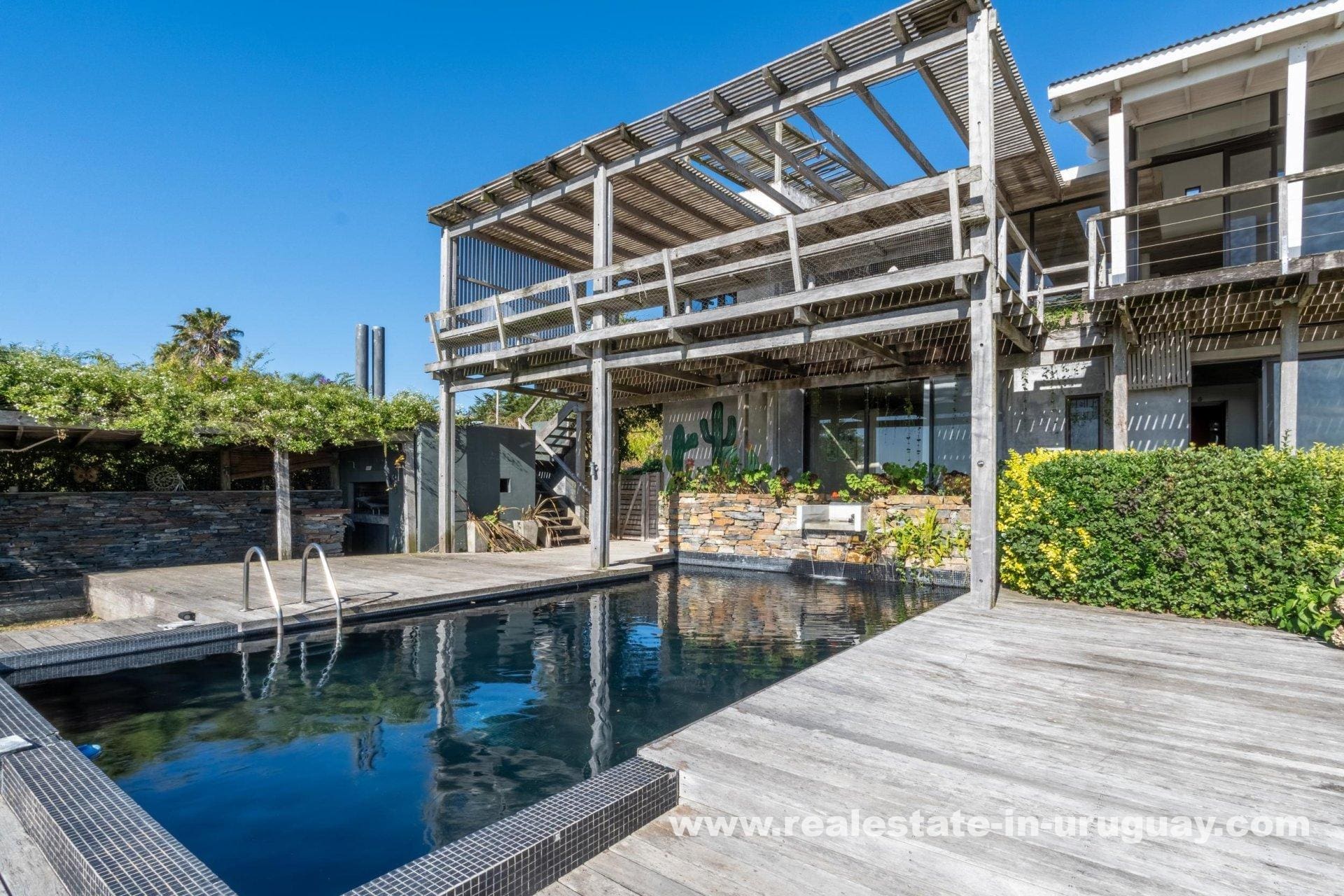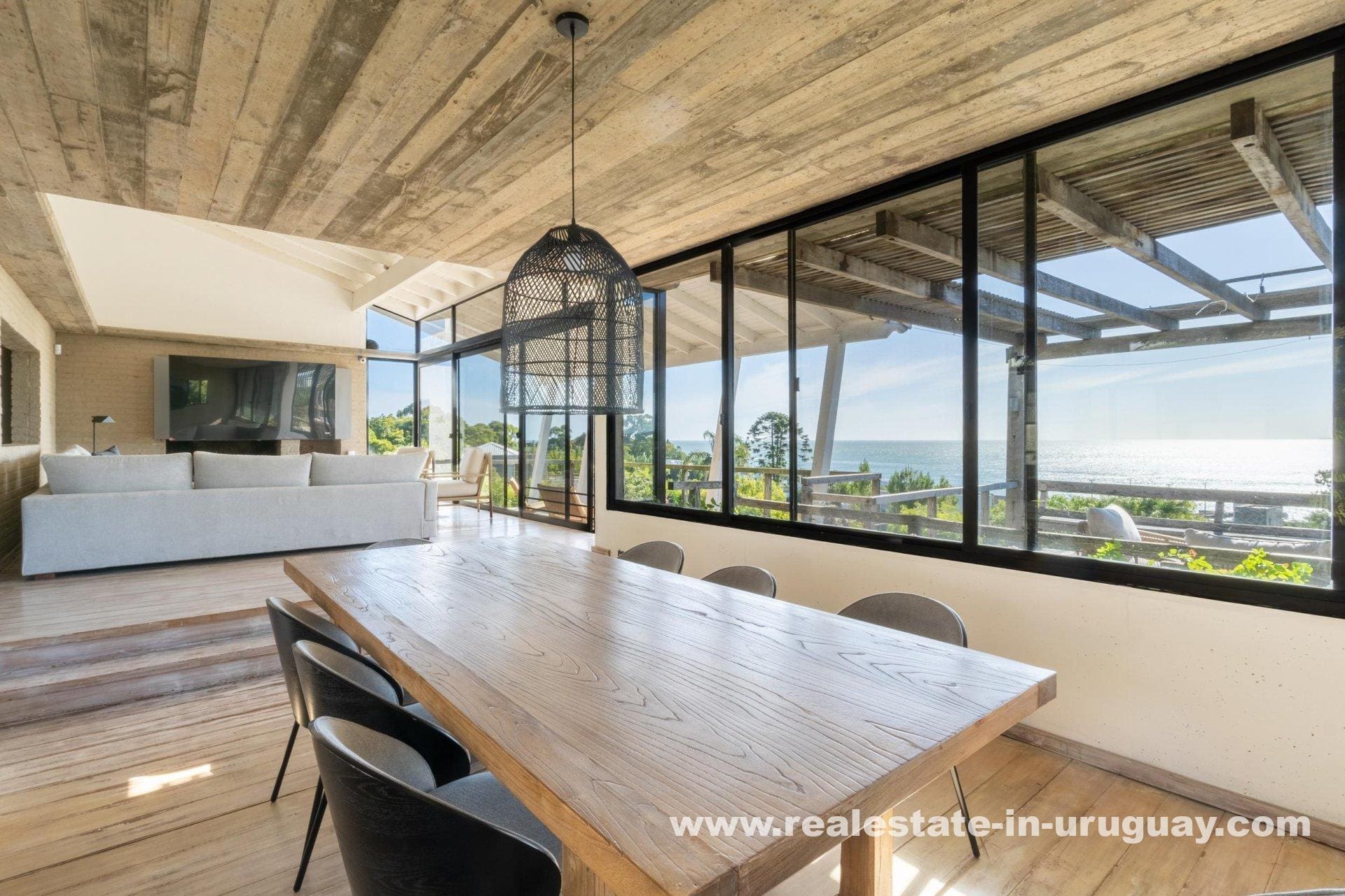 Explore a sophisticated haven in Punta Ballena, presenting breathtaking sea views and unparalleled luxury. This magnificent property features a spacious living/dining area complete with a wood-burning stove and a contemporary, fully-equipped kitchen. On the ground floor, indulge in two comfortable bedrooms each featuring en-suite bathrooms, while the exquisite master suite occupies the mezzanine, offering en-suite facilities and direct access to a versatile room presently serving as an office, yet equally adaptable as a fourth en-suite bedroom. Relish outdoor living with expansive exterior decks accessible from all rooms, culminating in an upper deck with a large lounge area that boasts stunning coastal vistas.