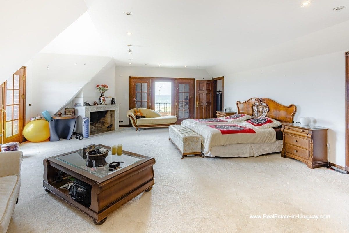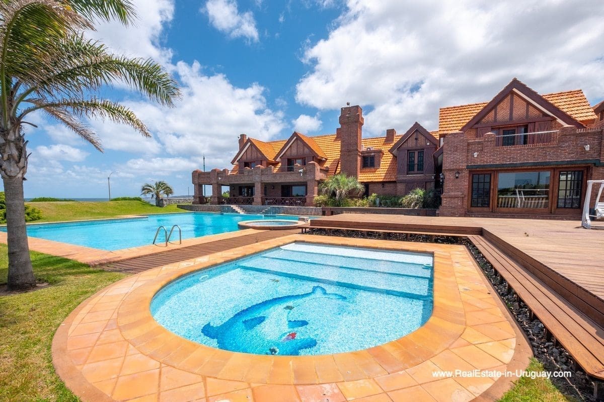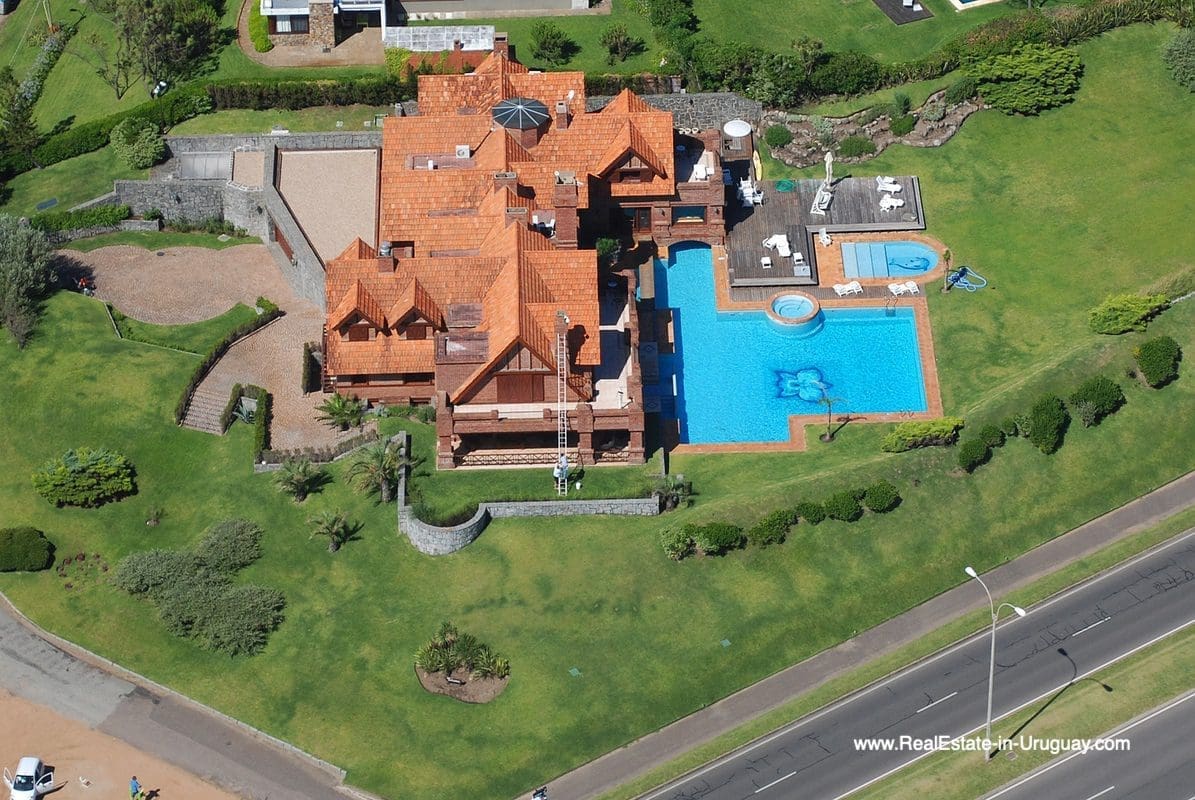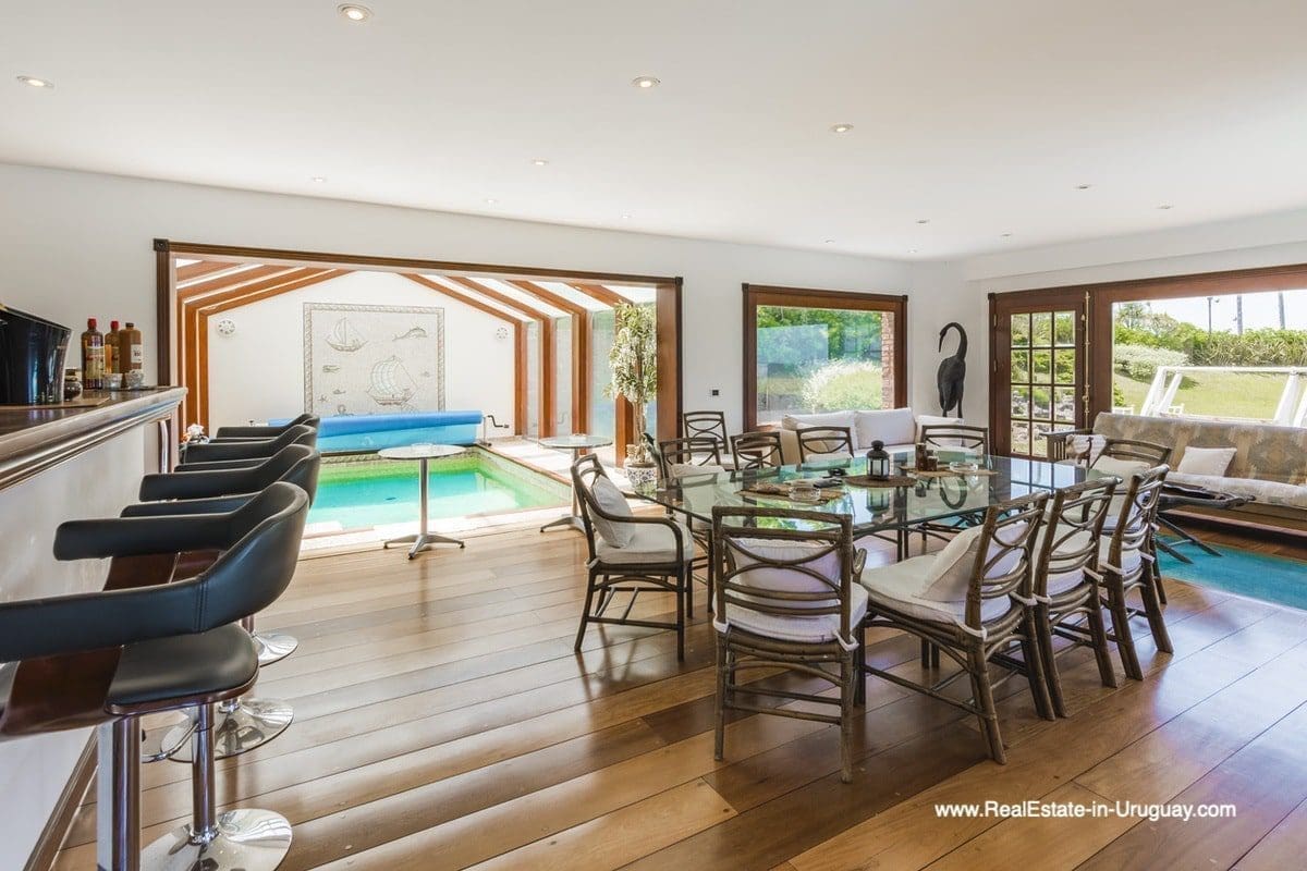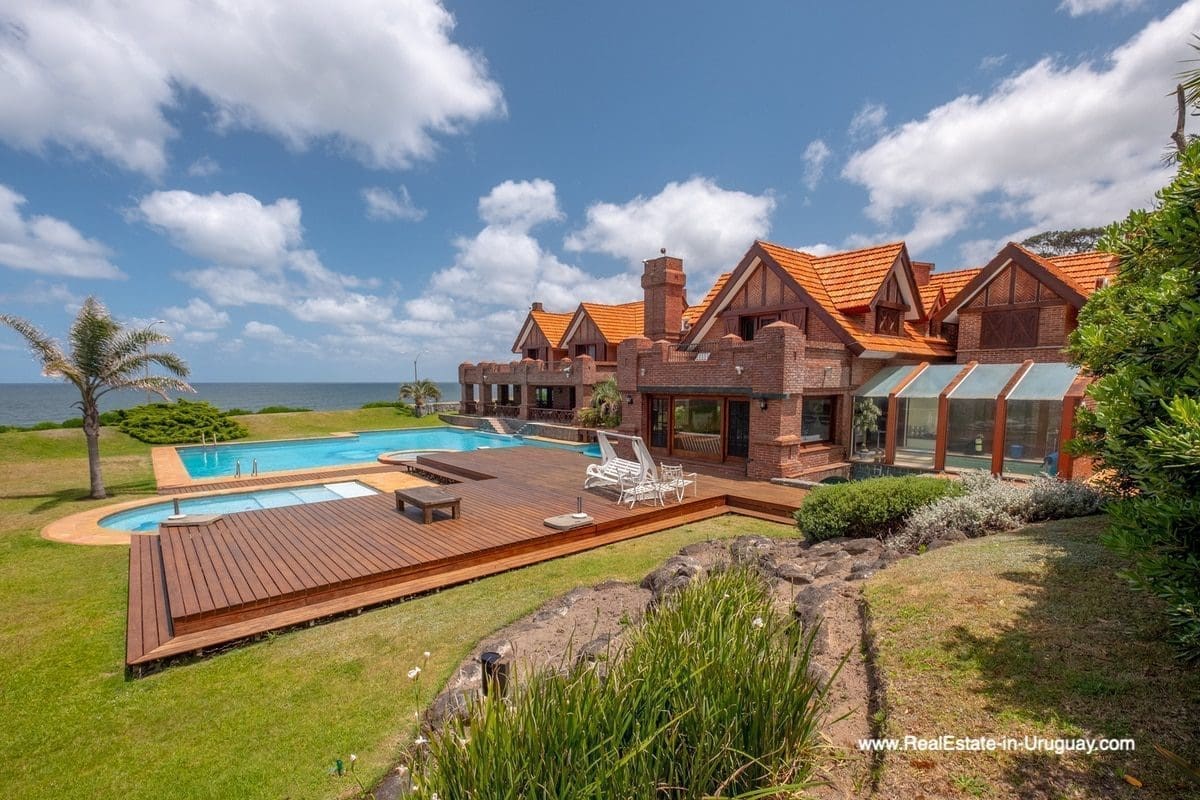 This frontline estate on the Mansa Beach in Punta del Este is one of a kind. It is a traditional villa very well built with double cavity walls. The woodwork in the interior shows excellent craftsmanship, which is hard to find nowadays. Many rooms have original hardwood floors and doors.The classical Uruguayan style mansion sits on a large piece of prime land and offers stunning views to the ocean, Isla Gorriti, and the Punta del Este skyline. On the main level are a large living room with a study, dining room, the main kitchen, and a second smaller kitchen. The enclosed BBQ room features an indoor pool which leads to an enormous outdoor pool and deck, inviting for great entertainment. There are three bedrooms on the main level of which two are duplex with en-suite bathrooms. A glass staircase leads to the upper level with four more bedrooms, including the master suite. The master bathroom is a piece of art by itself, all done with mosaic tiles. Opposite the master suite is a large dressing room which used to be another bedroom. On the ground floor is a huge garage with room for at least 4-6 cars, a cinema room, and gym area as well as a servant quarter with a bedroom and bathroom, kitchen and living area. An exceptional property ideal for someone who prefers to be away from downtown, but still likes to be close to all schools and amenities. The property sits on elevated land and is protected by a berm and provides absolute privacy. Please contact us for a viewing to fully appreciate the location, quality, and views of this property.