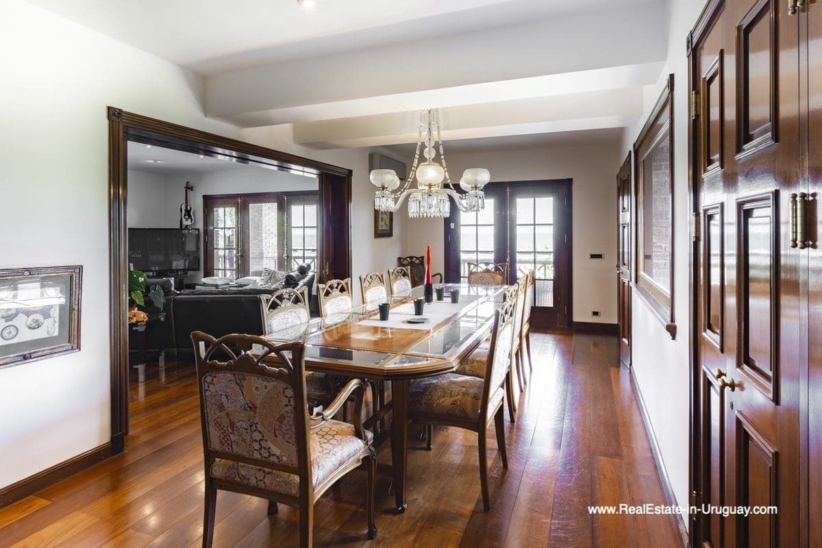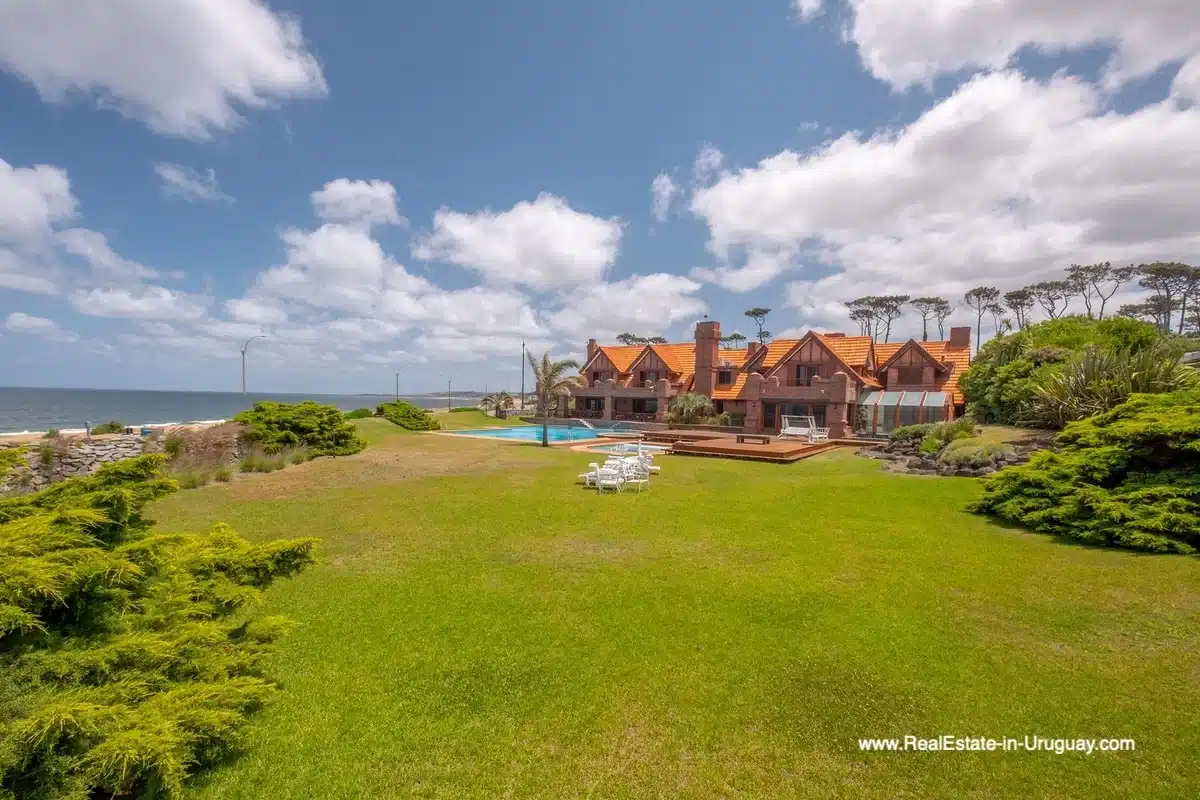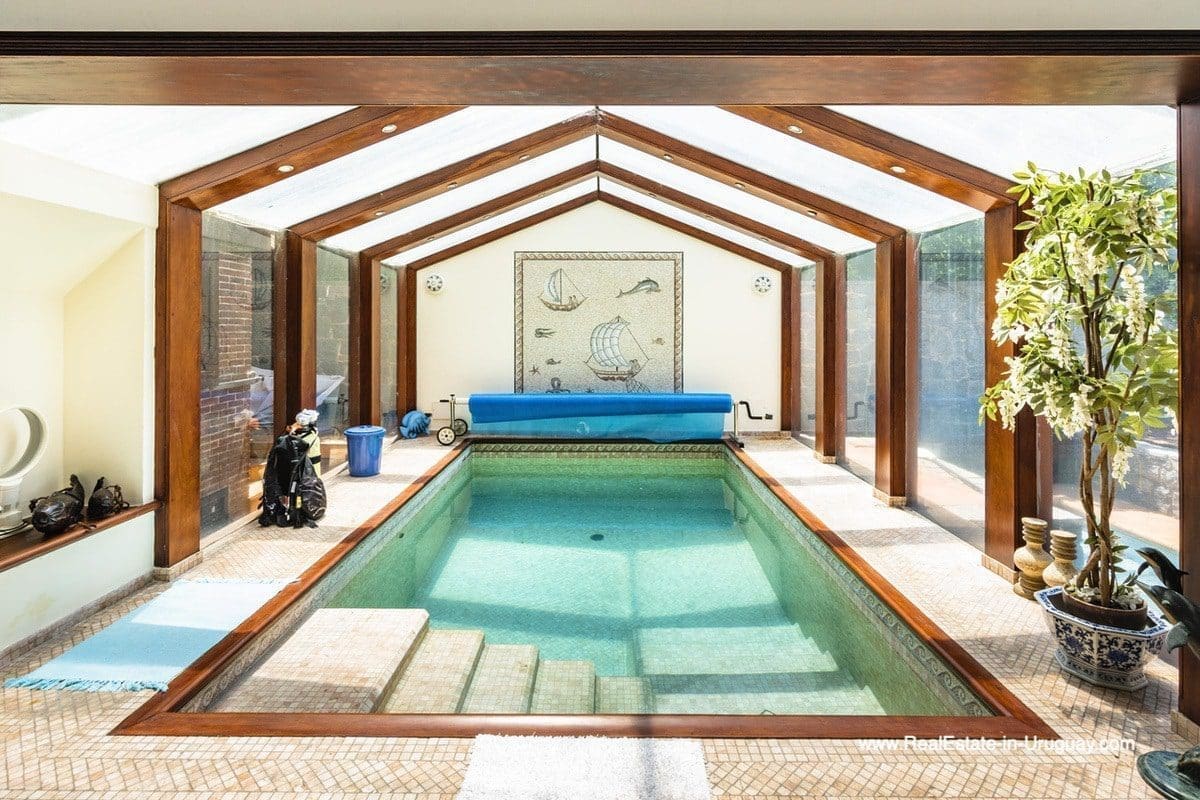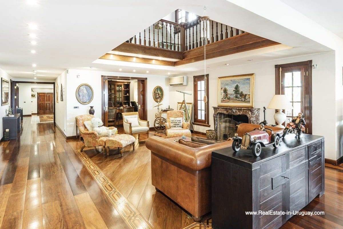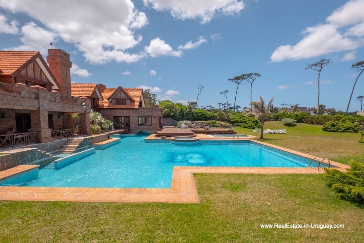 This frontline estate on the Mansa Beach in Punta del Este is one of a kind. It is a traditional villa very well built with double cavity walls. The woodwork in the interior shows excellent craftsmanship, which is hard to find nowadays. Many rooms have original hardwood floors and doors.The classical Uruguayan style mansion sits on a large piece of prime land and offers stunning views to the ocean, Isla Gorriti, and the Punta del Este skyline. On the main level are a large living room with a study, dining room, the main kitchen, and a second smaller kitchen. The enclosed BBQ room features an indoor pool which leads to an enormous outdoor pool and deck, inviting for great entertainment. There are three bedrooms on the main level of which two are duplex with en-suite bathrooms. A glass staircase leads to the upper level with four more bedrooms, including the master suite. The master bathroom is a piece of art by itself, all done with mosaic tiles. Opposite the master suite is a large dressing room which used to be another bedroom. On the ground floor is a huge garage with room for at least 4-6 cars, a cinema room, and gym area as well as a servant quarter with a bedroom and bathroom, kitchen and living area. An exceptional property ideal for someone who prefers to be away from downtown, but still likes to be close to all schools and amenities. The property sits on elevated land and is protected by a berm and provides absolute privacy. Please contact us for a viewing to fully appreciate the location, quality, and views of this property.