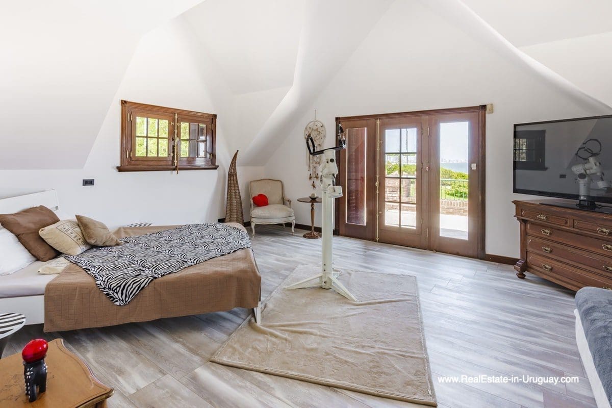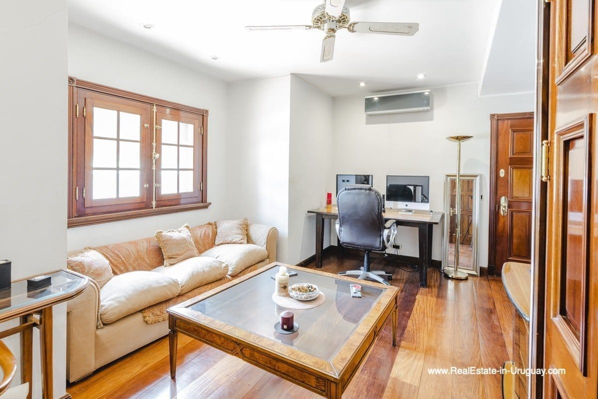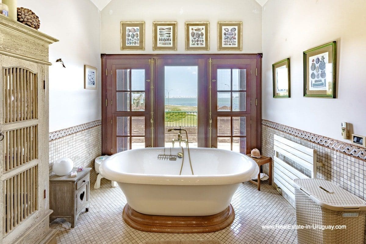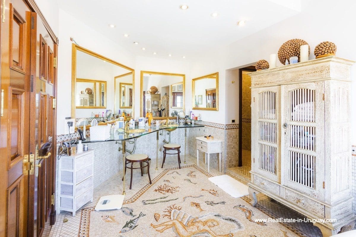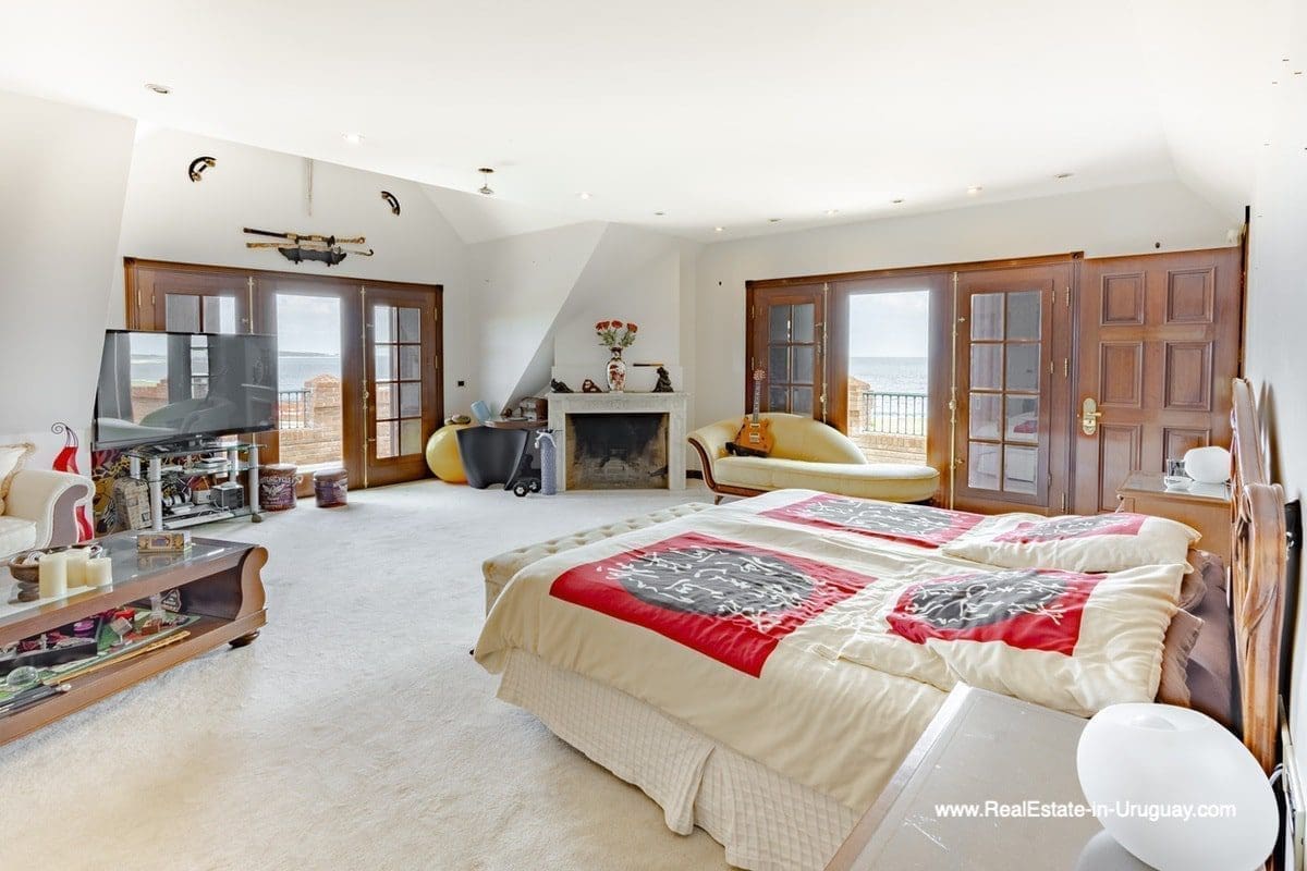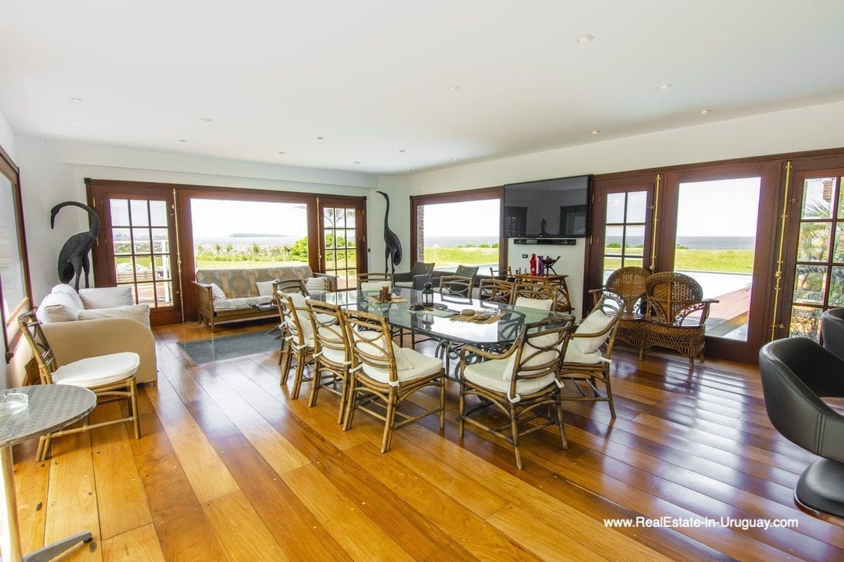 This frontline estate on the Mansa Beach in Punta del Este is one of a kind. It is a traditional villa very well built with double cavity walls. The woodwork in the interior shows excellent craftsmanship, which is hard to find nowadays. Many rooms have original hardwood floors and doors.The classical Uruguayan style mansion sits on a large piece of prime land and offers stunning views to the ocean, Isla Gorriti, and the Punta del Este skyline. On the main level are a large living room with a study, dining room, the main kitchen, and a second smaller kitchen. The enclosed BBQ room features an indoor pool which leads to an enormous outdoor pool and deck, inviting for great entertainment. There are three bedrooms on the main level of which two are duplex with en-suite bathrooms. A glass staircase leads to the upper level with four more bedrooms, including the master suite. The master bathroom is a piece of art by itself, all done with mosaic tiles. Opposite the master suite is a large dressing room which used to be another bedroom. On the ground floor is a huge garage with room for at least 4-6 cars, a cinema room, and gym area as well as a servant quarter with a bedroom and bathroom, kitchen and living area. An exceptional property ideal for someone who prefers to be away from downtown, but still likes to be close to all schools and amenities. The property sits on elevated land and is protected by a berm and provides absolute privacy. Please contact us for a viewing to fully appreciate the location, quality, and views of this property.