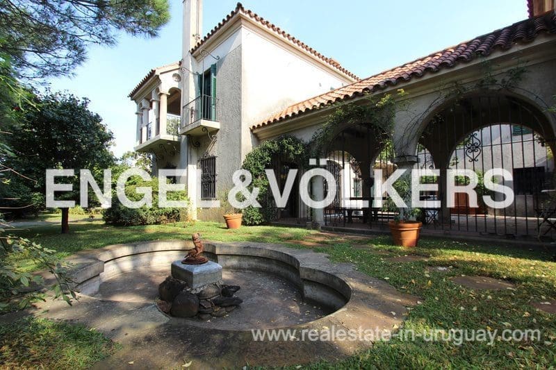A jewel of architecture for sale in Carrasco, built by Arq. Faget in 1939, and recently in 2018 restored strictly respecting its essence. The house features 453 m2 of living space in a 1.333 m2 plot. A beautifully landscaped garden with delicate fountains surrounds it. On the ground floor, an elegant reception hall welcomes visitors. Sizeable social spaces with original marble floors in checkerboard, and excellent carpentry along with the house. Living room with a fireplace, dining room with a fireplace as well, home office, guest toilette, pantry, and spacious bright kitchen fully refurbished. An elegant wooden staircase drives you upstairs. On the upper floor, the house features 6 bedrooms, 2 bathrooms, and an enjoyable terrace. The heating system is combined (both electric and high-efficiency gas boiler), and there´s additional air conditioning. A beautiful Spanish-style patio and a gallery connecting the house with an independent 2-bedroom apartment, the laundry área, machine room, sauna, and garage. Barbecue.