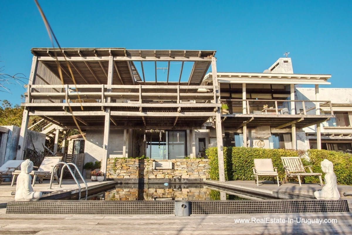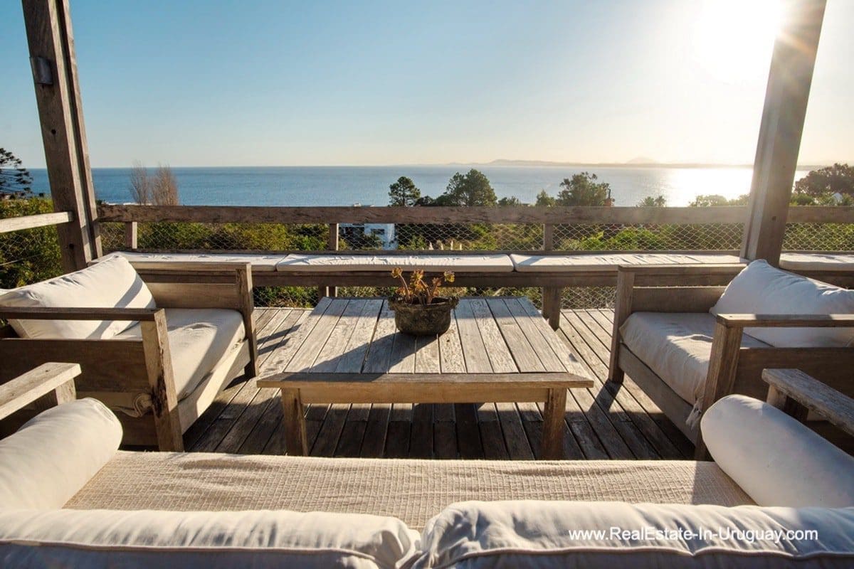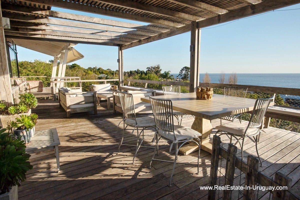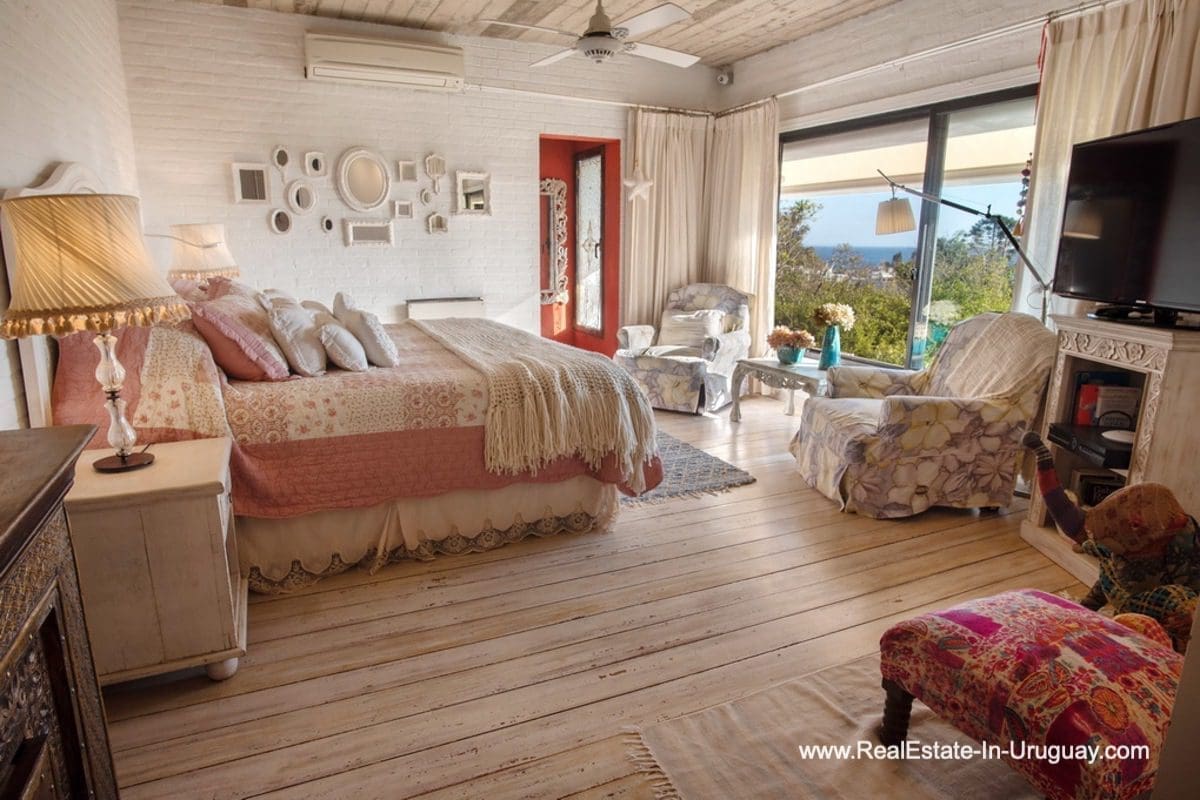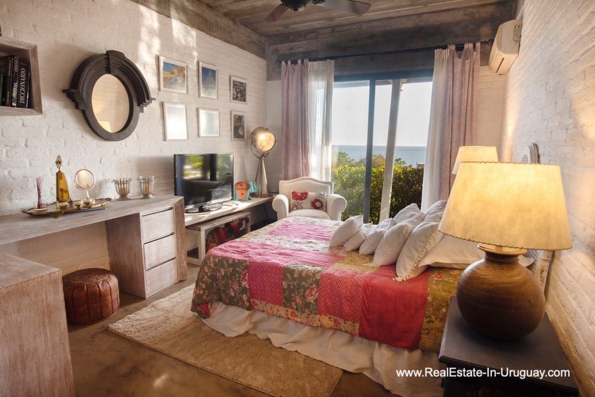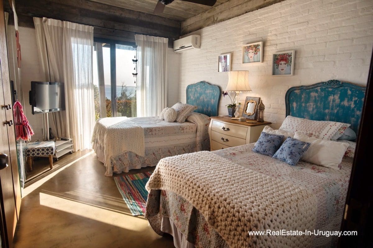 This special house on a double lot with sea views in Punta Ballena comprises a spacious living and dining room with wood-burning stove and fully-equipped kitchen on the upper floor. On the ground floor, there is an entrance hall as well as two bedrooms with en-suite bathrooms. The master bedroom with en-suite bathroom, on the mezzanine floor, leads down some stairs to another room, which is currently used as an office but could be used as a fourth bedroom with en-suite bathroom. All rooms in the property have access to the exterior decks. The upper deck is covered and contains a large lounge area with stunning sea views. It connects to the ground floor deck with a swimming pool, BBQ/grill, covered dining area, and access to the lovely garden. The property includes a guest-house or caretaker’s lodge with bedroom, bathroom, and kitchen, and all rooms enjoy air conditioning and afford extensive sea views. The viewpoint on the upper floor affords spectacular sea views reaching as far as Piriápolis. The fact that this property is sold on a double lot, will guarantee the sea views and no one can build in front.
