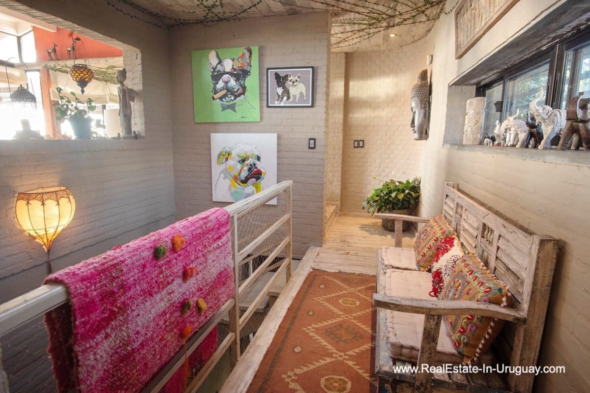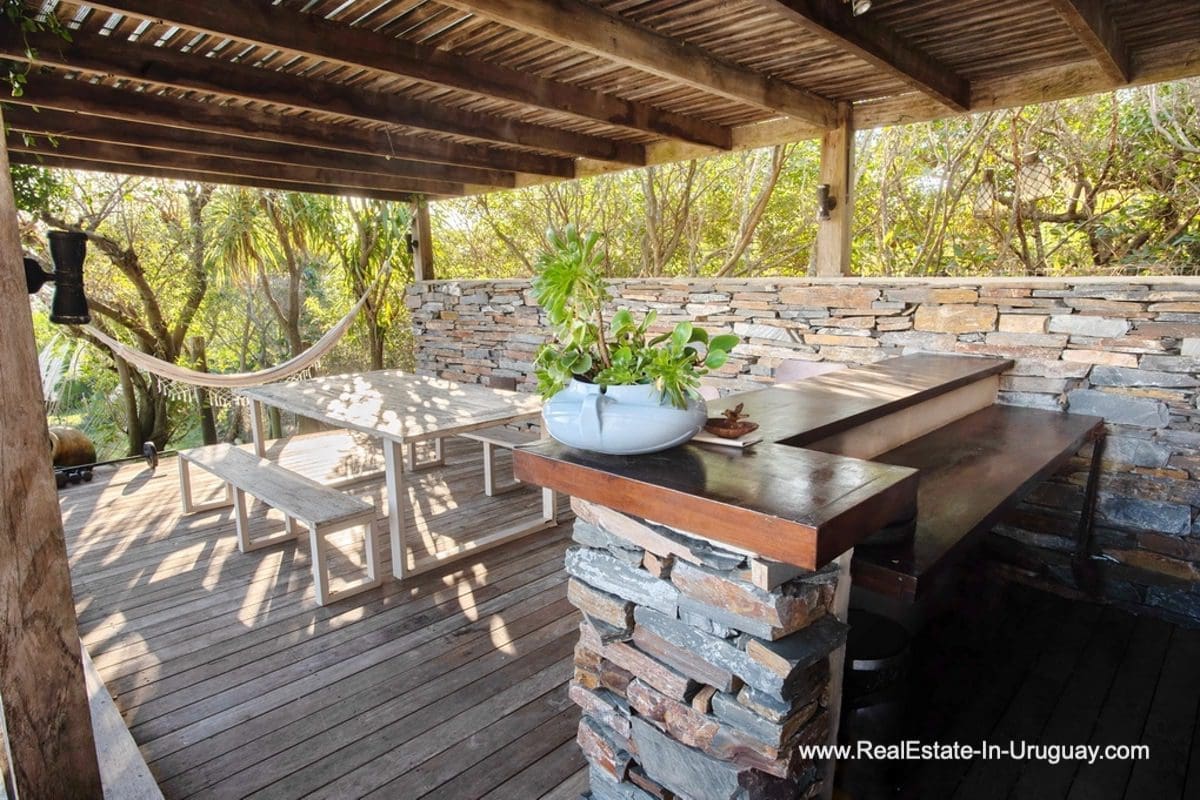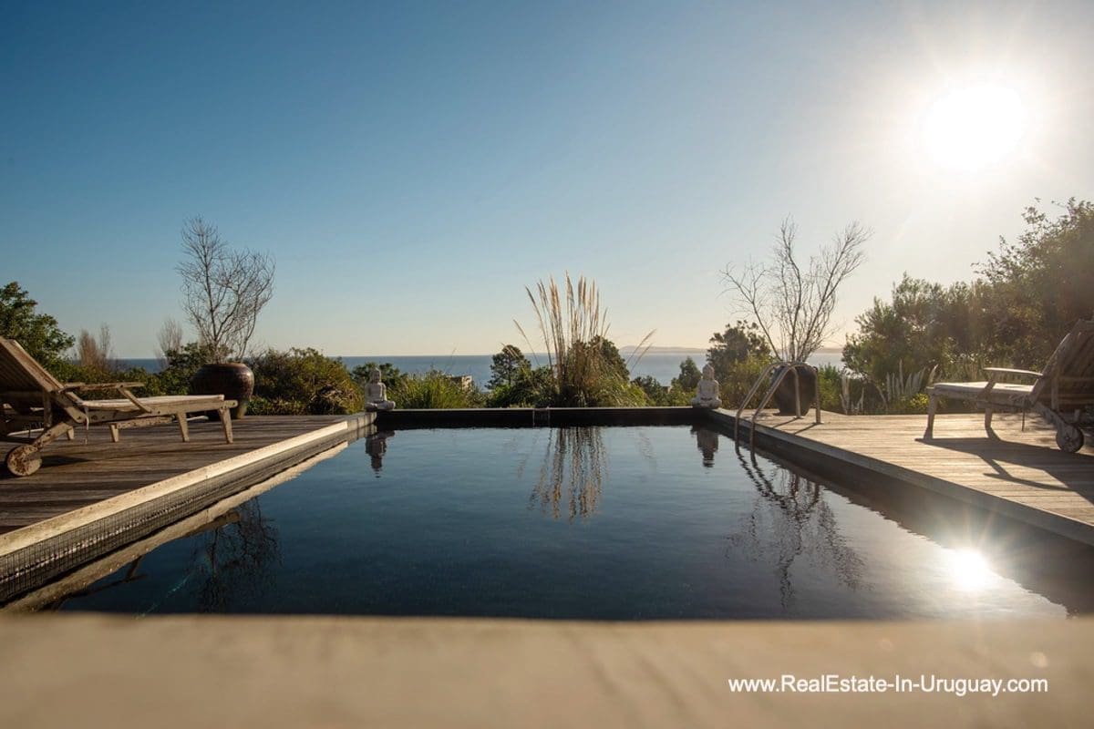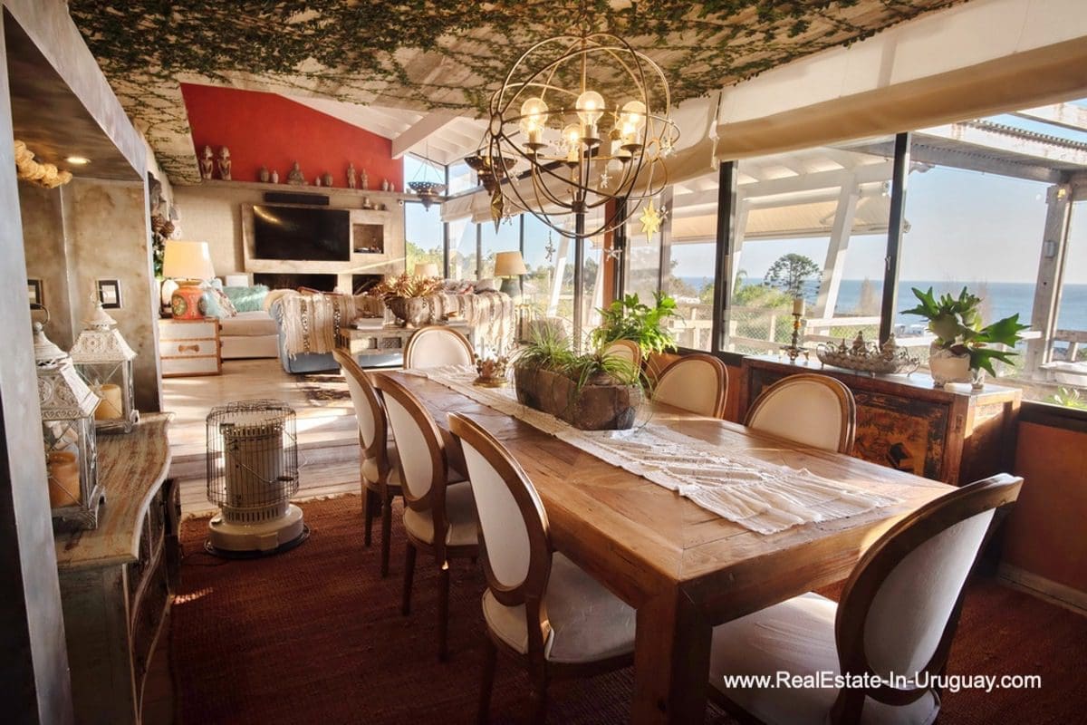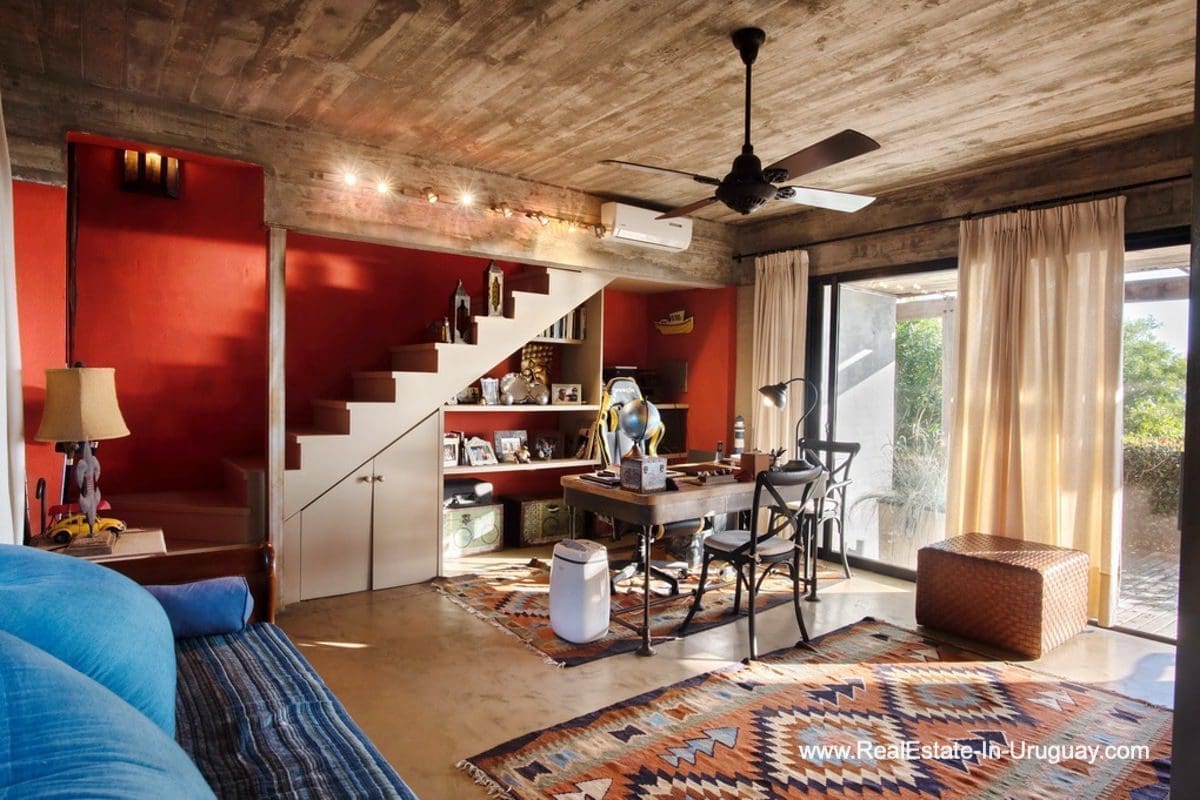This special house on a double lot with sea views in Punta Ballena comprises a spacious living and dining room with wood-burning stove and fully-equipped kitchen on the upper floor. On the ground floor, there is an entrance hall as well as two bedrooms with en-suite bathrooms. The master bedroom with en-suite bathroom, on the mezzanine floor, leads down some stairs to another room, which is currently used as an office but could be used as a fourth bedroom with en-suite bathroom. All rooms in the property have access to the exterior decks. The upper deck is covered and contains a large lounge area with stunning sea views. It connects to the ground floor deck with a swimming pool, BBQ/grill, covered dining area, and access to the lovely garden. The property includes a guest-house or caretaker’s lodge with bedroom, bathroom, and kitchen, and all rooms enjoy air conditioning and afford extensive sea views. The viewpoint on the upper floor affords spectacular sea views reaching as far as Piriápolis. The fact that this property is sold on a double lot, will guarantee the sea views and no one can build in front.