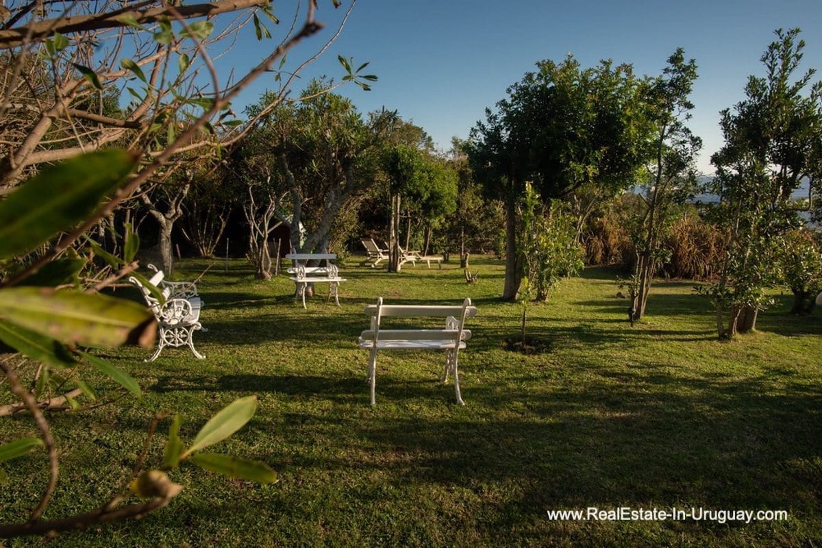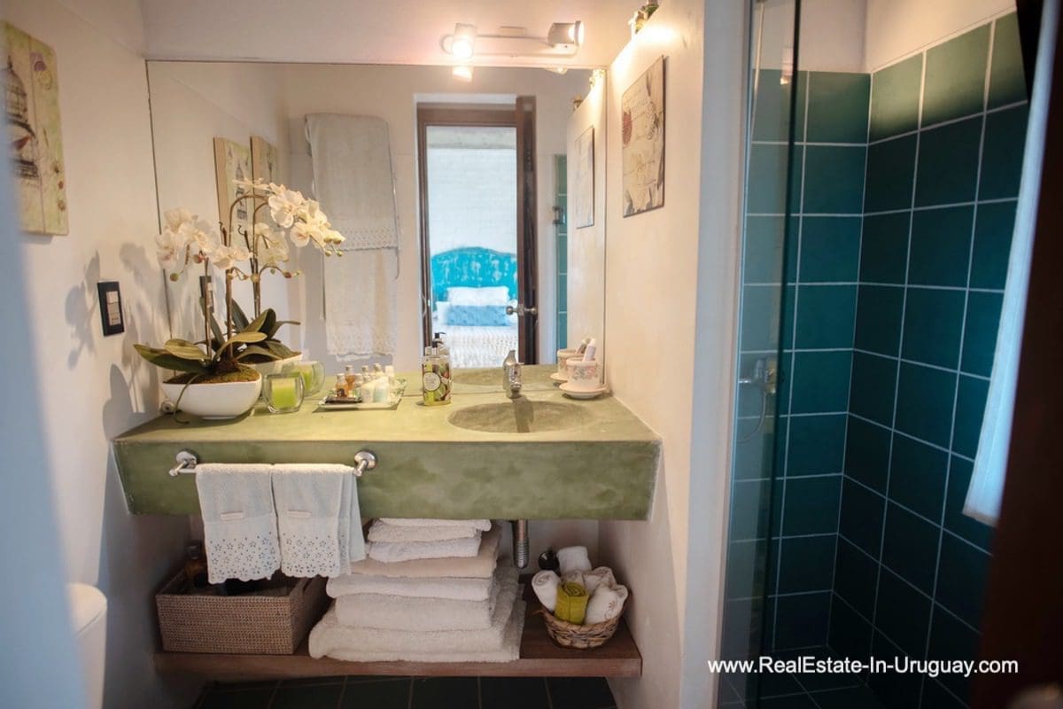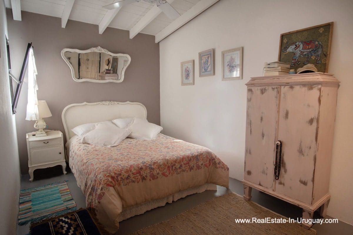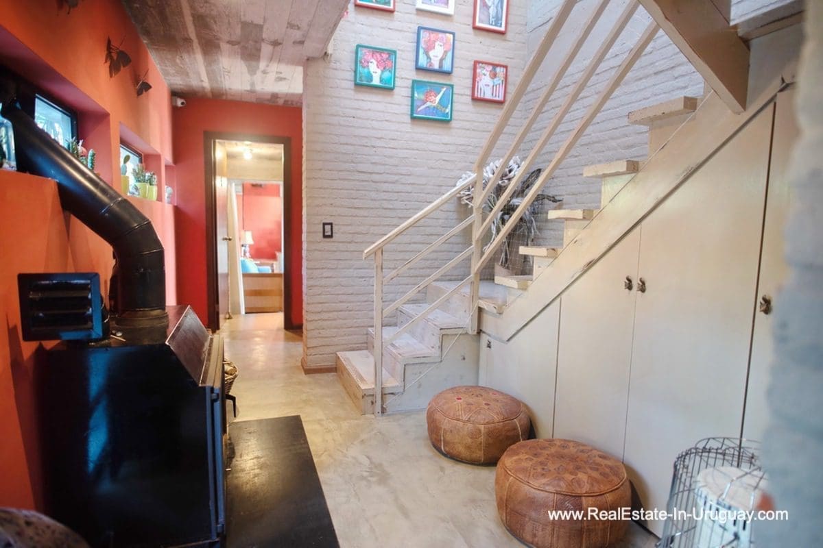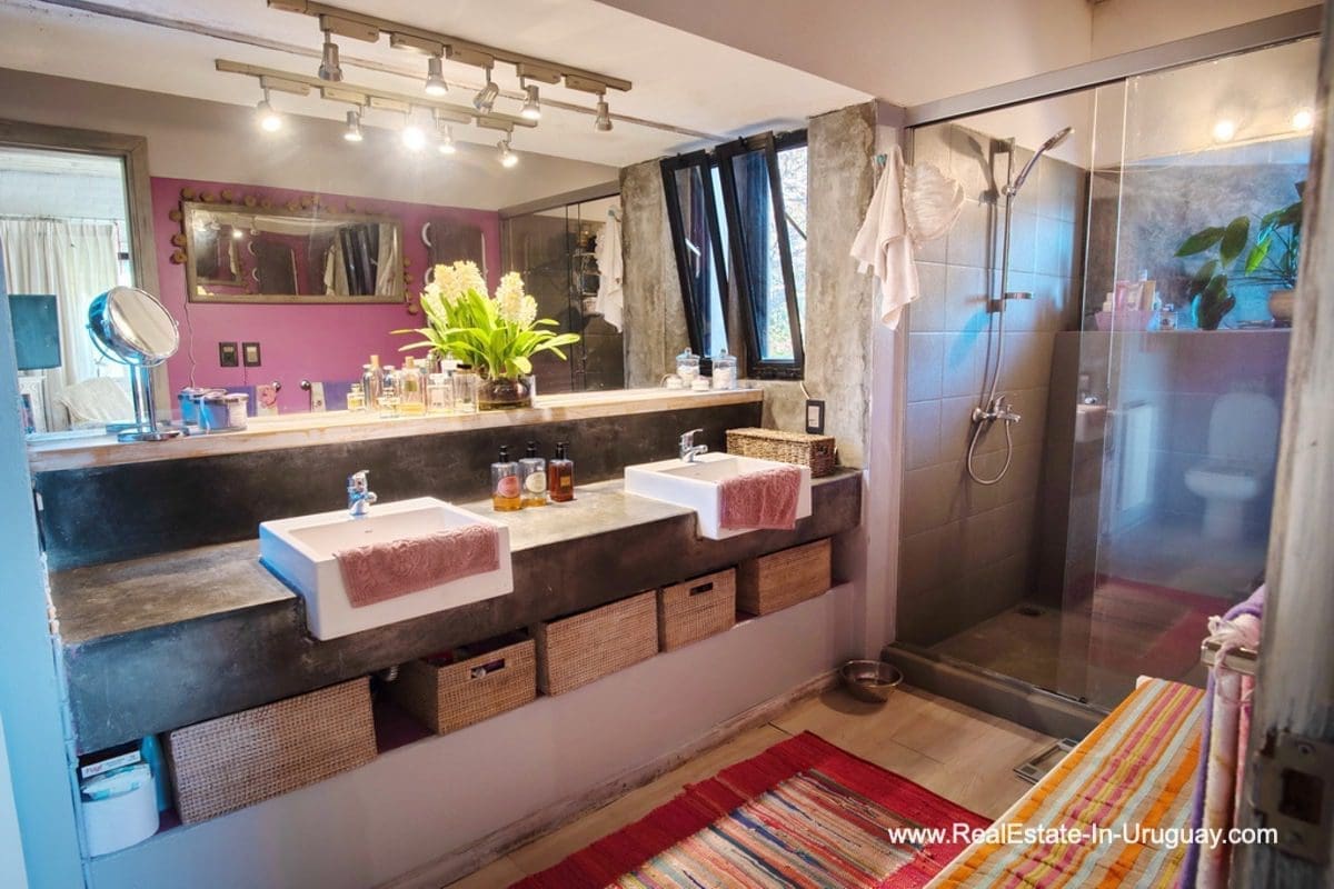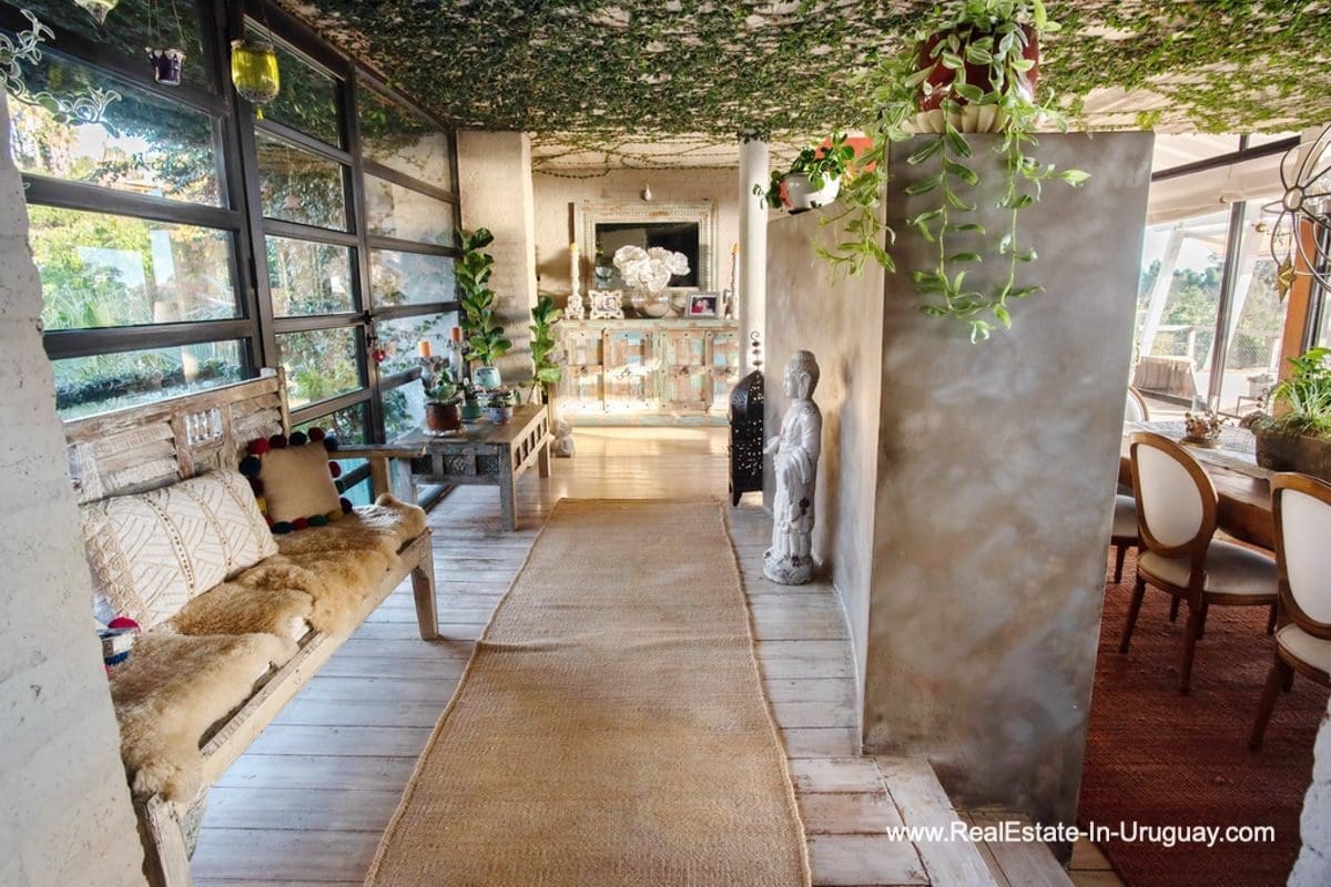 This special house on a double lot with sea views in Punta Ballena comprises a spacious living and dining room with wood-burning stove and fully-equipped kitchen on the upper floor. On the ground floor, there is an entrance hall as well as two bedrooms with en-suite bathrooms. The master bedroom with en-suite bathroom, on the mezzanine floor, leads down some stairs to another room, which is currently used as an office but could be used as a fourth bedroom with en-suite bathroom. All rooms in the property have access to the exterior decks. The upper deck is covered and contains a large lounge area with stunning sea views. It connects to the ground floor deck with a swimming pool, BBQ/grill, covered dining area, and access to the lovely garden. The property includes a guest-house or caretaker’s lodge with bedroom, bathroom, and kitchen, and all rooms enjoy air conditioning and afford extensive sea views. The viewpoint on the upper floor affords spectacular sea views reaching as far as Piriápolis. The fact that this property is sold on a double lot, will guarantee the sea views and no one can build in front.