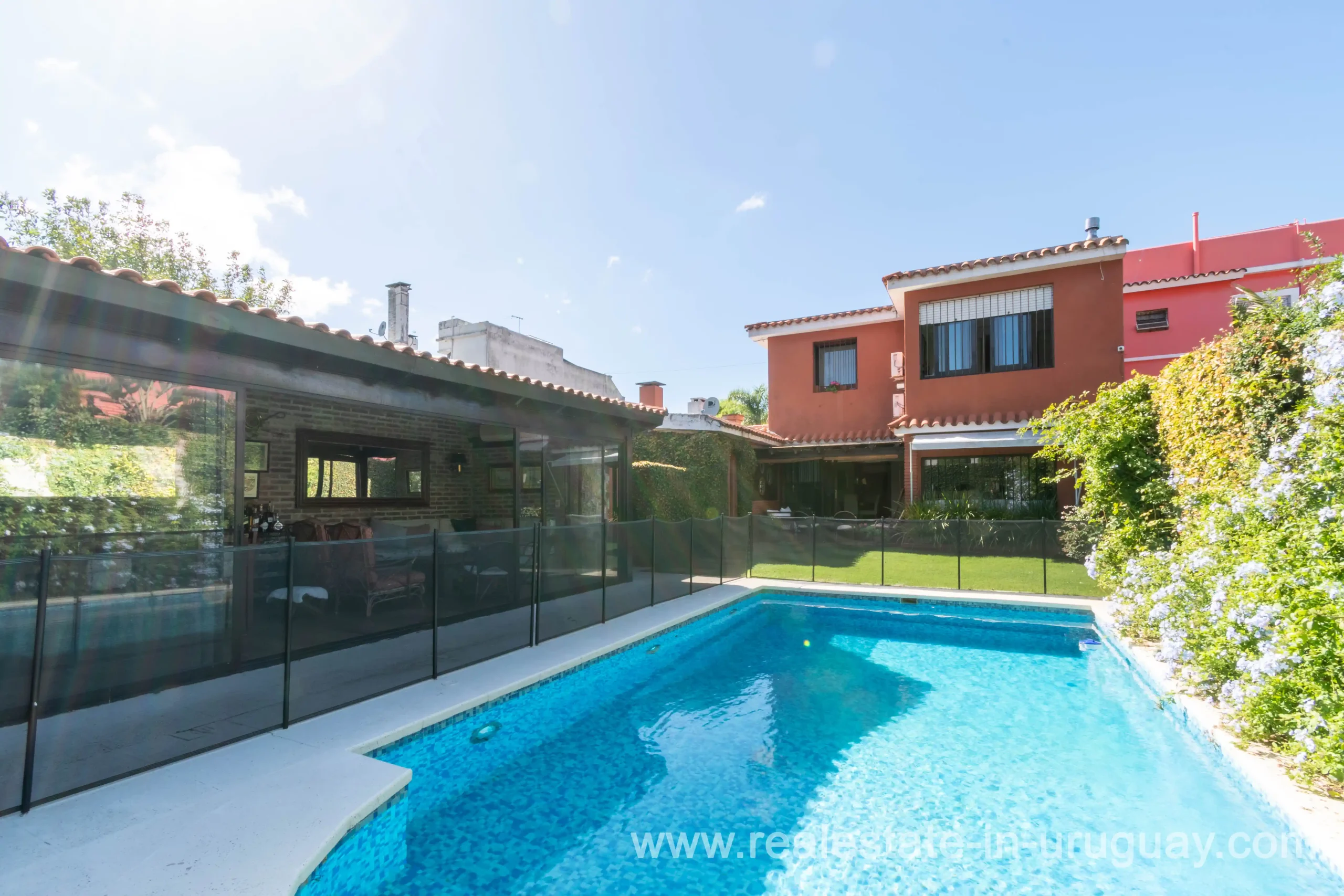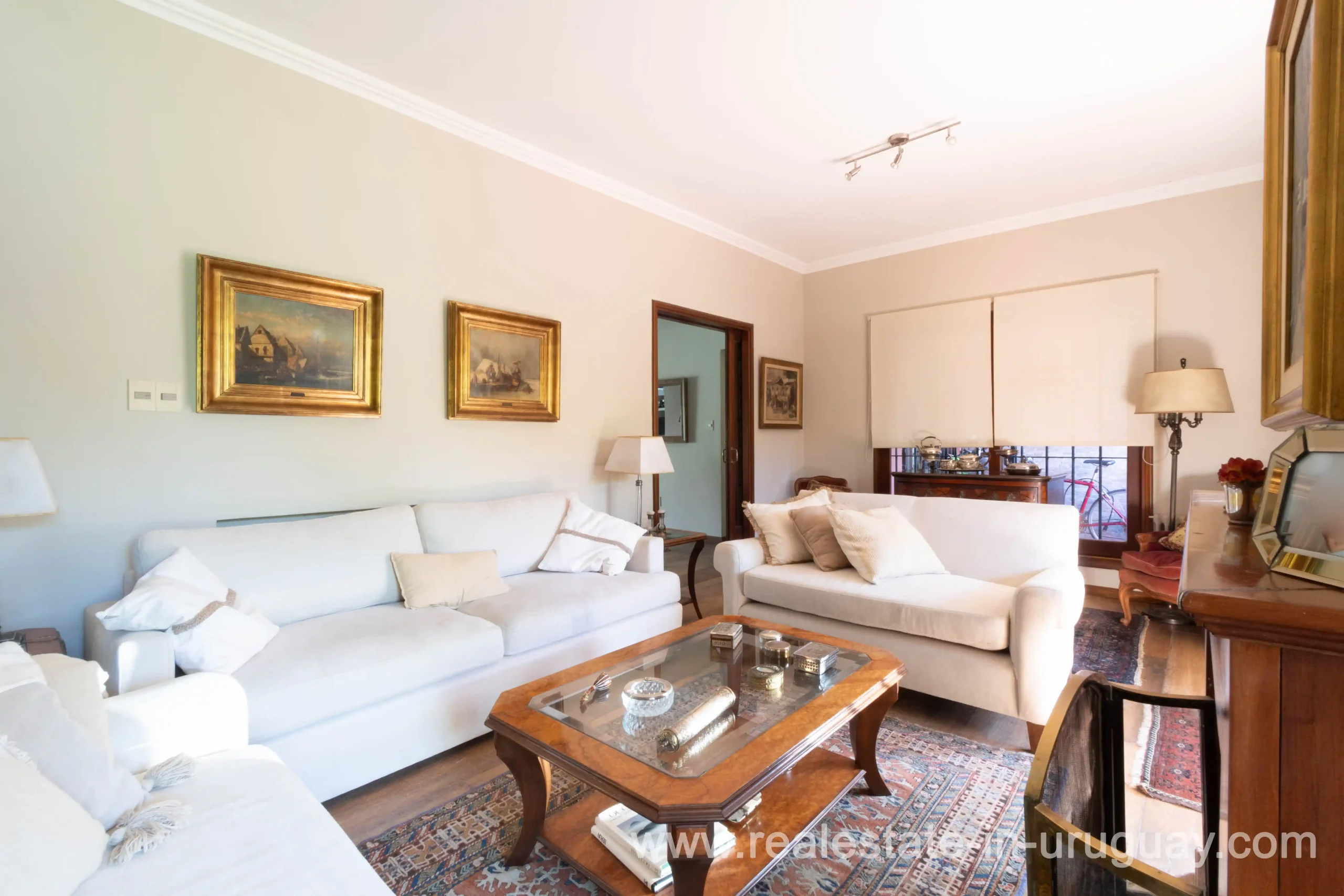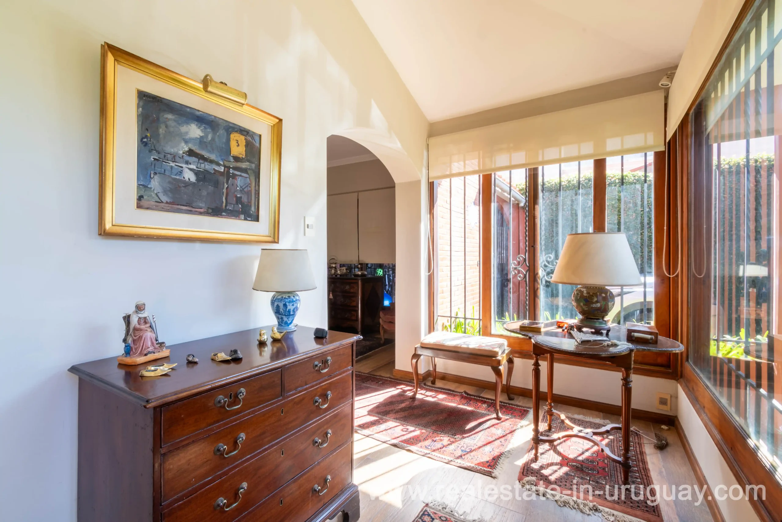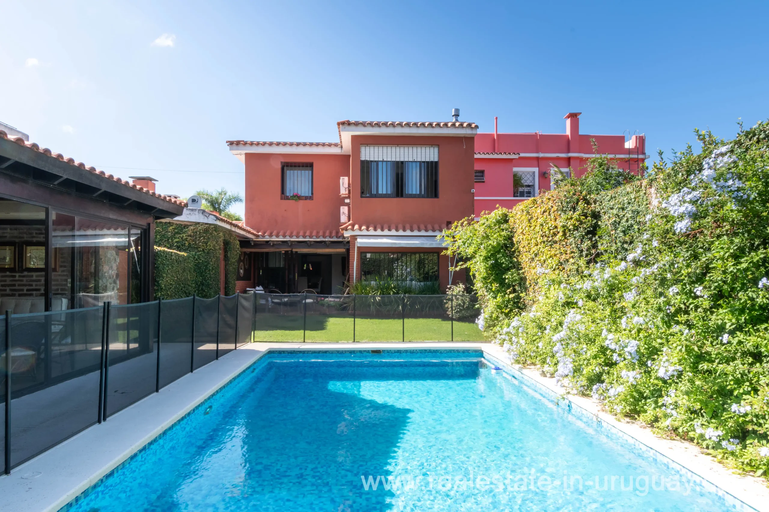 Impeccable house for sale in Carrasco Sur, just one block from the Rambla and close to Arocena. It is situated on 420 square meters of land, with 230 square meters of interior space spread over two floors and a 32-square-meter barbecue area. Built in the traditional style of the 1950s with several renovations and updates, the most recent being in 2018. The property features a comfortable entrance hall with double circulation around the formal living room with a wood-burning stove. To the left, we enter the daily living area with a high-efficiency stove and a view to the back; to the right, we find the guest bathroom, a dining room that seats 10 with a view to the gallery and access to the garden and kitchen. The kitchen is spacious, well-defined, and offers plenty of storage, connecting to the car entrance at the front and the service bedroom with a side exit to the garden. The north-facing garden includes a recently installed heated pool with a heat pump and an enclosed barbecue area. Upstairs, there are three good-sized bedrooms with closets and plenty of natural light. The master bedroom is suite-style with a walk-in closet. The other two bedrooms share a bathroom, each with its own water heater. Heating is provided by radiators in the bedrooms and underfloor heating in the bathrooms. The high-efficiency stove also heats the master bedroom and formal living room. This house is extremely comfortable, well-maintained, and in an unbeatable location. Contact us to schedule your visit.
