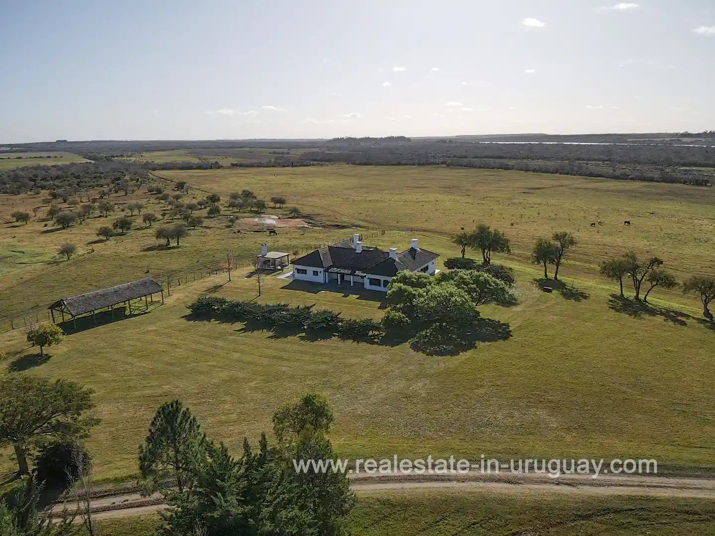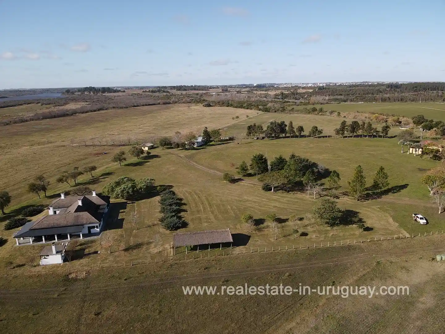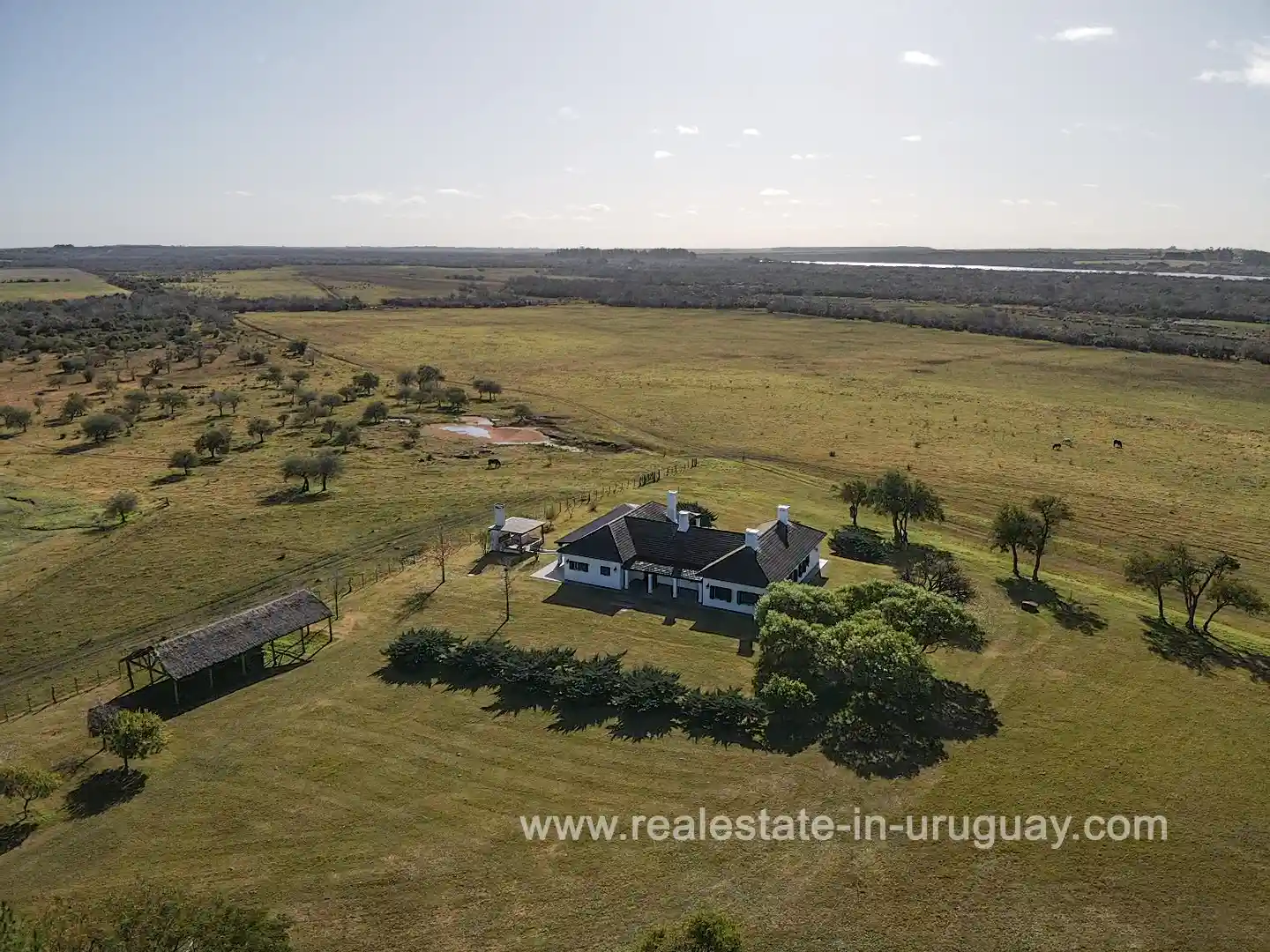Just 3.5 km from the city of Mercedes, with access via Route 3 and a waterfront on the Rio Negro. 396 km from Punta del Este and 280 km from Montevideo. New main house with 5 en-suite bedrooms, heating, and very well-maintained. Average Coneat index of 71, with approximately 150 hectares of native forest, about 100 hectares suitable for agriculture, currently in alfalfa pastures and low fields with excellent wintering capacity. Working infrastructure, 2 houses for staff, a shed, and cattle handling pens in intermediate conditions. Previously, it had 3 polo fields, now almost imperceptible but recoverable.