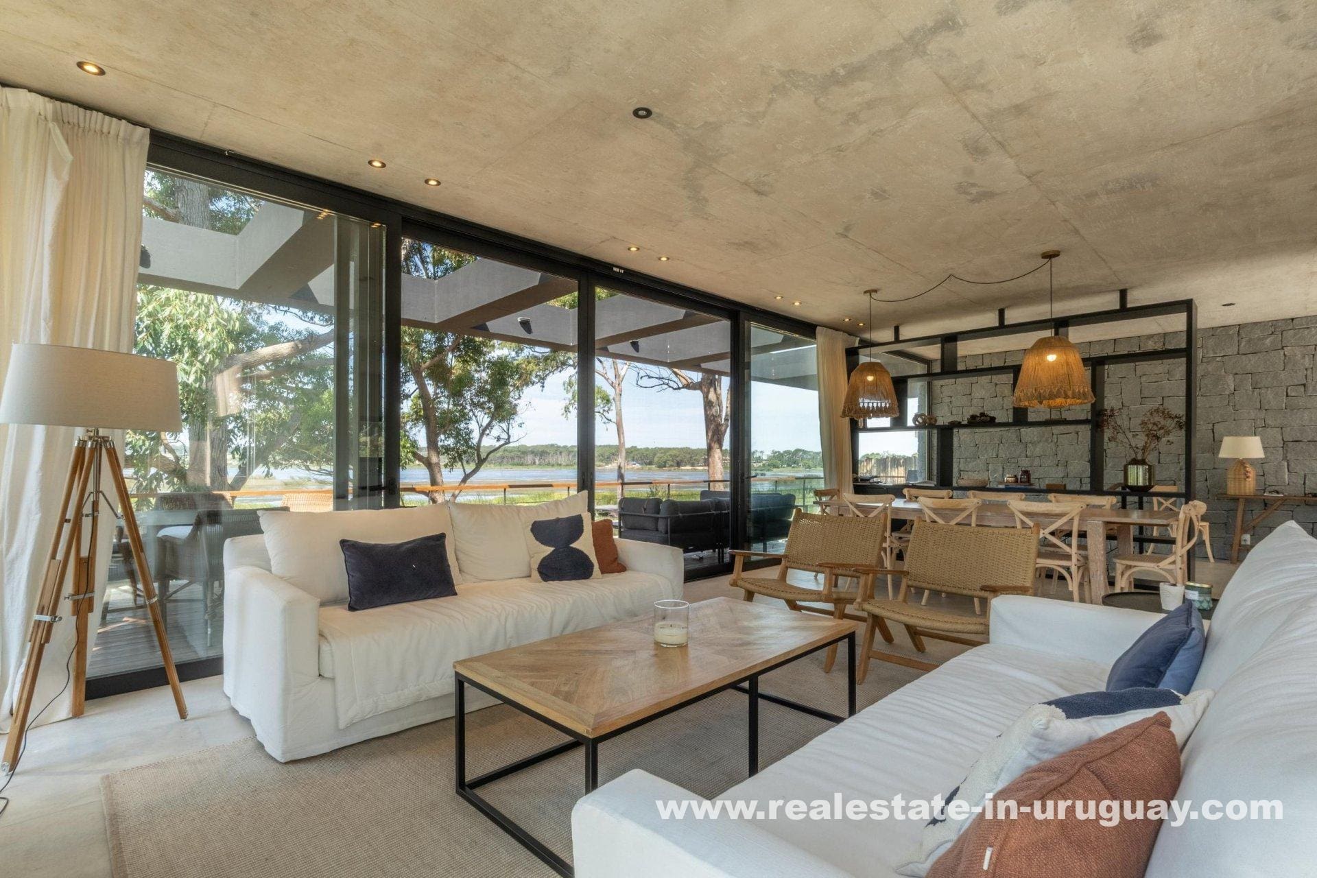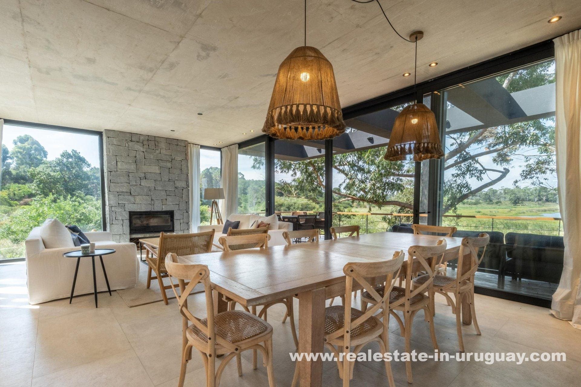 Nestled in the heart of Reserva Montoya, this exquisite two-story residence faces the serene Laguna Blanca, offering an unmatched blend of modern design and natural tranquility. From the moment you enter through the upper floor, breathtaking views and natural light envelop you, with floor-to-ceiling windows showcasing the stunning landscape. The living room, anchored by a sophisticated fireplace, blends seamlessly with the dining area, creating an inviting atmosphere for relaxation and social gatherings.