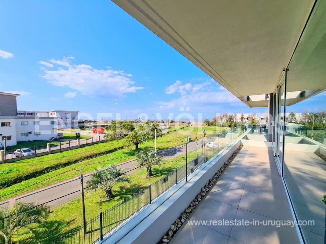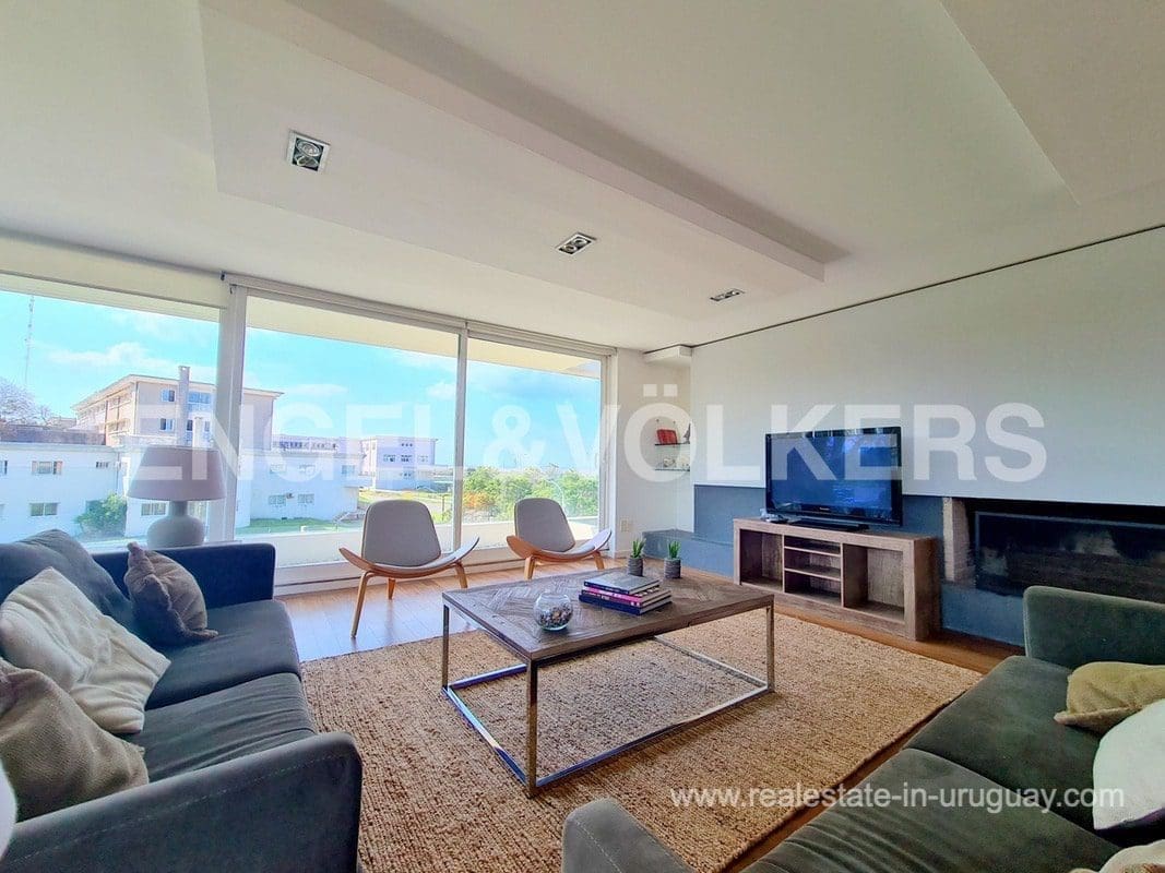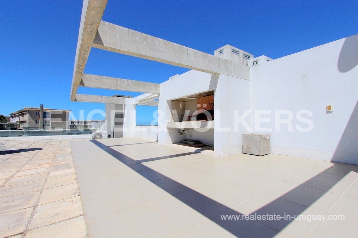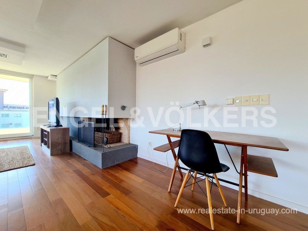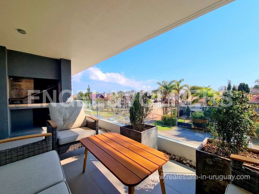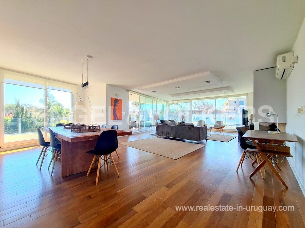 This modern Minimalist apartment in Carrasco welcomes us with a large living and dining room with a wood stove and a terrace with a barbecue. It has a defined kitchen with a maid’s bedroom en suite. The private area consists of three bedrooms, the master suite with a walk-in closet, and an extra bathroom that shares the secondary bedrooms. Underfloor electric heating plus air conditioning split. The apartment has an exclusive-use rooftop terrace with a barbecue. It includes two garages. The building has a barbecue and outdoor pool. This is a unique project where practice and beauty complement each other.